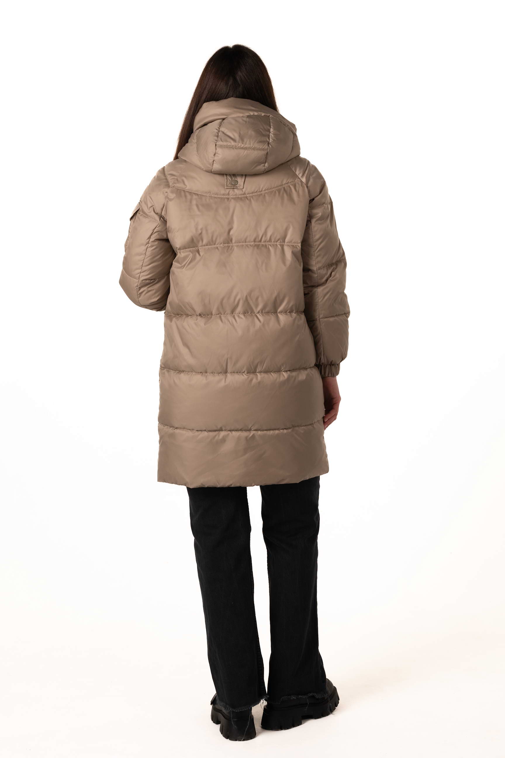 Накладна кишеня на рукаві додає образу оригінальності та сучасного вигляду, підкреслюючи стильну деталь у дизайні пуховика.