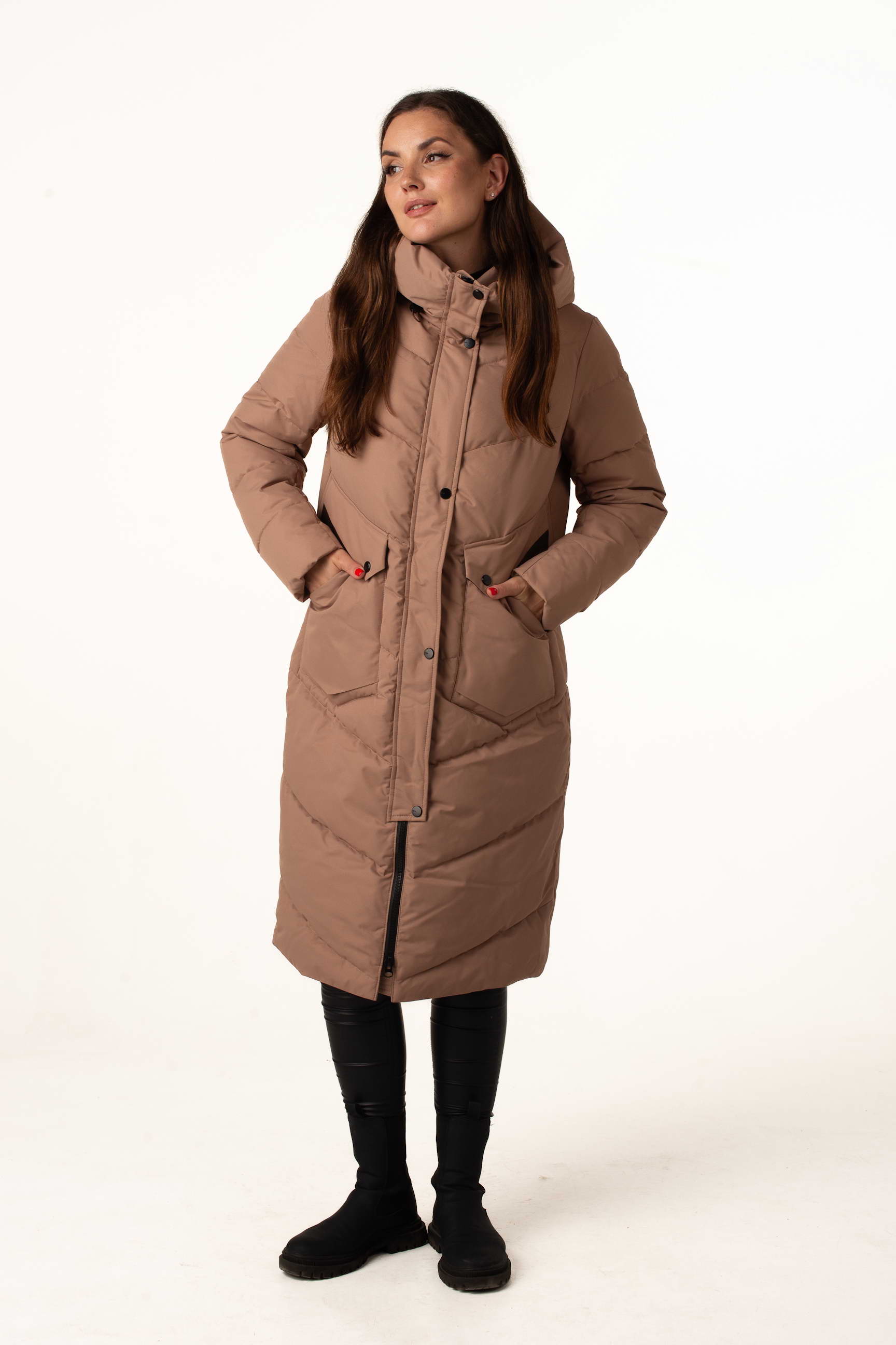 Бежевий жіночий біопуховик із горизонтальною стьожкою – це поєднання тепла, комфорту та сучасного дизайну. Подовжена довжина робить модель ідеальною для захисту від холоду та вітру.