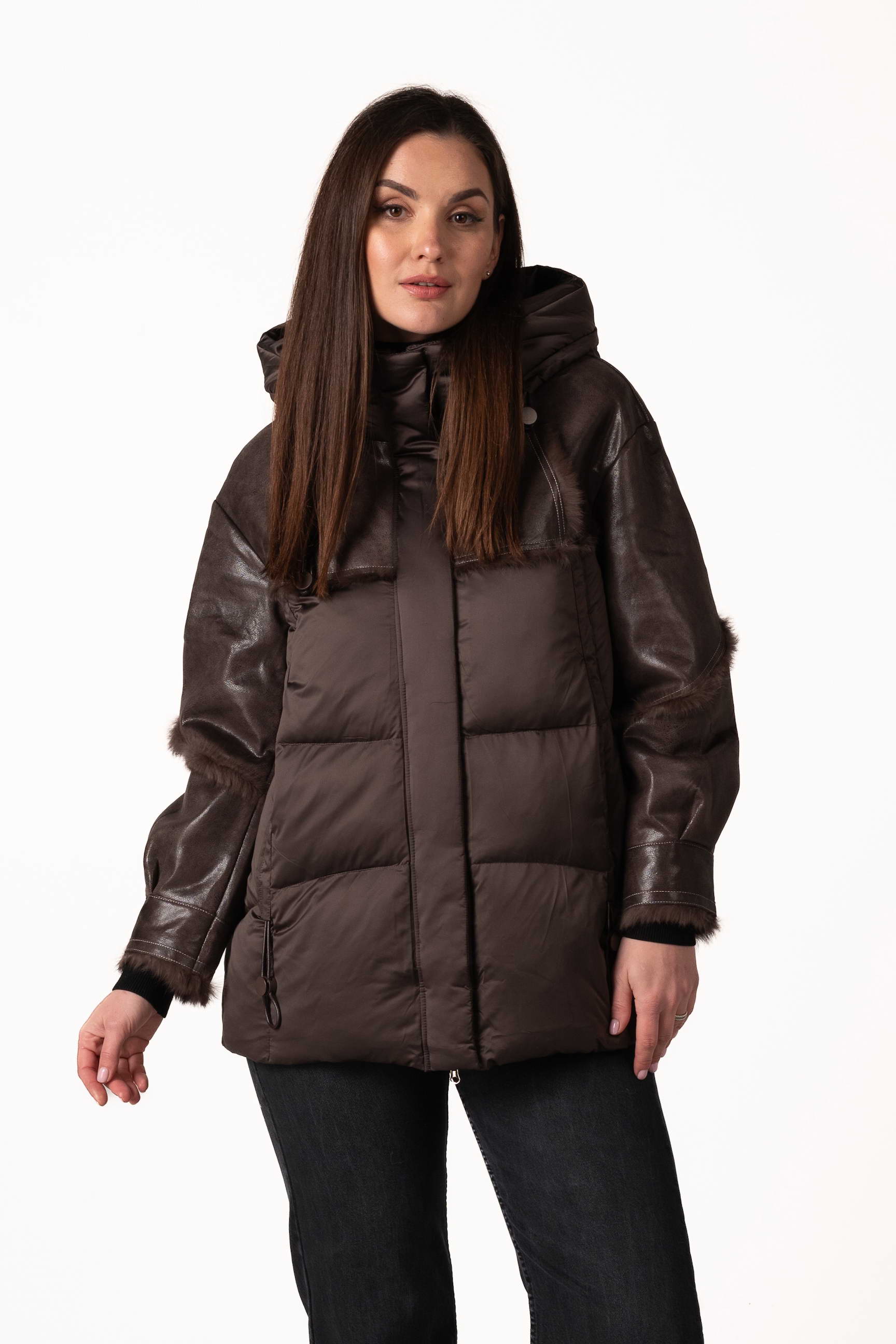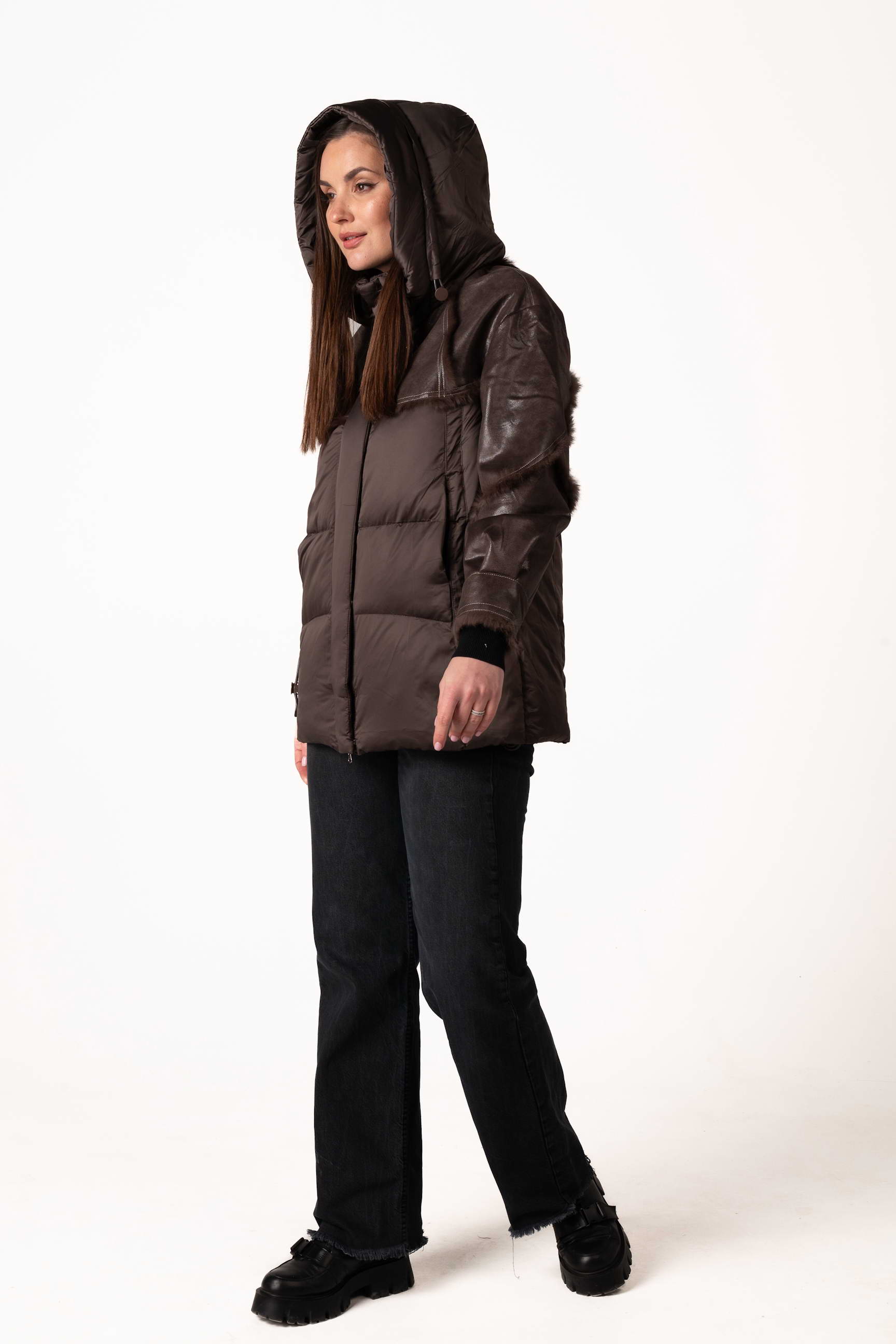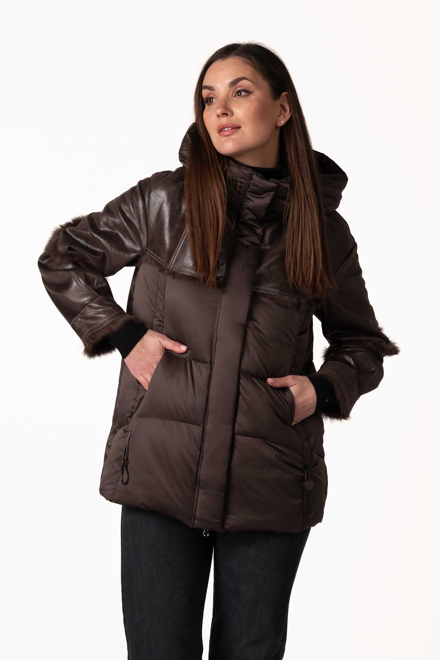 Стильний шоколадний жіночий біопуховик — ідеальне поєднання тепла, комфорту та сучасного дизайну для зимового сезону. Модель доповнена вставками з натуральної шкіри та хутра кроля, що підкреслюють розкішний вигляд і додають елегантності. Якщо ви плануєте купити жіночий зимовий пуховик, цей варіант стане практичним і стильним вибором для щоденного носіння.