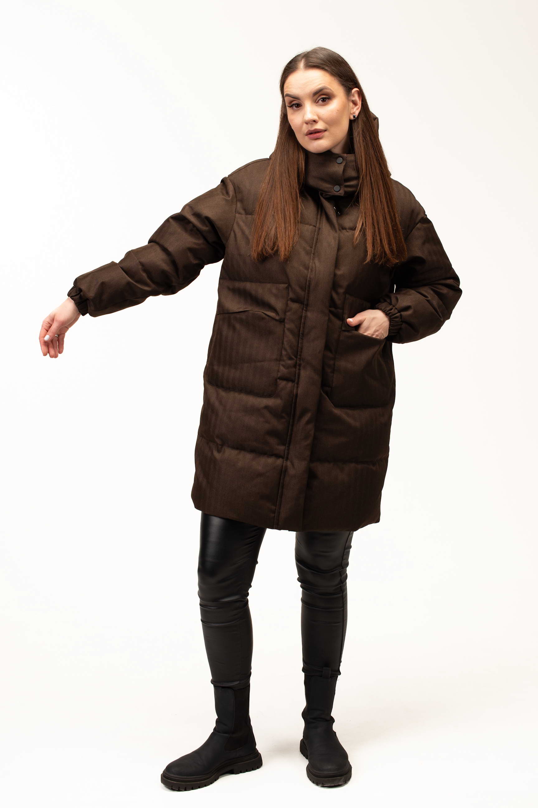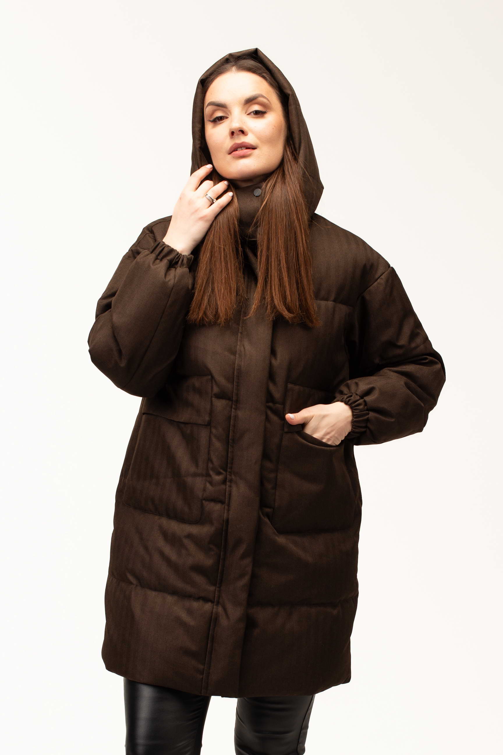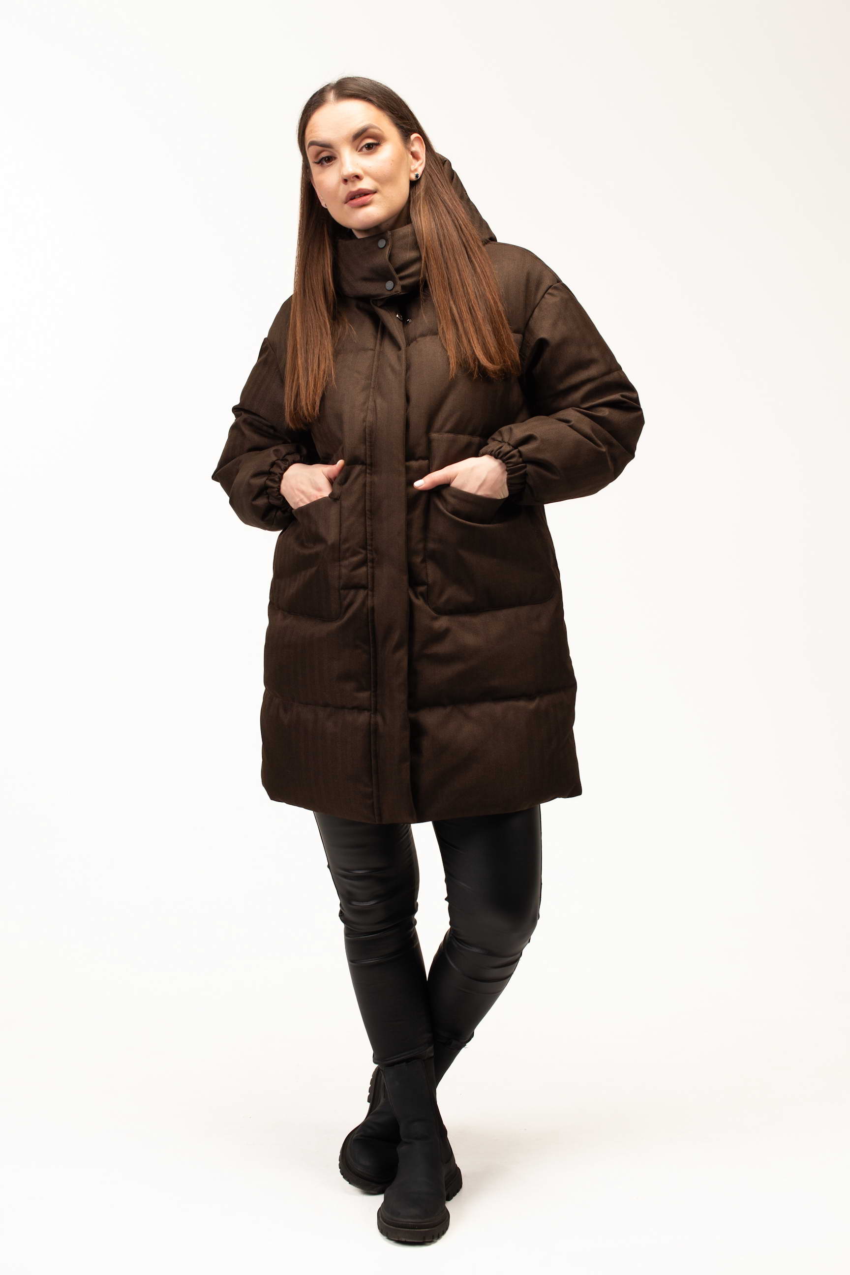 Глибокий коричневий відтінок додає образу стриманості та елегантності, добре поєднується з базовим гардеробом і підходить для створення як повсякденних, так і більш класичних зимових луків. Подовжена довжина 100 см забезпечує додатковий захист від холоду та вітру, що особливо актуально під час тривалих прогулянок або активного способу життя.