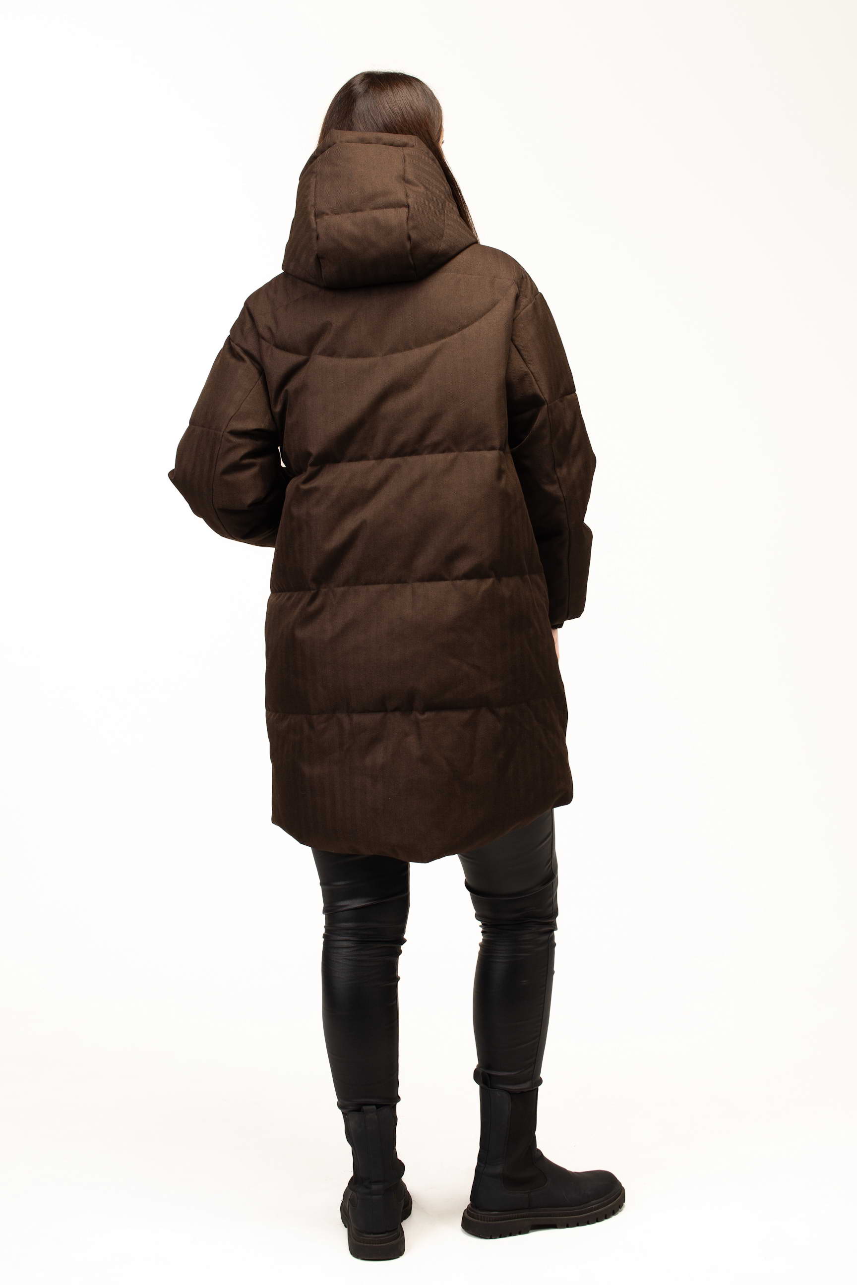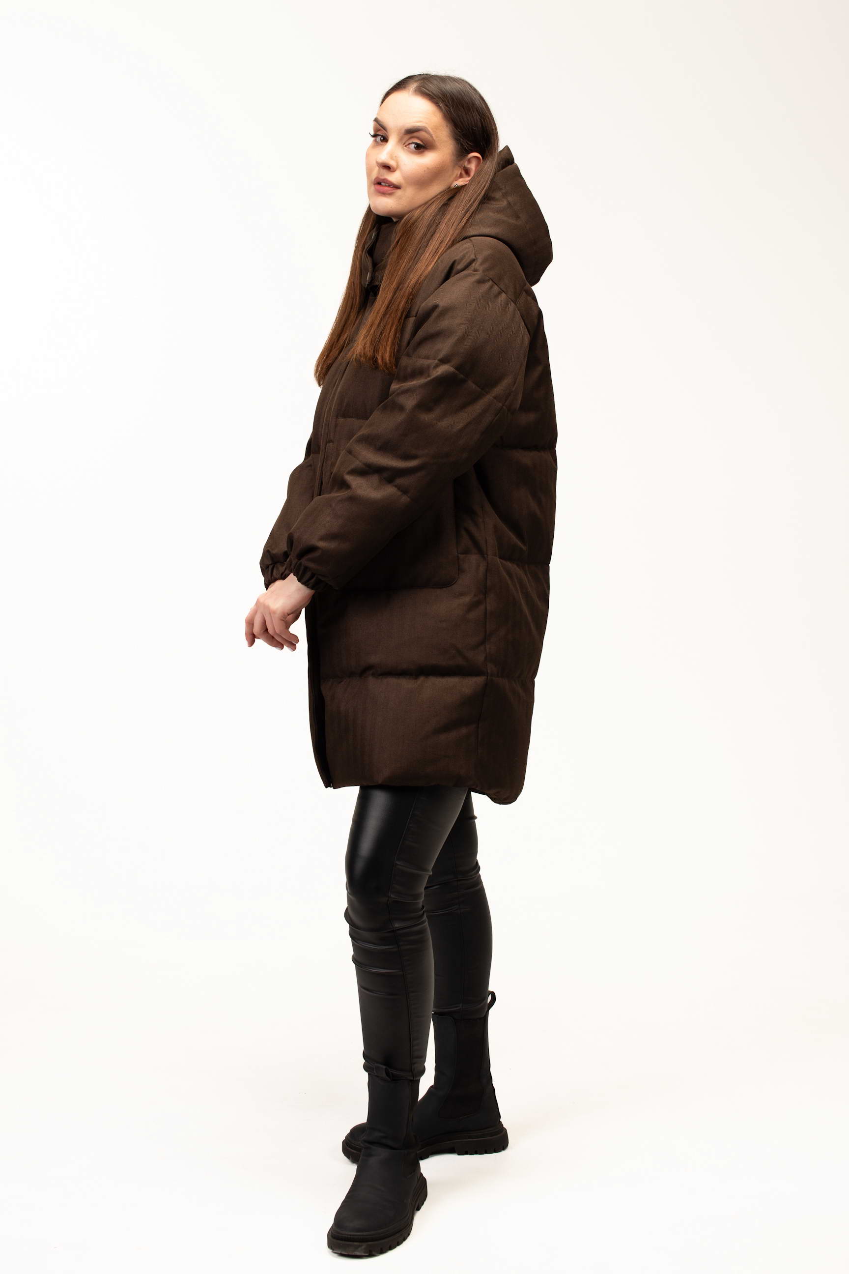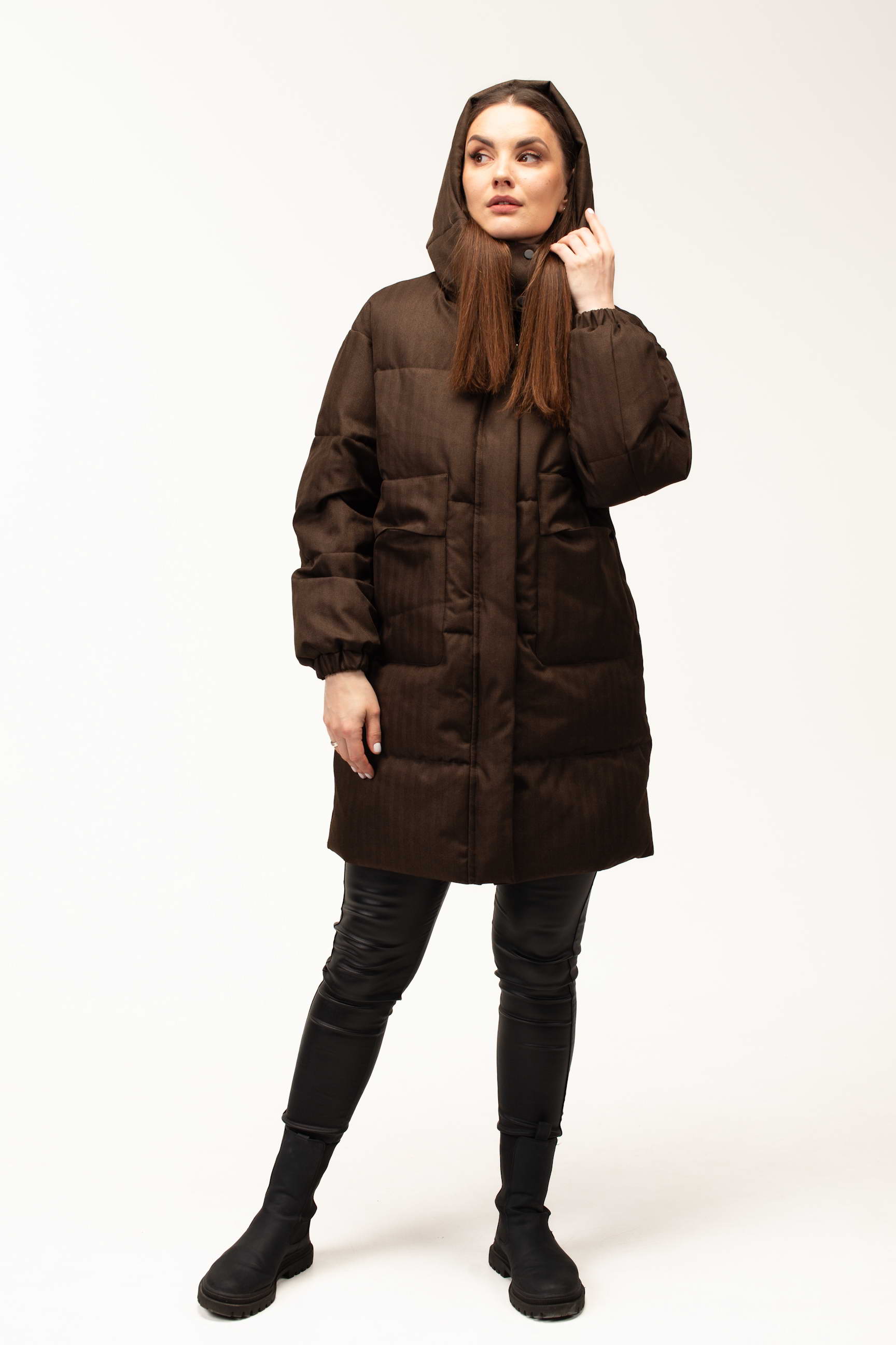 Глибокий коричневий відтінок додає образу стриманості та елегантності, добре поєднується з базовим гардеробом і підходить для створення як повсякденних, так і більш класичних зимових луків. Подовжена довжина 100 см забезпечує додатковий захист від холоду та вітру, що особливо актуально під час тривалих прогулянок або активного способу життя.