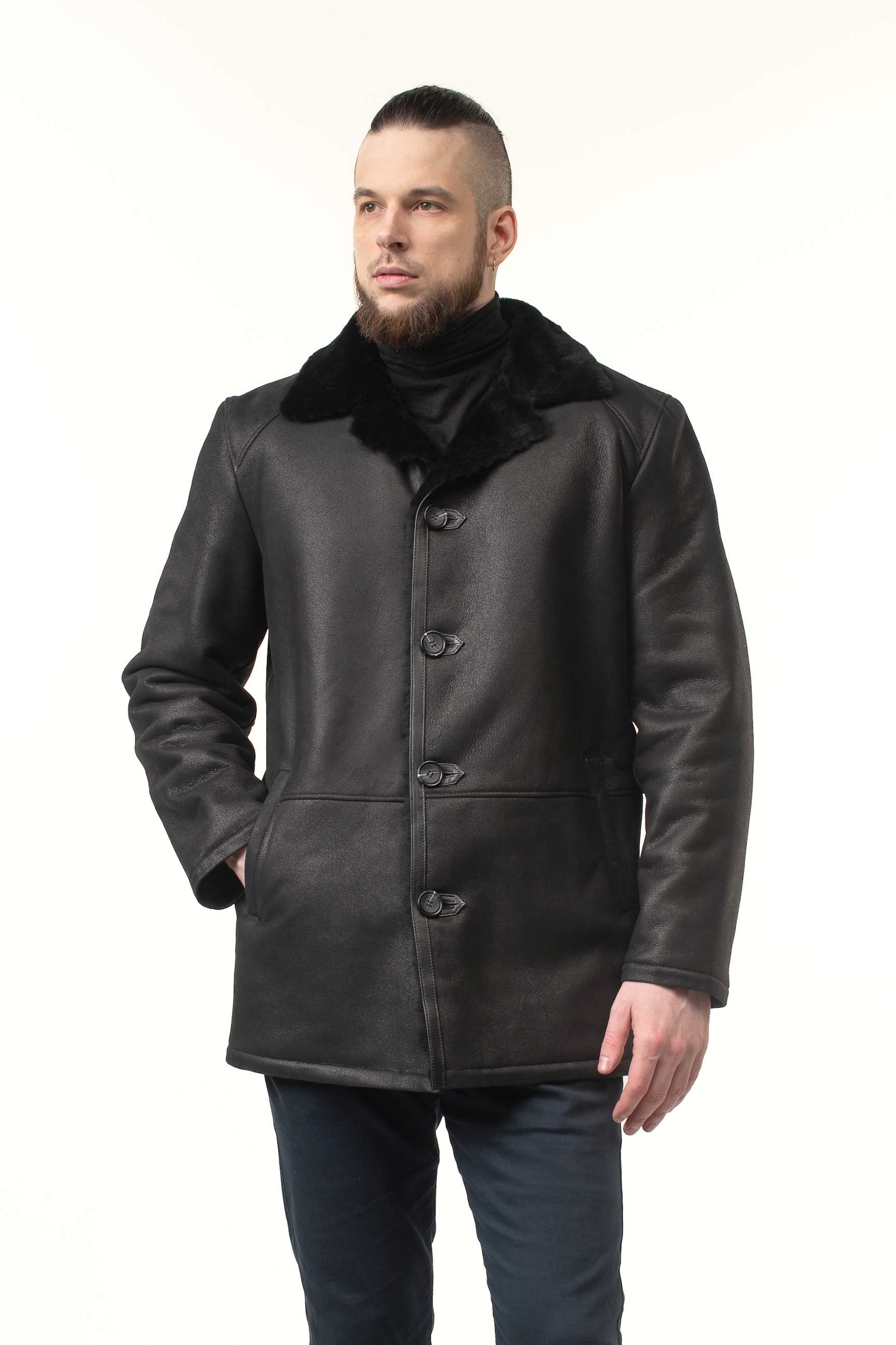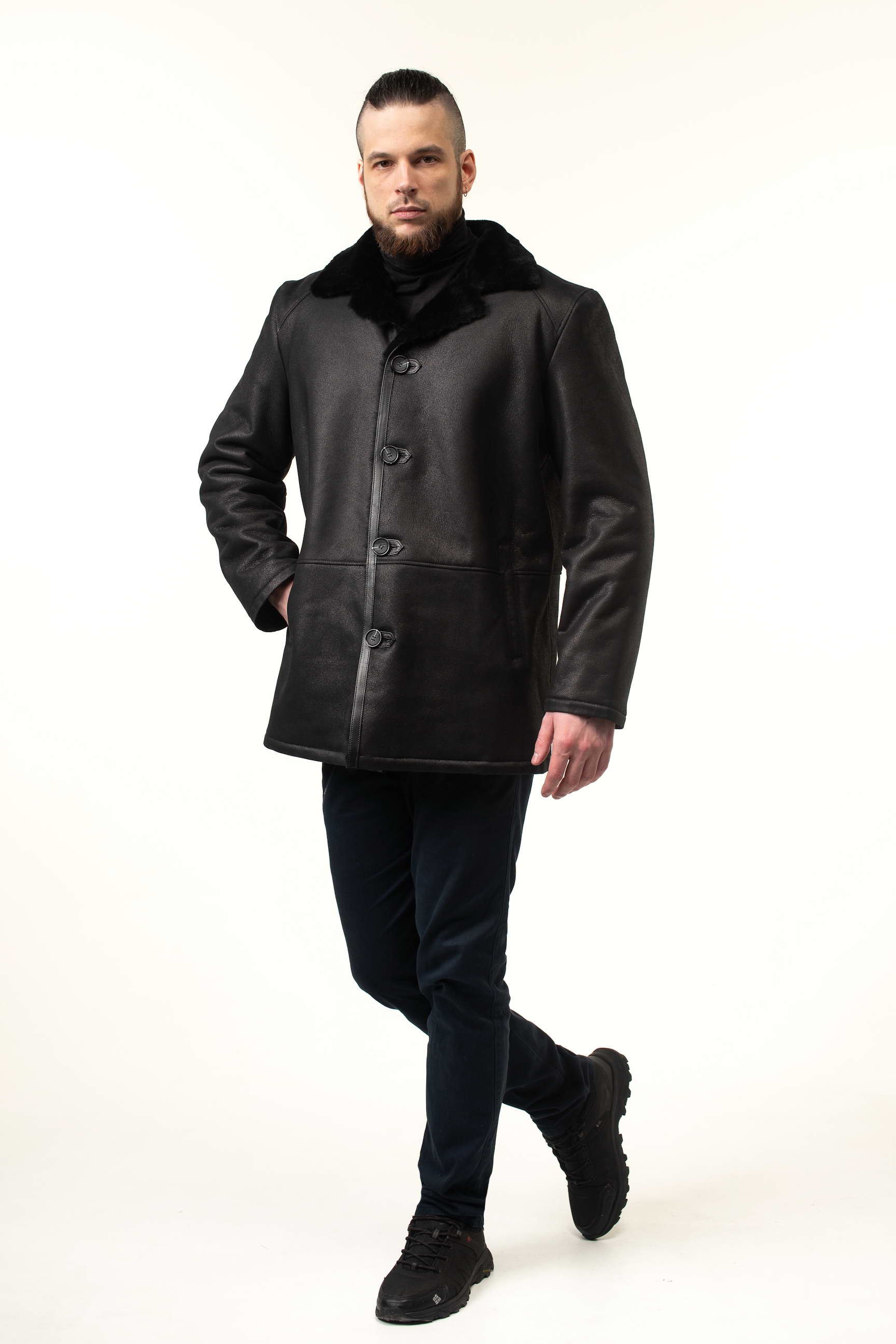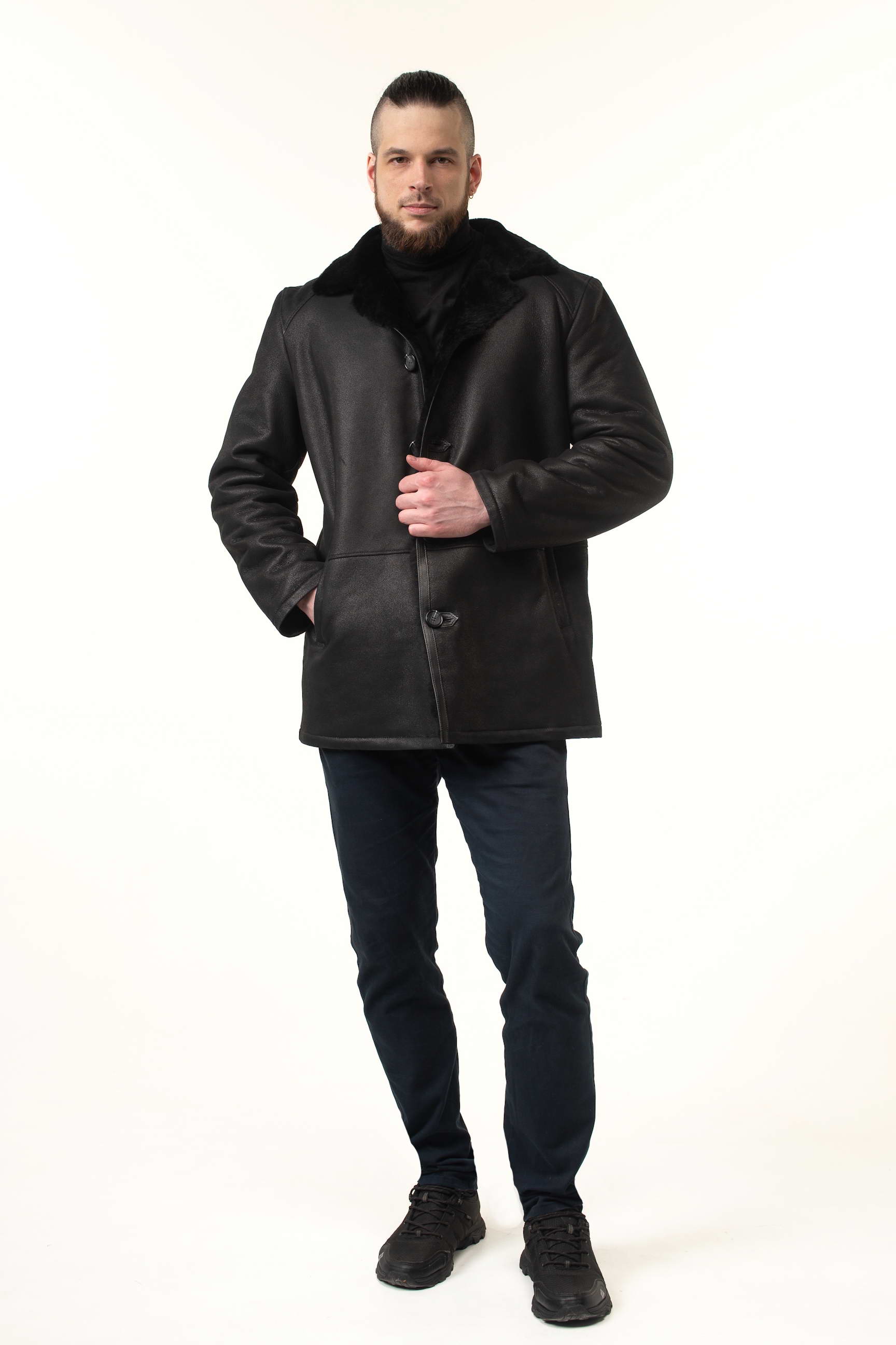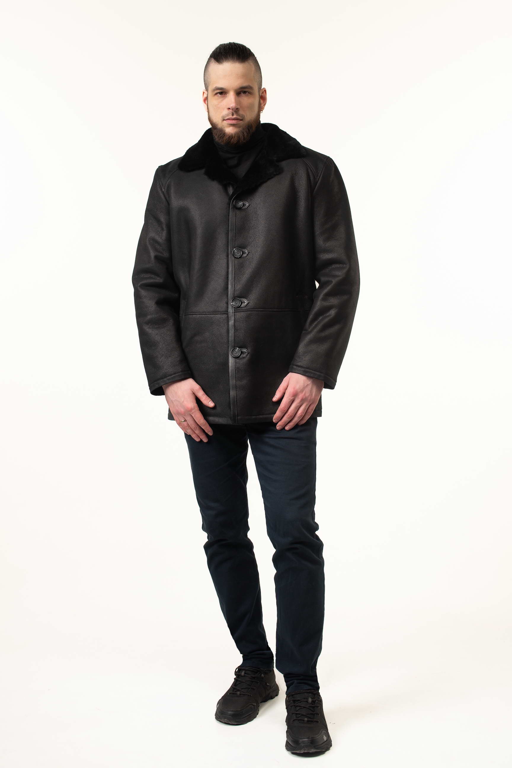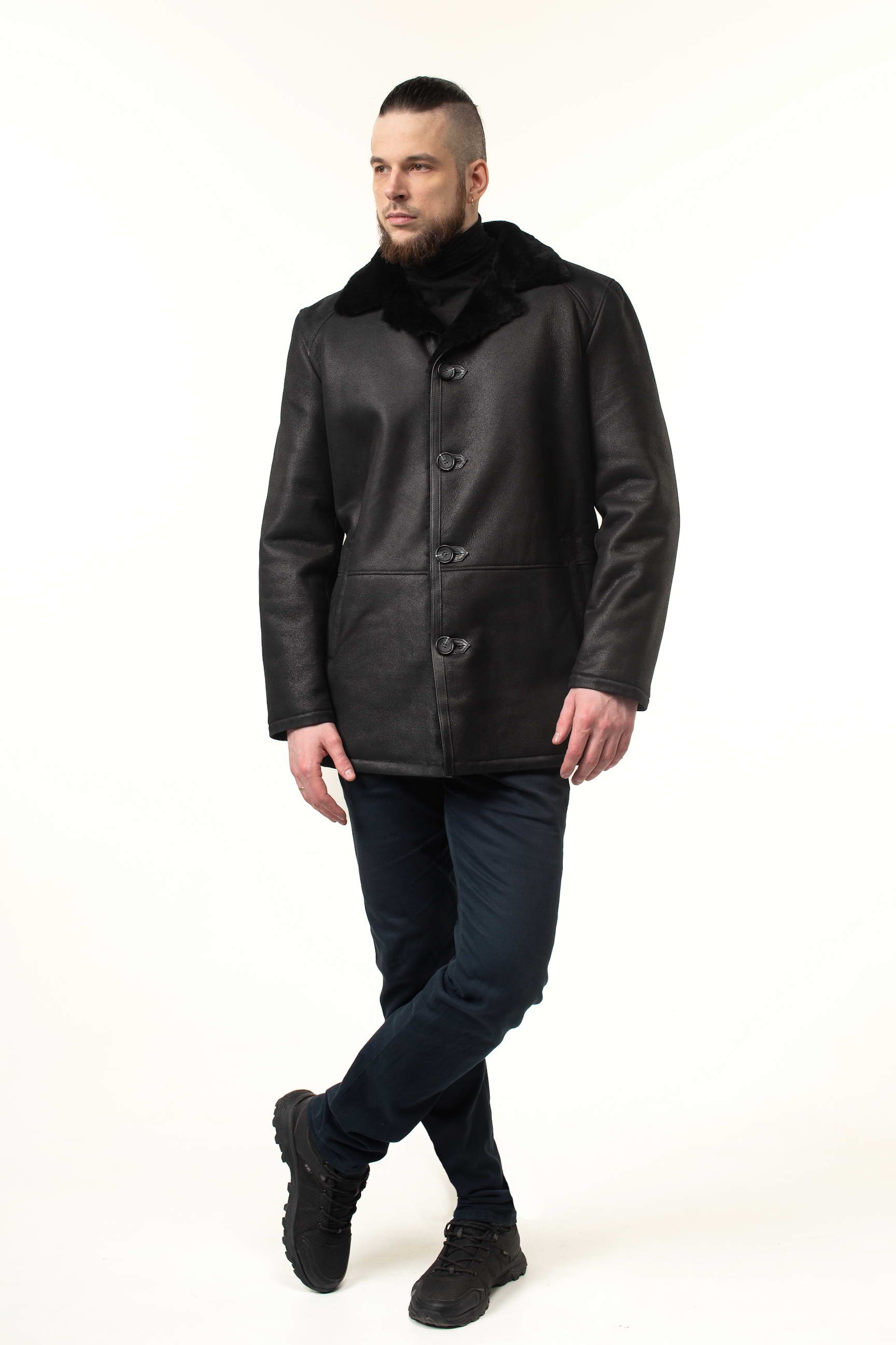 Чоловіча дублянка чорного кольору легко поєднується з різним одягом: