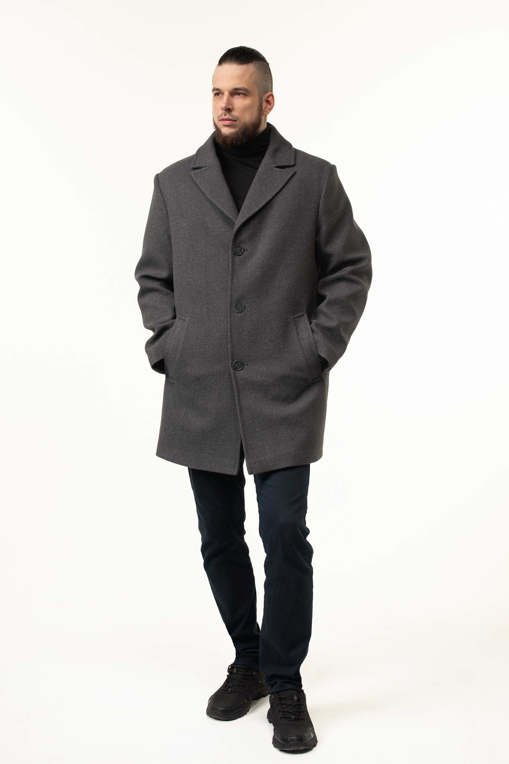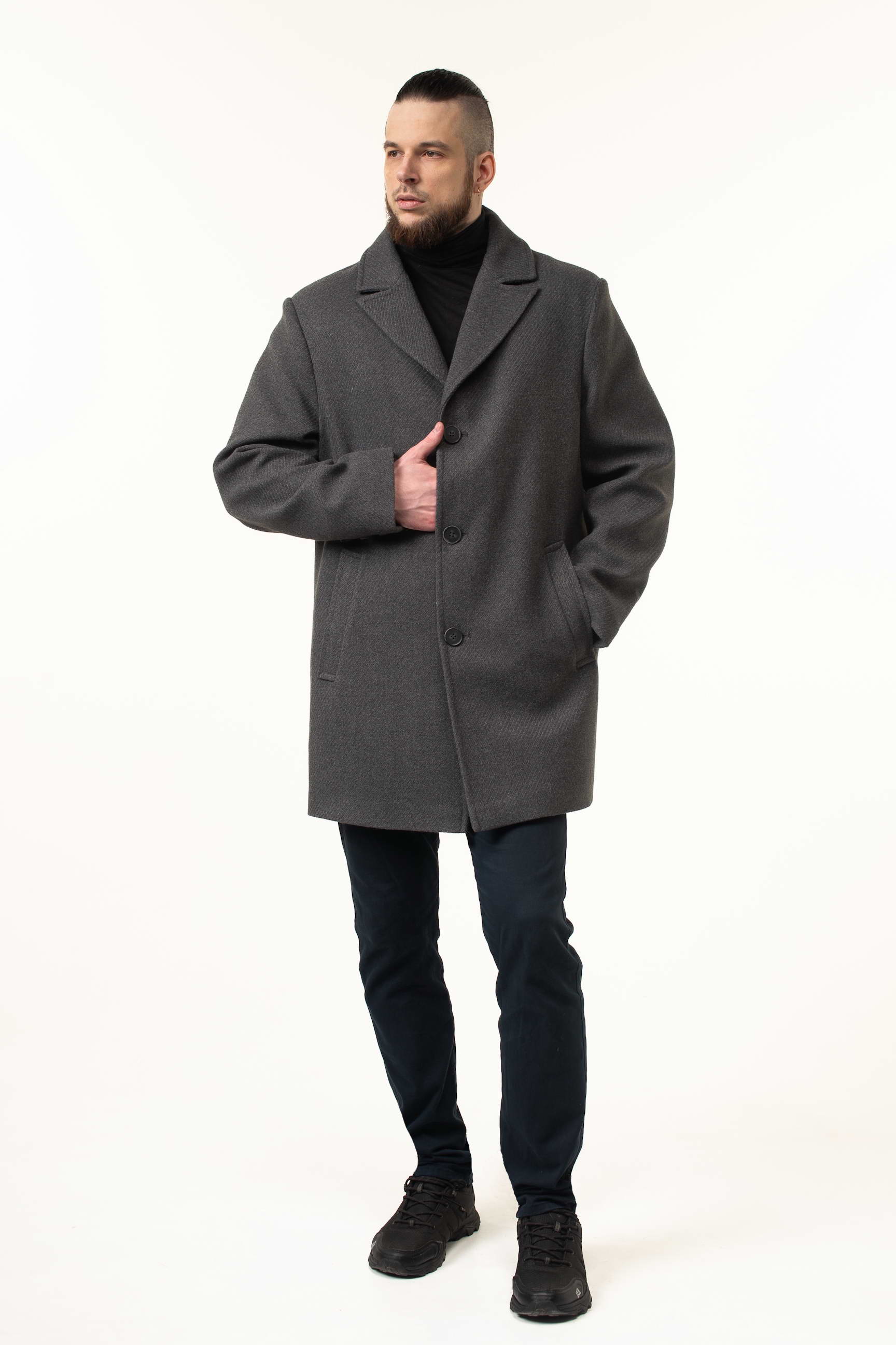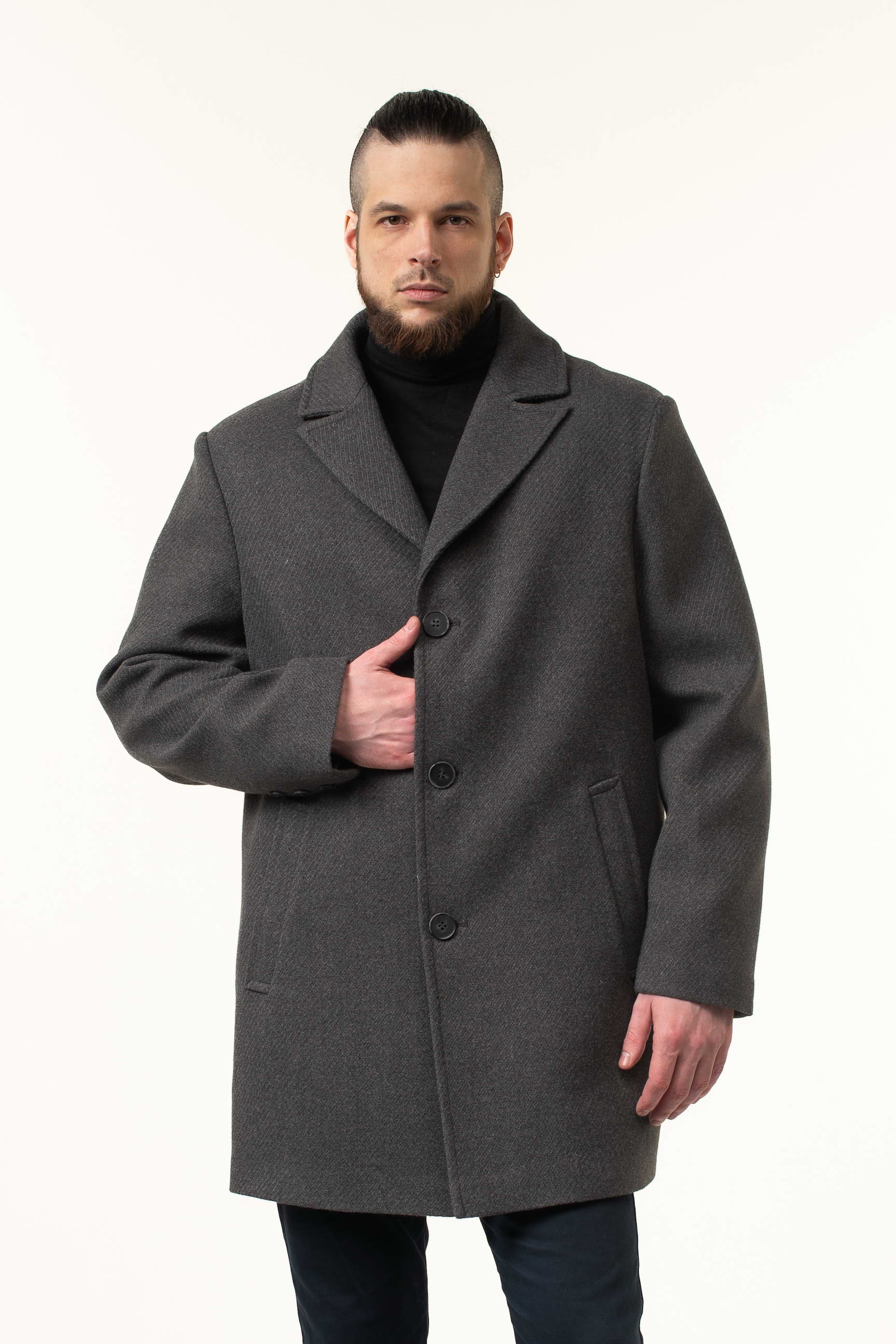 Виготовлене з високоякісної пальтової тканини, це пальто відрізняється м’якістю, щільністю та довговічністю. Матеріал відмінно тримає форму, не мнеться і забезпечує гарний зовнішній вигляд протягом усього дня. Насичений сірий колір робить виріб універсальним: його легко поєднувати з класичними костюмами, брюками, джинсами та кежуал-луками.