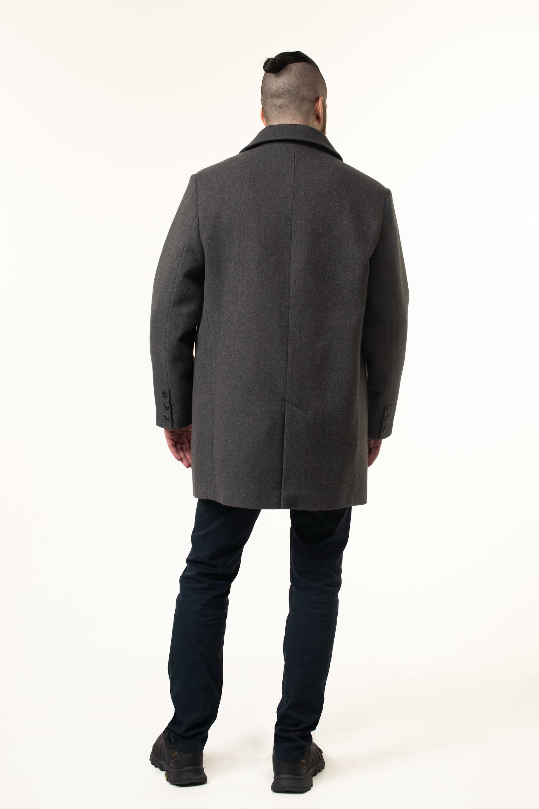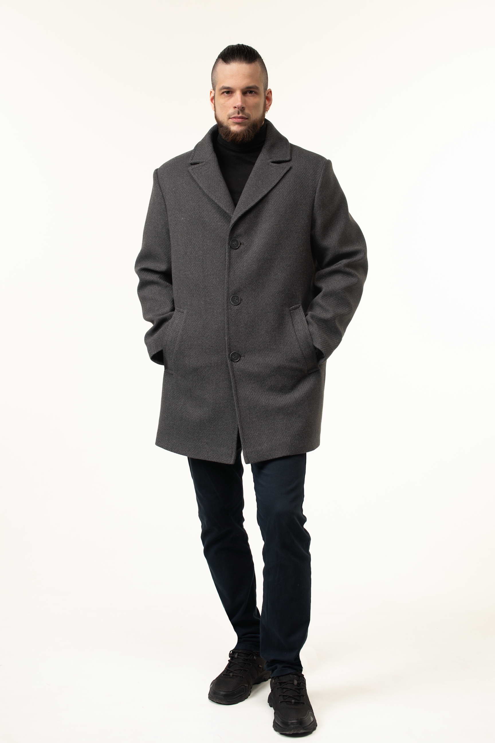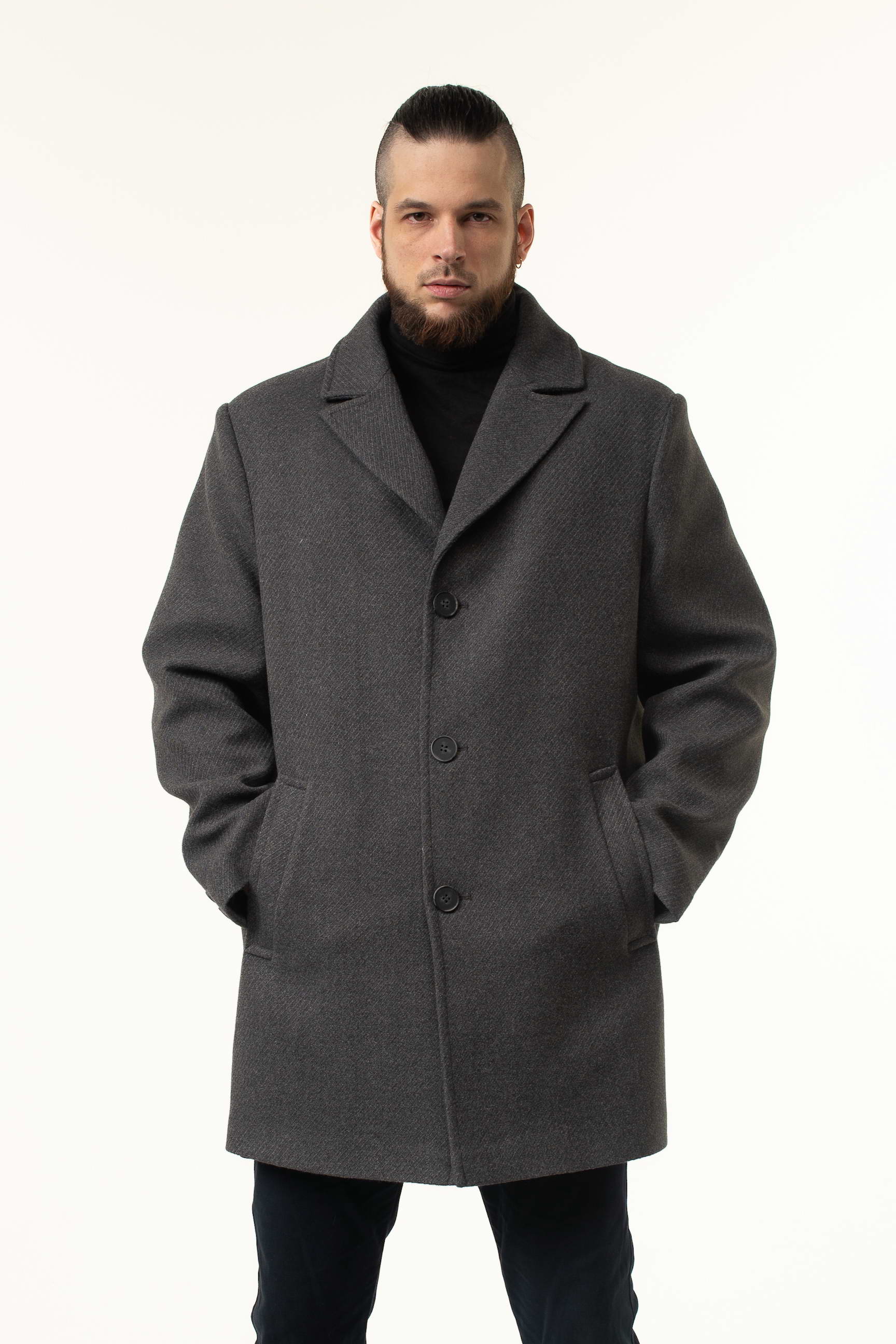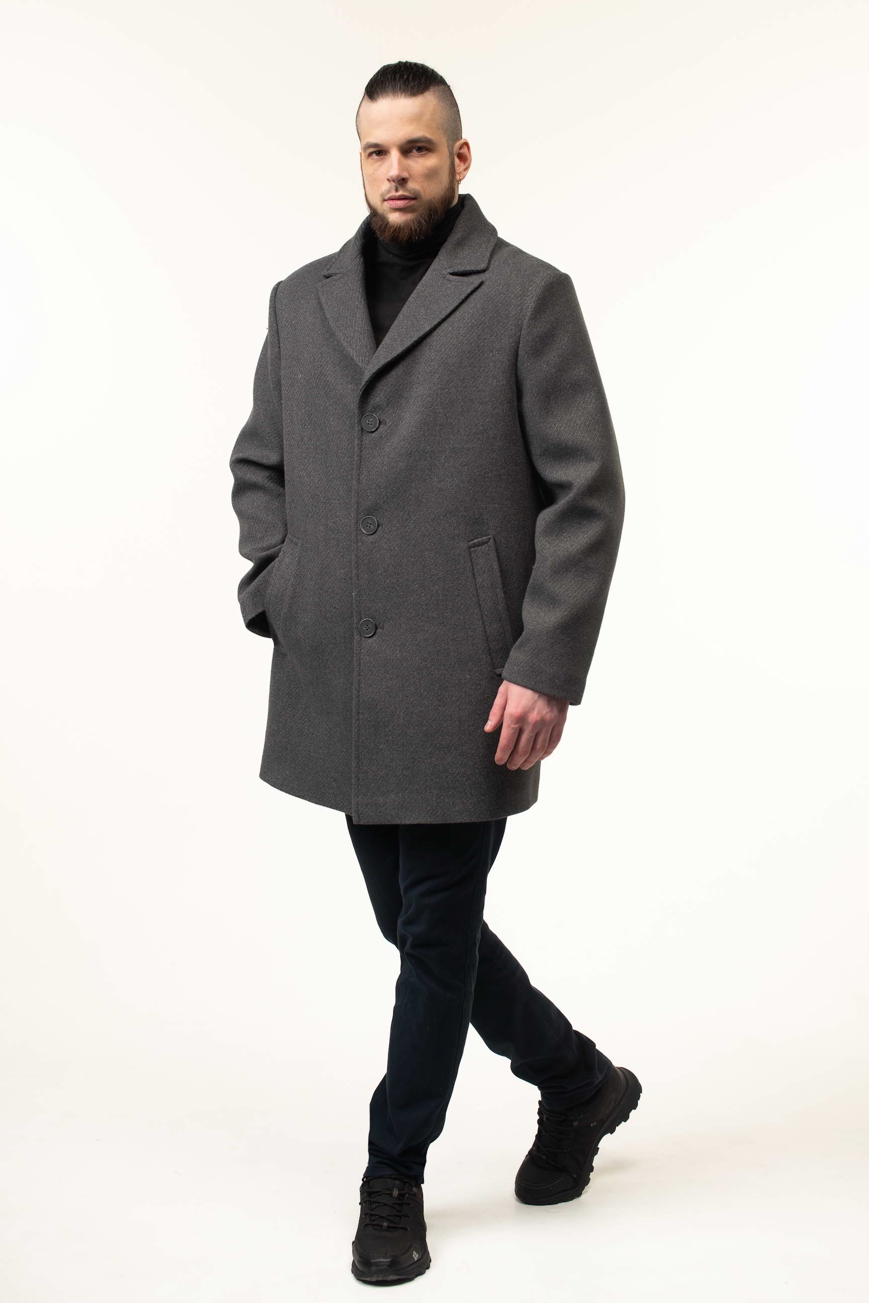 Виготовлене з високоякісної пальтової тканини, це пальто відрізняється м’якістю, щільністю та довговічністю. Матеріал відмінно тримає форму, не мнеться і забезпечує гарний зовнішній вигляд протягом усього дня. Насичений сірий колір робить виріб універсальним: його легко поєднувати з класичними костюмами, брюками, джинсами та кежуал-луками.