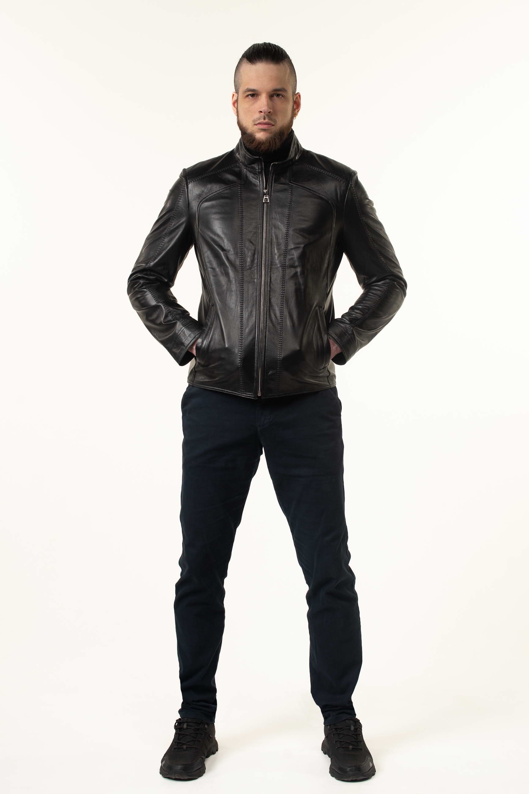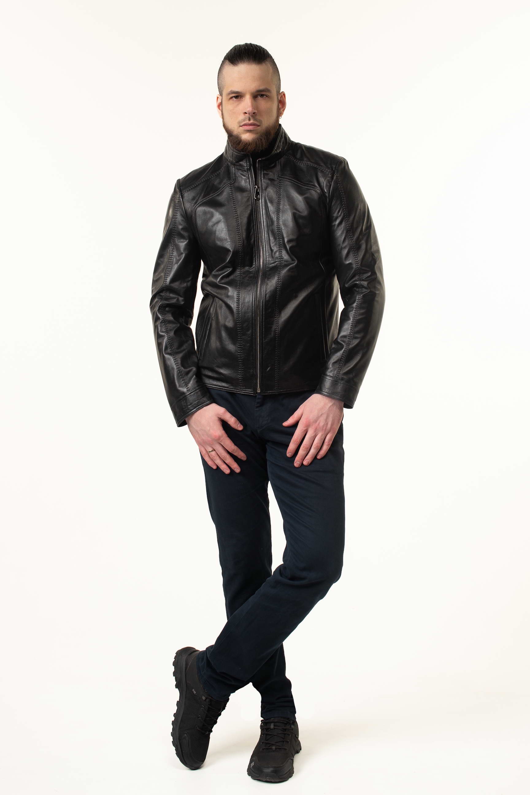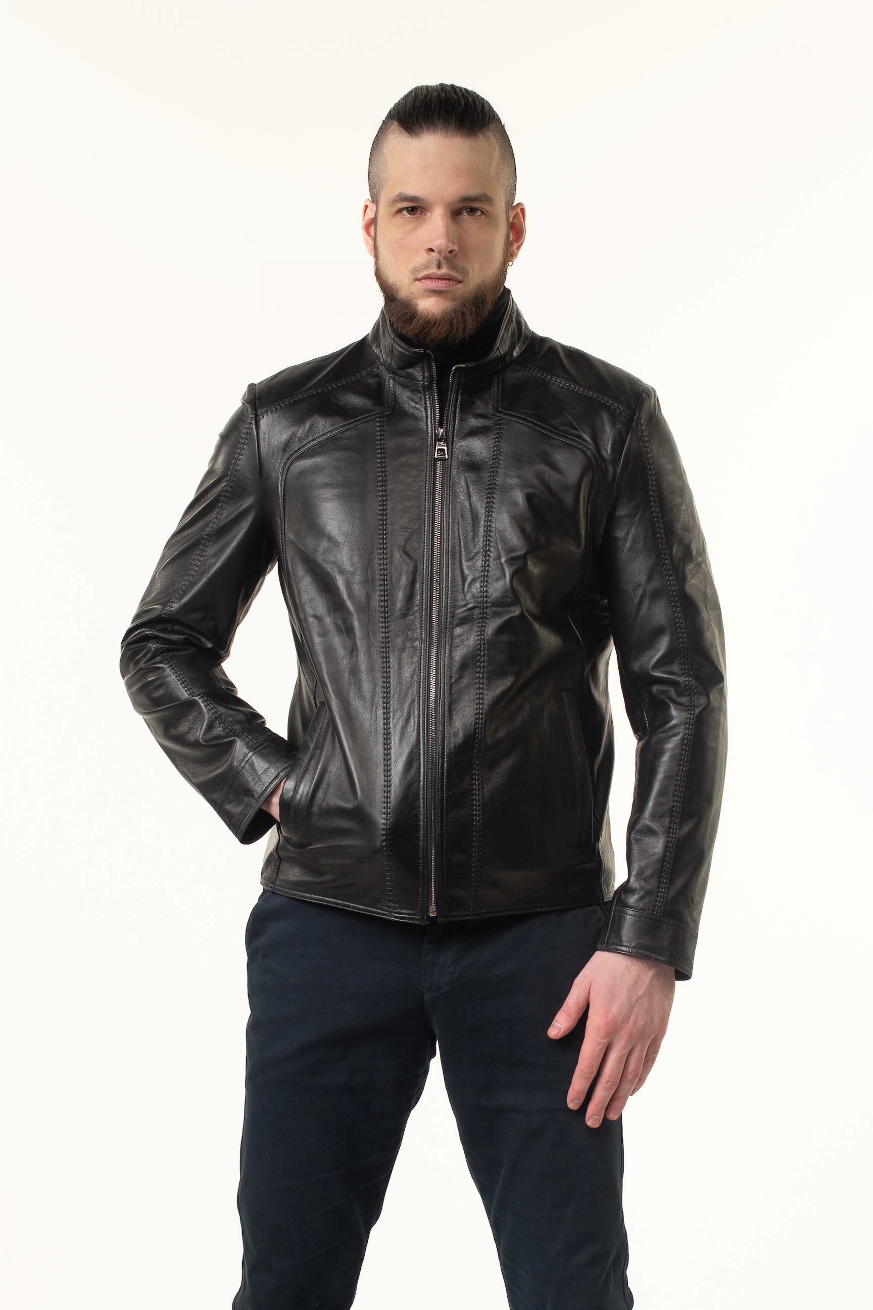 Ефектна чоловіча шкіряна куртка для сезону весна/осінь — поєднання класики та сучасних деталей. Модель виготовлена з натуральної телячої шкіри преміальної якості, яка відзначається м’якістю, еластичністю та високою зносостійкістю. Гладка поверхня матеріалу гармонійно доповнена декоративними прострочками, що додають виробу структури та виразності.