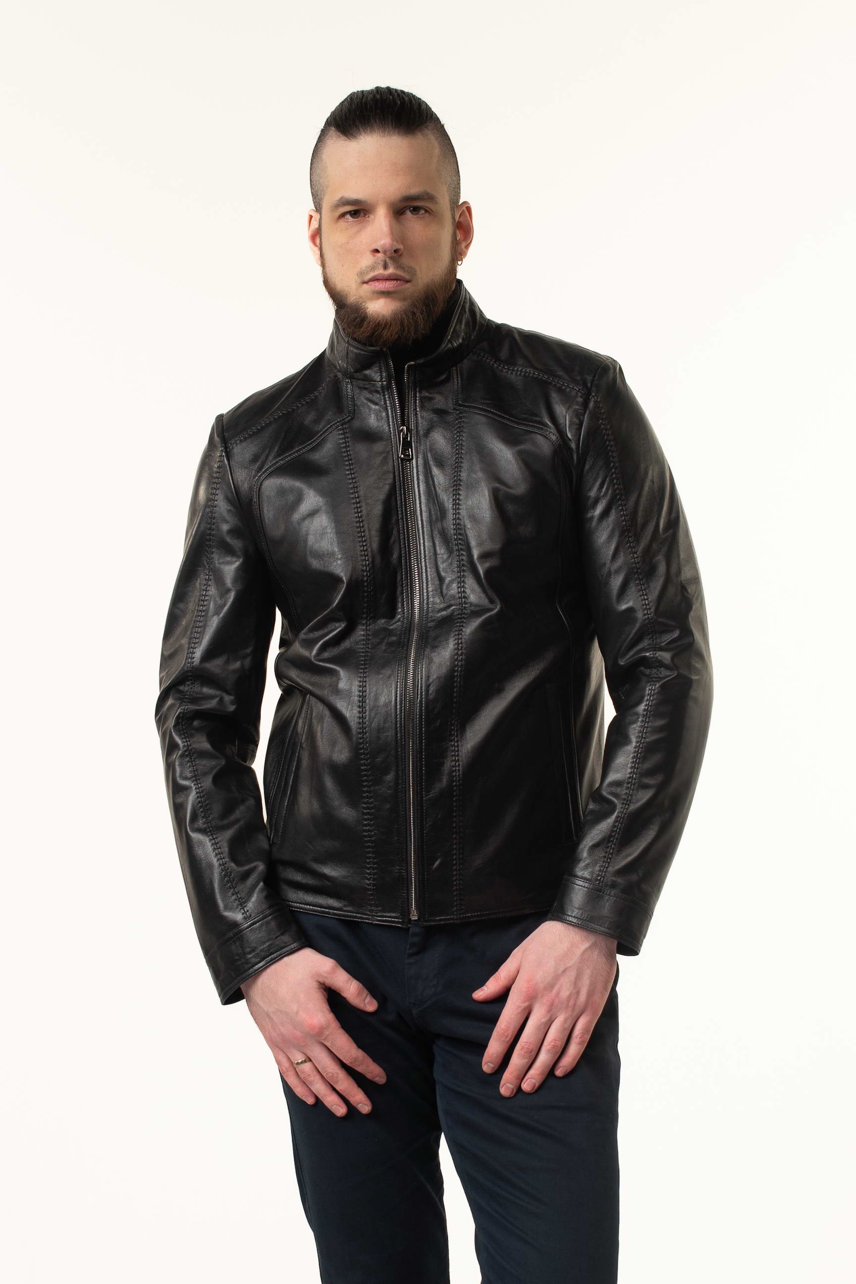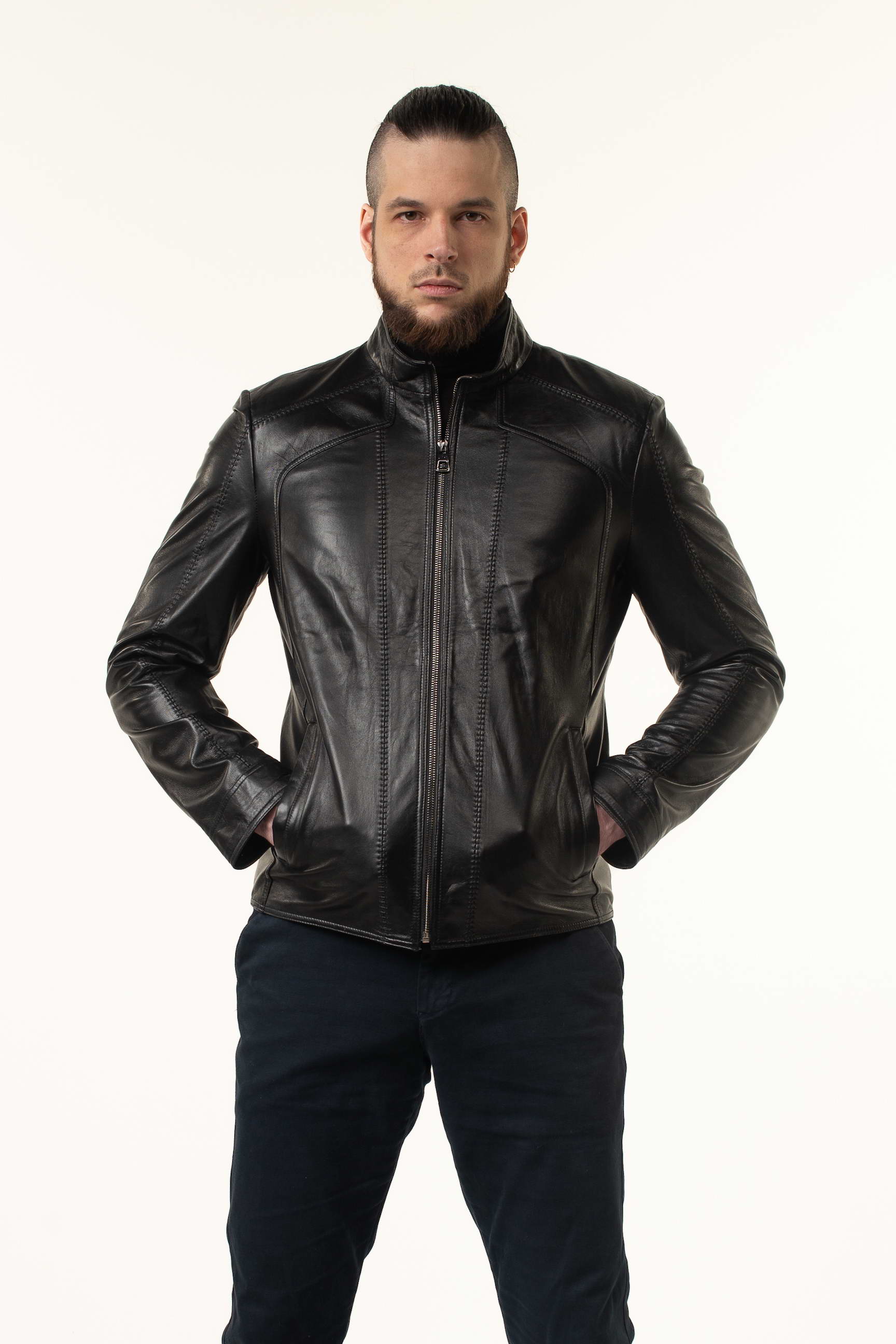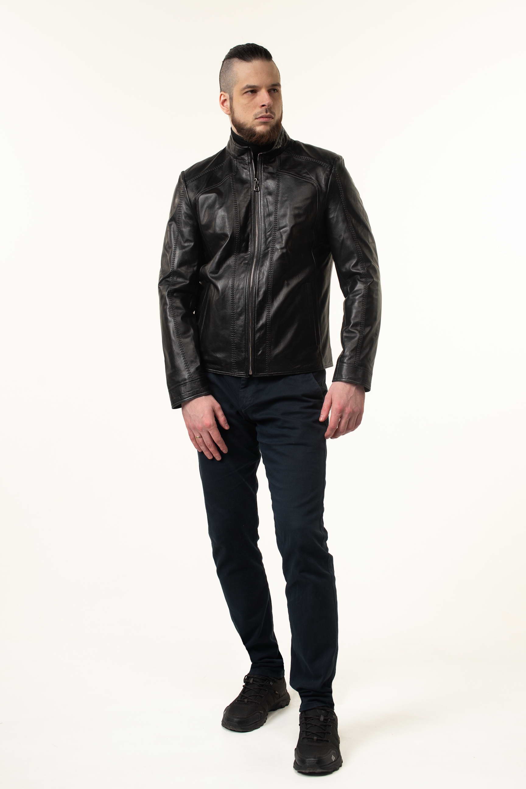 Ефектна чоловіча шкіряна куртка для сезону весна/осінь — поєднання класики та сучасних деталей. Модель виготовлена з натуральної телячої шкіри преміальної якості, яка відзначається м’якістю, еластичністю та високою зносостійкістю. Гладка поверхня матеріалу гармонійно доповнена декоративними прострочками, що додають виробу структури та виразності.