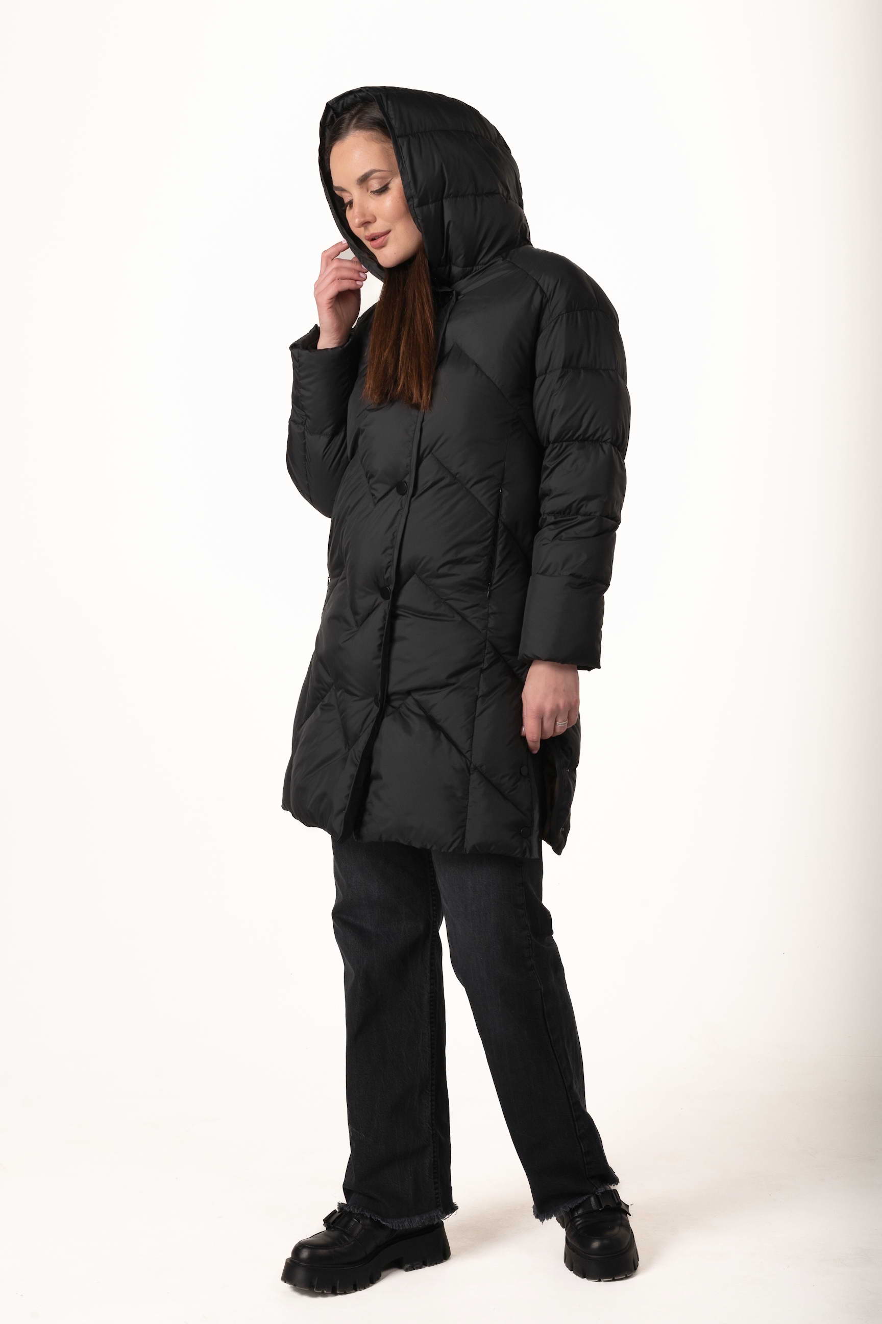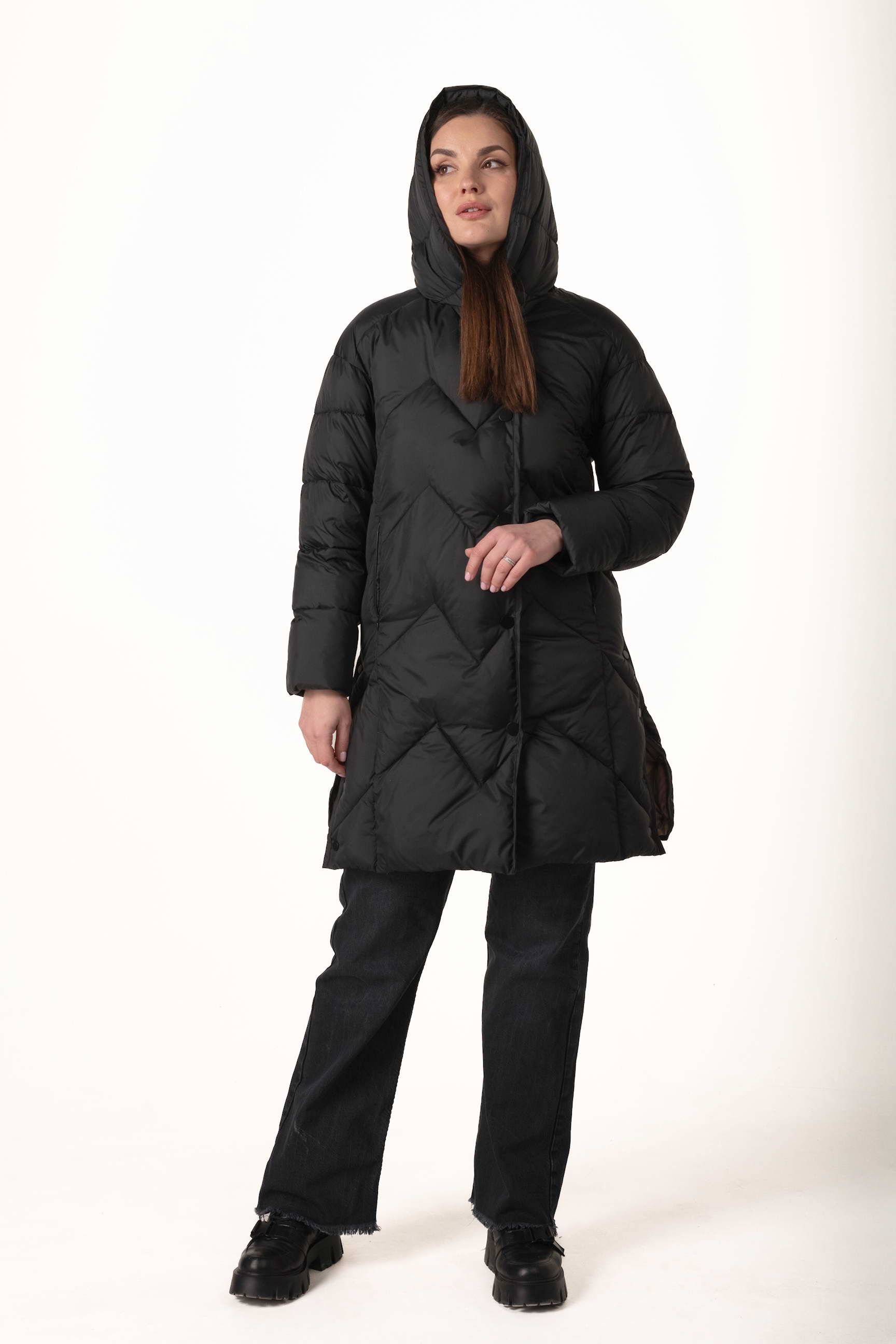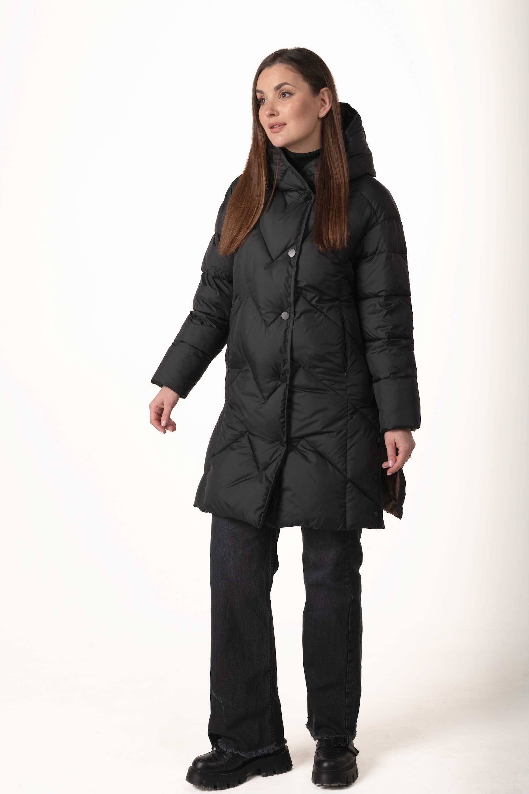 Прямий крій створює витягнутий силует, не обмежує рухів і дозволяє носити під пуховиком теплі багатошарові образи.