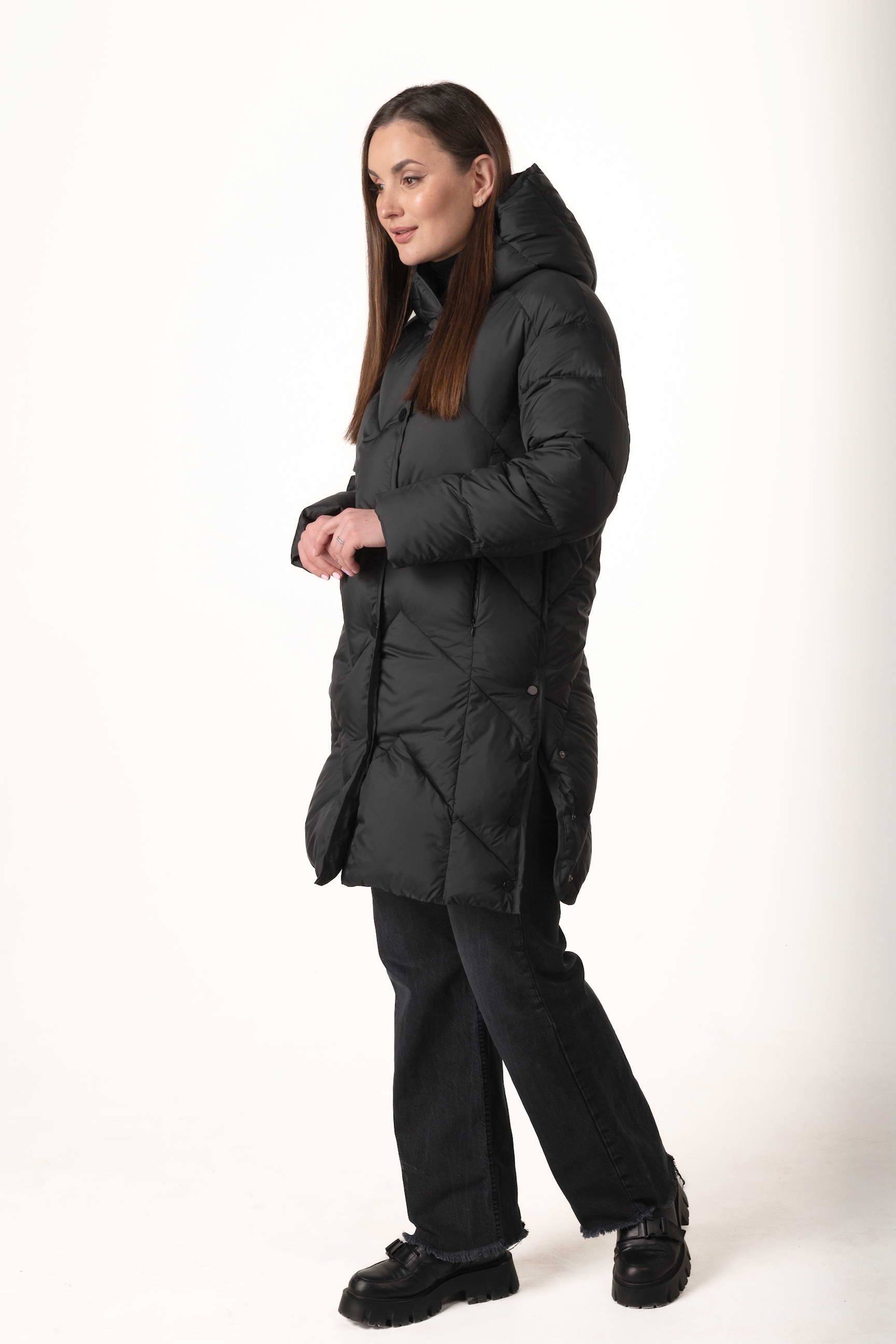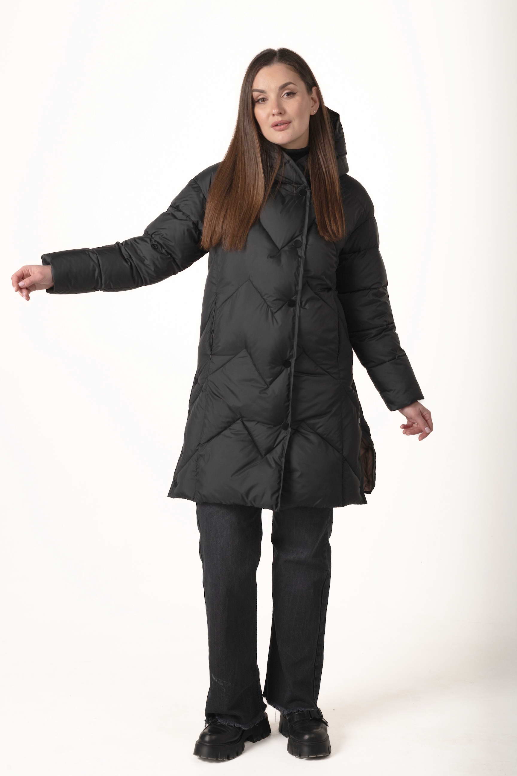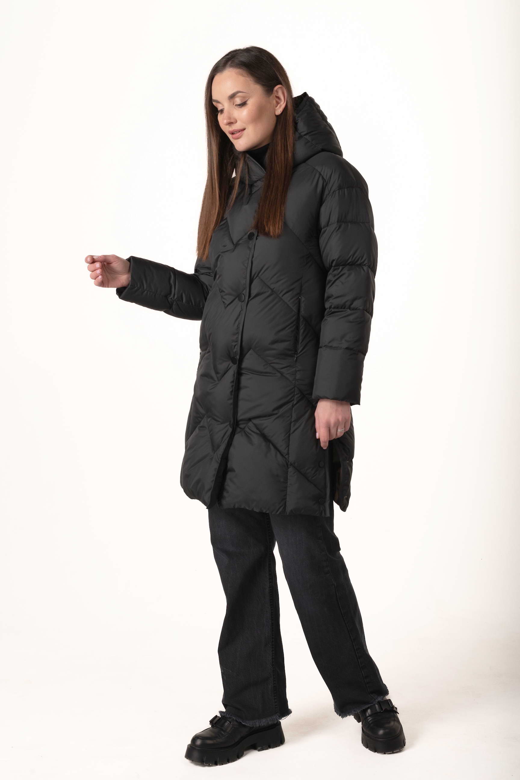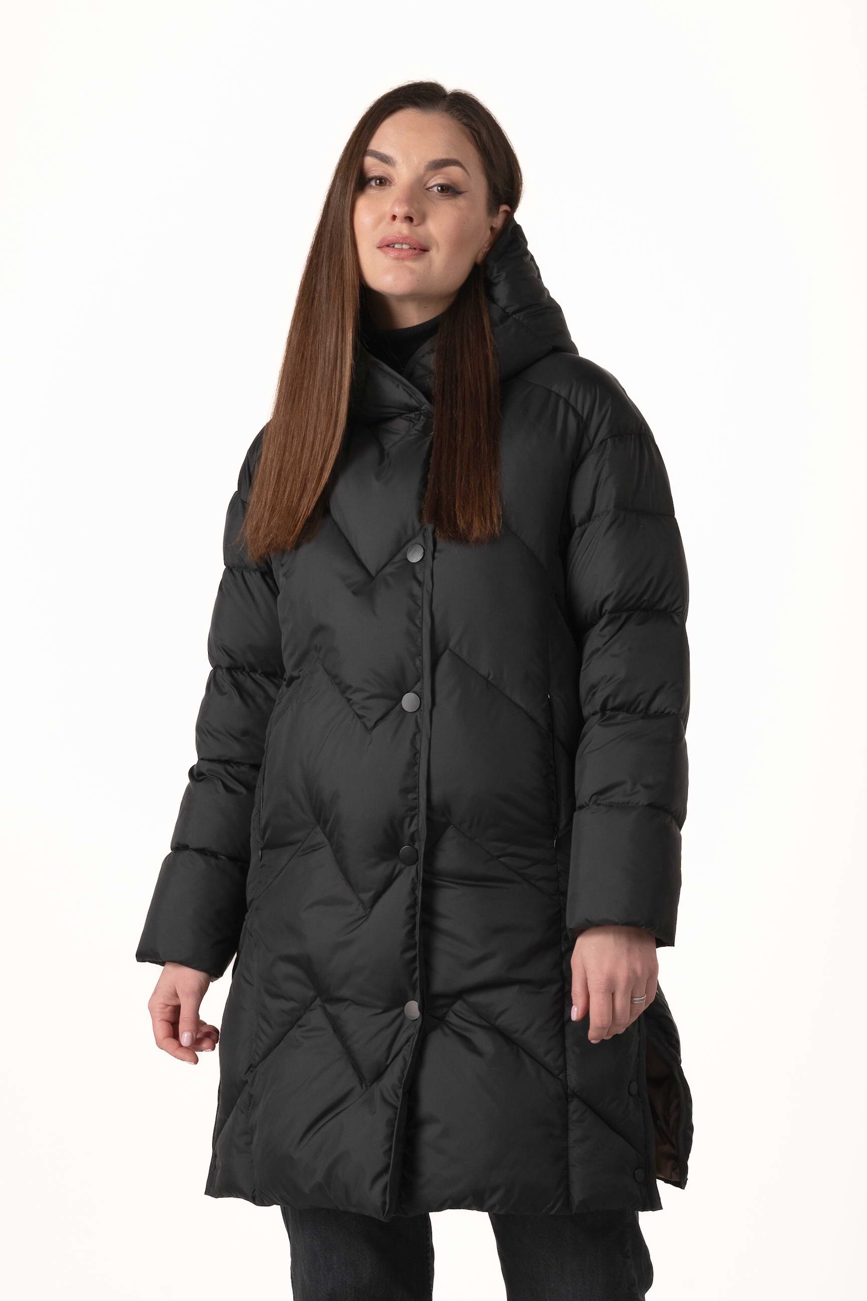 Прямий крій створює витягнутий силует, не обмежує рухів і дозволяє носити під пуховиком теплі багатошарові образи.