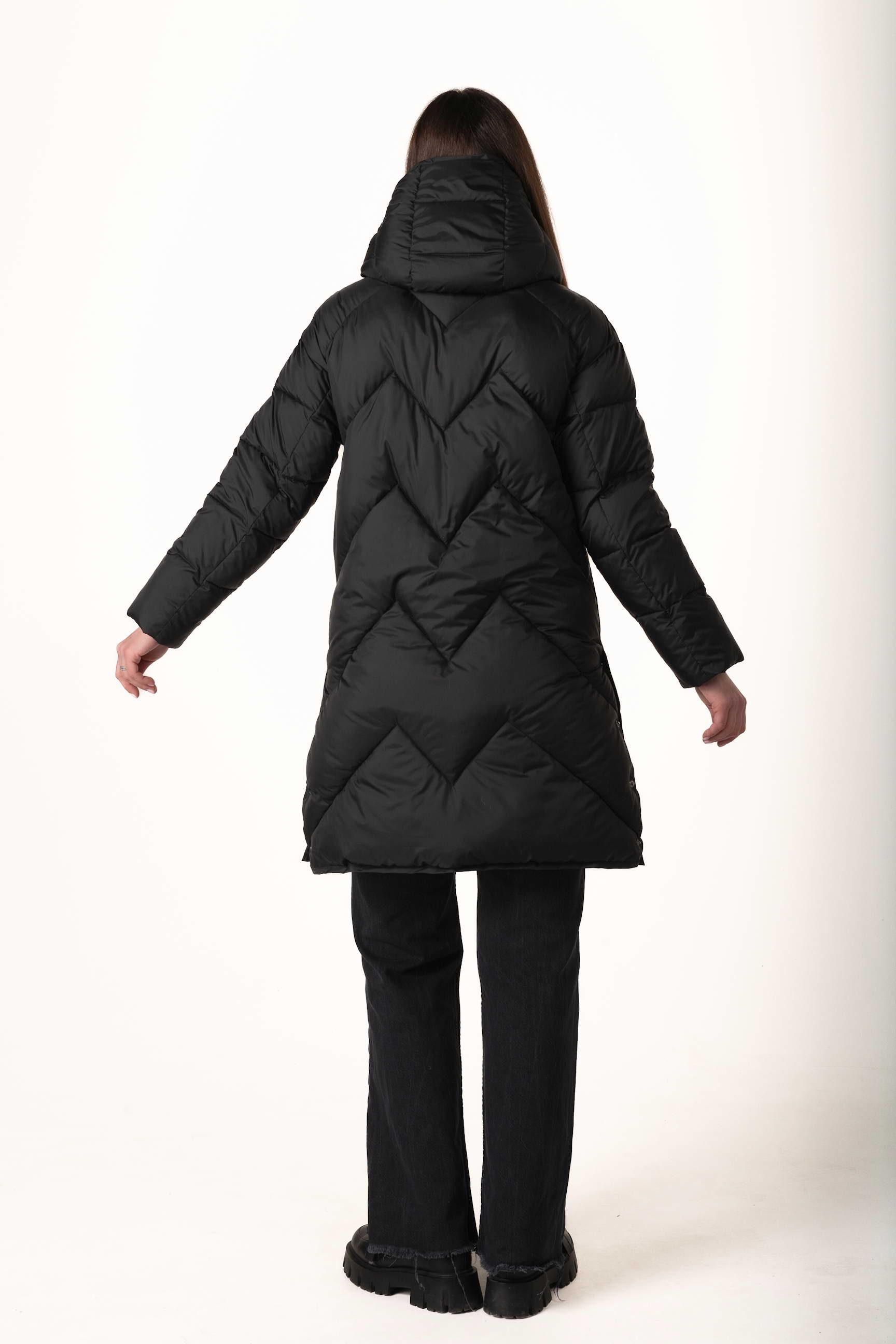 Високий комір-стійка разом із капюшоном надійно захищають шию та голову від холодного повітря та вітру, створюючи відчуття затишку в морозні дні.