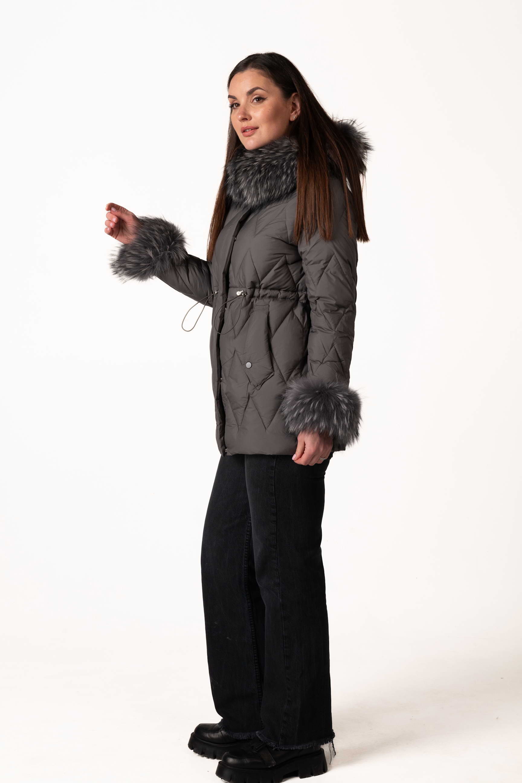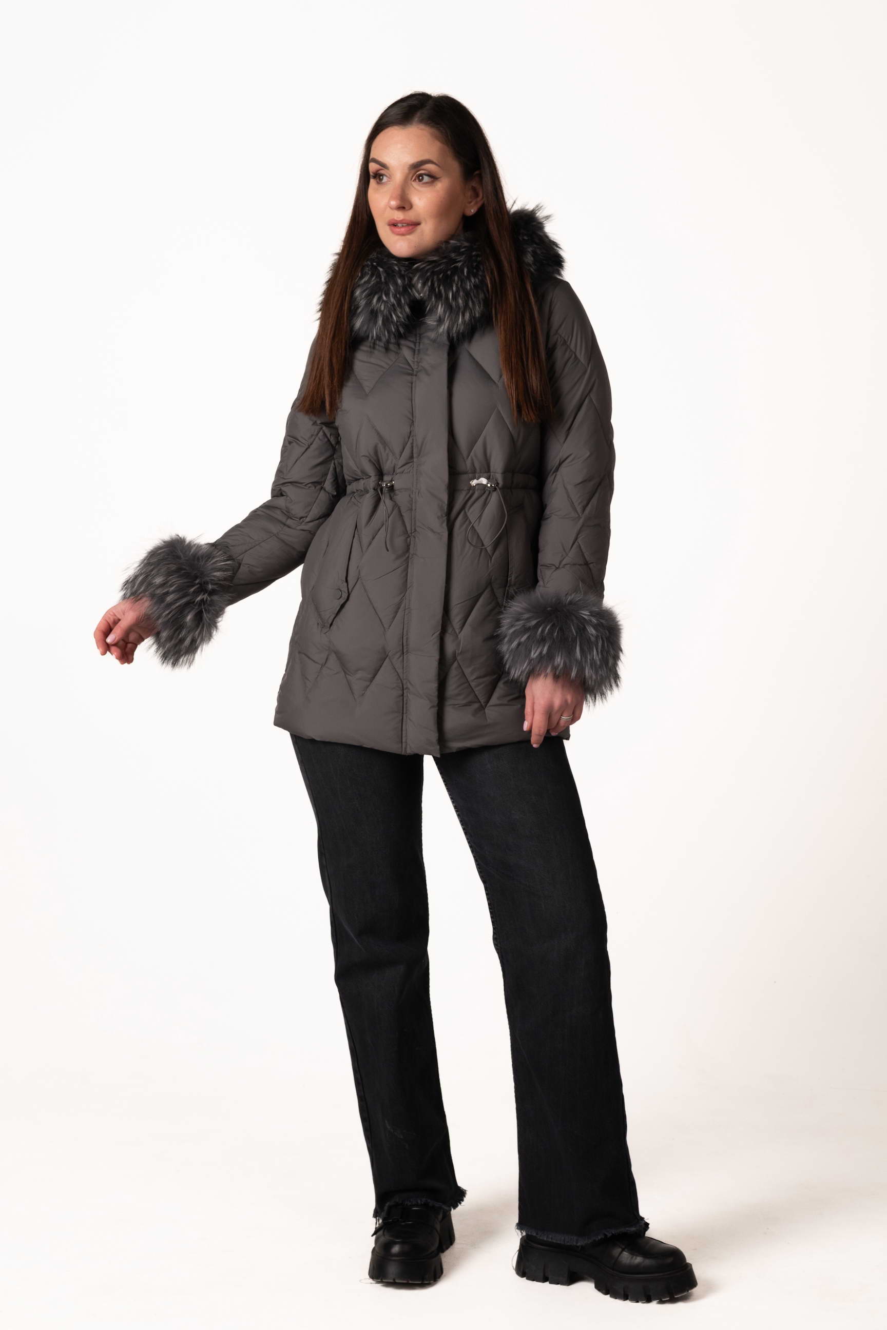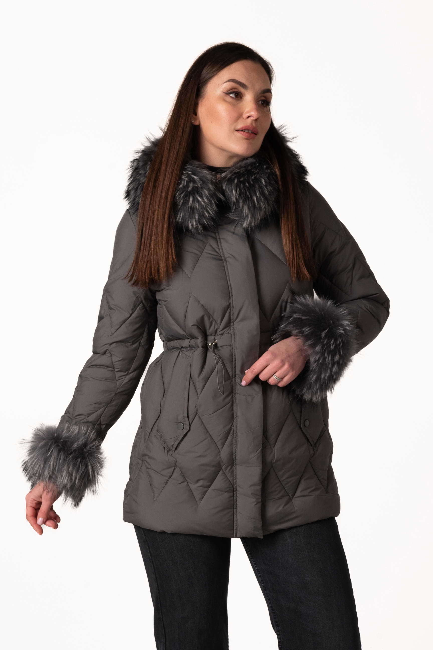 Сучасний графітовий жіночий біопуховик — стильна та функціональна модель для зимового сезону. Відстібний капюшон і манжети з хутром єнота, а також куліска на талії дозволяють регулювати посадку і створювати індивідуальний силует. Ромбовидна прострочка додає виробу елегантності та сучасного вигляду. Якщо ви плануєте купити жіночий зимовий пуховик, ця модель стане універсальним вибором для щоденного використання.