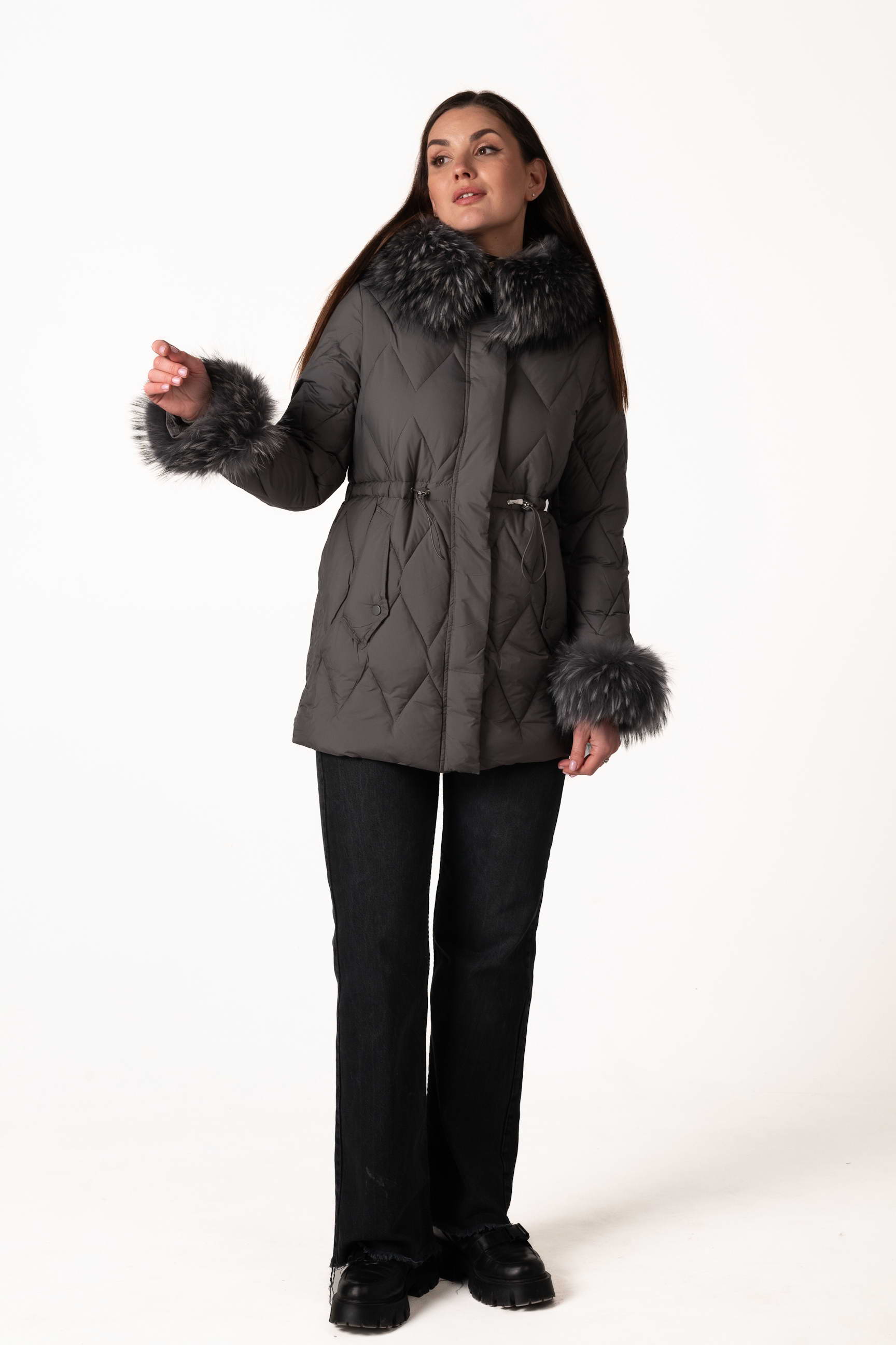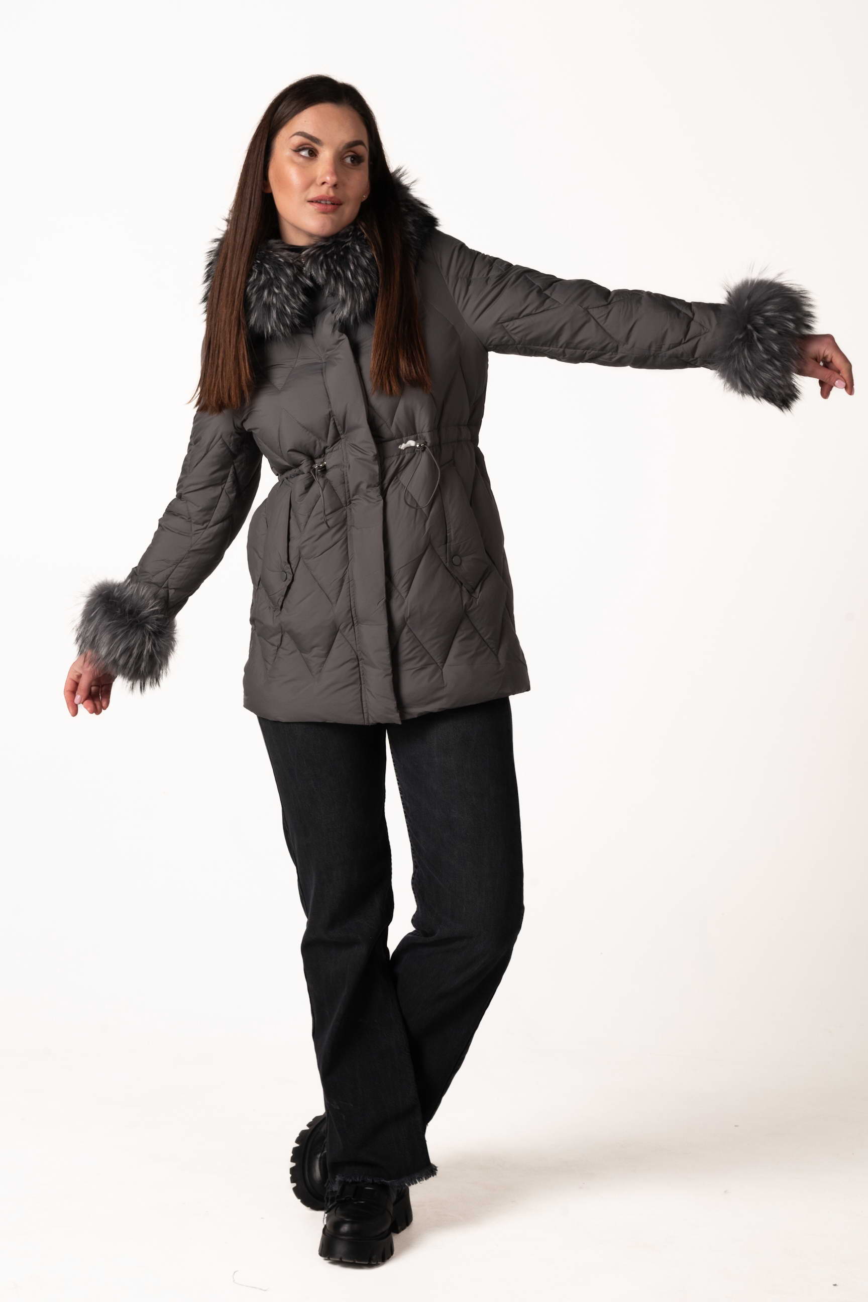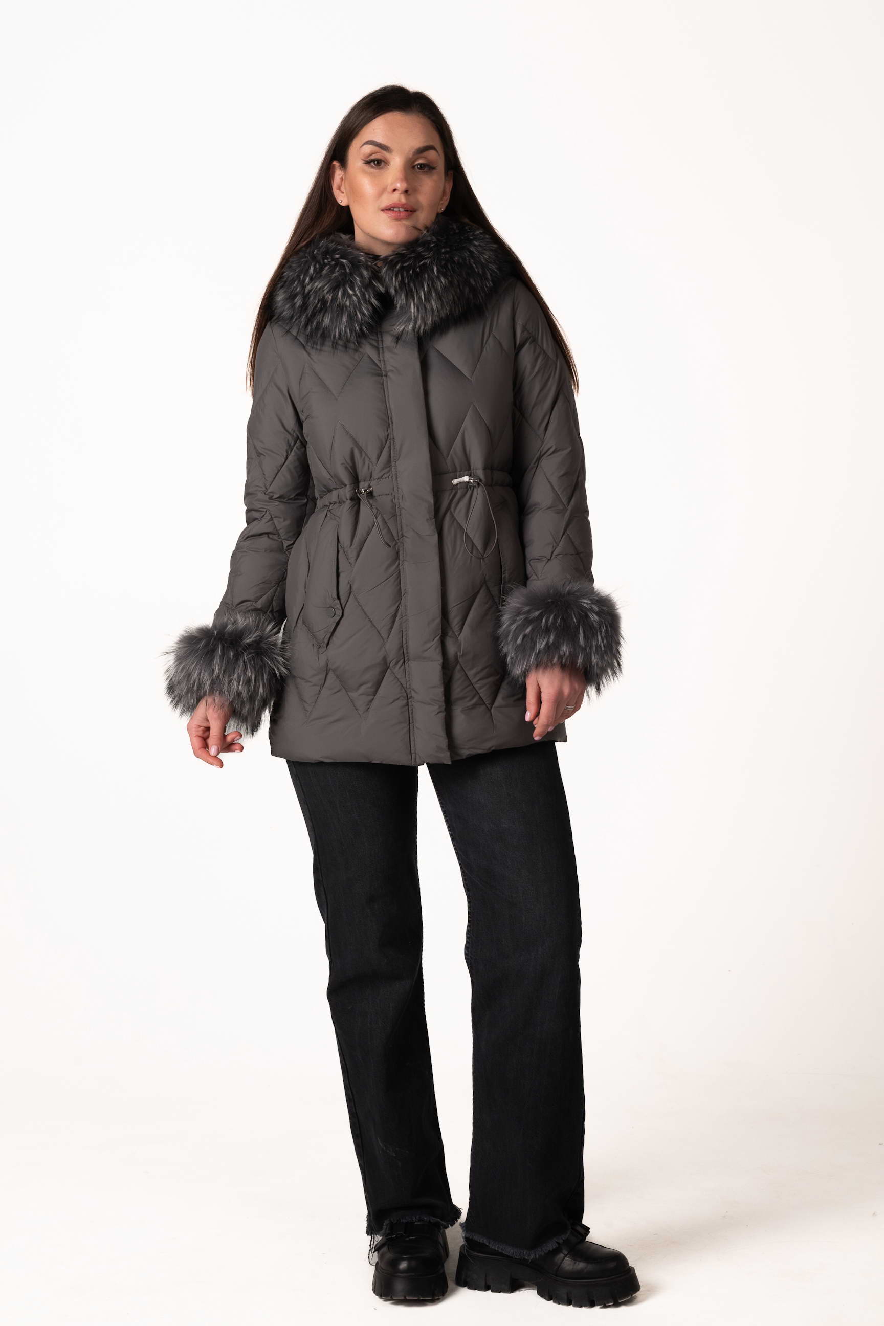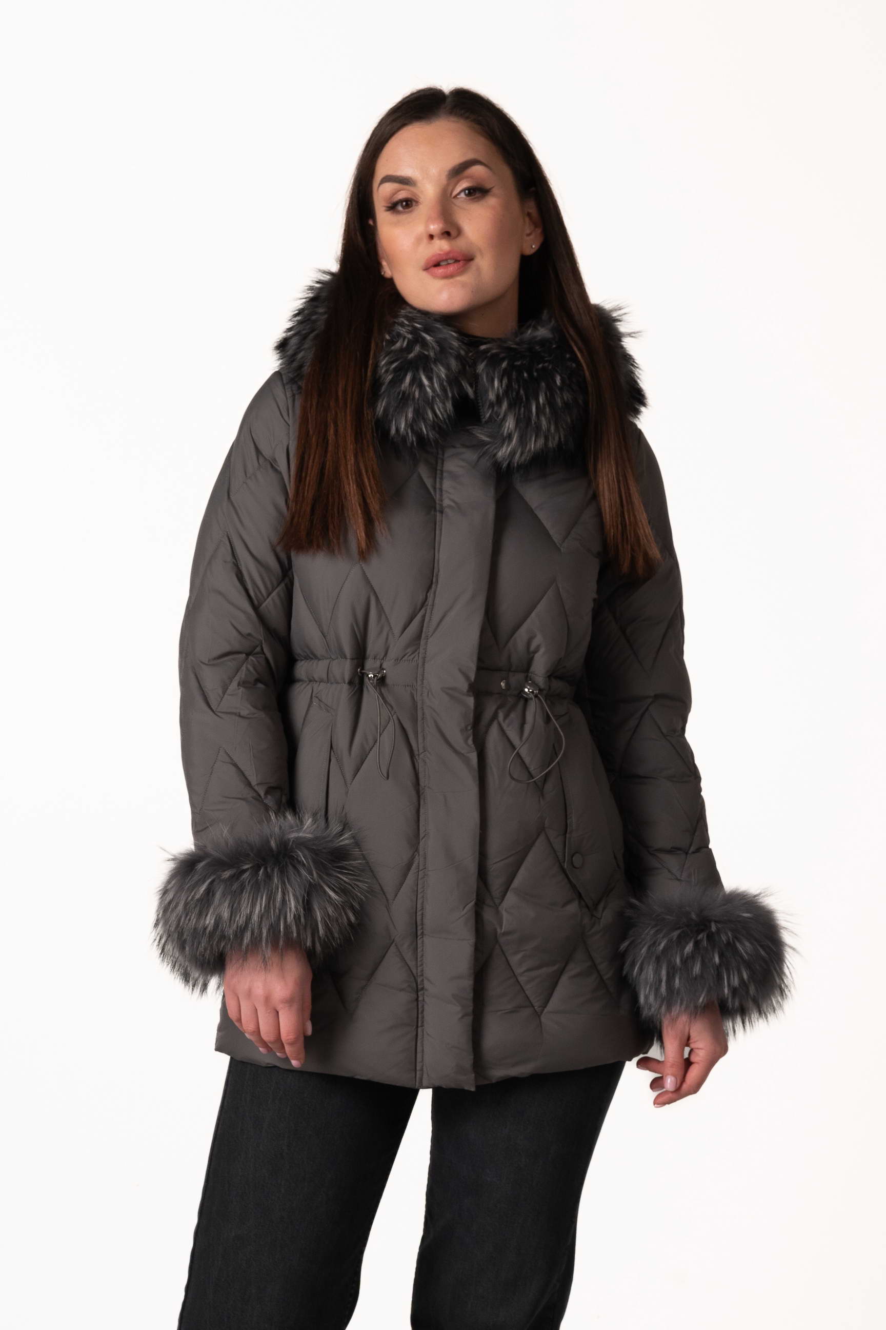 Сучасний графітовий жіночий біопуховик — стильна та функціональна модель для зимового сезону. Відстібний капюшон і манжети з хутром єнота, а також куліска на талії дозволяють регулювати посадку і створювати індивідуальний силует. Ромбовидна прострочка додає виробу елегантності та сучасного вигляду. Якщо ви плануєте купити жіночий зимовий пуховик, ця модель стане універсальним вибором для щоденного використання.
