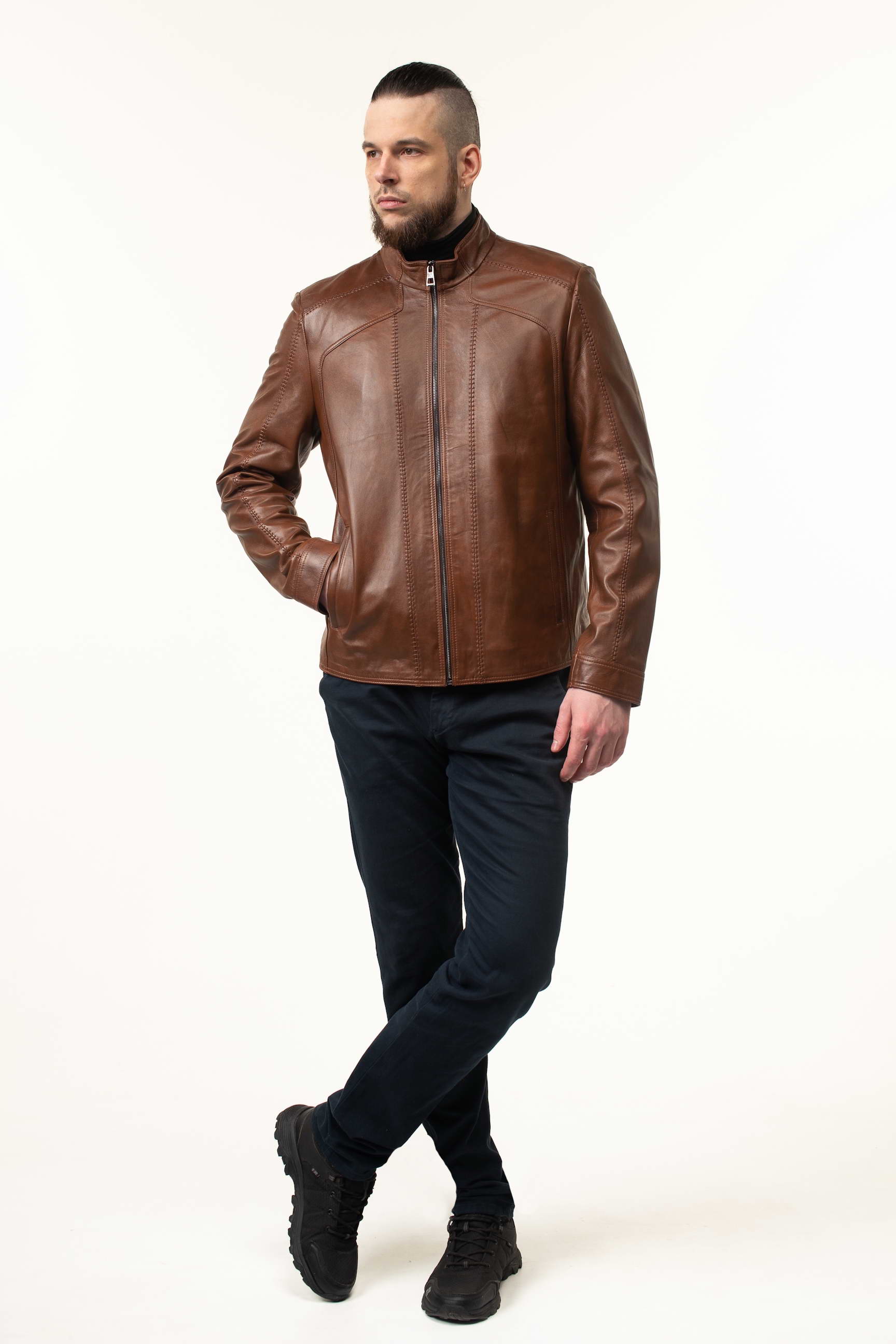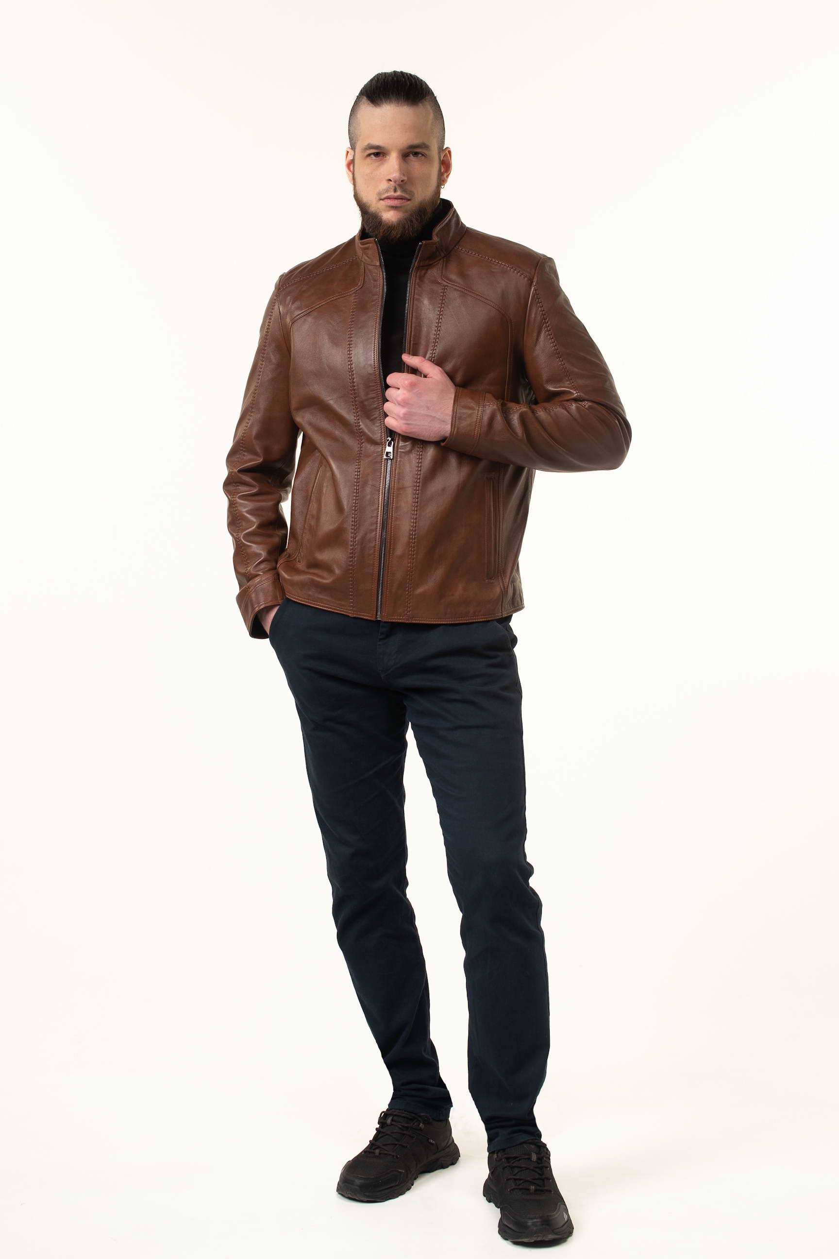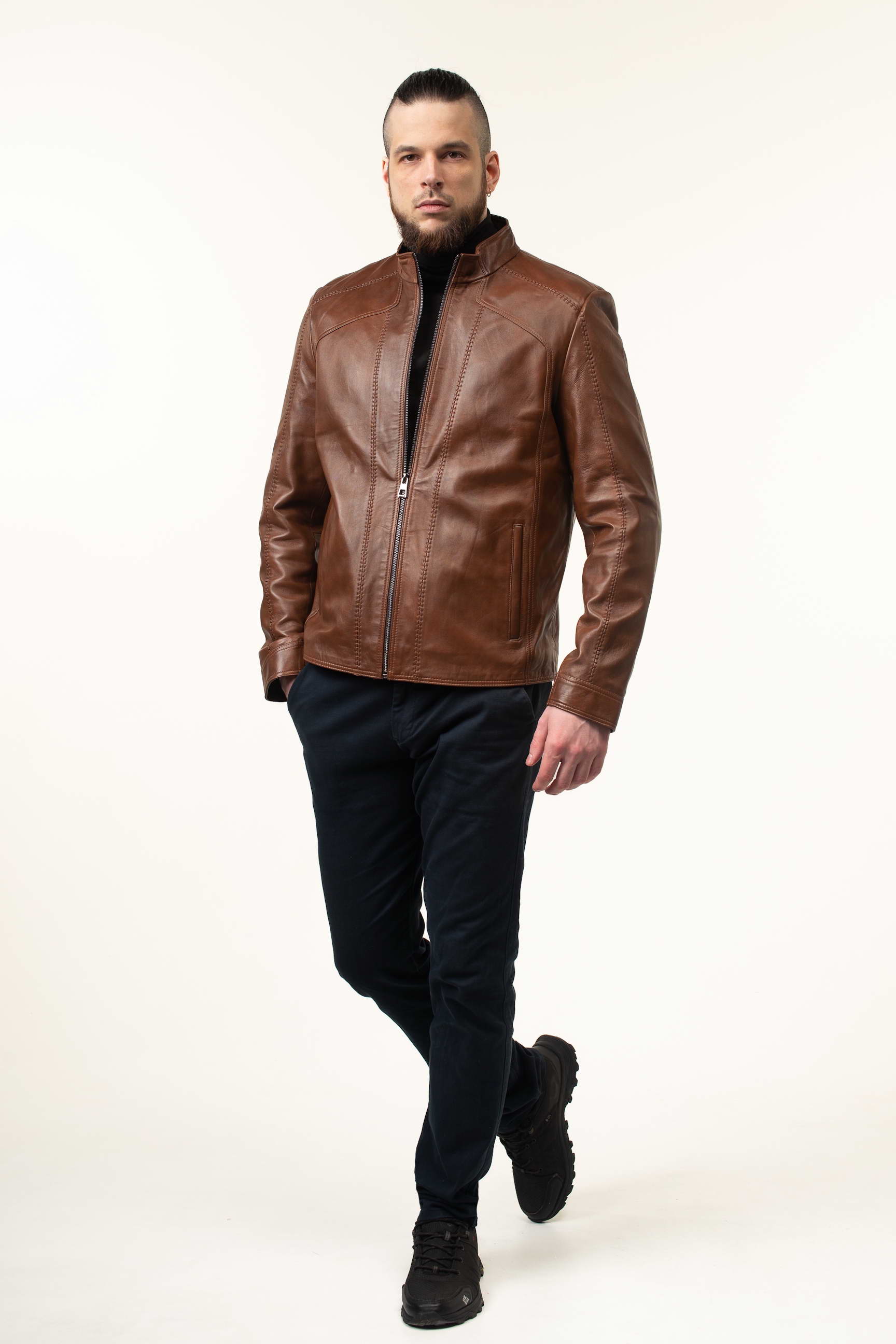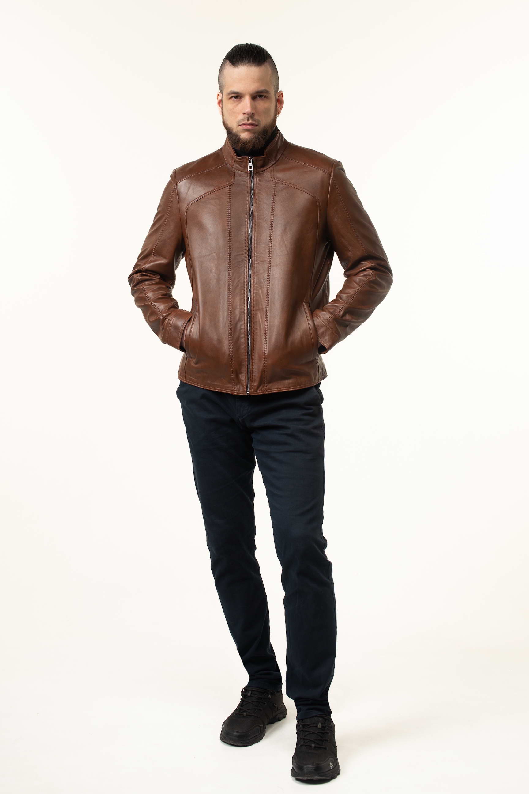 Елегантна чоловіча шкіряна куртка для сезону весна/осінь — поєднання преміальної якості матеріалу та сучасного дизайну. Модель виготовлена з натуральної телячої шкіри, яка відзначається м’якістю, міцністю та довговічністю. Глибокий коричневий відтінок надає виробу солідності, а затемнені шви підкреслюють геометрію крою і додають куртці виразного характеру.