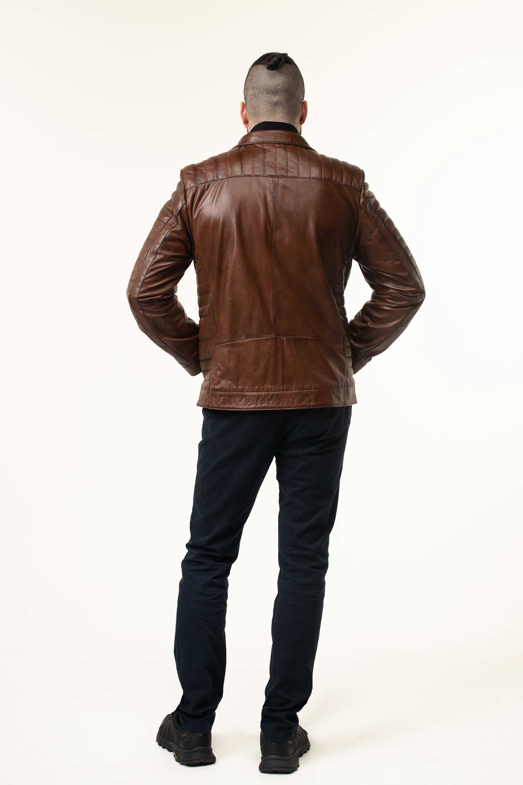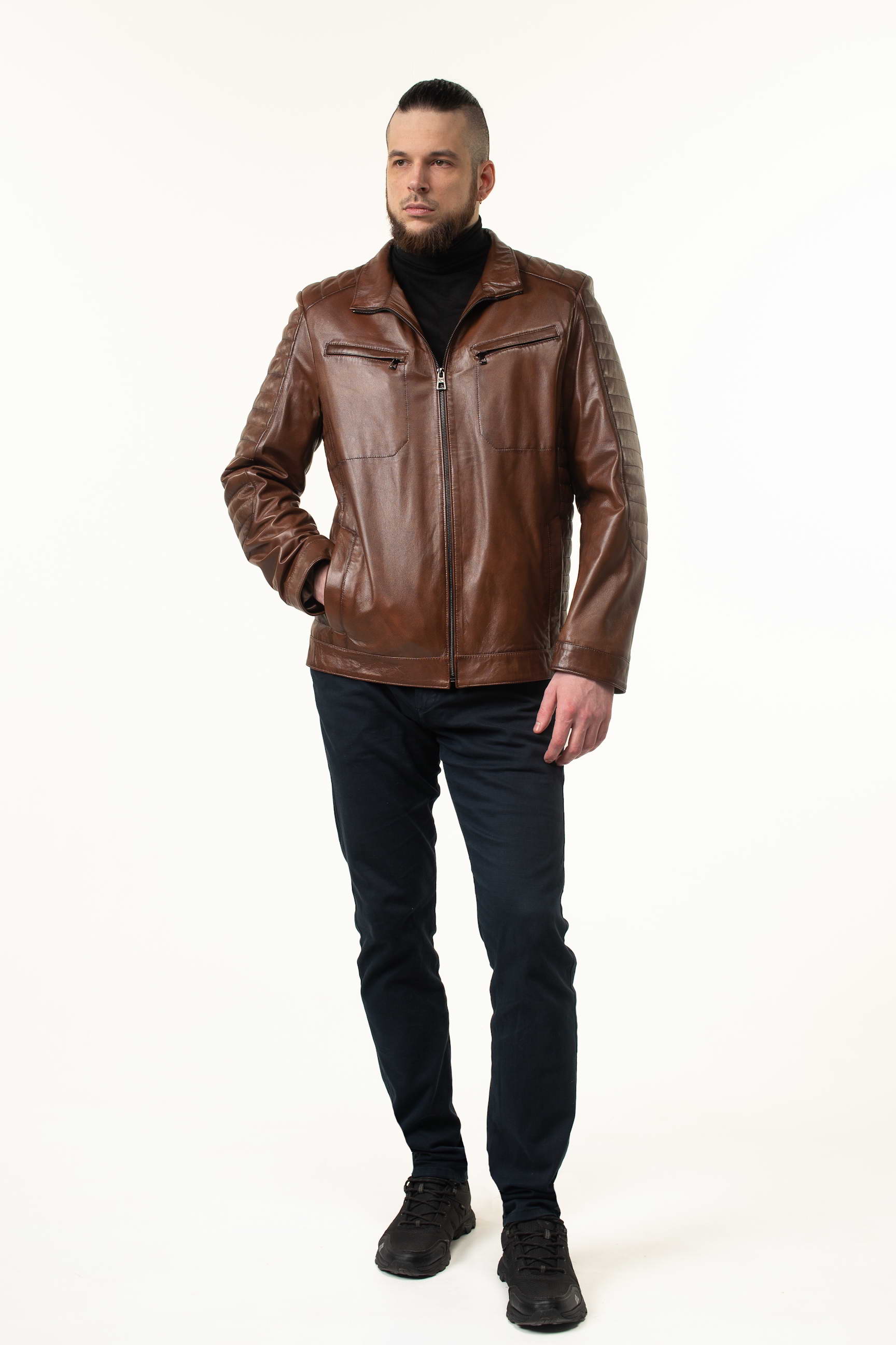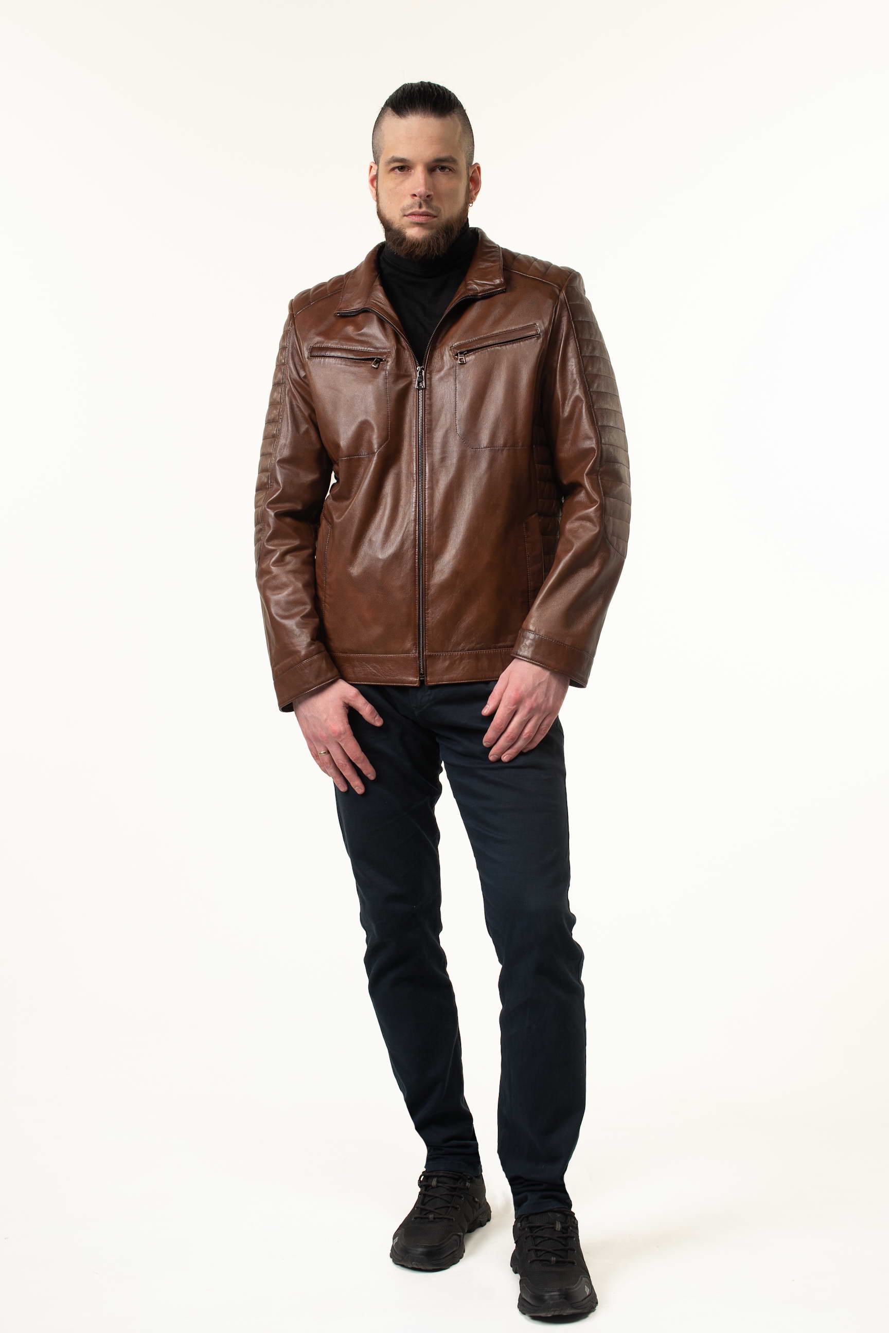 Сучасна чоловіча шкіряна куртка для сезону весна/осінь — це поєднання преміальної якості матеріалу, стильного дизайну та продуманих деталей. Модель виконана з натуральної телячої шкіри, що відзначається міцністю, еластичністю та гладкою текстурою. Глибокий коричневий колір робить куртку універсальною, а затемнені шви та декоративні прострочки на плечах, рукавах і боках додають виробу сучасного характеру та підкреслюють лінії крою.