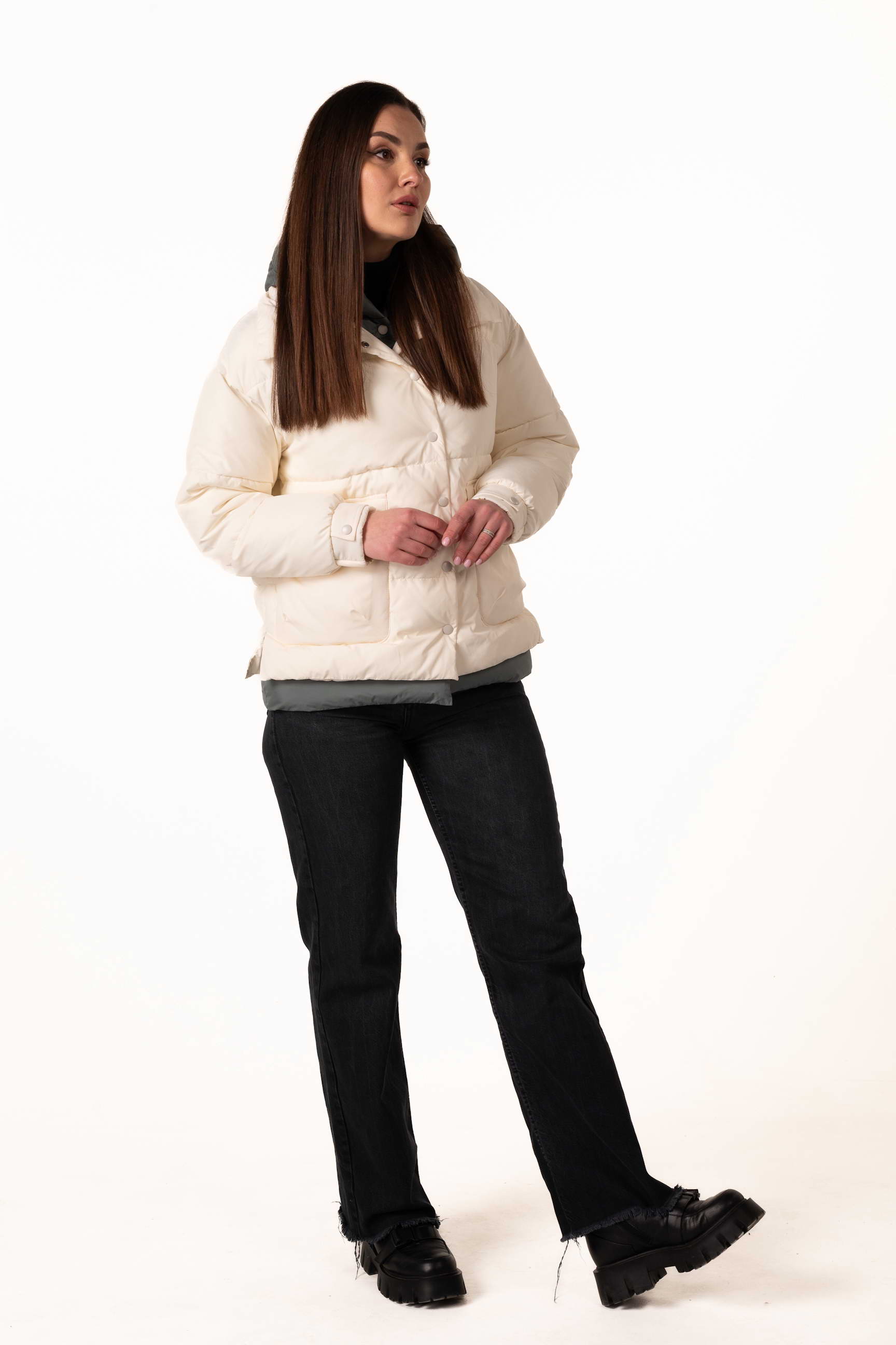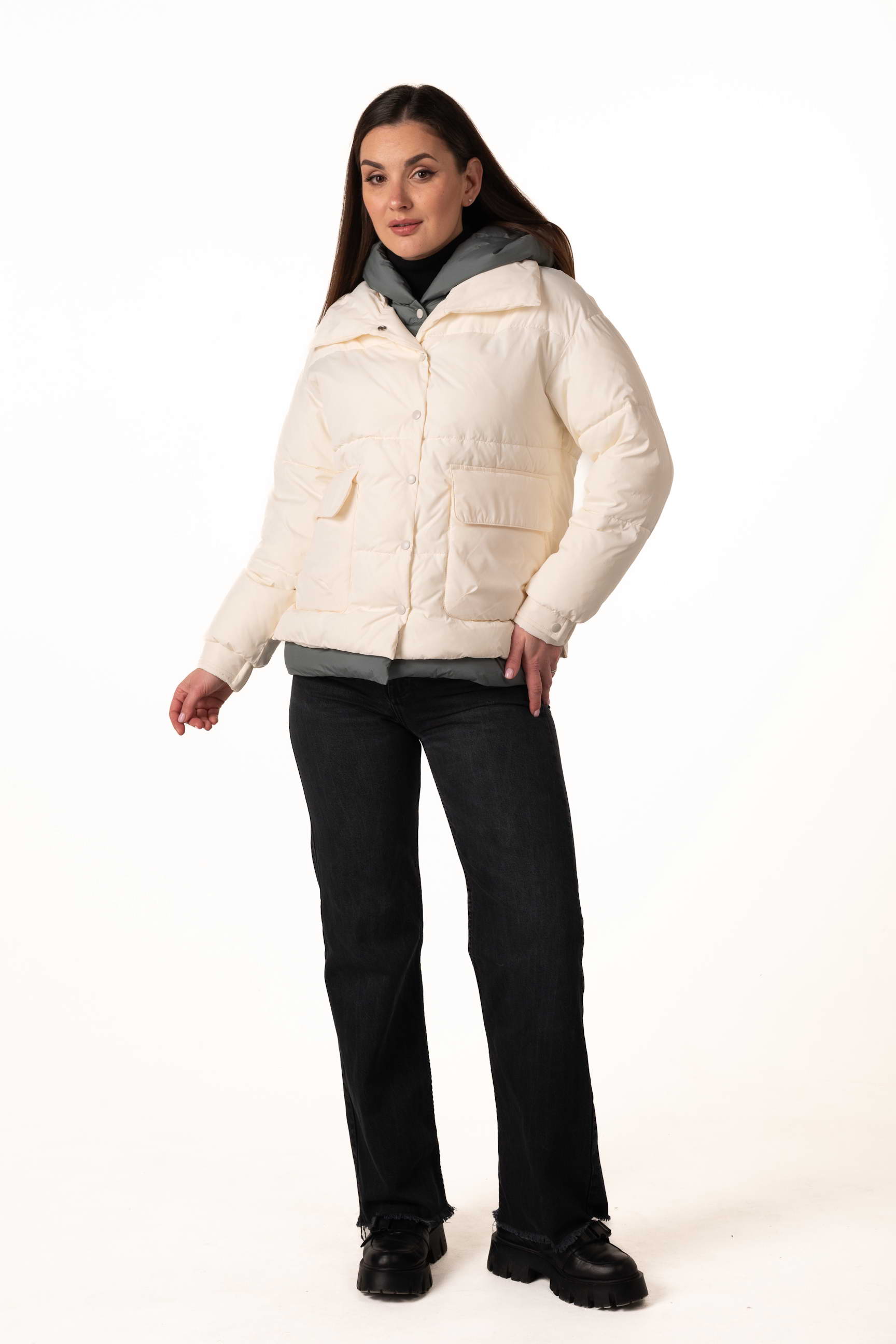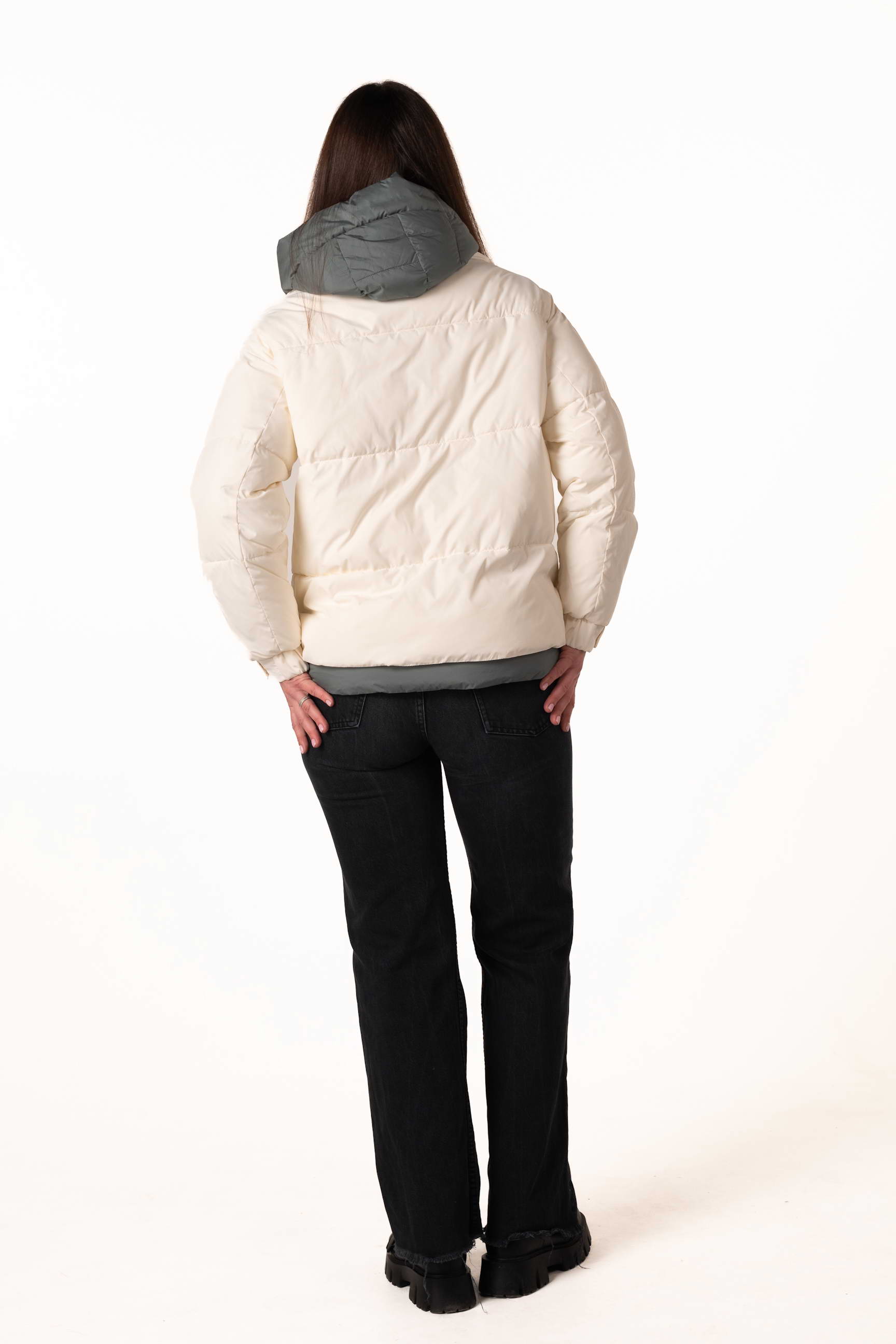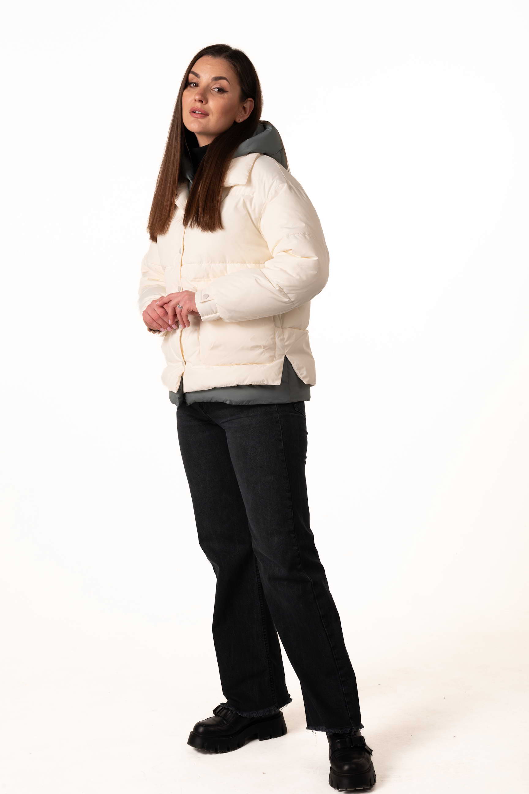 Ніжний молочний відтінок освіжає зимовий гардероб, а контрастний капюшон додає стильного акценту, підкреслюючи сучасний дизайн пуховика.