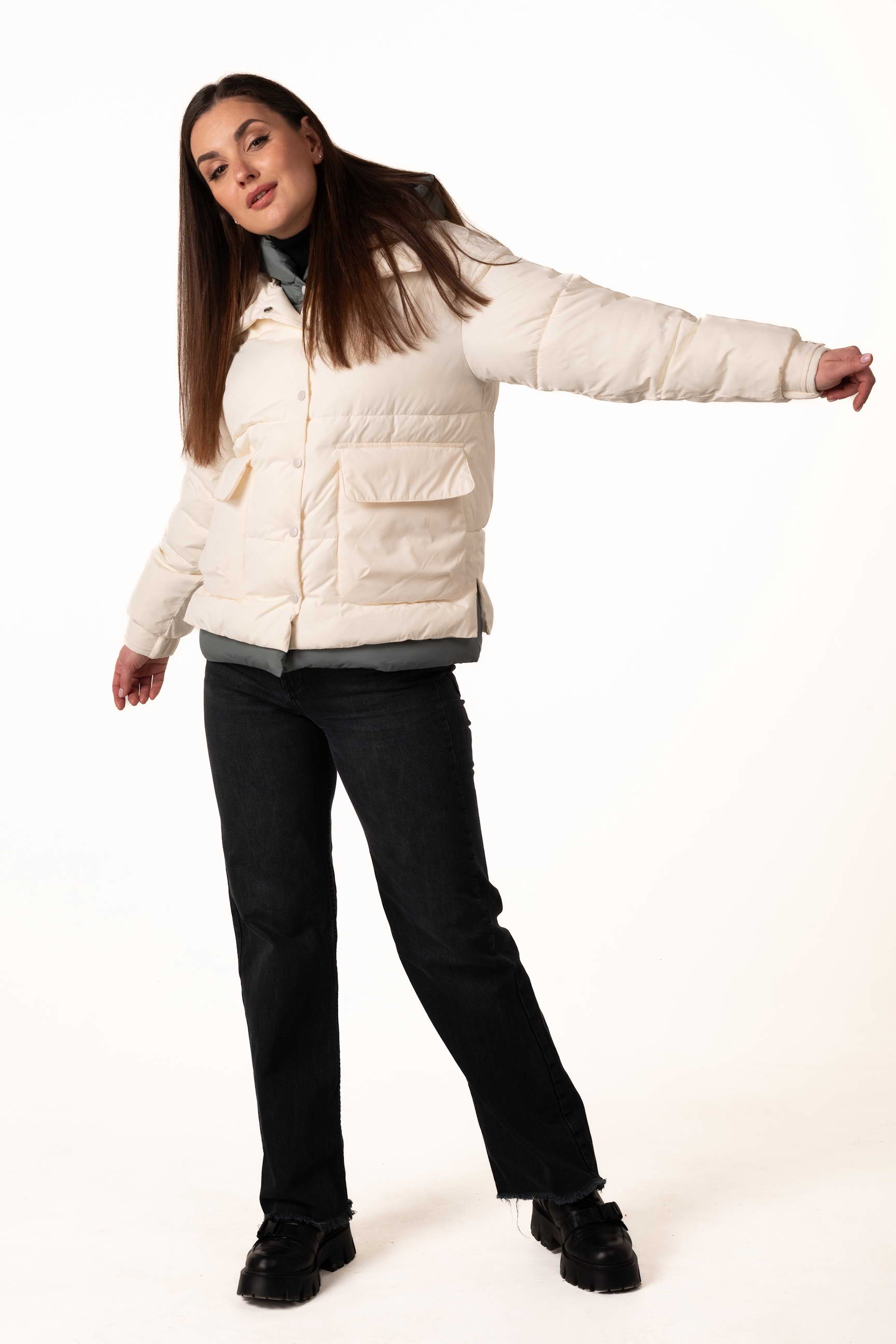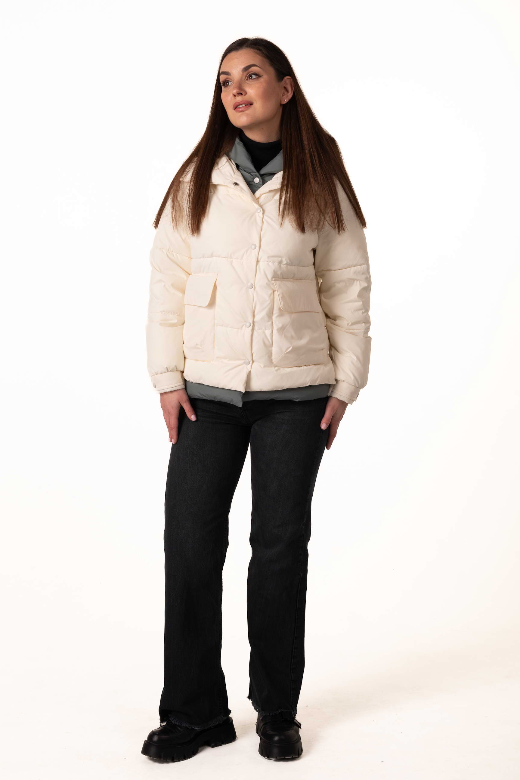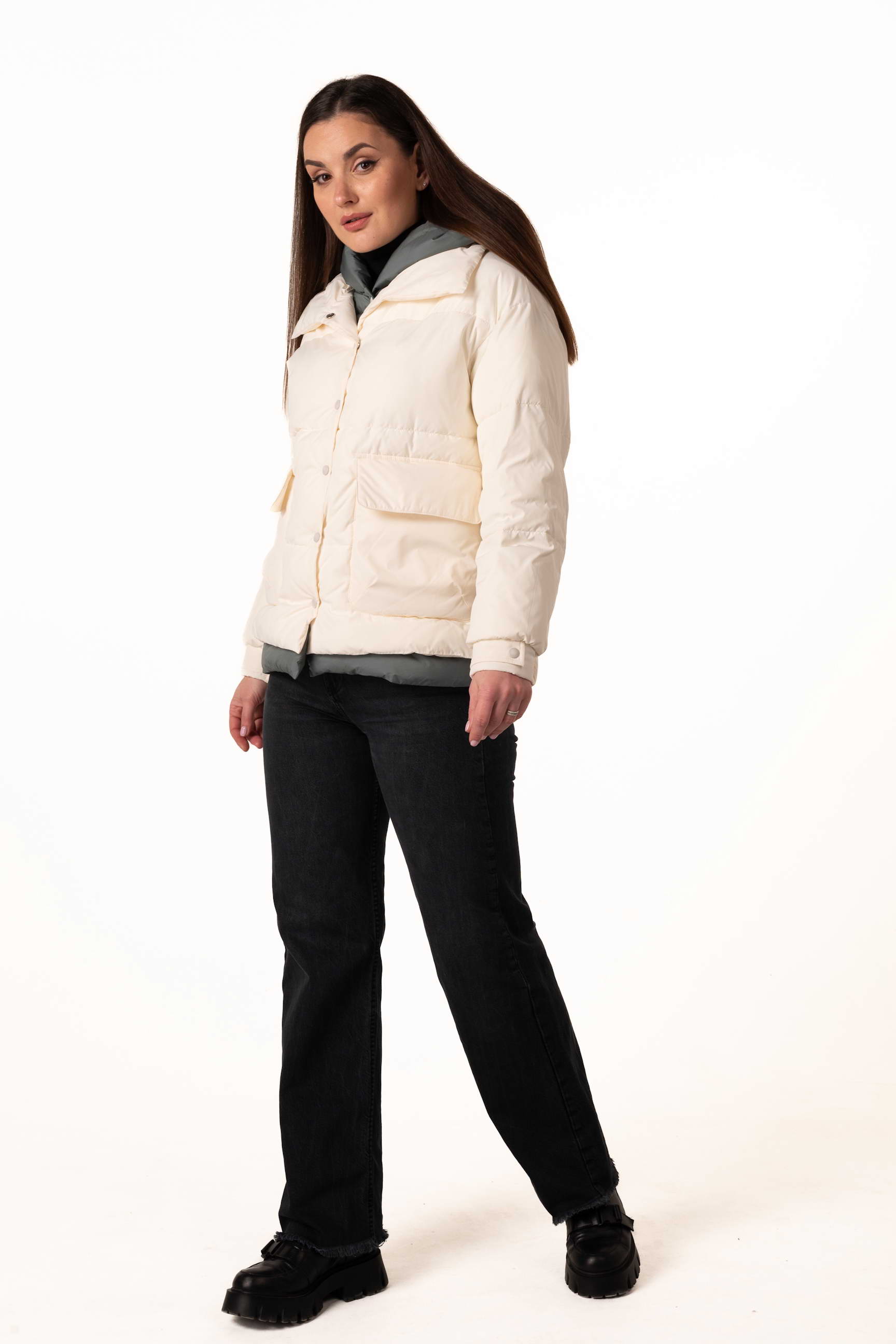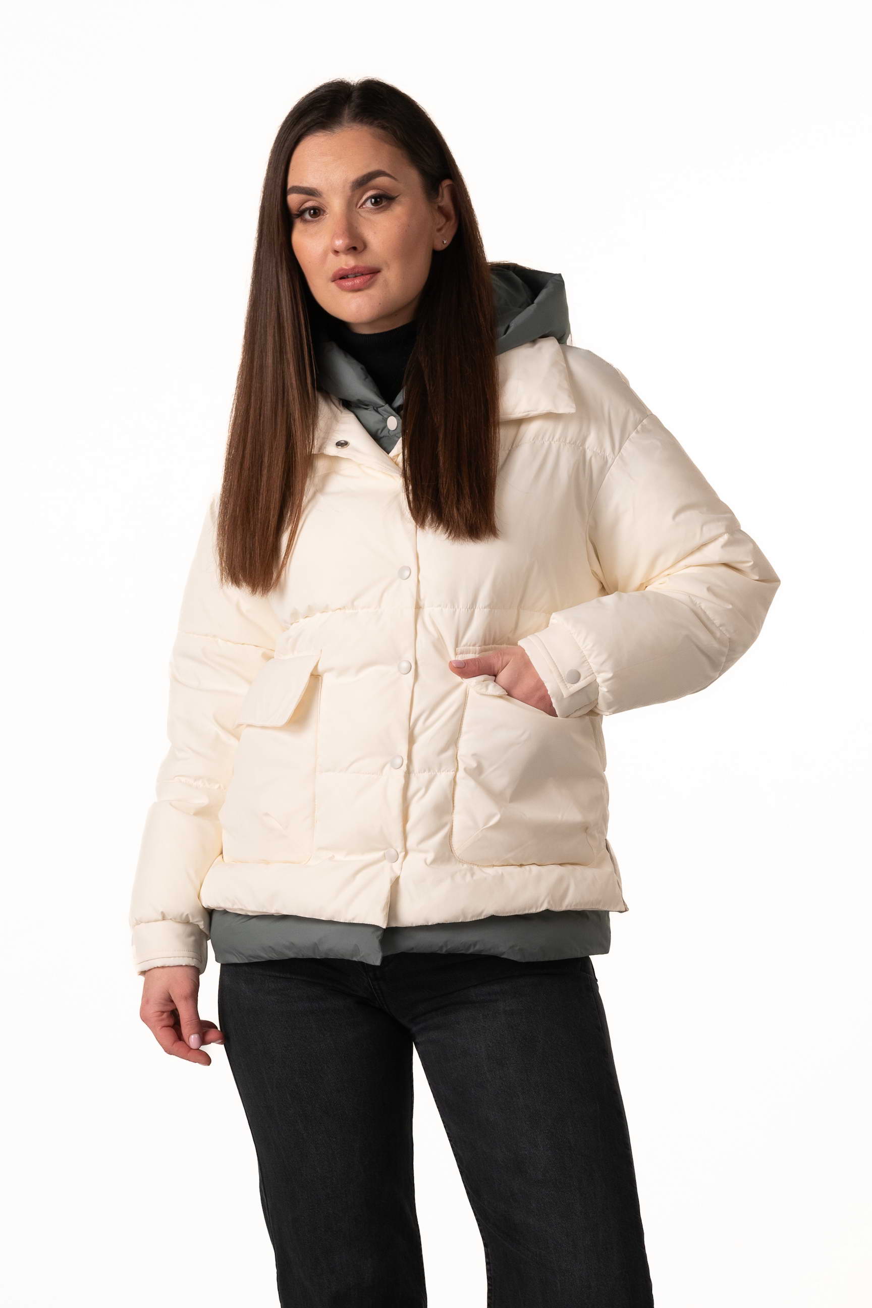 Ніжний молочний відтінок освіжає зимовий гардероб, а контрастний капюшон додає стильного акценту, підкреслюючи сучасний дизайн пуховика.