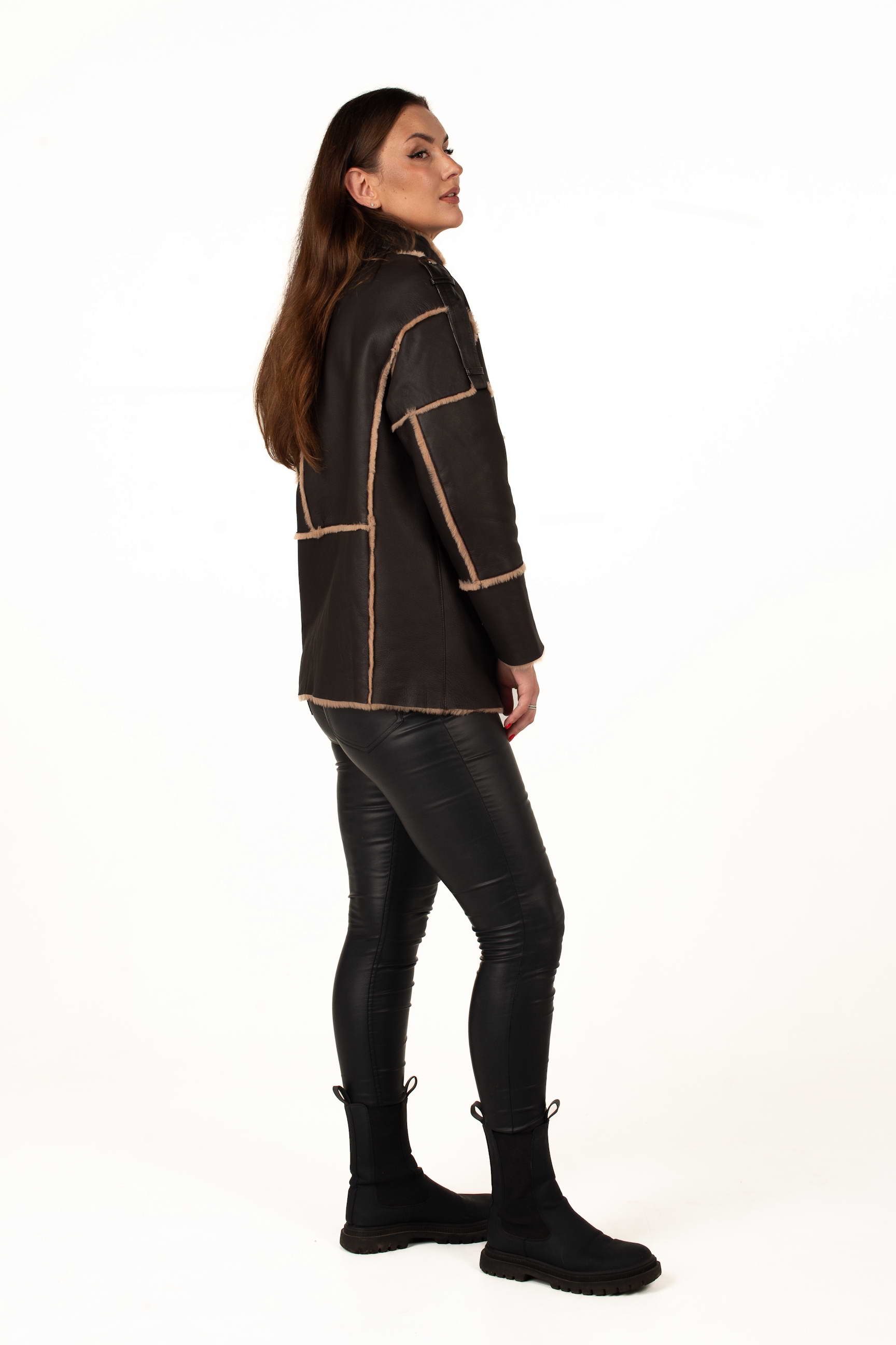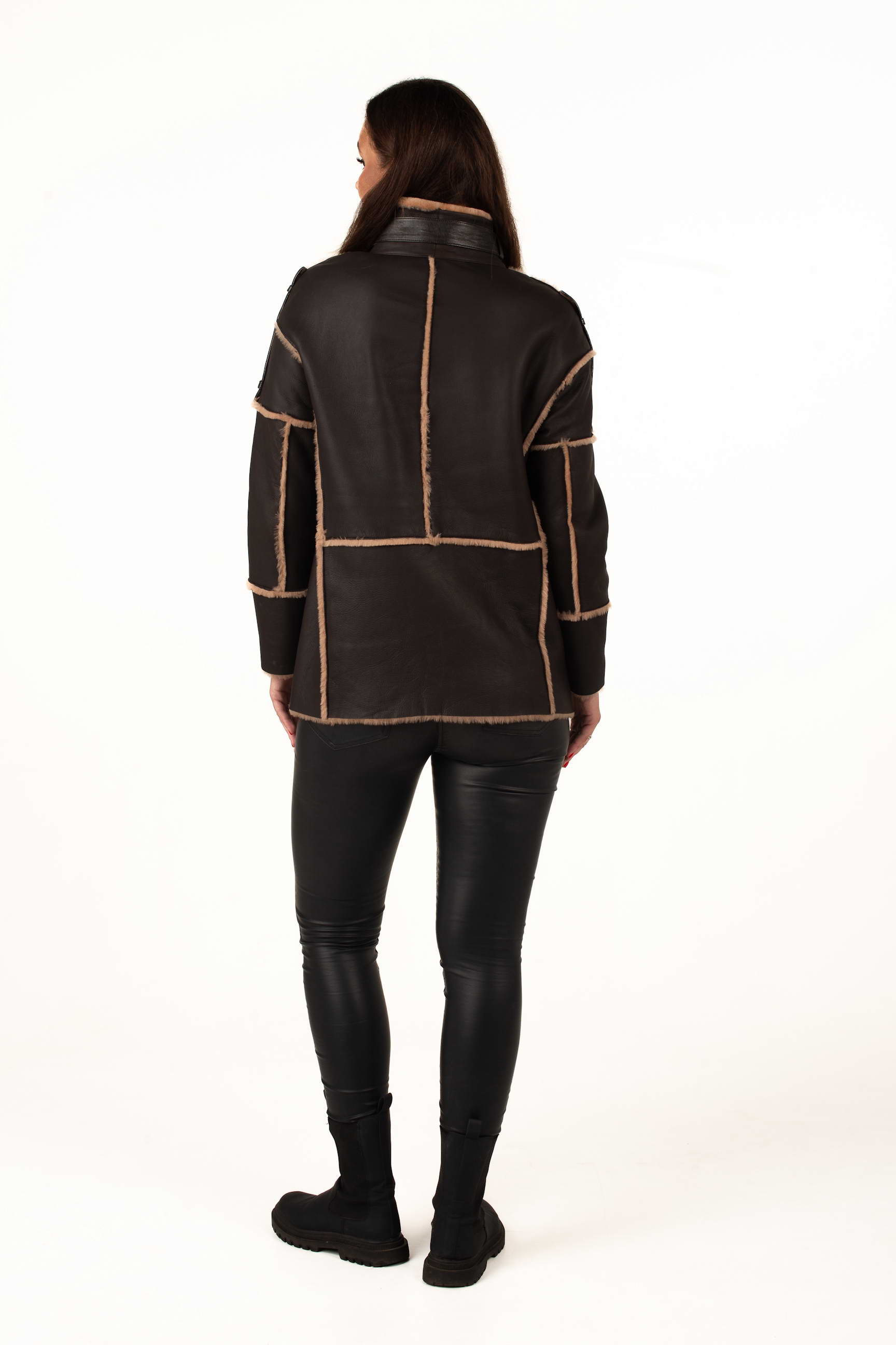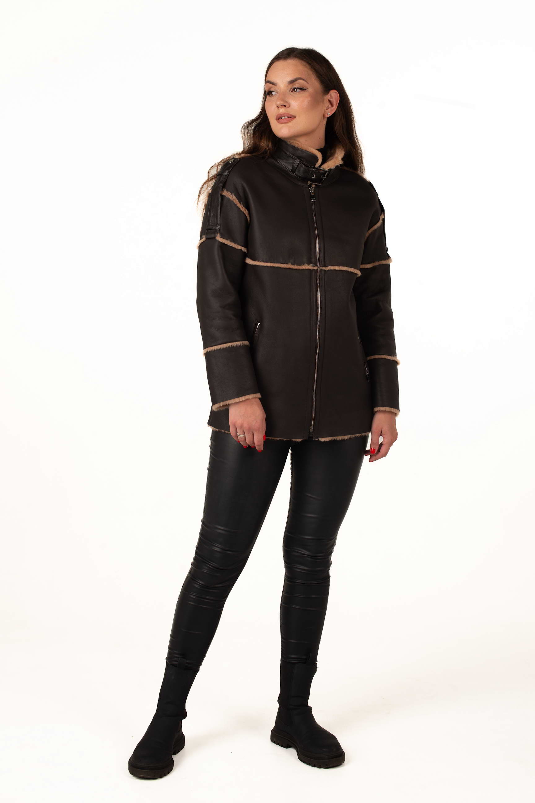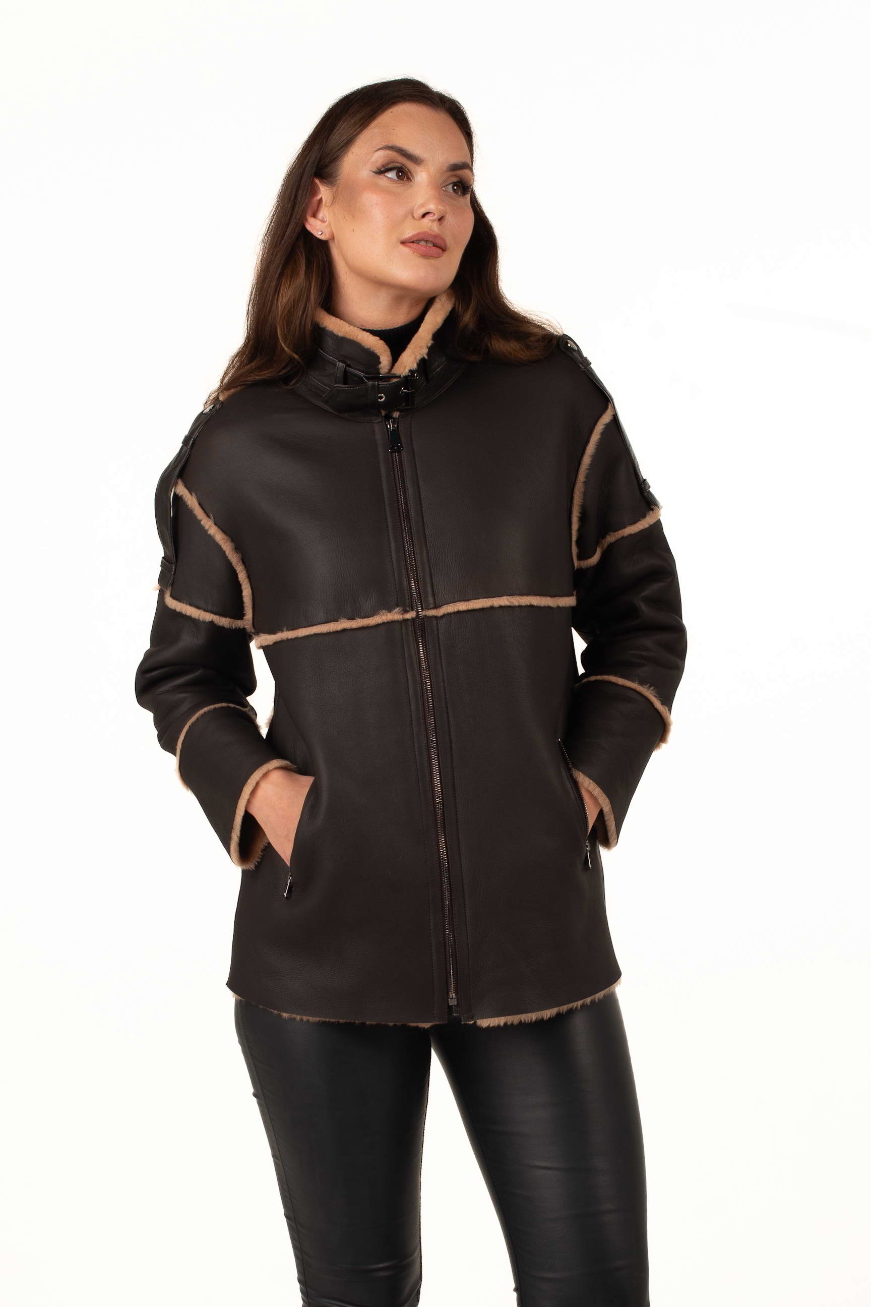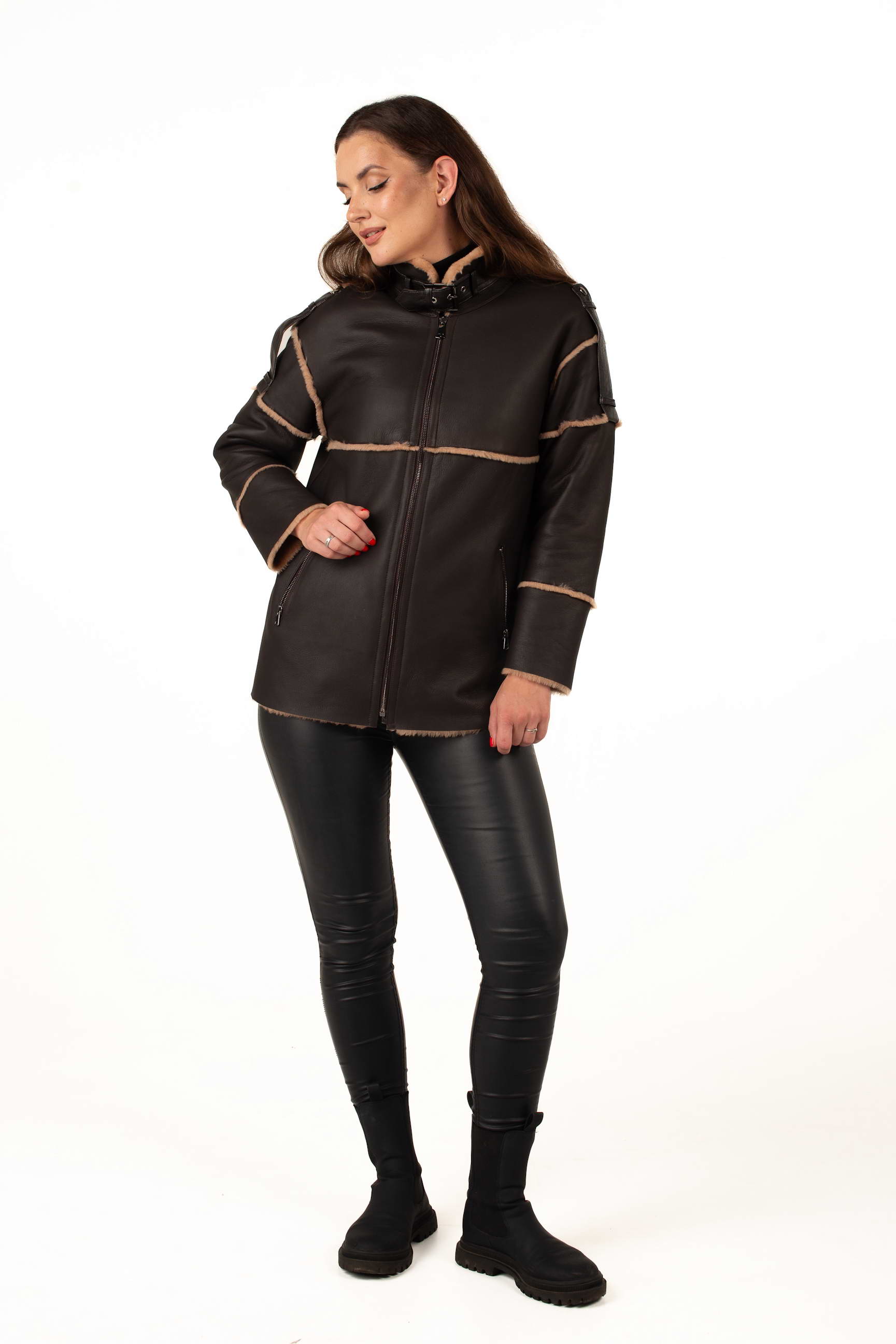 Коричнева дублянка з овчини підкреслює статус і витончений смак своєї власниці. Завдяки продуманому крою вона гарно сідає по фігурі та чудово поєднується з класичним або кежуал стилем.
