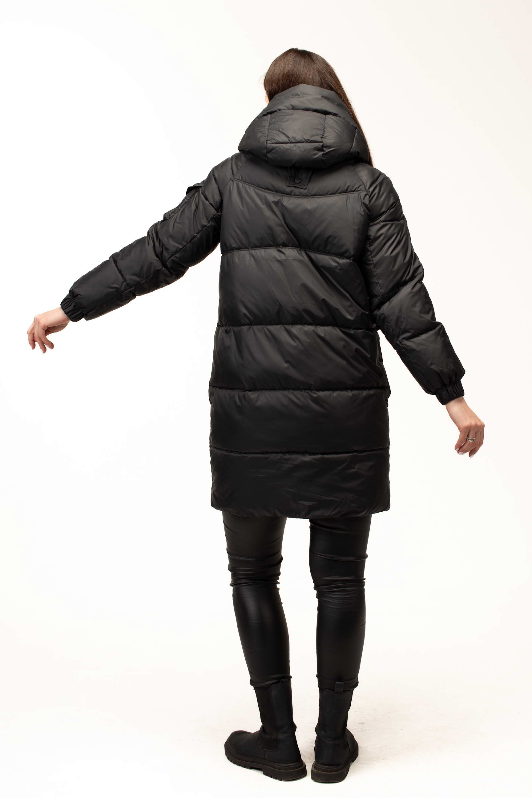 Воротник-стойка в сочетании с капюшоном обеспечивает дополнительную защиту от ветра и холода, создавая ощущение уюта в морозную погоду. Застежка на молнии, дополненная планкой на кнопках сверху, усиливает теплоизоляцию и предотвращает продувание, делая модель более функциональной и практичной.