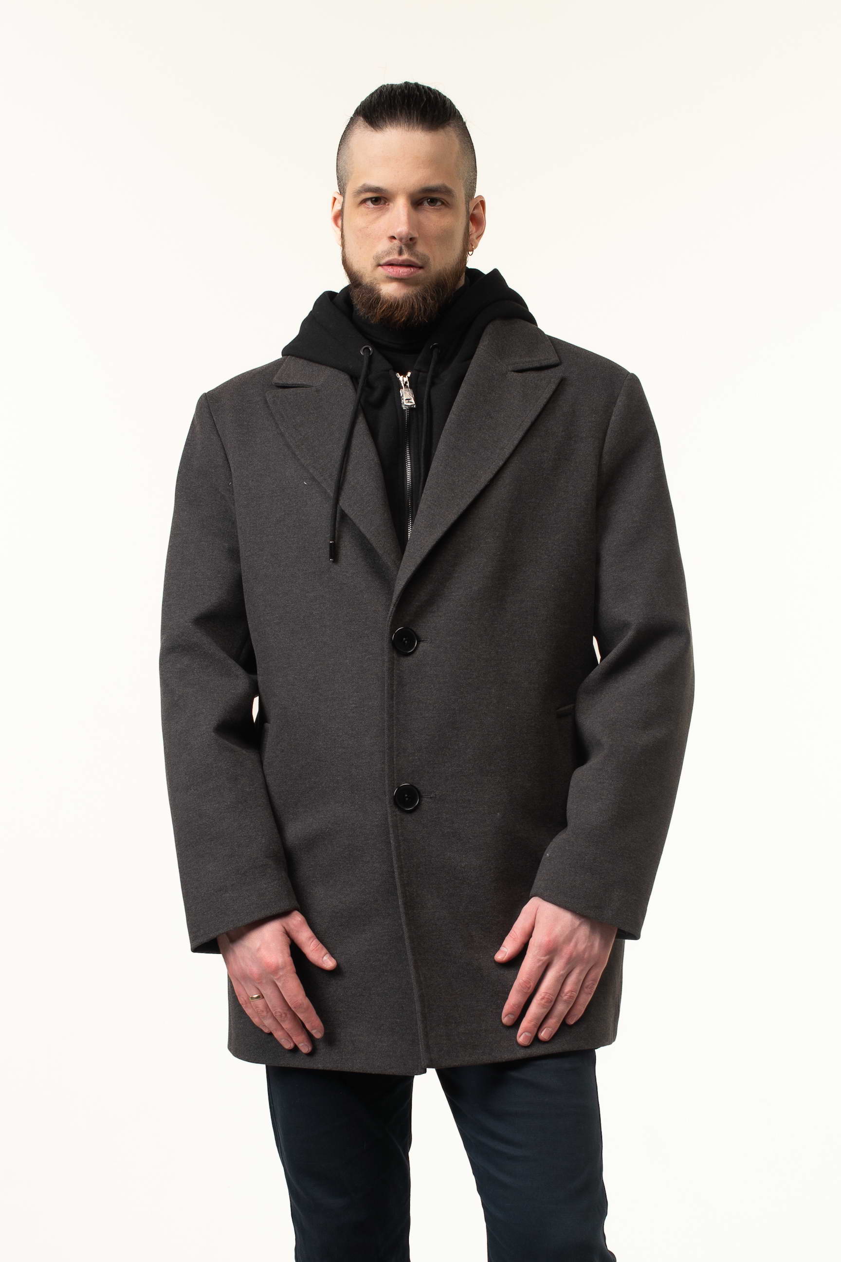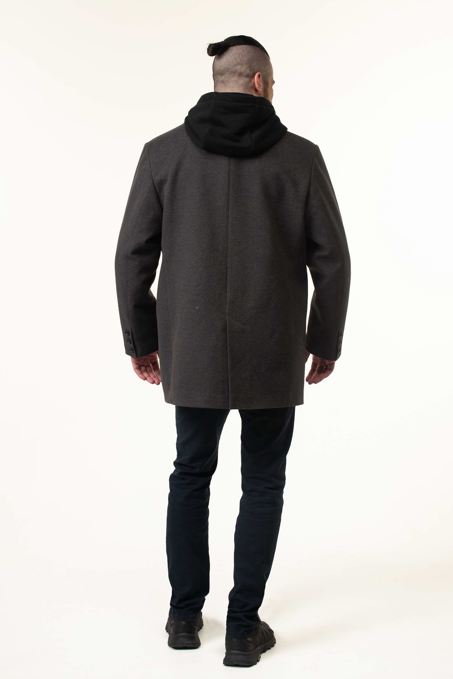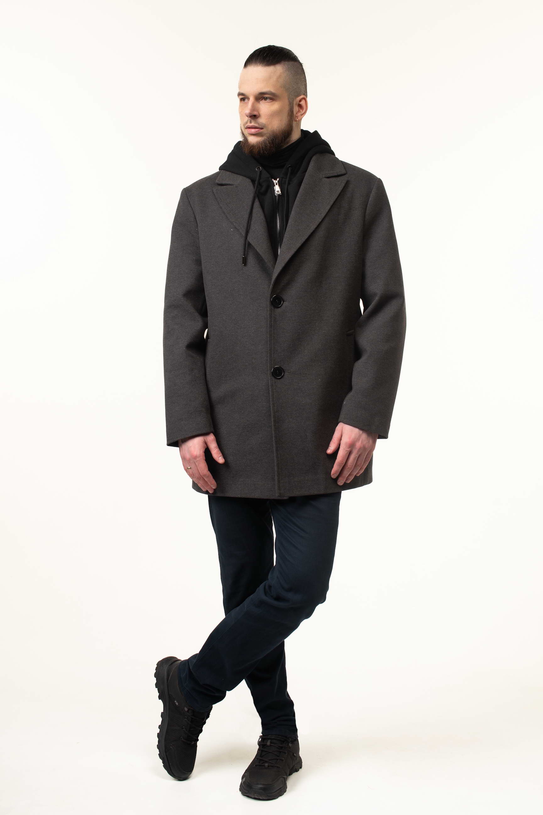 Особенностью этой модели является трикотажный съемный капюшон с воротником, который обеспечивает дополнительную защиту от ветра и непогоды, а также придает изделию современный спортивный акцент. Длина 90 см формирует современный прямой силуэт, подчеркивающий мужскую фигуру и делая пальто удобным в носке в межсезонье. Английский воротник добавляет образу элегантности, а классическая застежка на пуговицы обеспечивает практичность и легкость одевания.