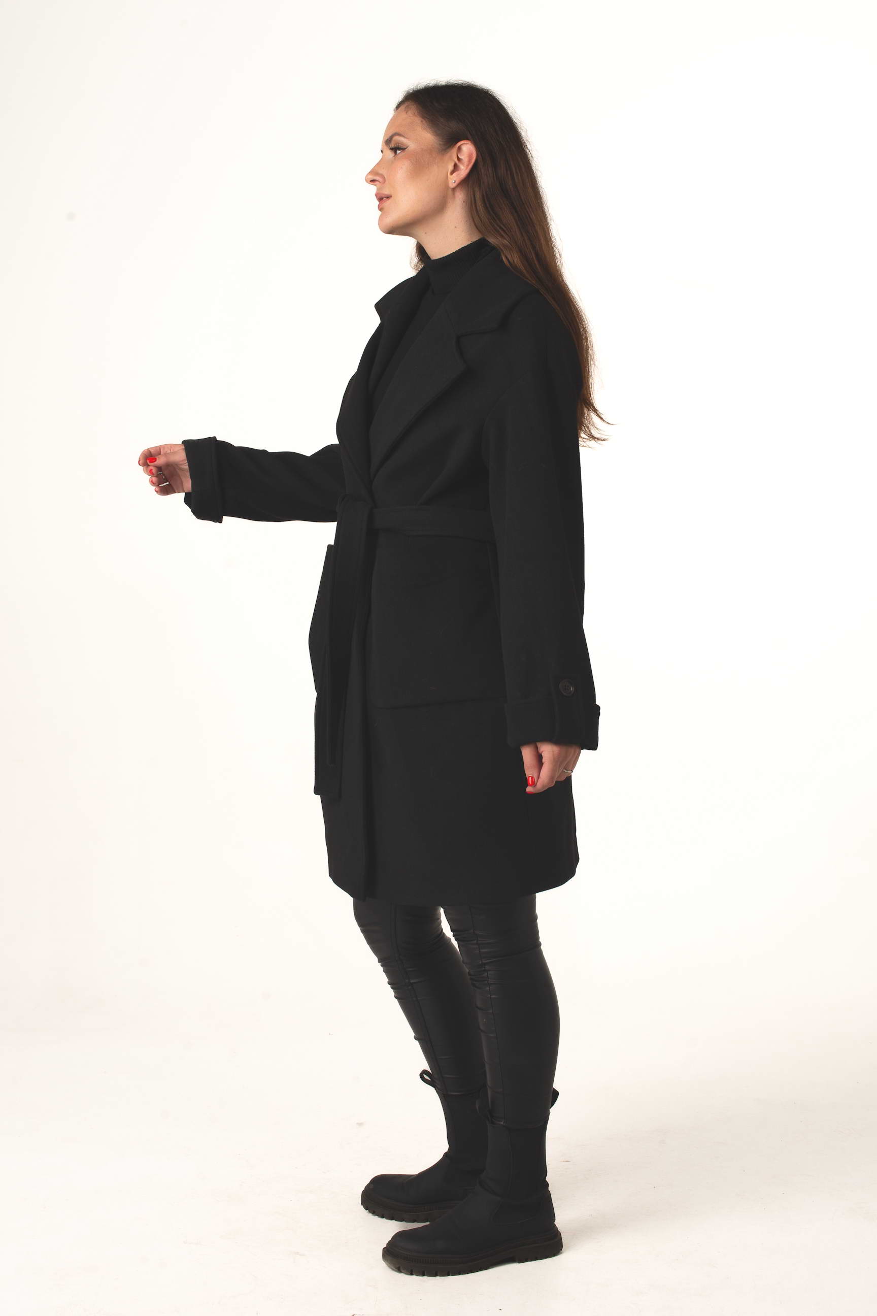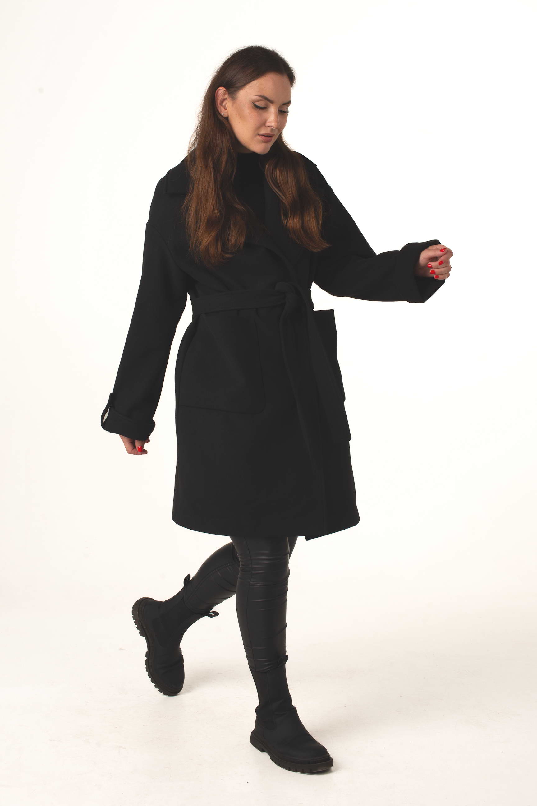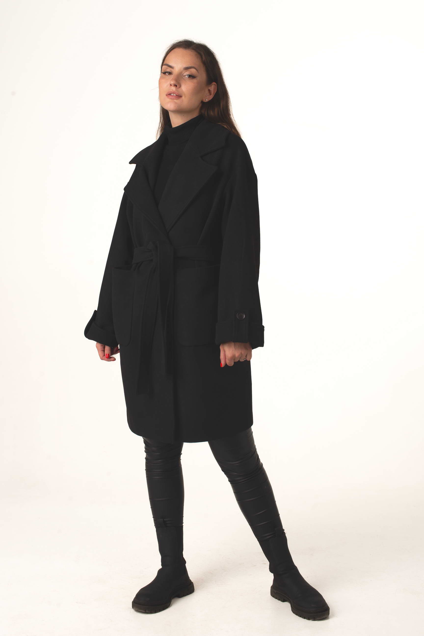 Стильное женское пальто из кашемира в классическом черном цвете сочетает элегантность, комфорт и практичность. Модель имеет английский воротник, который придаёт строгий и изысканный вид, а накладные карманы и пояс делают образ завершённым и удобным для повседневного ношения.