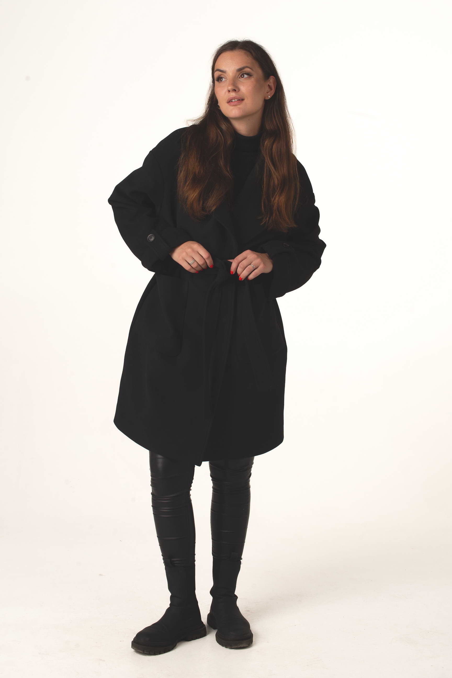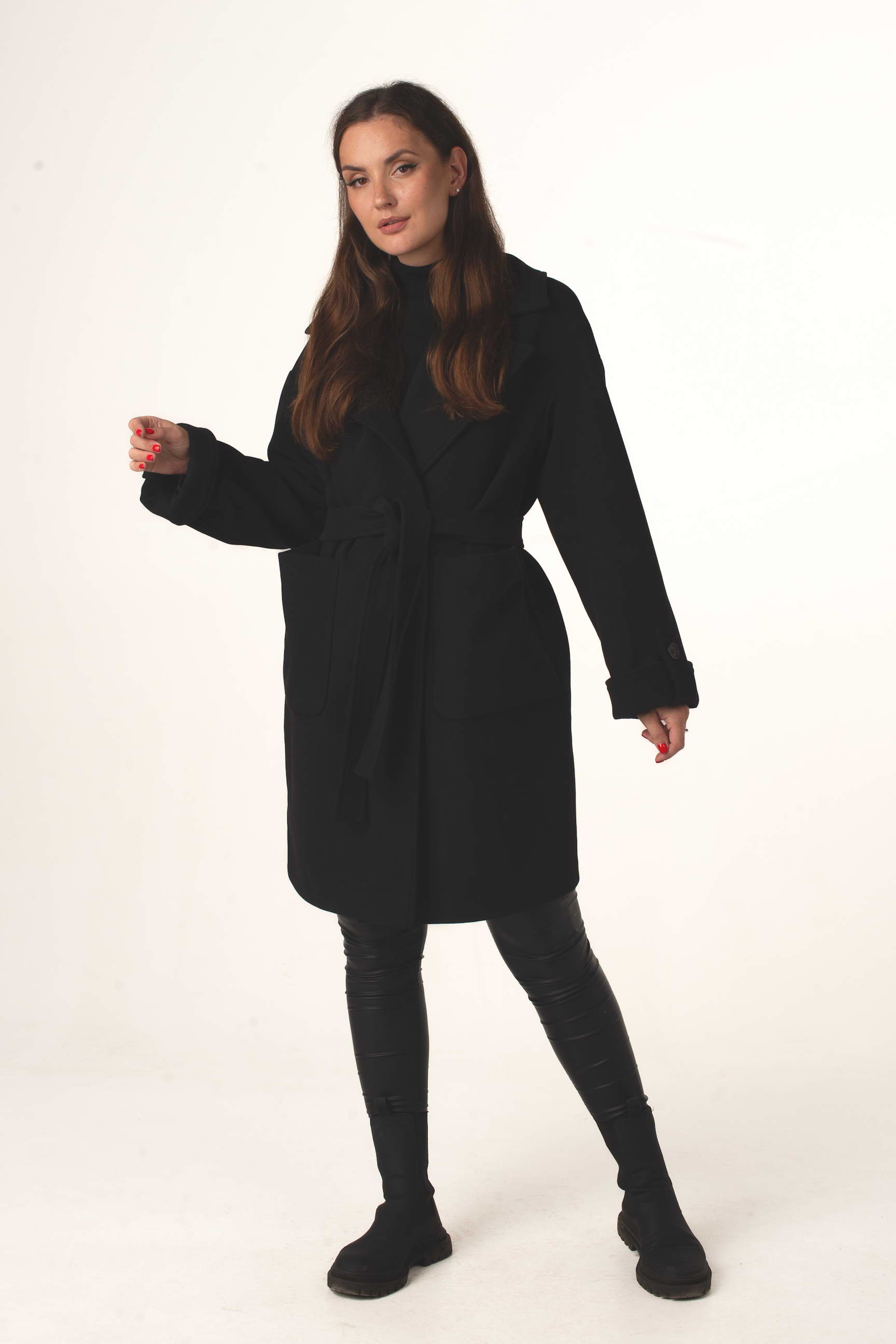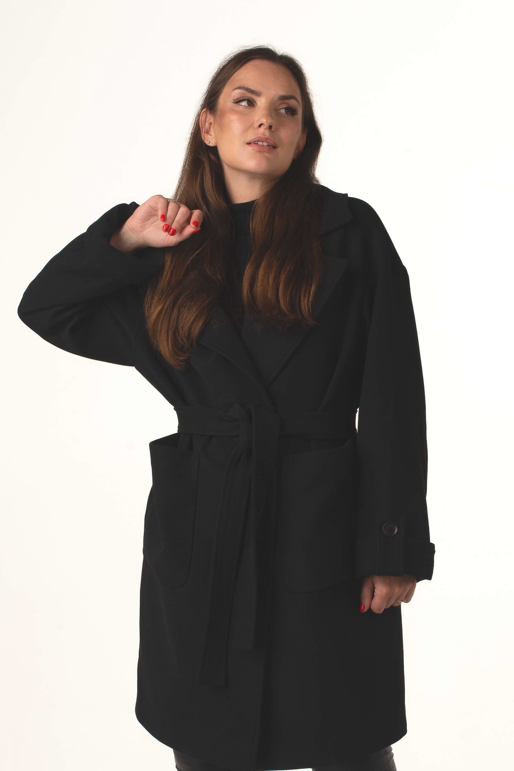 Стильное женское пальто из кашемира в классическом черном цвете сочетает элегантность, комфорт и практичность. Модель имеет английский воротник, который придаёт строгий и изысканный вид, а накладные карманы и пояс делают образ завершённым и удобным для повседневного ношения.