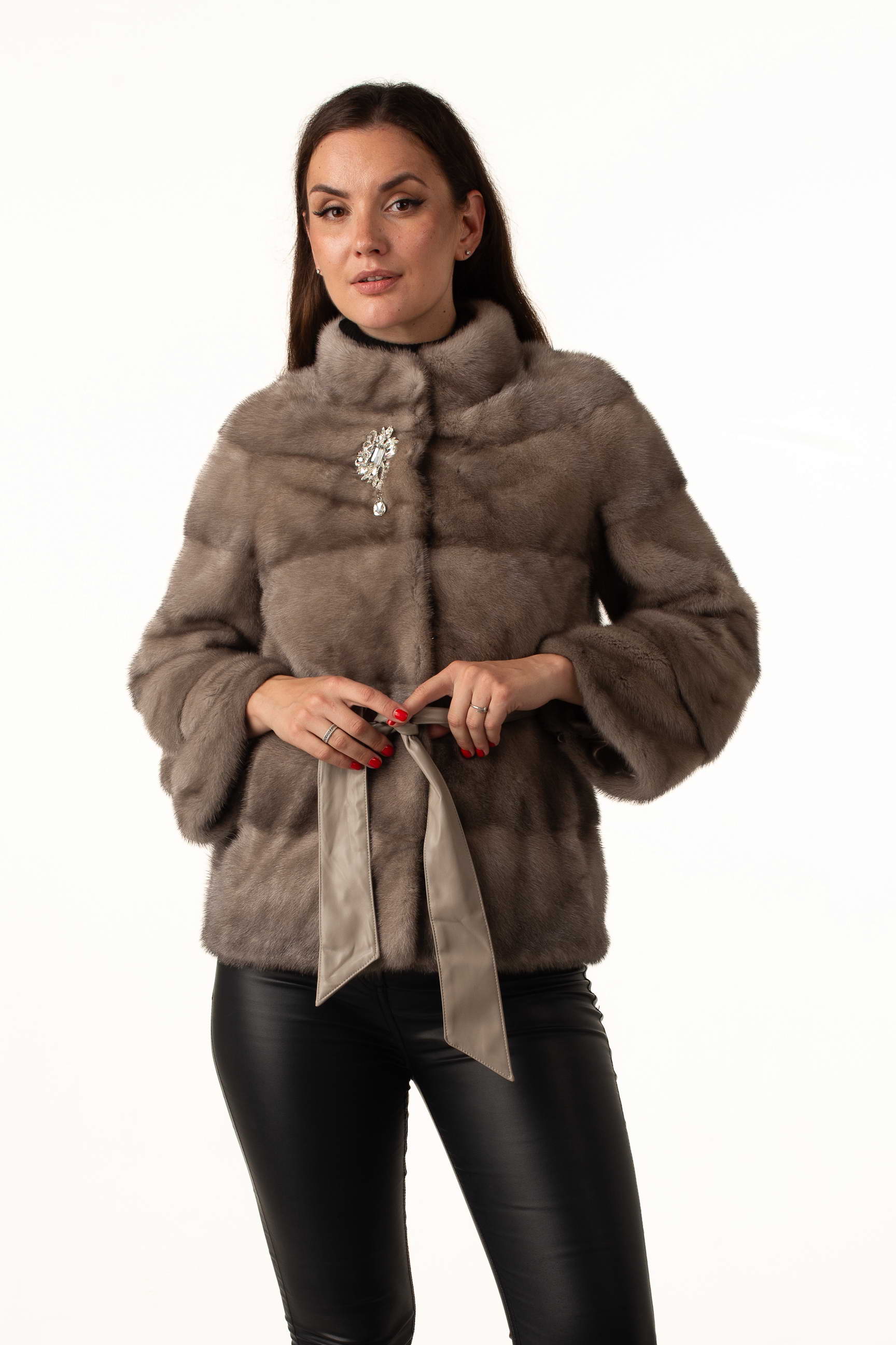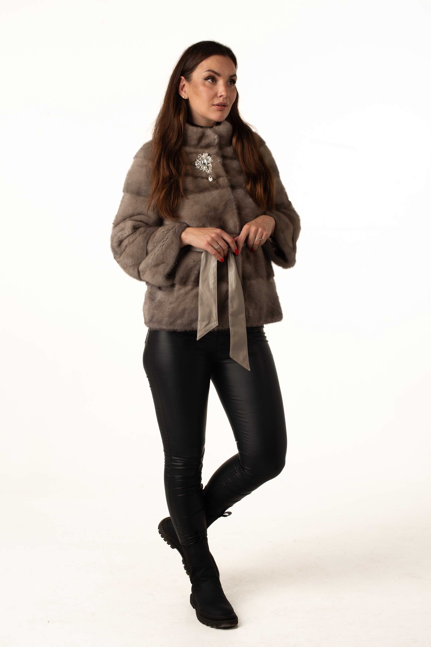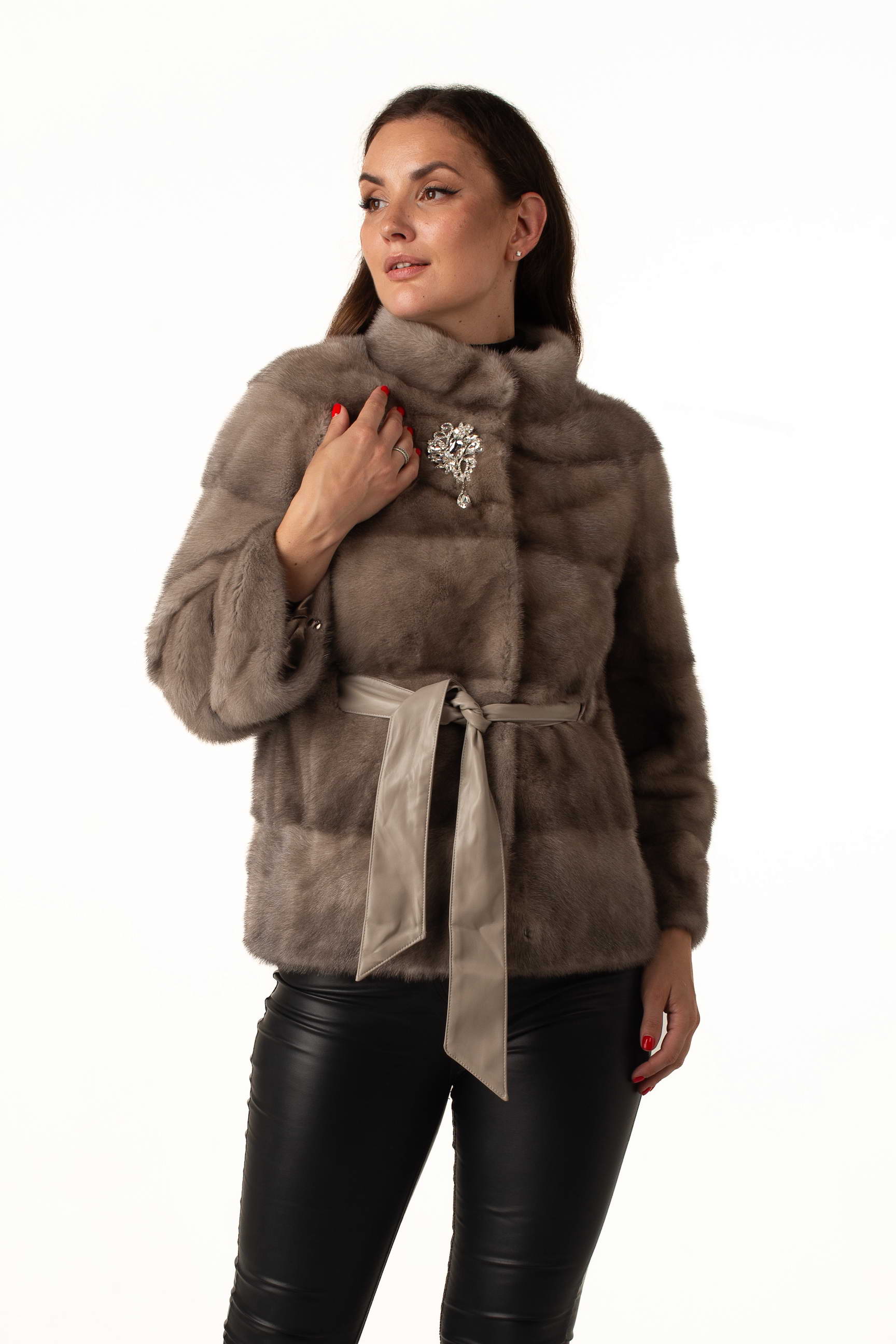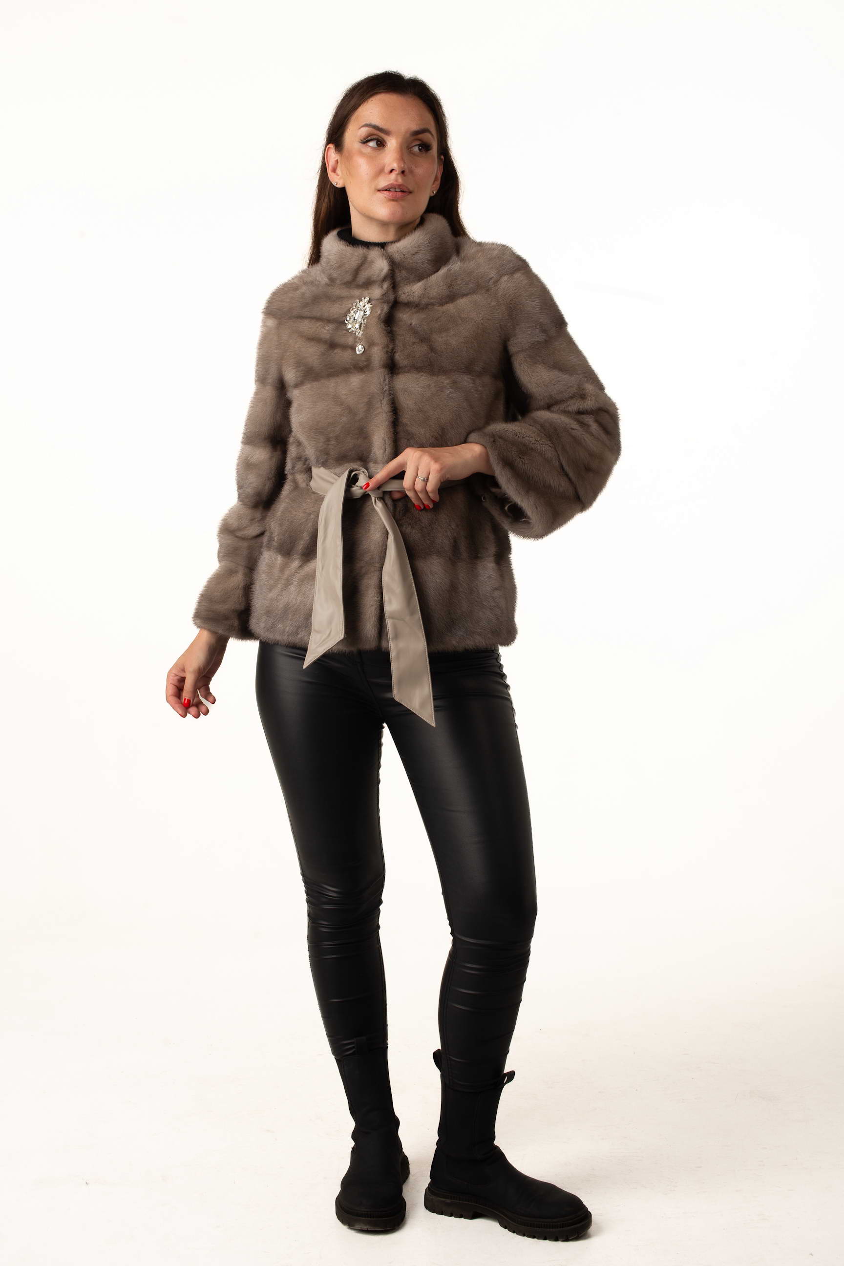 Эта женская шуба из норкового меха в изысканном оттенке «колотый лёд» создана для тех, кто ценит роскошь, комфорт и современный стиль. Модель имеет стойку-воротник, украшенный элегантной брошей, что добавляет образу утончённости.