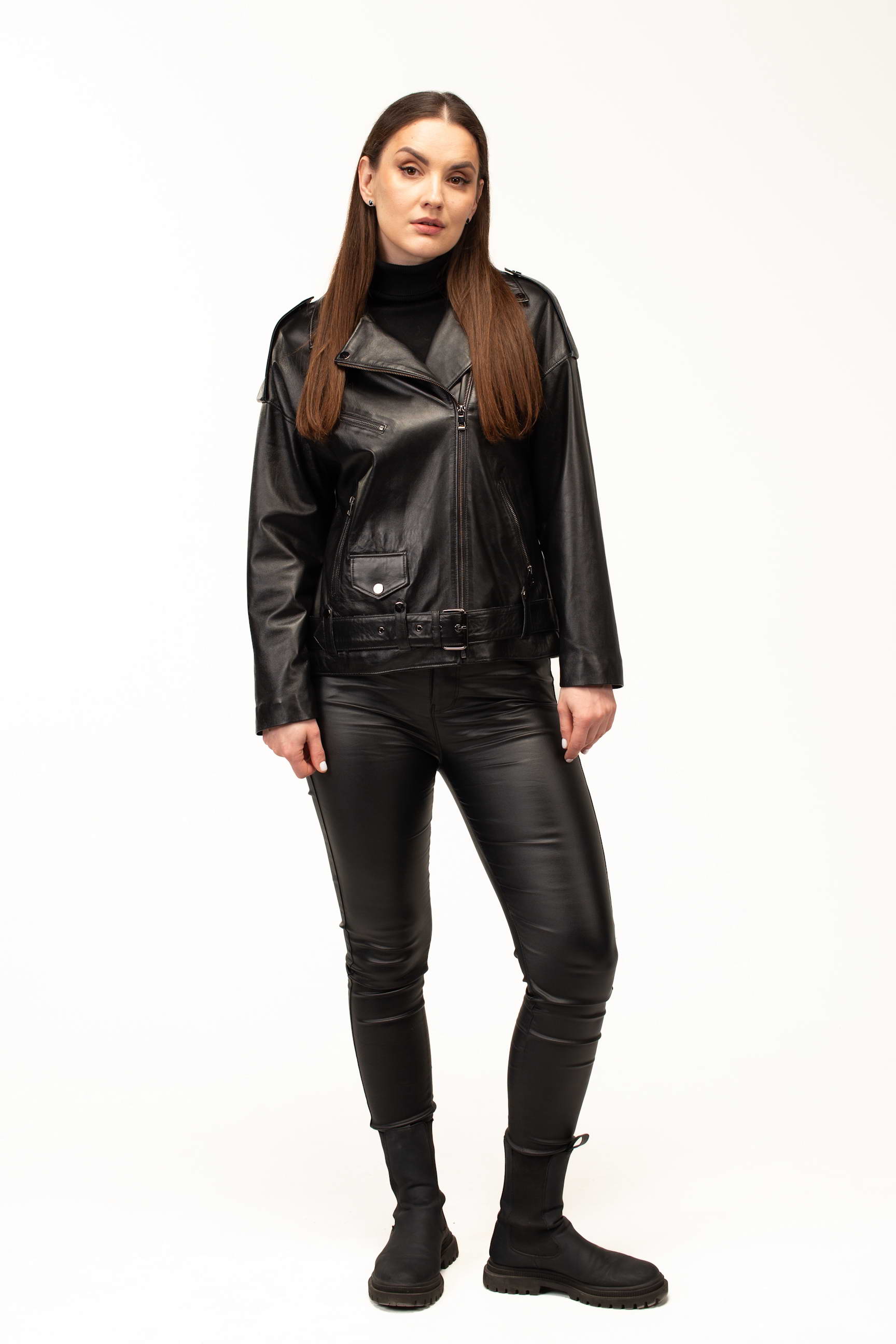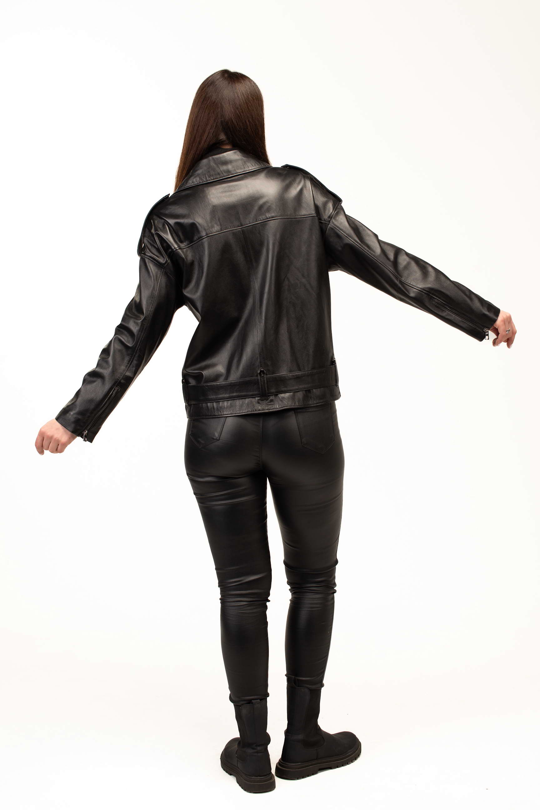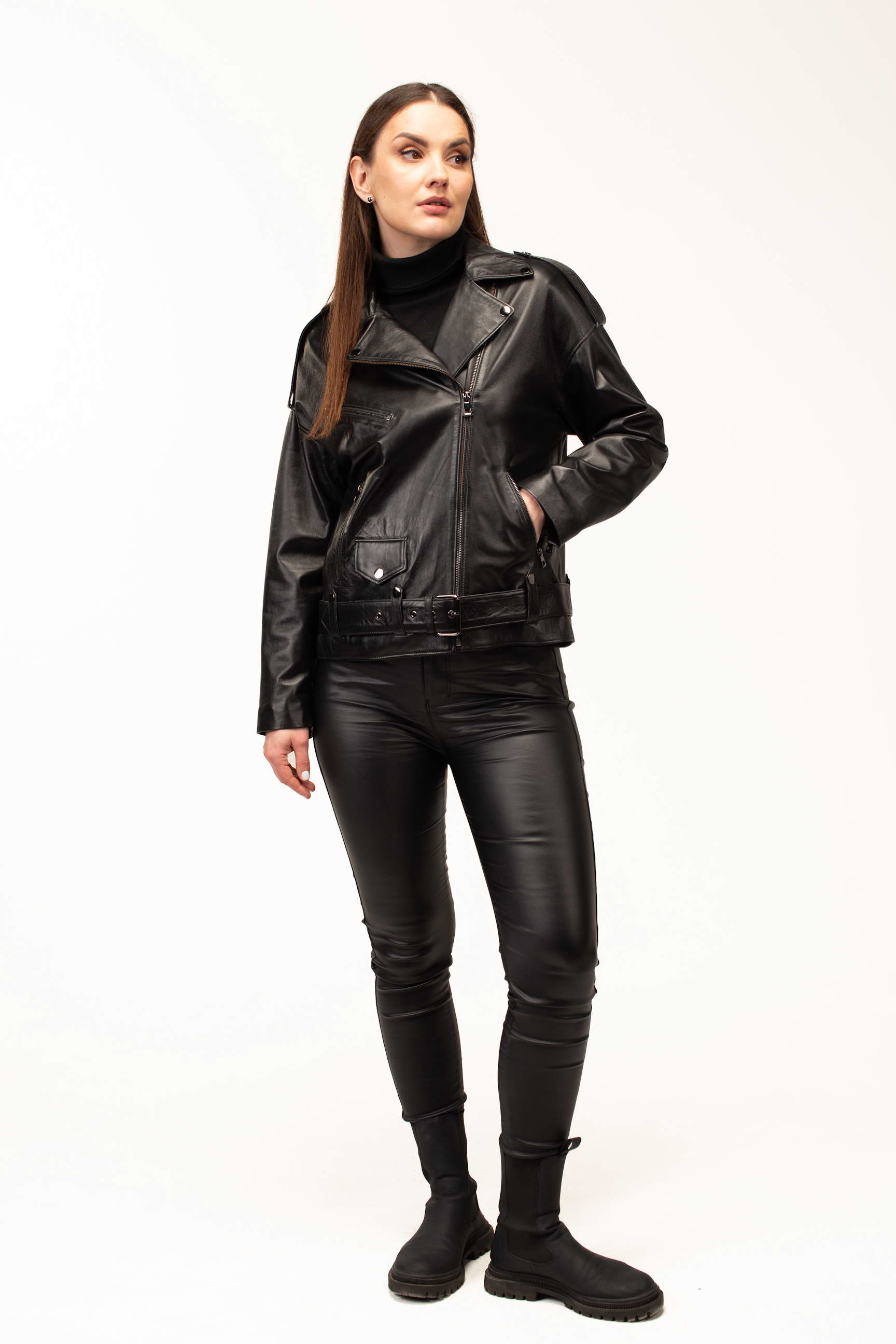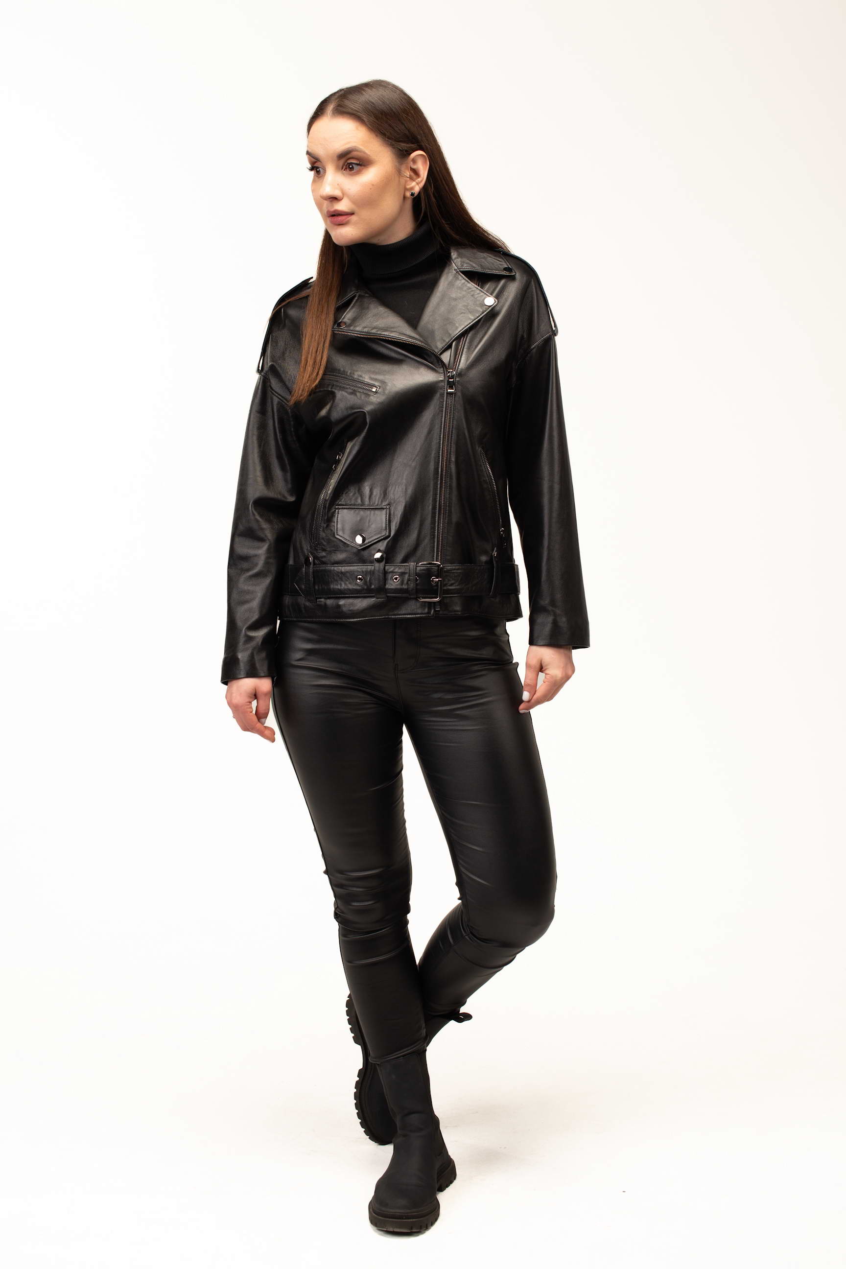 Эта женская черная кожаная куртка станет универсальным элементом гардероба, который легко сочетается как с повседневной одеждой, так и с более официальными образами. Она идеально подходит для прогулок по городу, деловых встреч или вечерних выходов, добавляя уверенности и подчеркивая индивидуальный стиль.