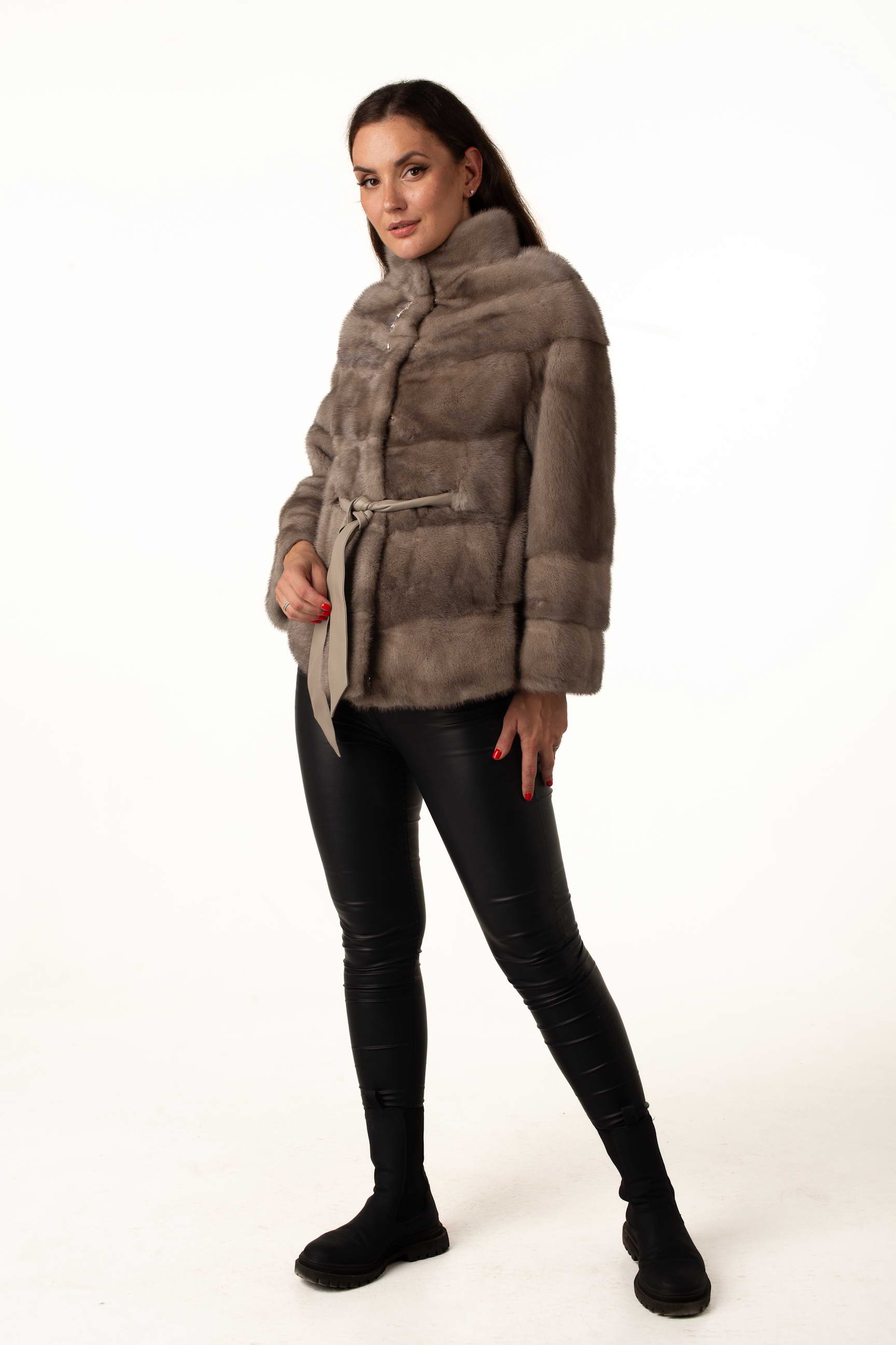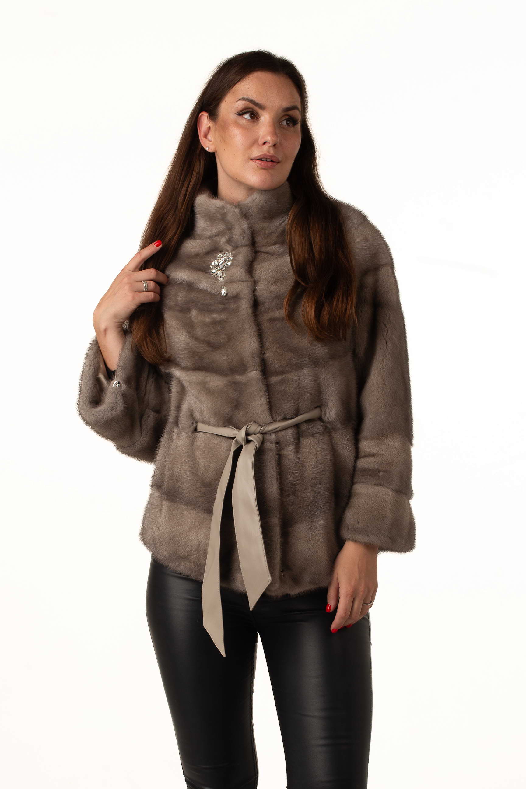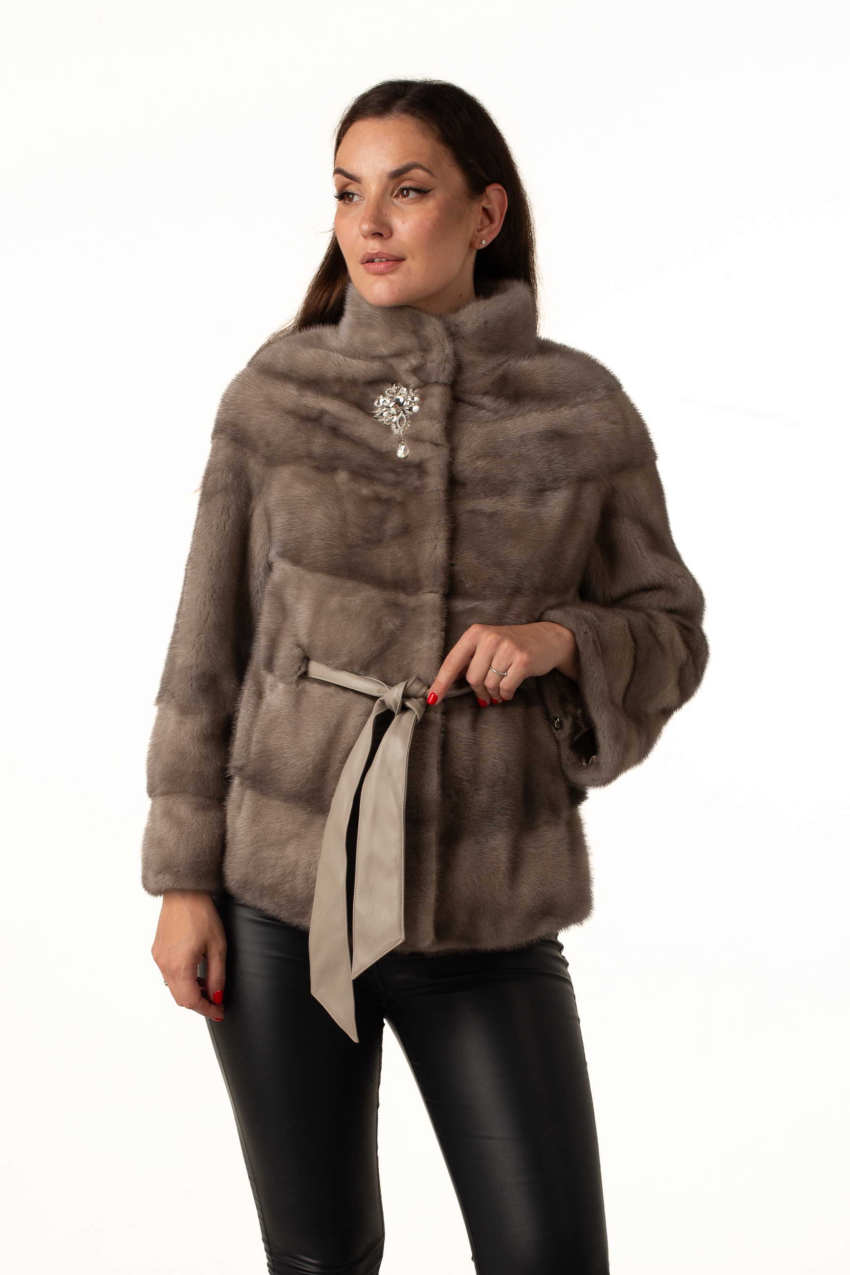 Женская шуба из натурального меха норки цвета «колотый лед» – элегантная и современная модель для зимнего сезона. Воротник-стойка и утягивающий пояс из экокожи подчеркивают силуэт, а отстегивающийся рукав до длины 7/8 обеспечивает удобство и вариативность в носке. Брошка у воротника добавляет изысканный акцент.