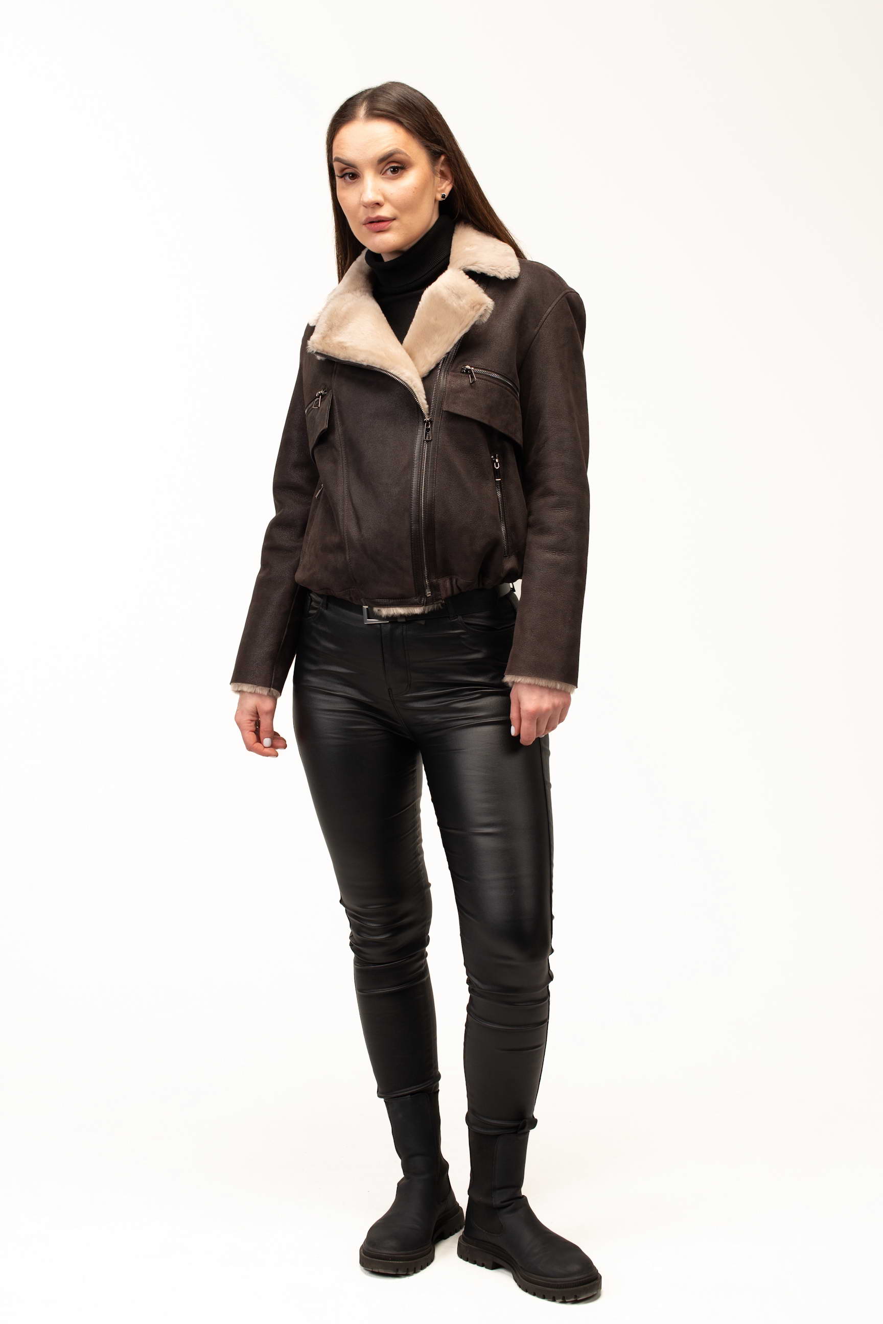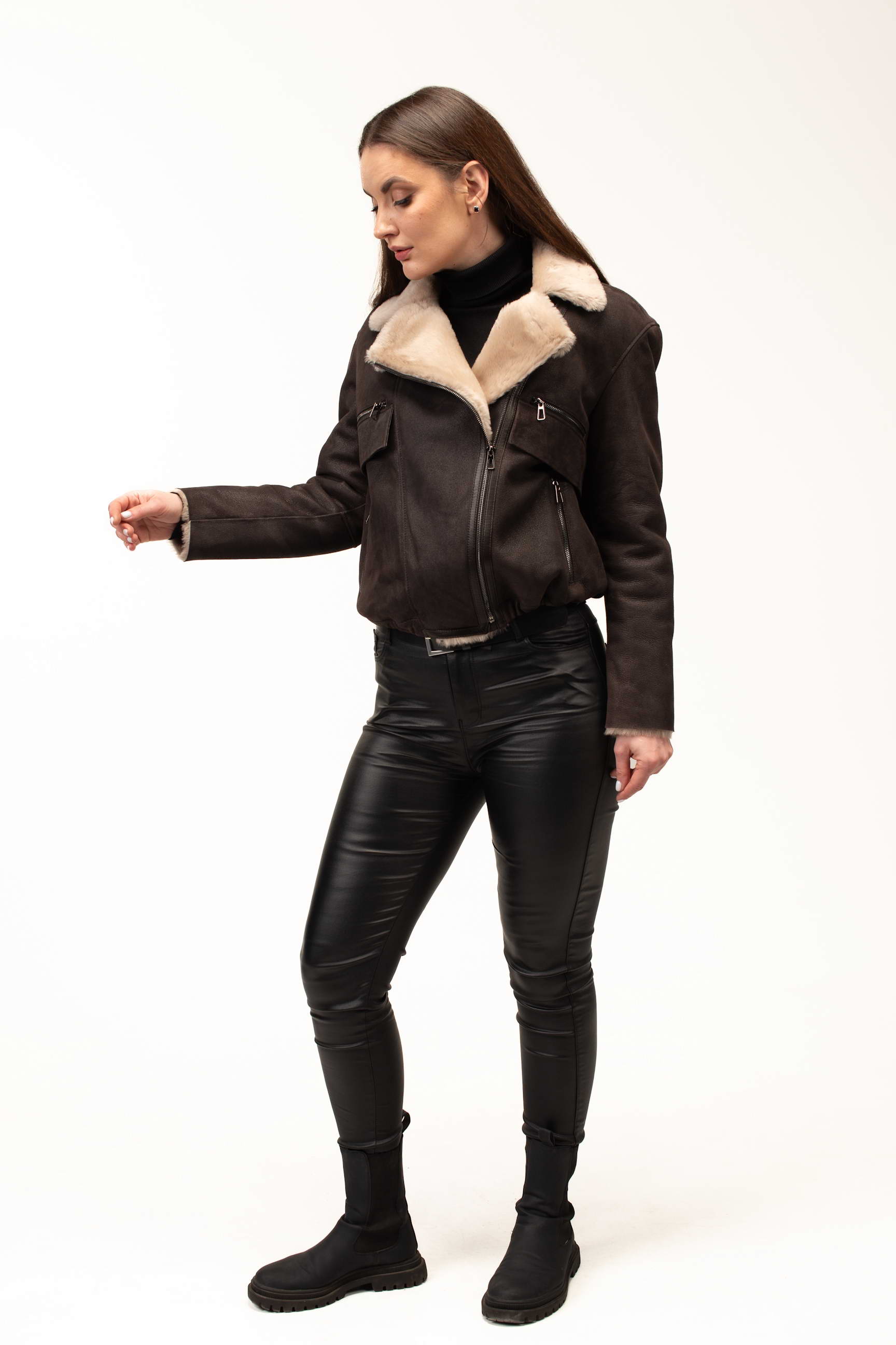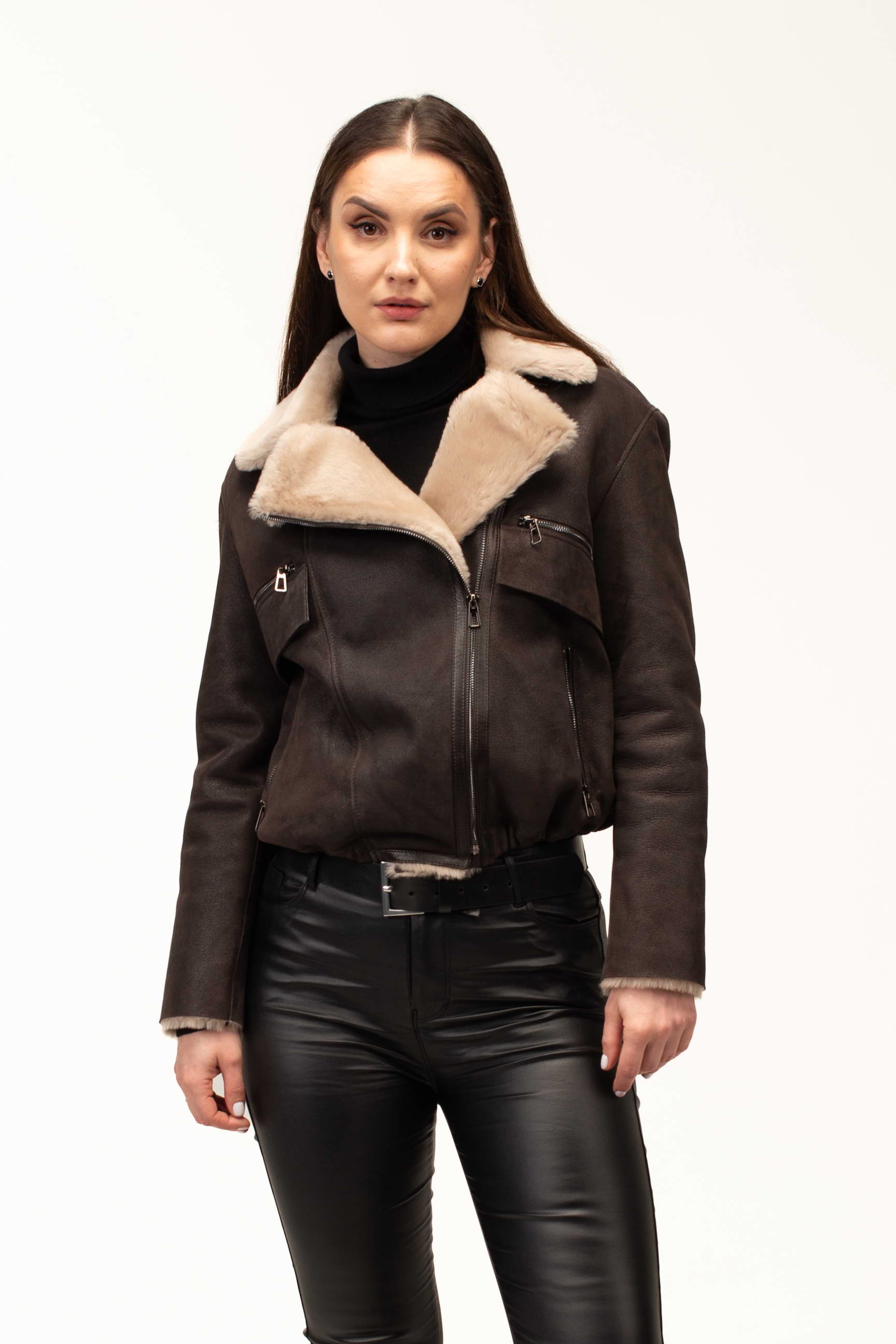 Коричневый цвет придает изделию благородство и универсальность, позволяя легко сочетать дубленку с различными элементами гардероба. Формат бомбера выглядит современно и динамично, подчеркивая индивидуальный стиль и добавляя образу легкое настроение casual. Длина 55 см делает модель удобной для активной городской жизни и создания трендовых многослойных образов.