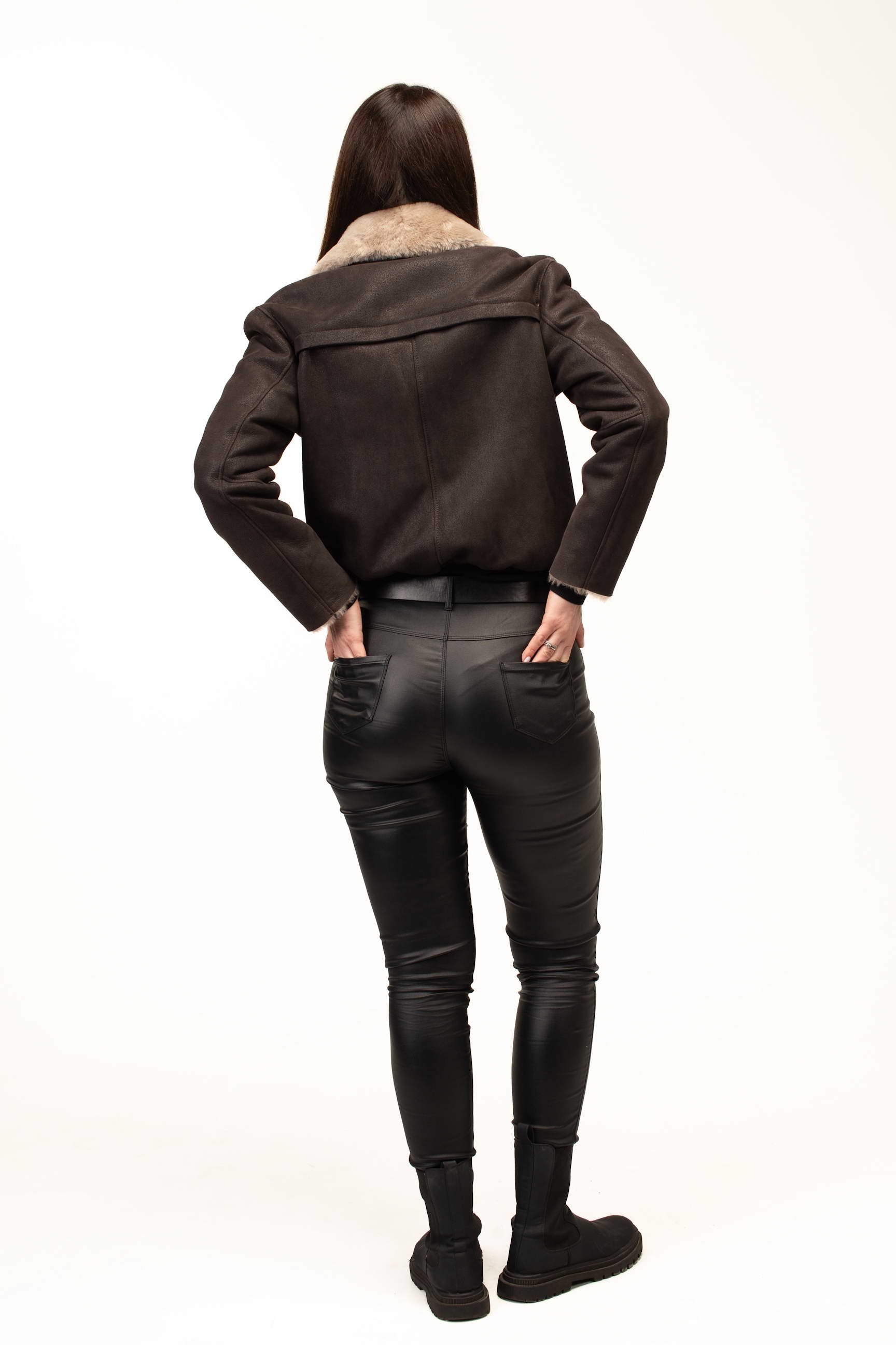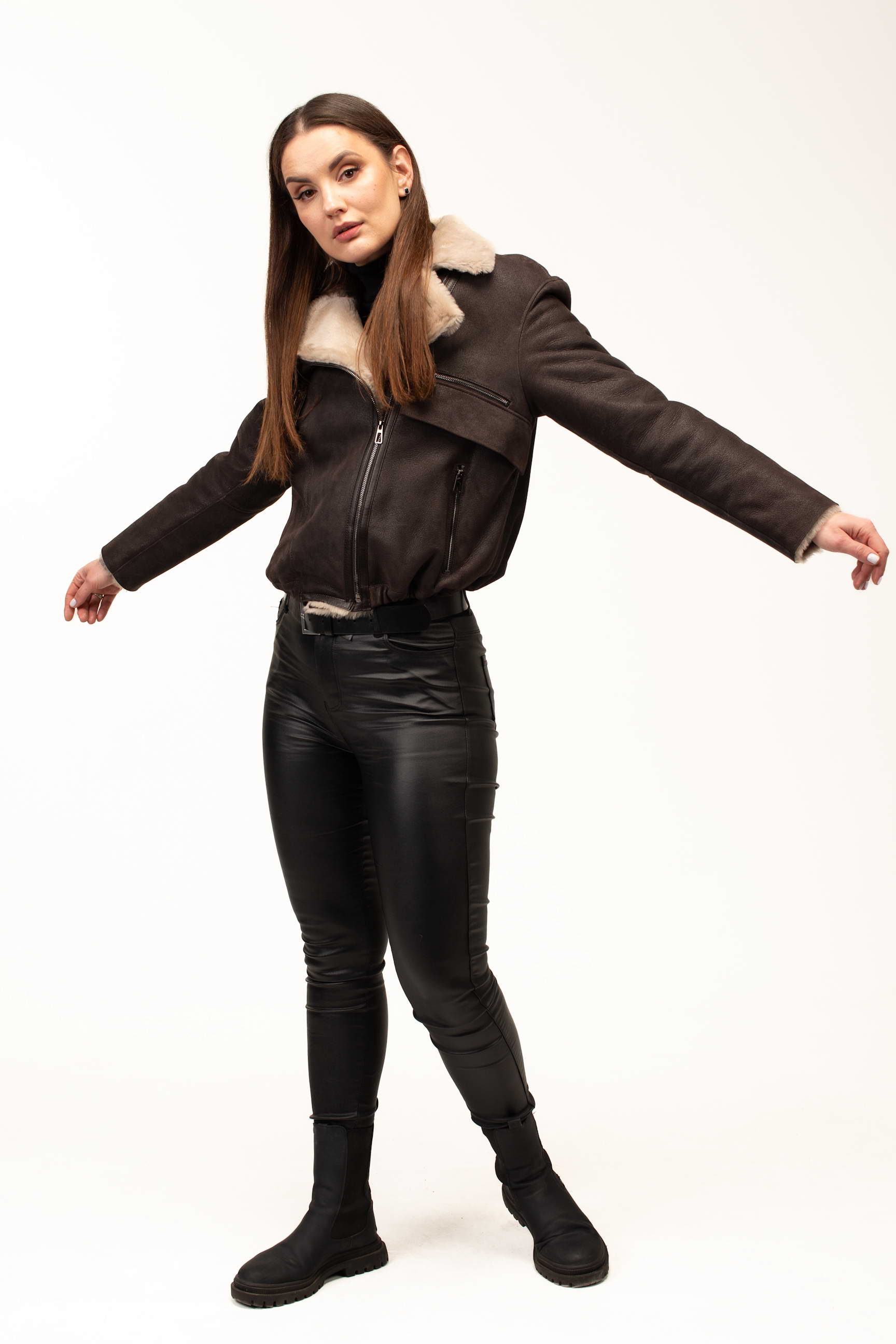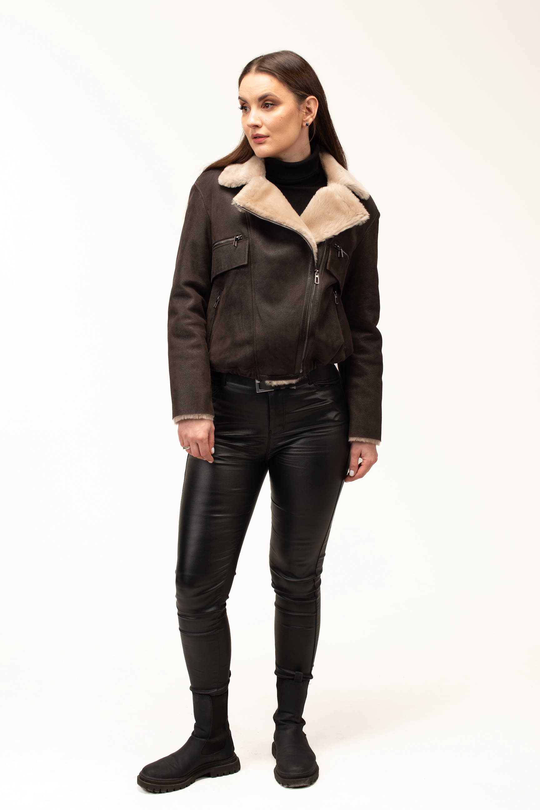 Коричневый цвет придает изделию благородство и универсальность, позволяя легко сочетать дубленку с различными элементами гардероба. Формат бомбера выглядит современно и динамично, подчеркивая индивидуальный стиль и добавляя образу легкое настроение casual. Длина 55 см делает модель удобной для активной городской жизни и создания трендовых многослойных образов.