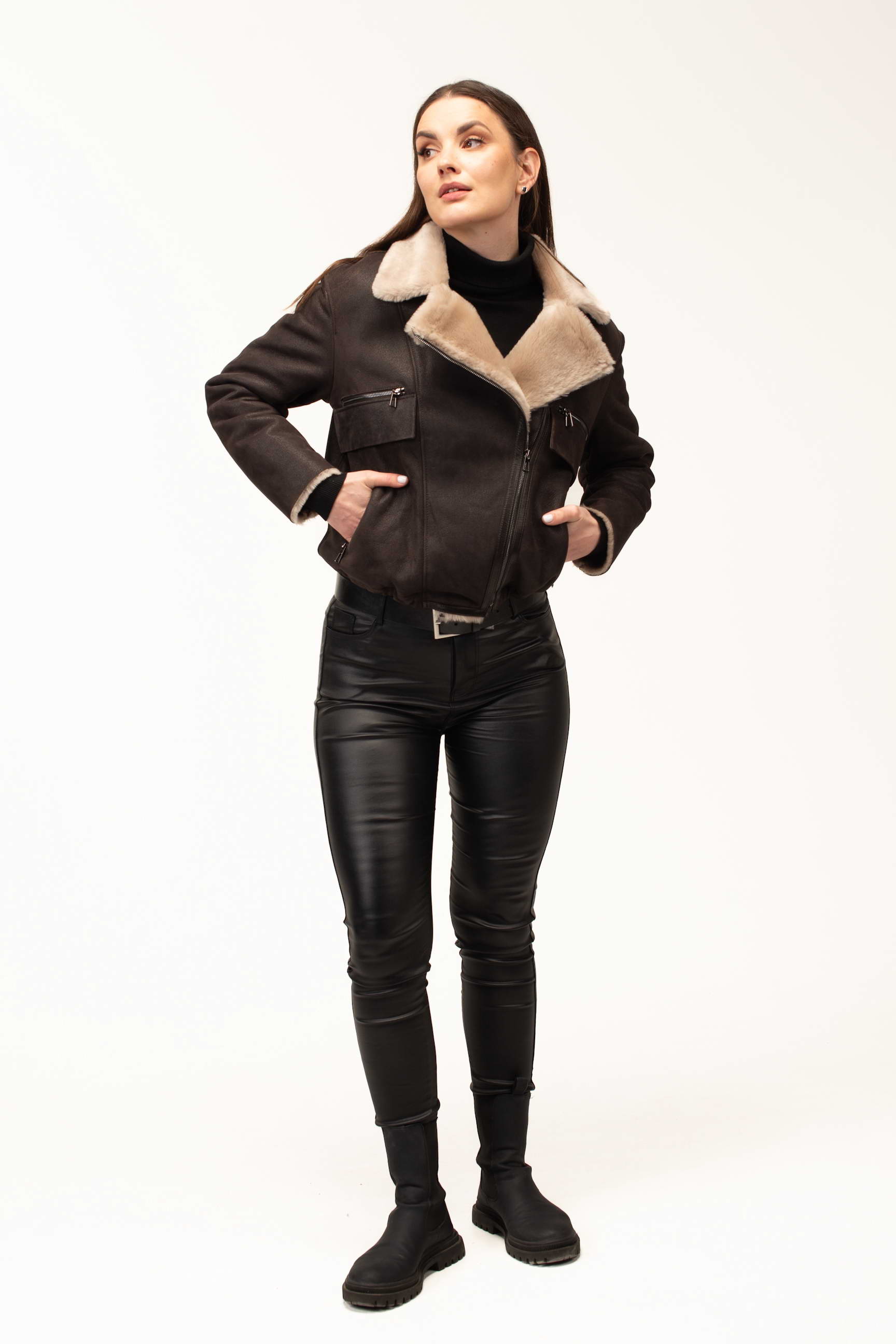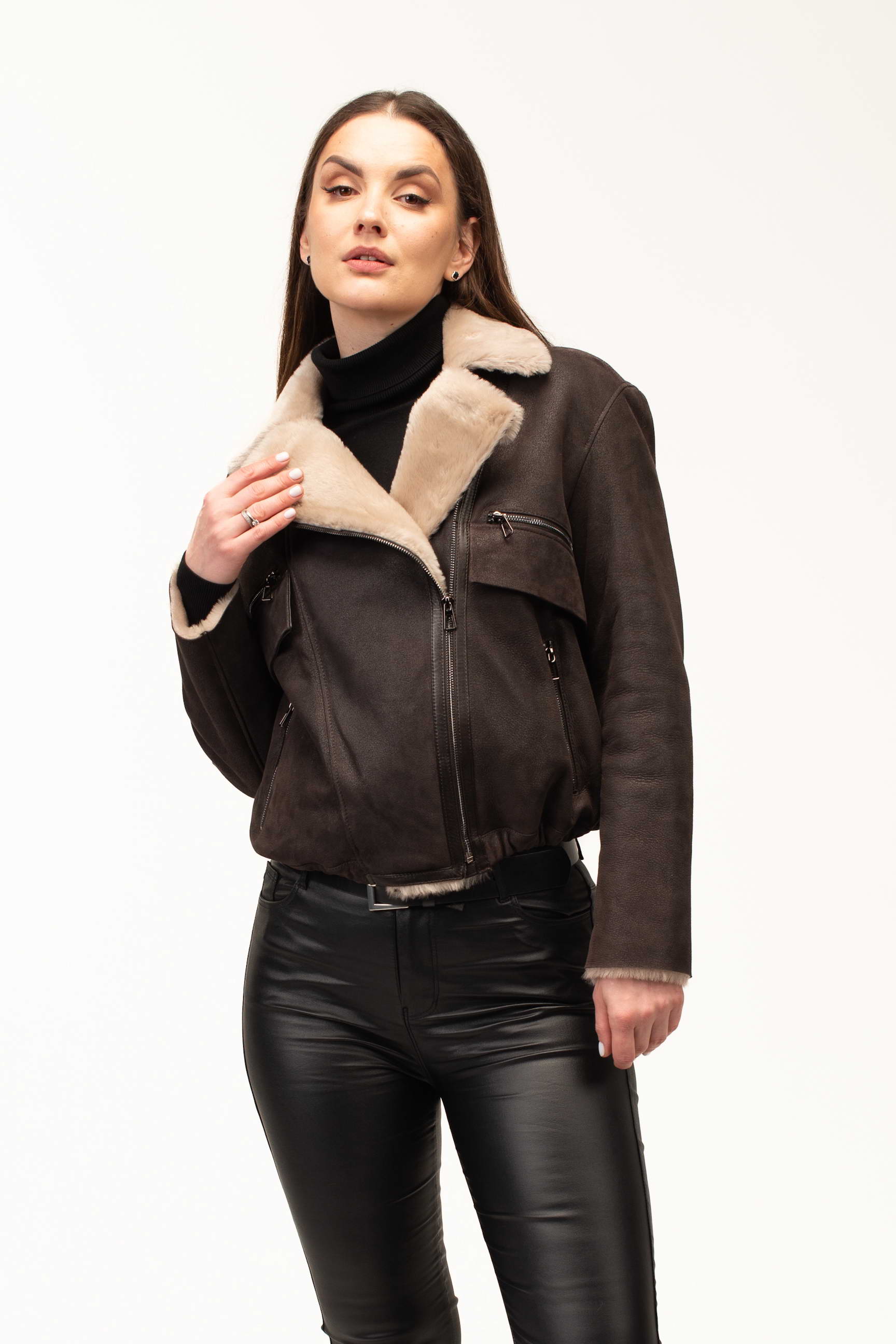 Отложной воротник добавляет дубленке элегантности и позволяет варьировать образ в зависимости от настроения и погоды. Застежка на молнии является практичной и удобной в повседневном использовании, а вставка из кожи вдоль молнии выступает стильным акцентом, подчеркивающим качество и продуманность дизайна.