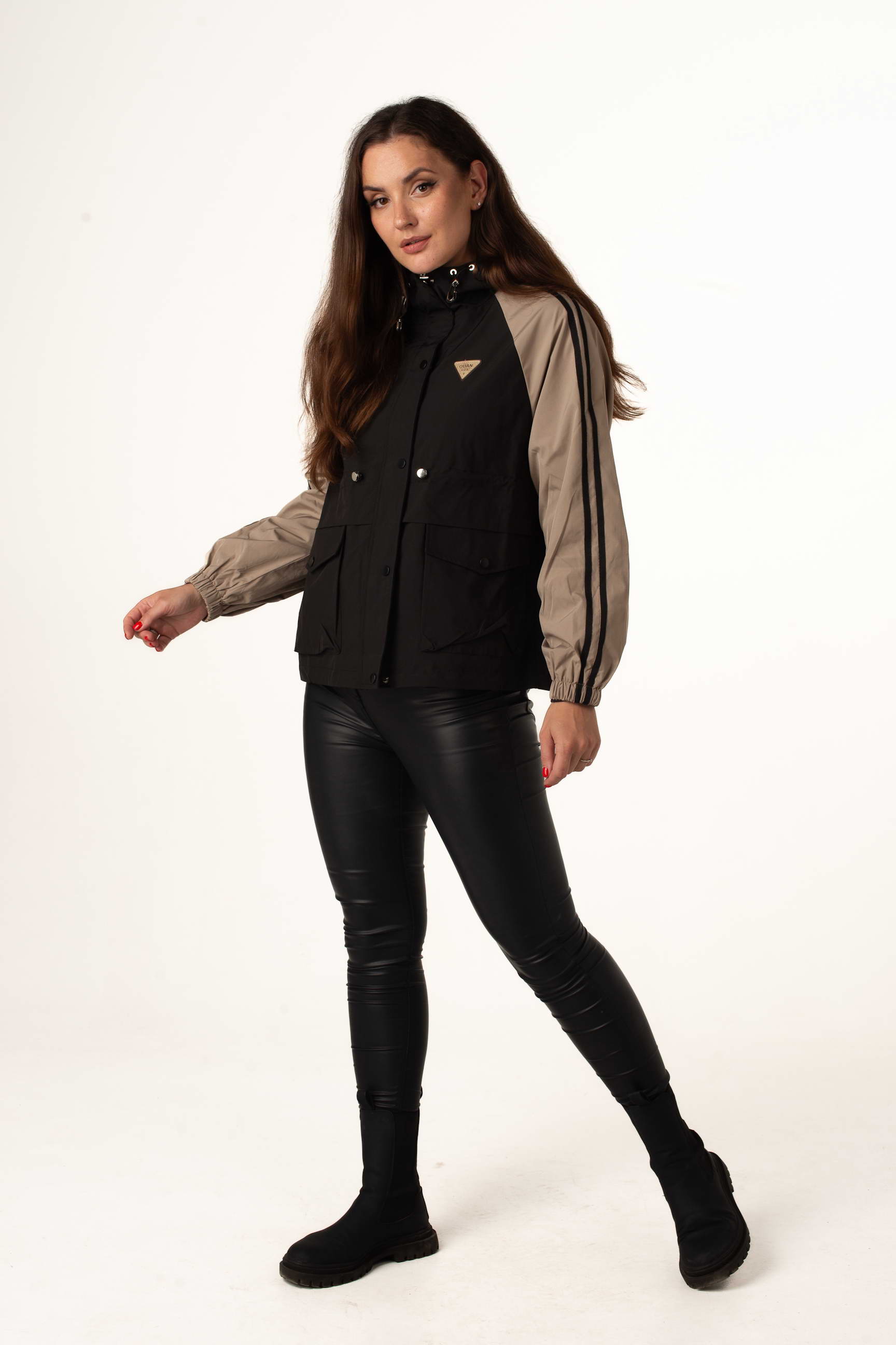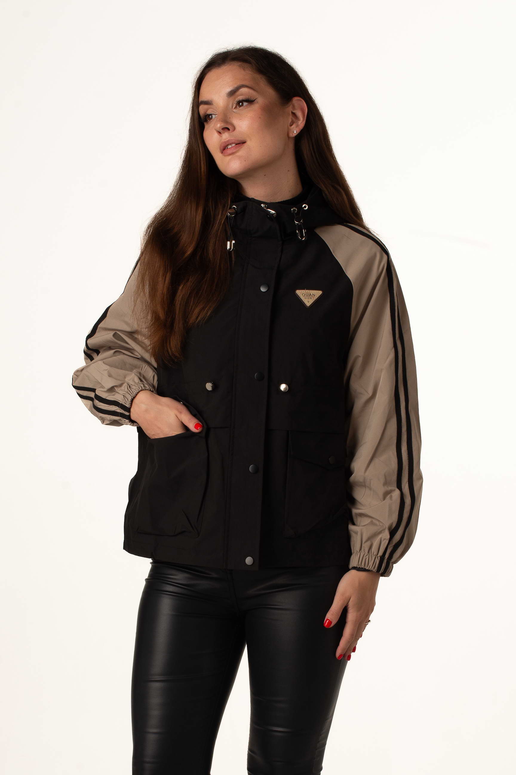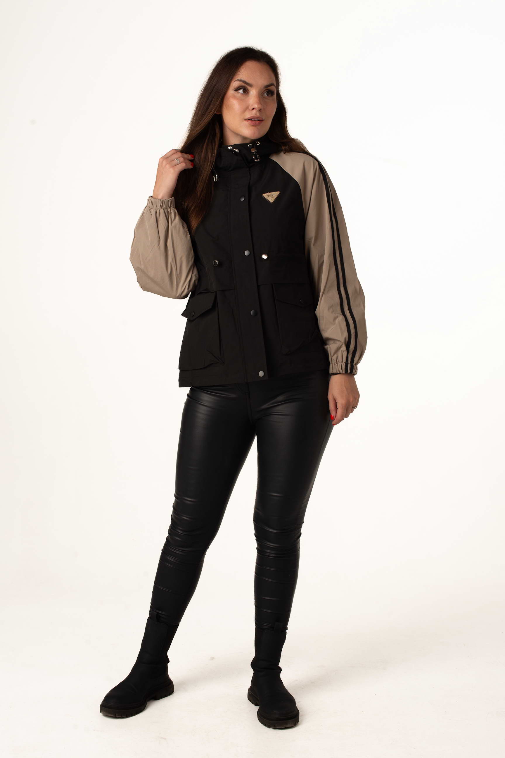Чорно-бежева жіноча легка вітровка створена для теплої весни та осені. Модель поєднує сучасний дизайн, практичність і комфорт, а капюшон і куліска по талії забезпечують зручну посадку та захист від вітру. Декор на грудях додає стильного акценту.