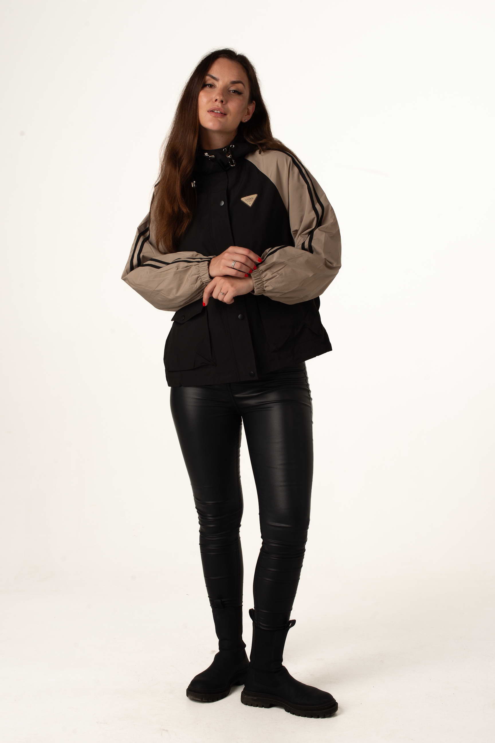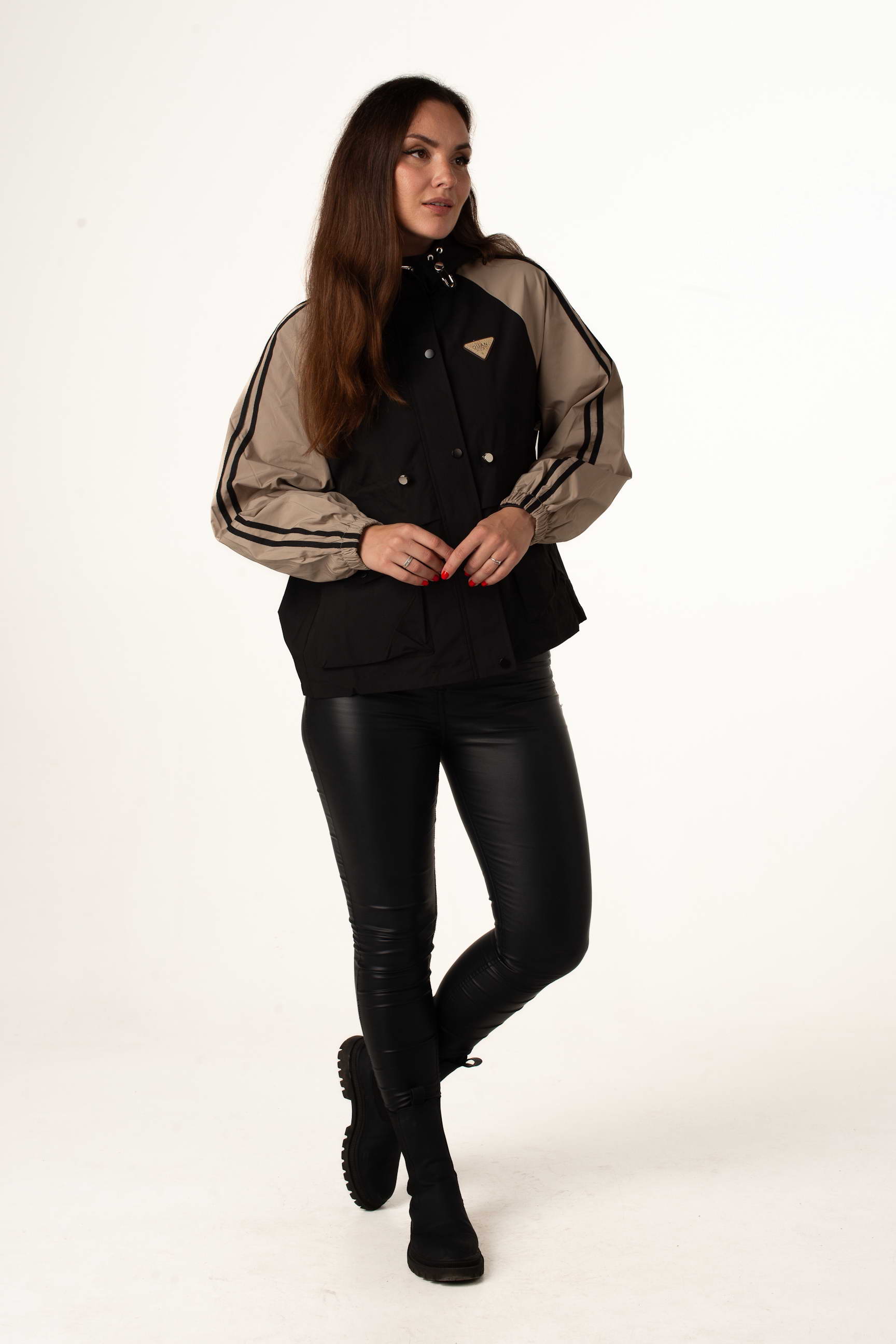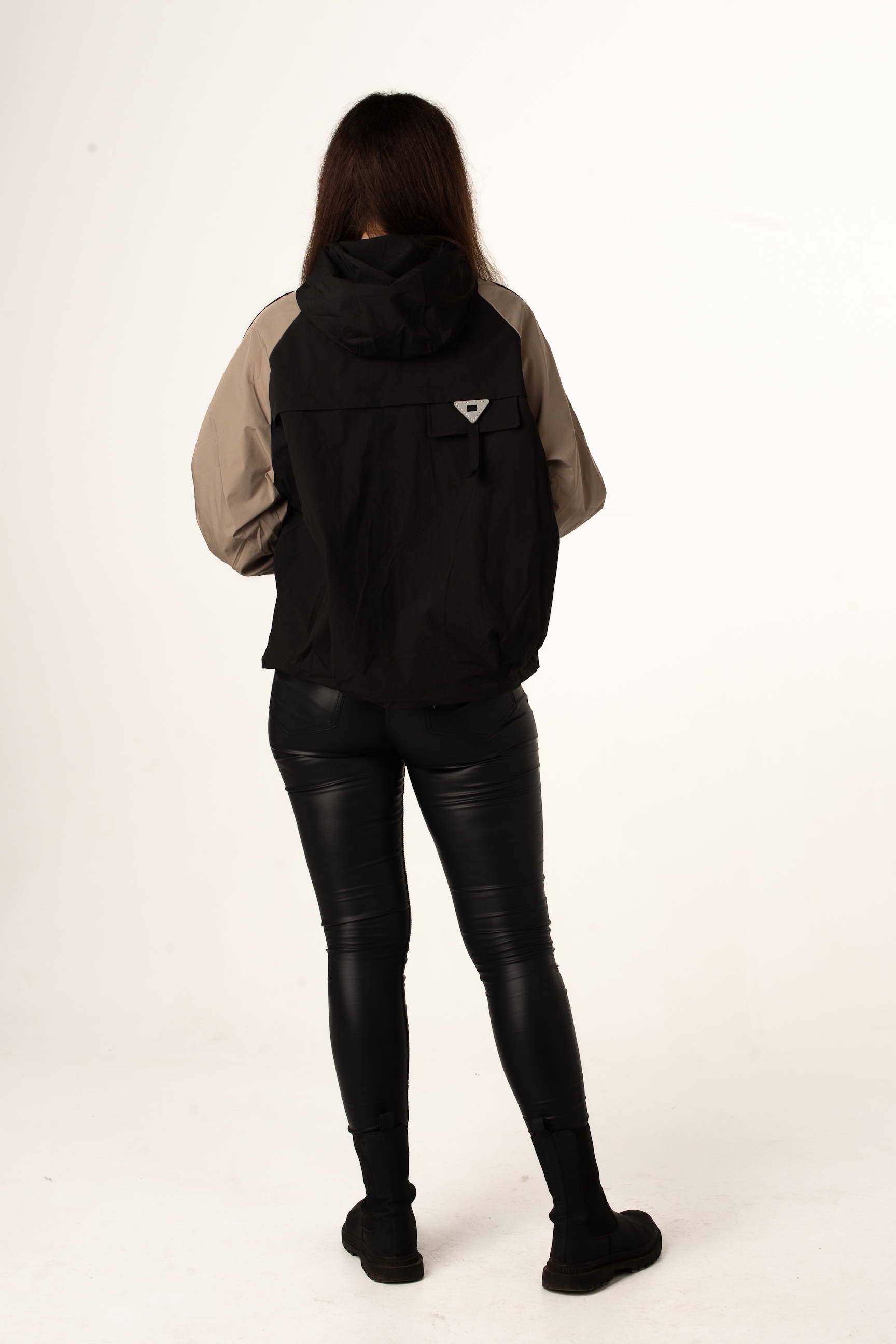 Чорно-бежева жіноча легка вітровка створена для теплої весни та осені. Модель поєднує сучасний дизайн, практичність і комфорт, а капюшон і куліска по талії забезпечують зручну посадку та захист від вітру. Декор на грудях додає стильного акценту.