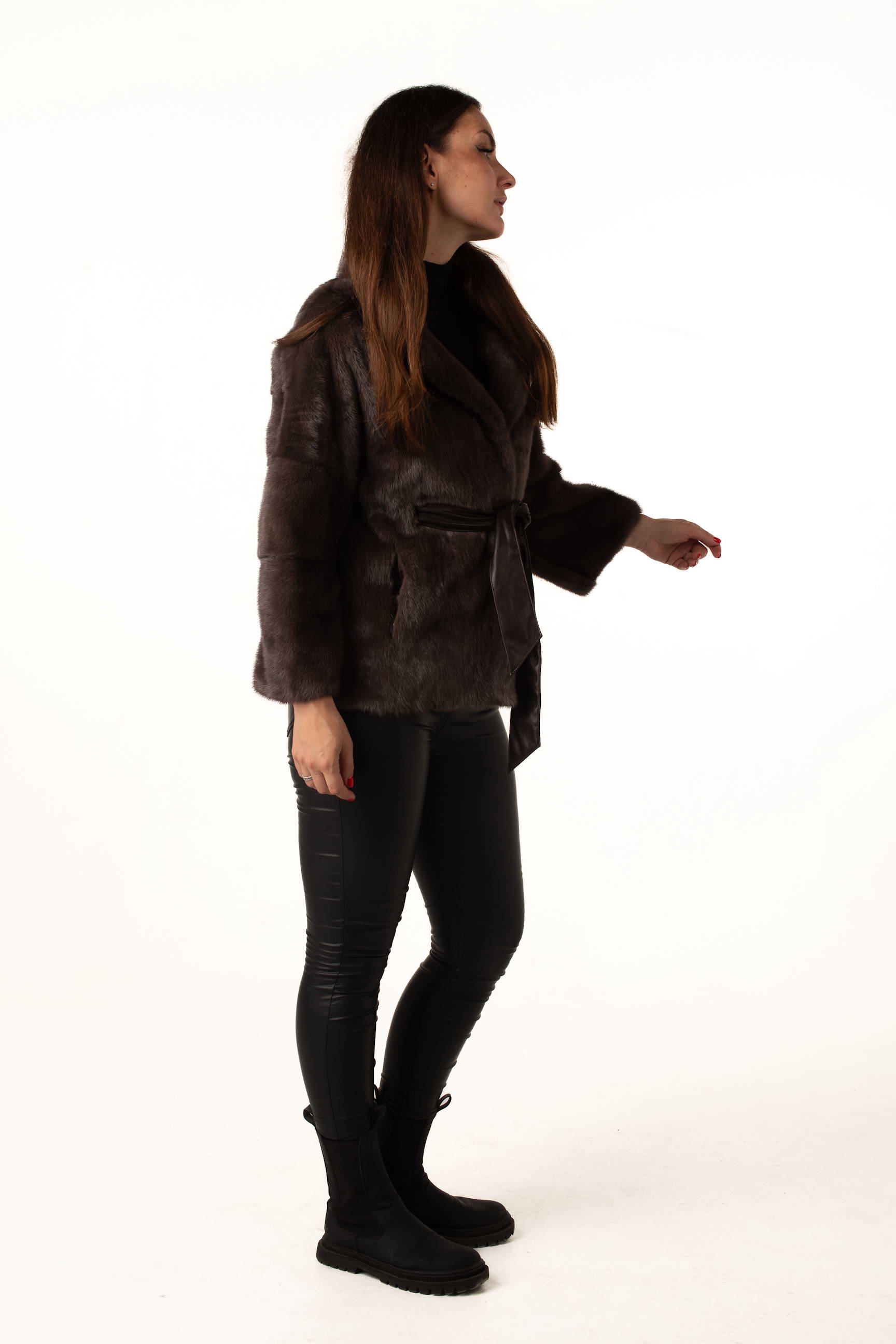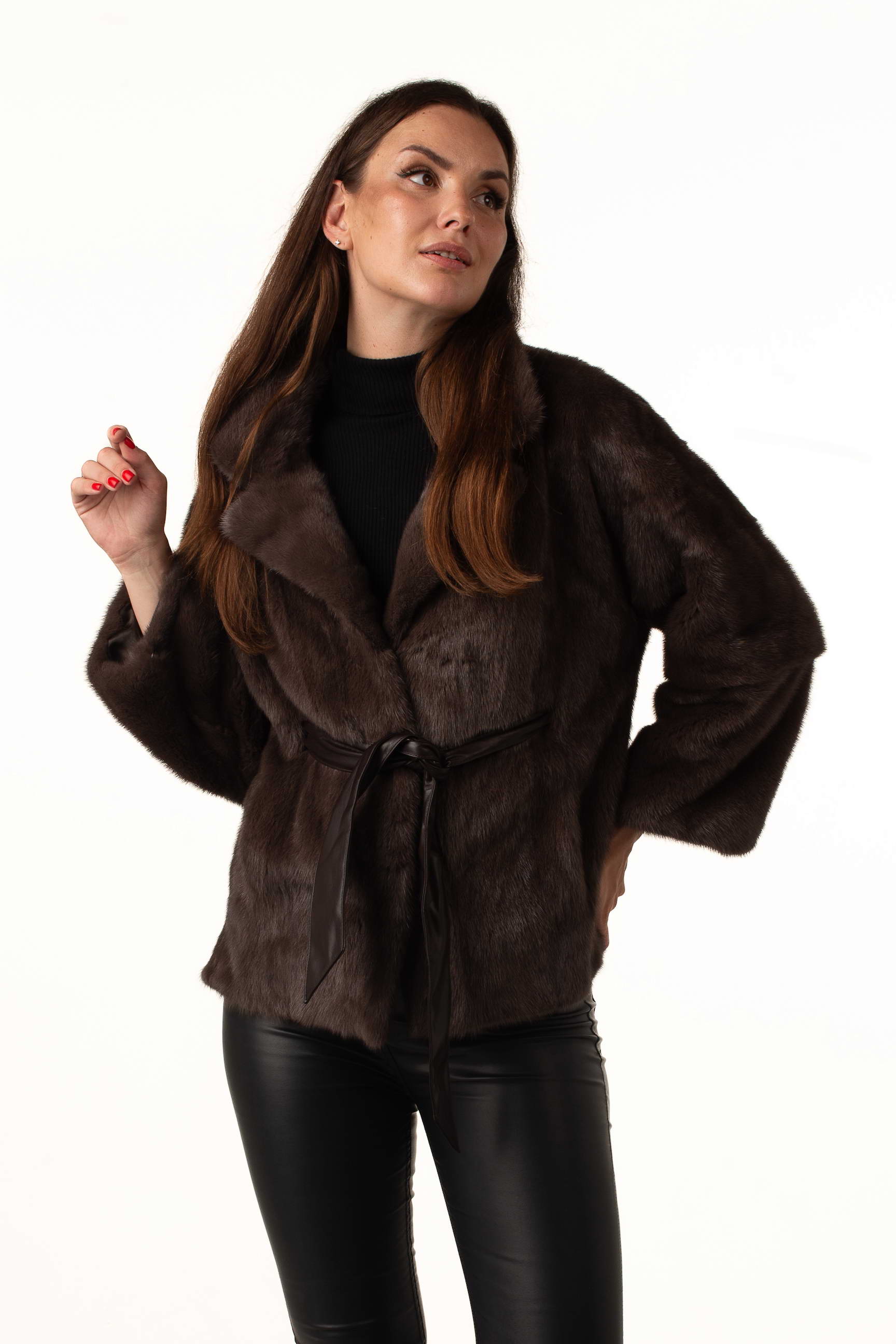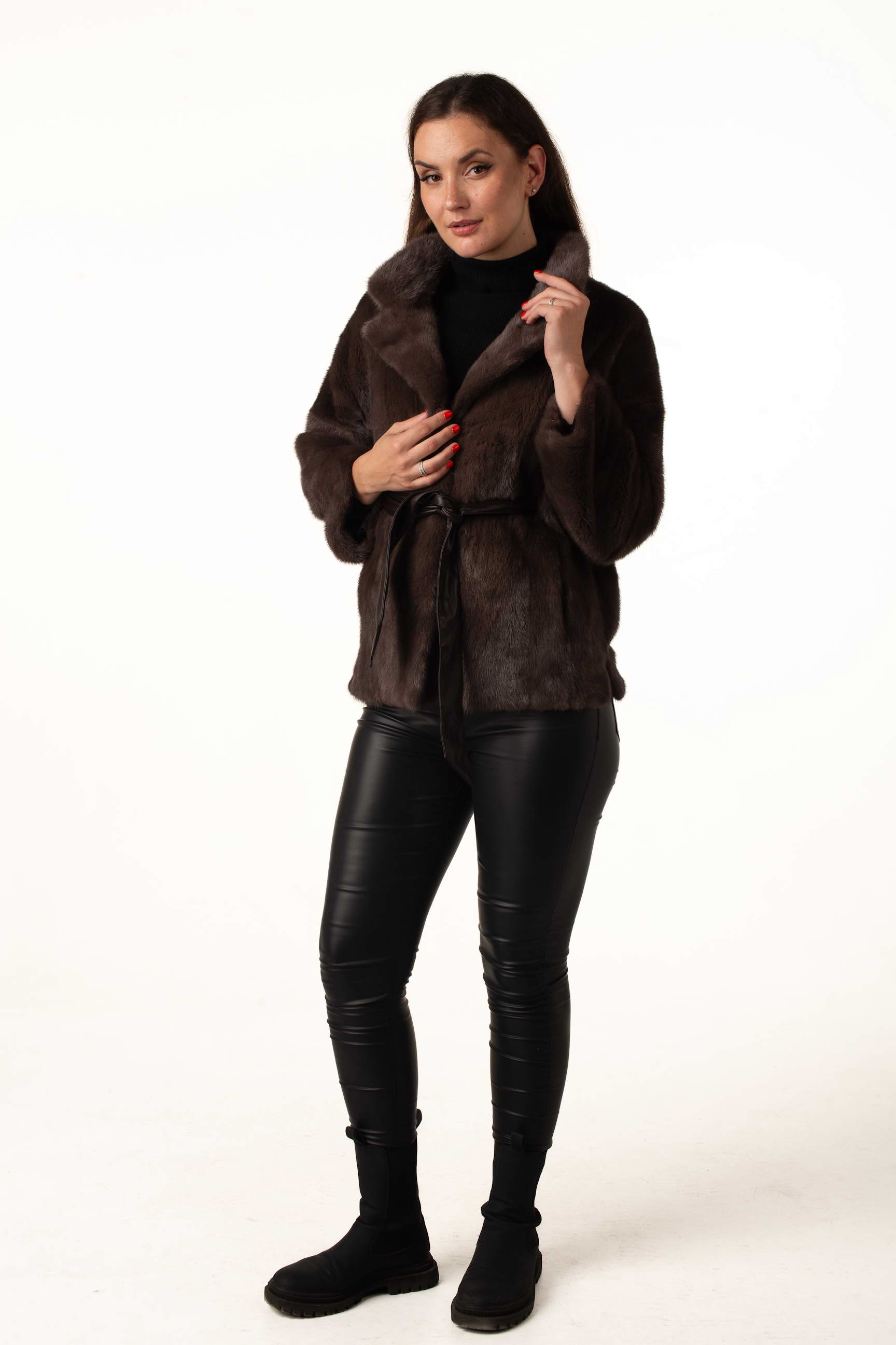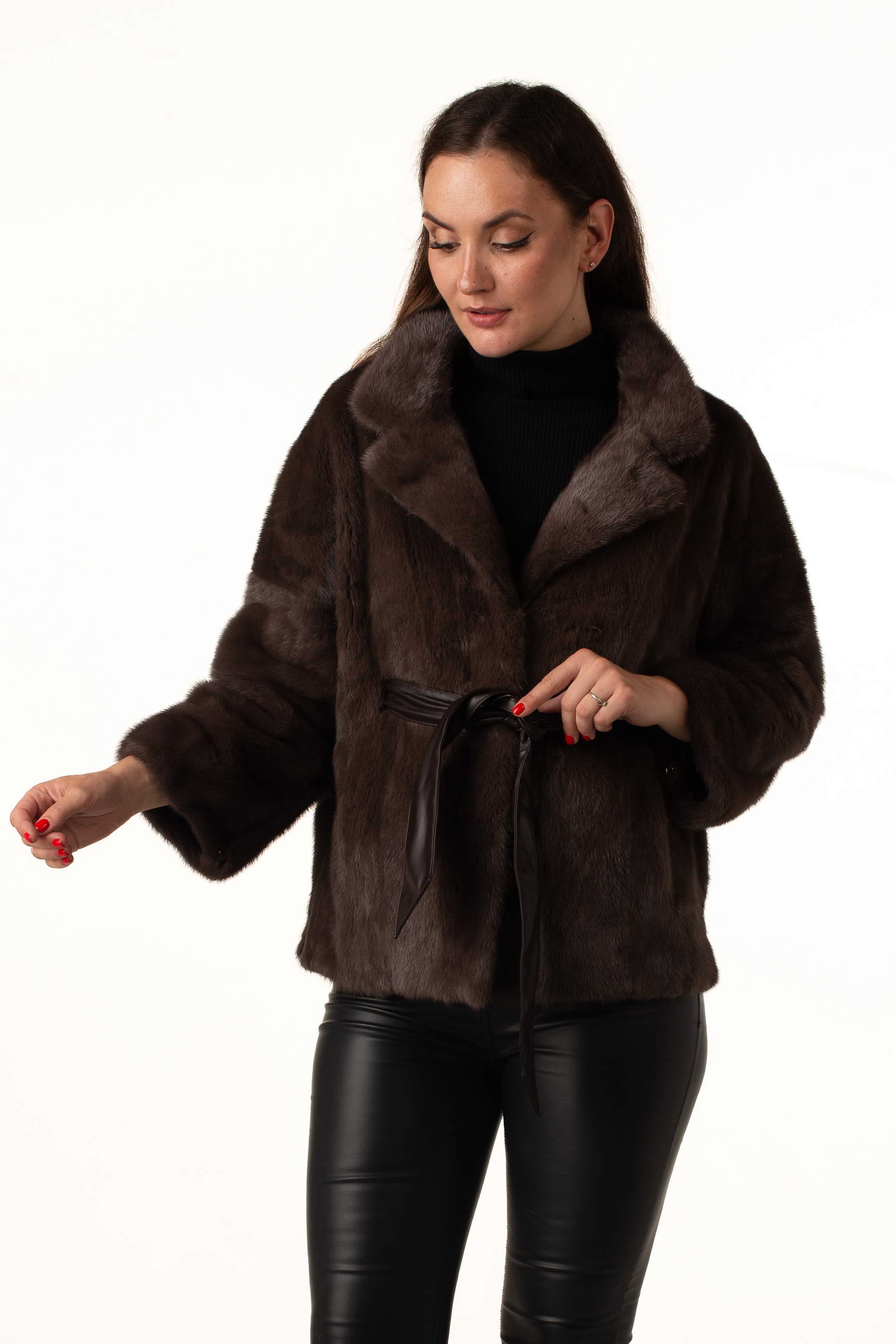Женская шуба из натурального меха норки цвета капучино — это сочетание элегантности, комфорта и современного дизайна. Модель с классическим английским воротником и поясом из экокожи подчёркивает женственный силуэт и придаёт образу роскошь.
