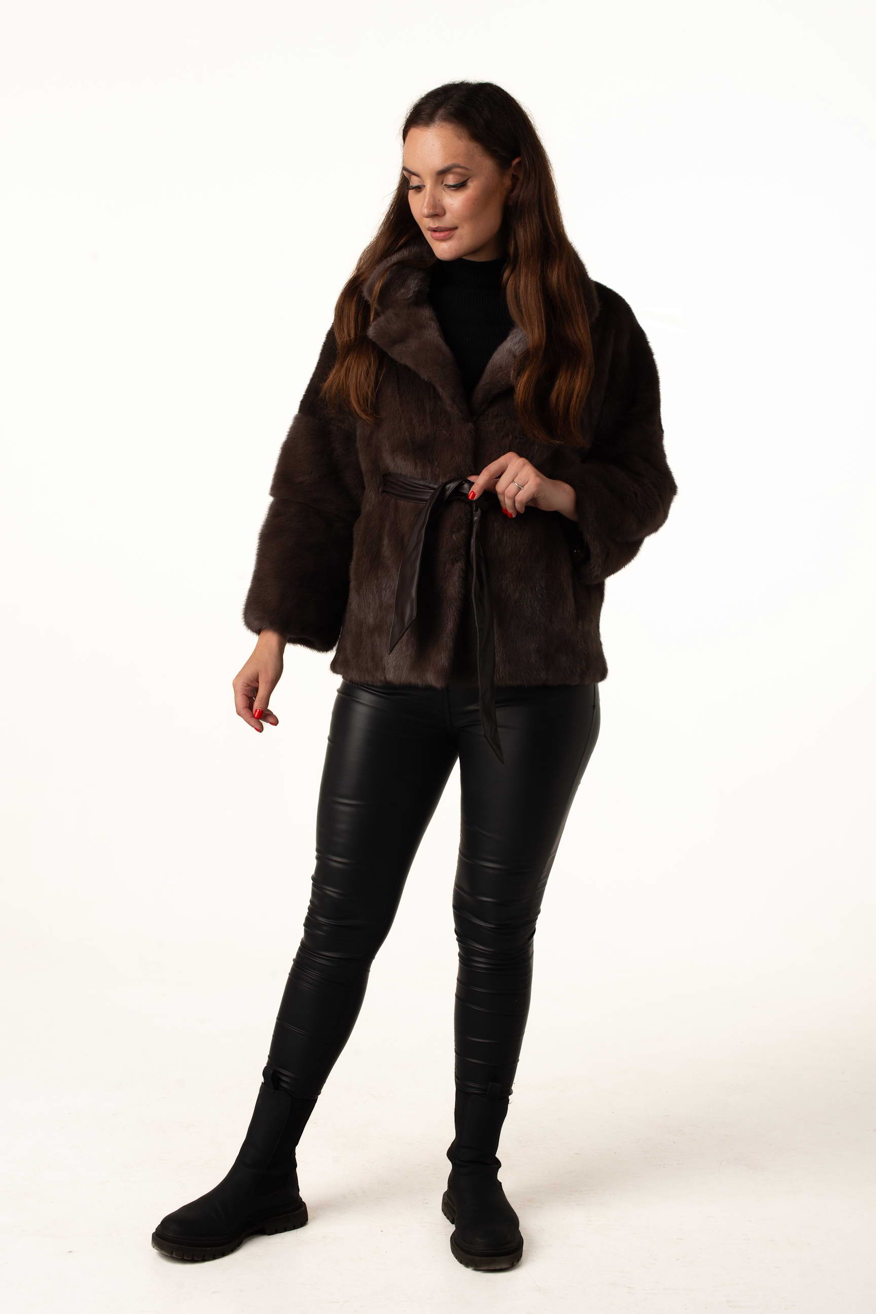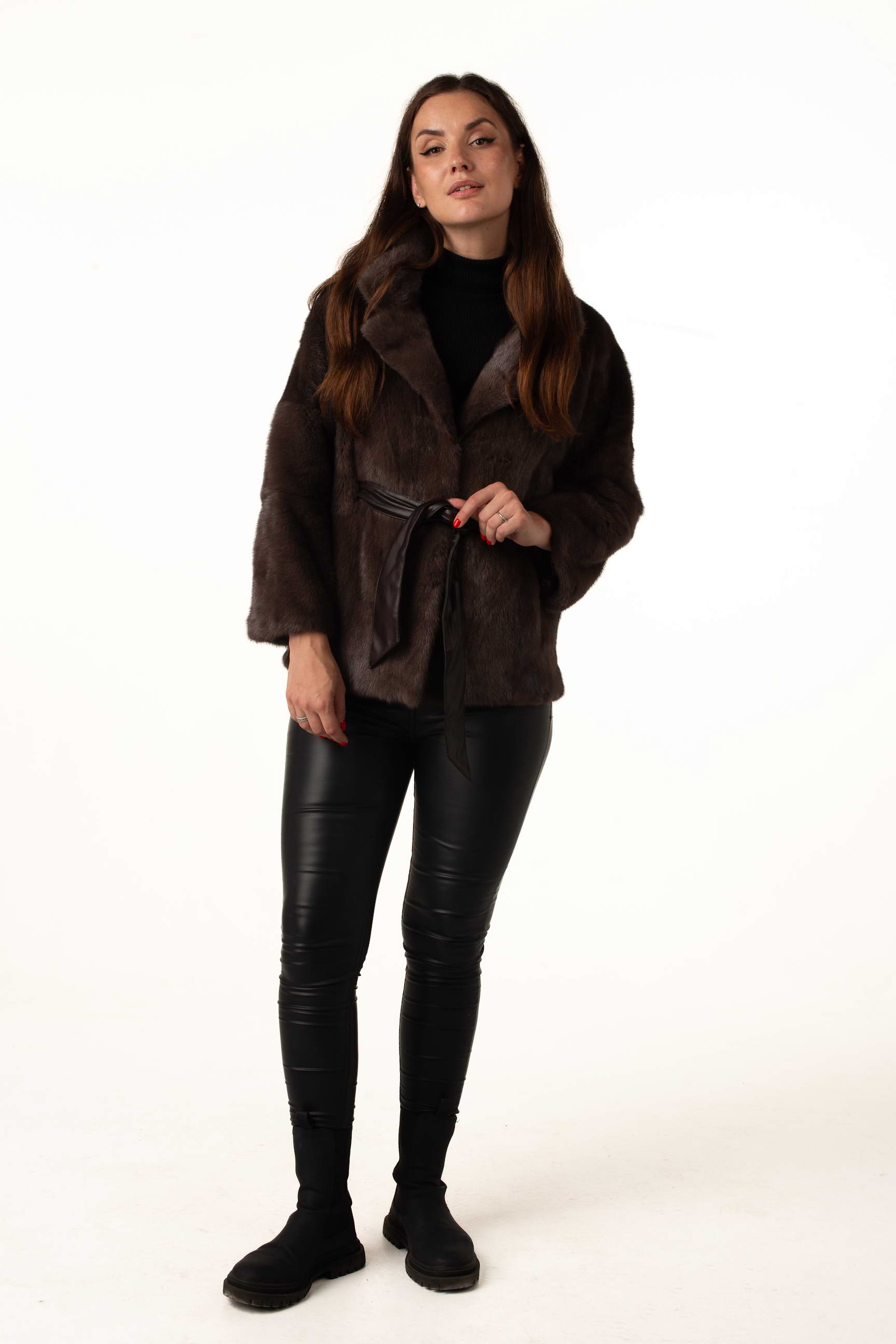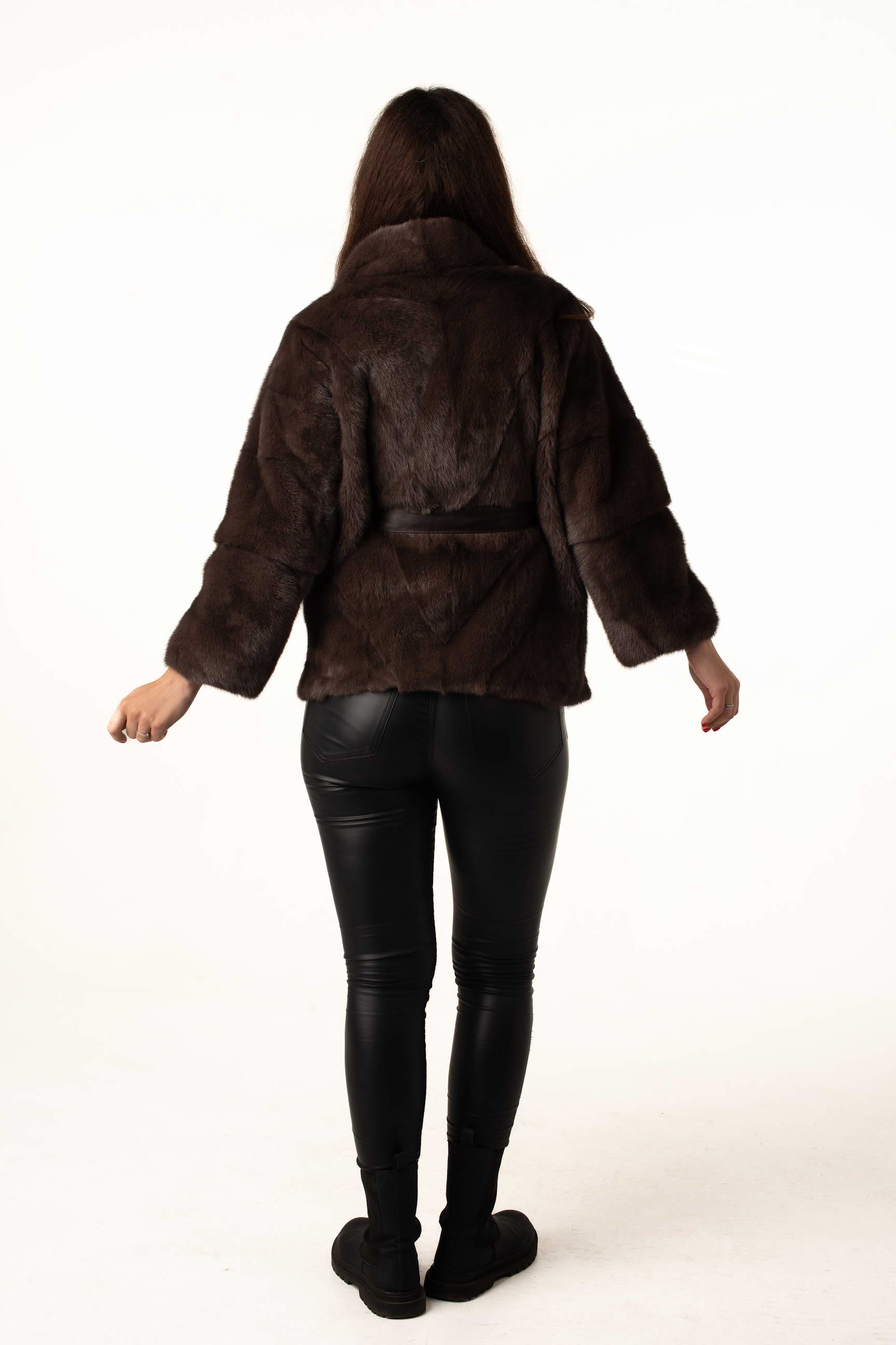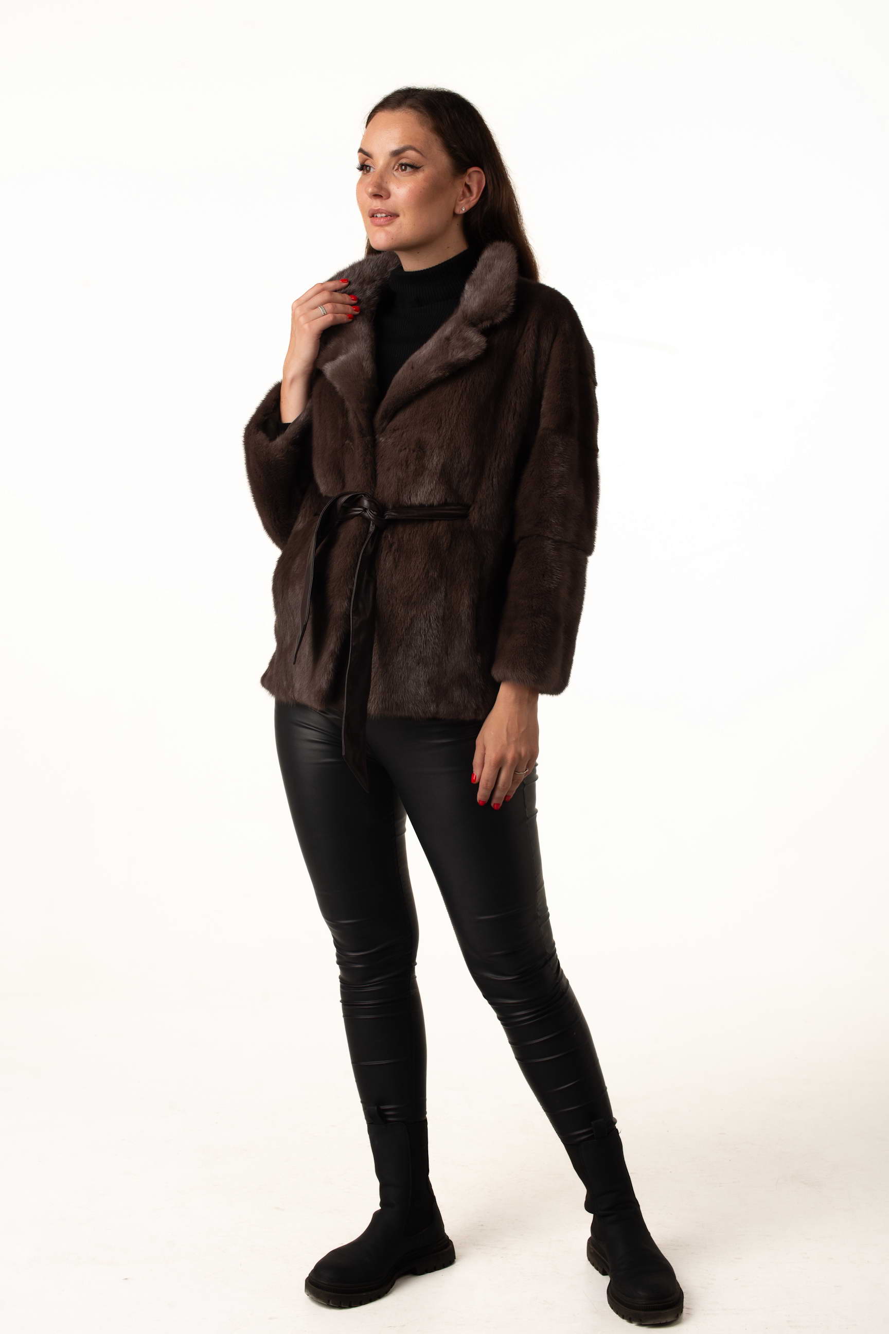 Женская шуба из натурального меха норки цвета капучино — это сочетание элегантности, комфорта и современного дизайна. Модель с классическим английским воротником и поясом из экокожи подчёркивает женственный силуэт и придаёт образу роскошь.