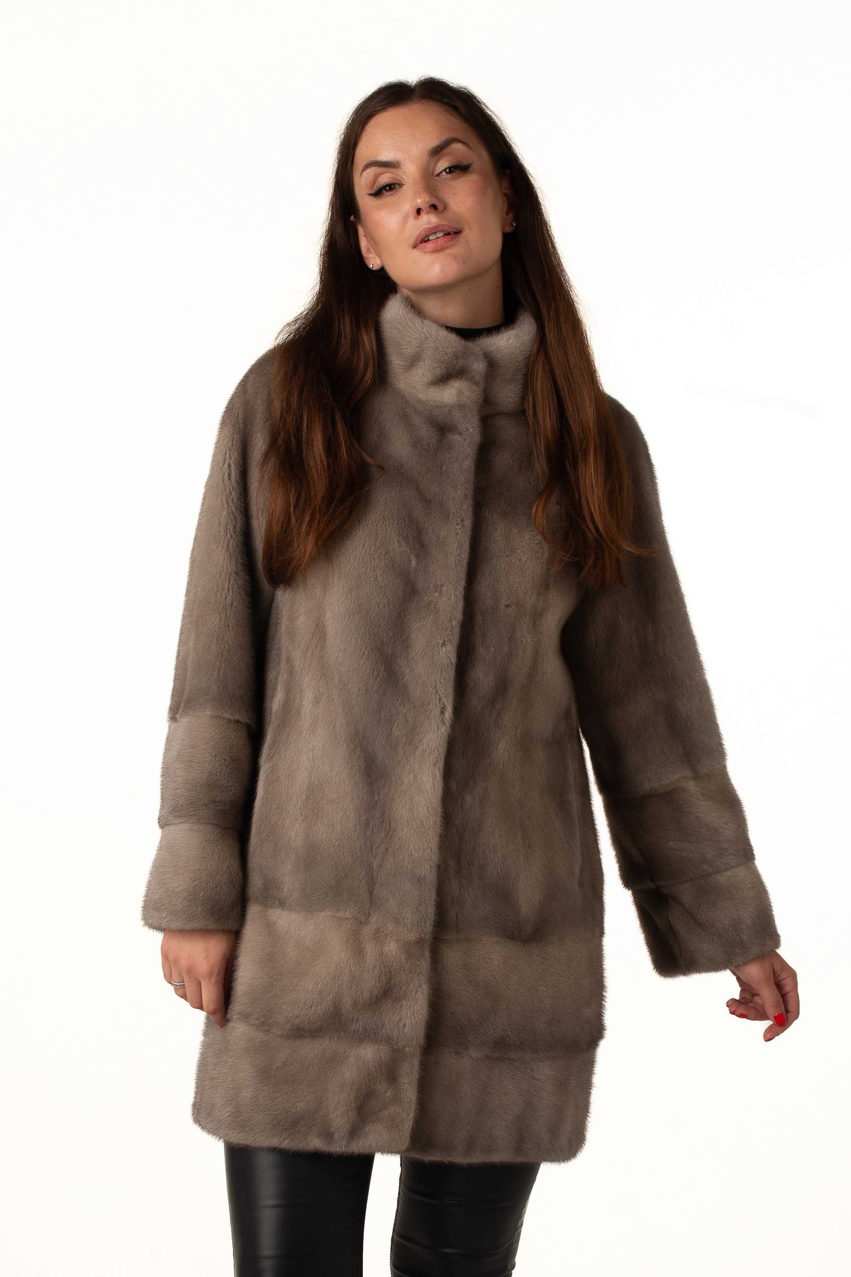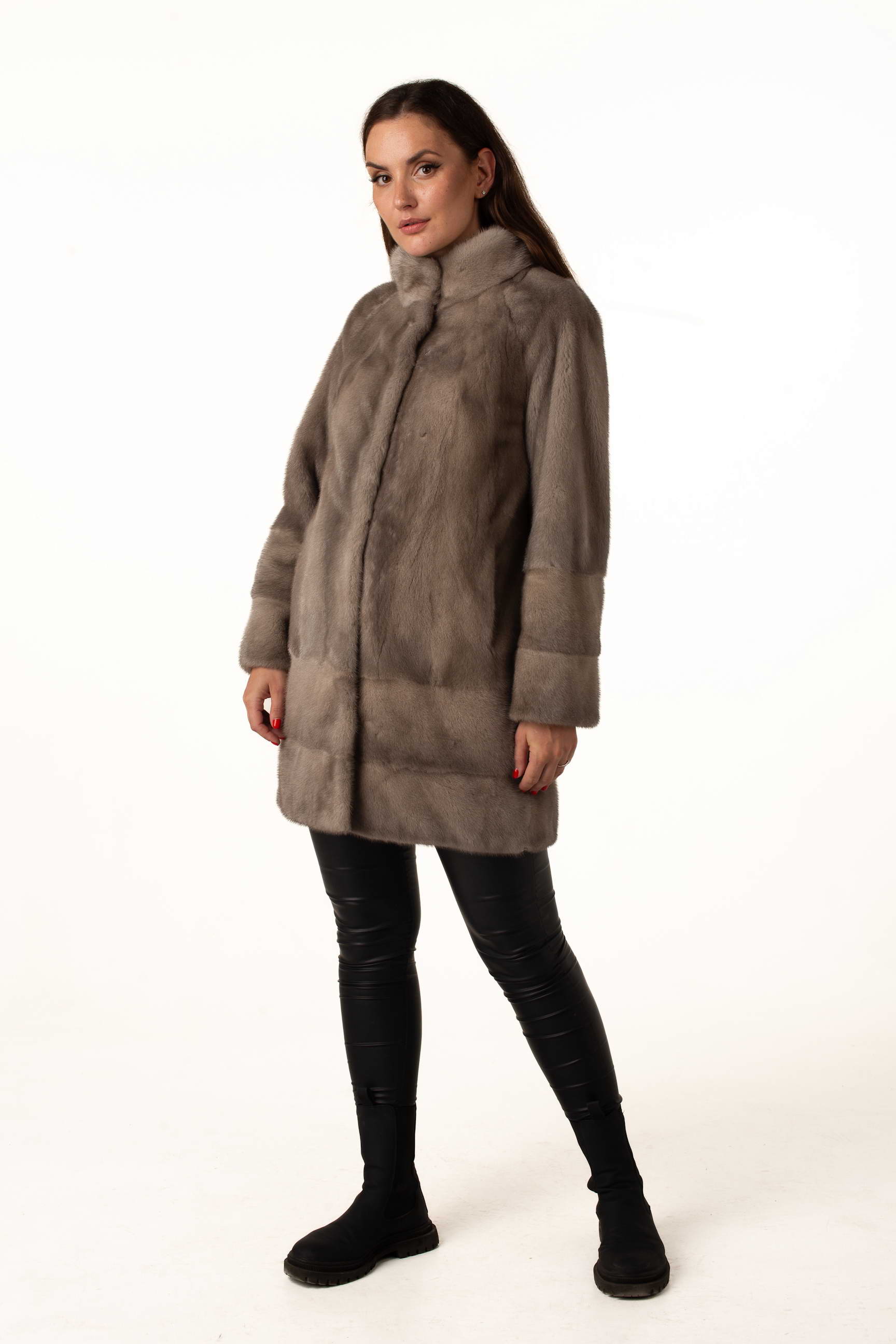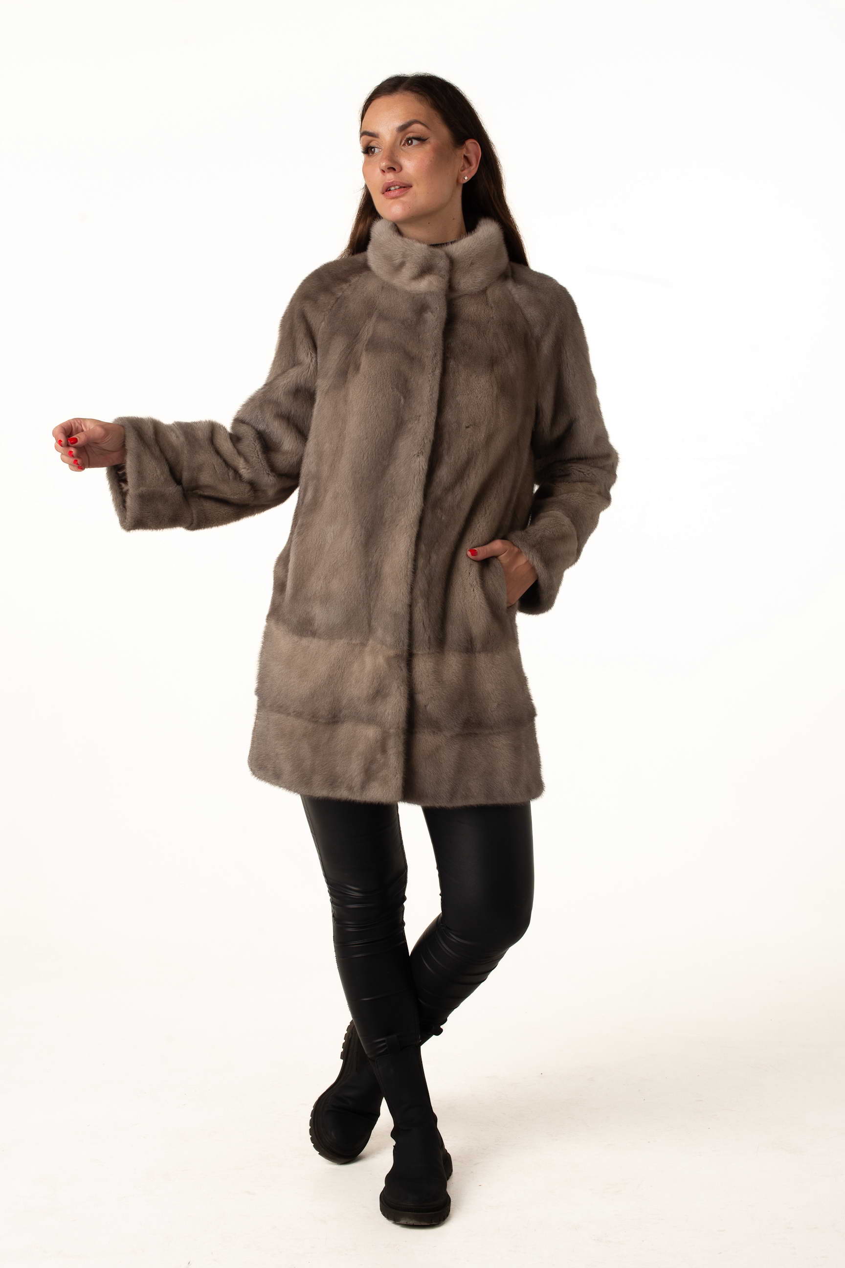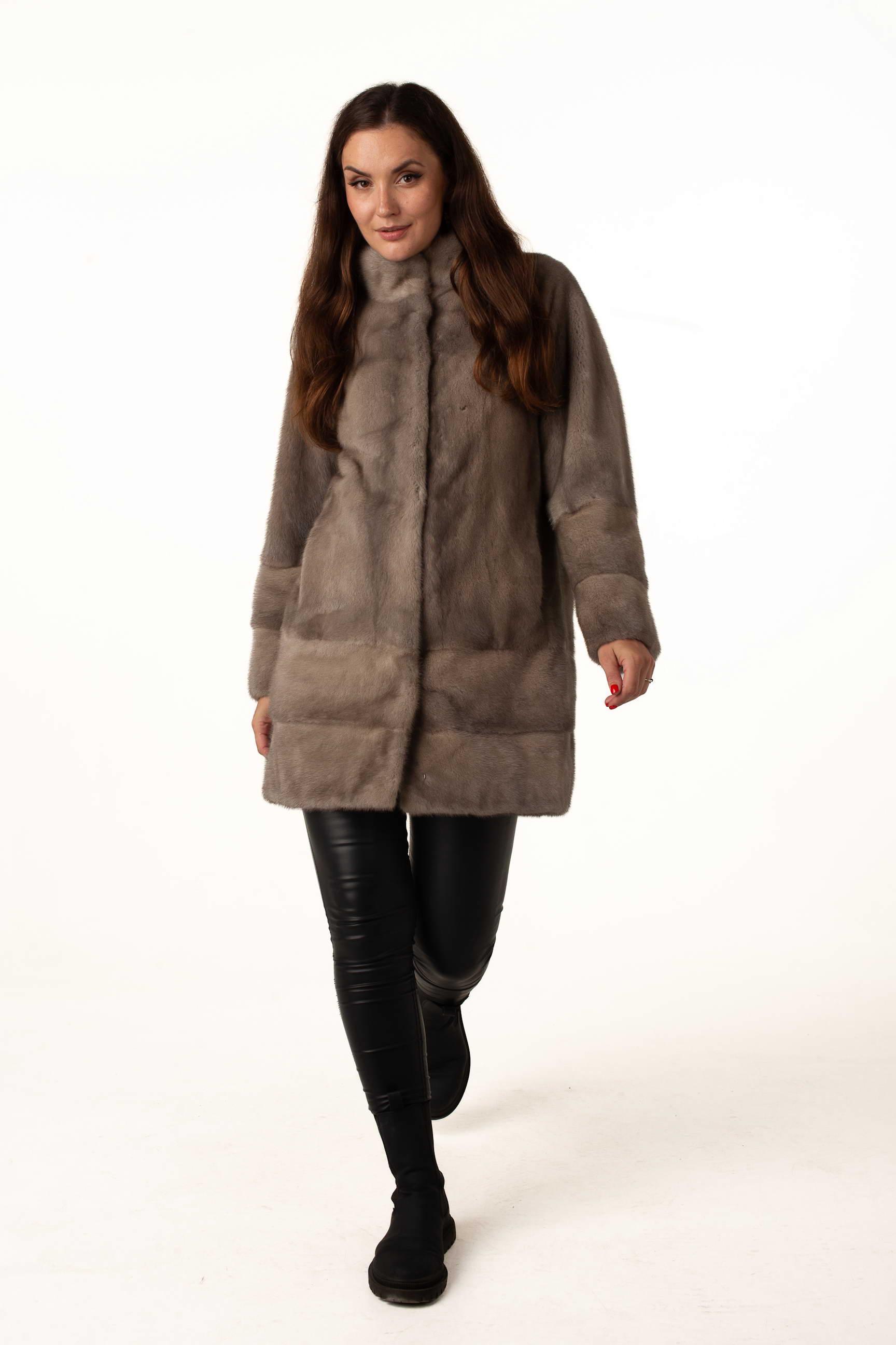 Женская шуба из натурального норкового меха цвета «колотый лед» – элегантная и современная модель для зимнего сезона. Рукав реглан и отстегивающийся рукав до длины 7/8 обеспечивают свободу движений и вариативность ношения, а воротник-стойка защищает от ветра и холода.