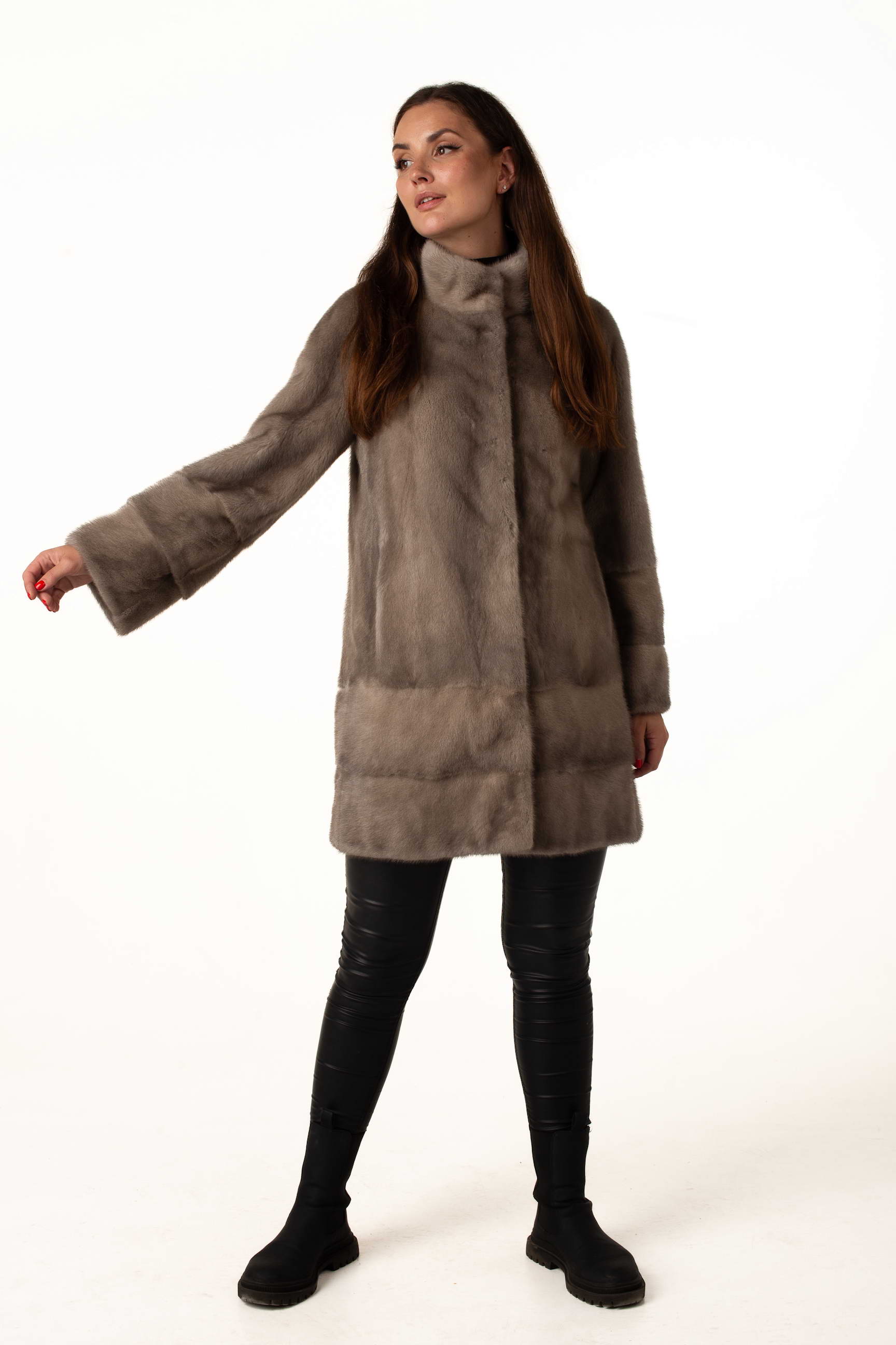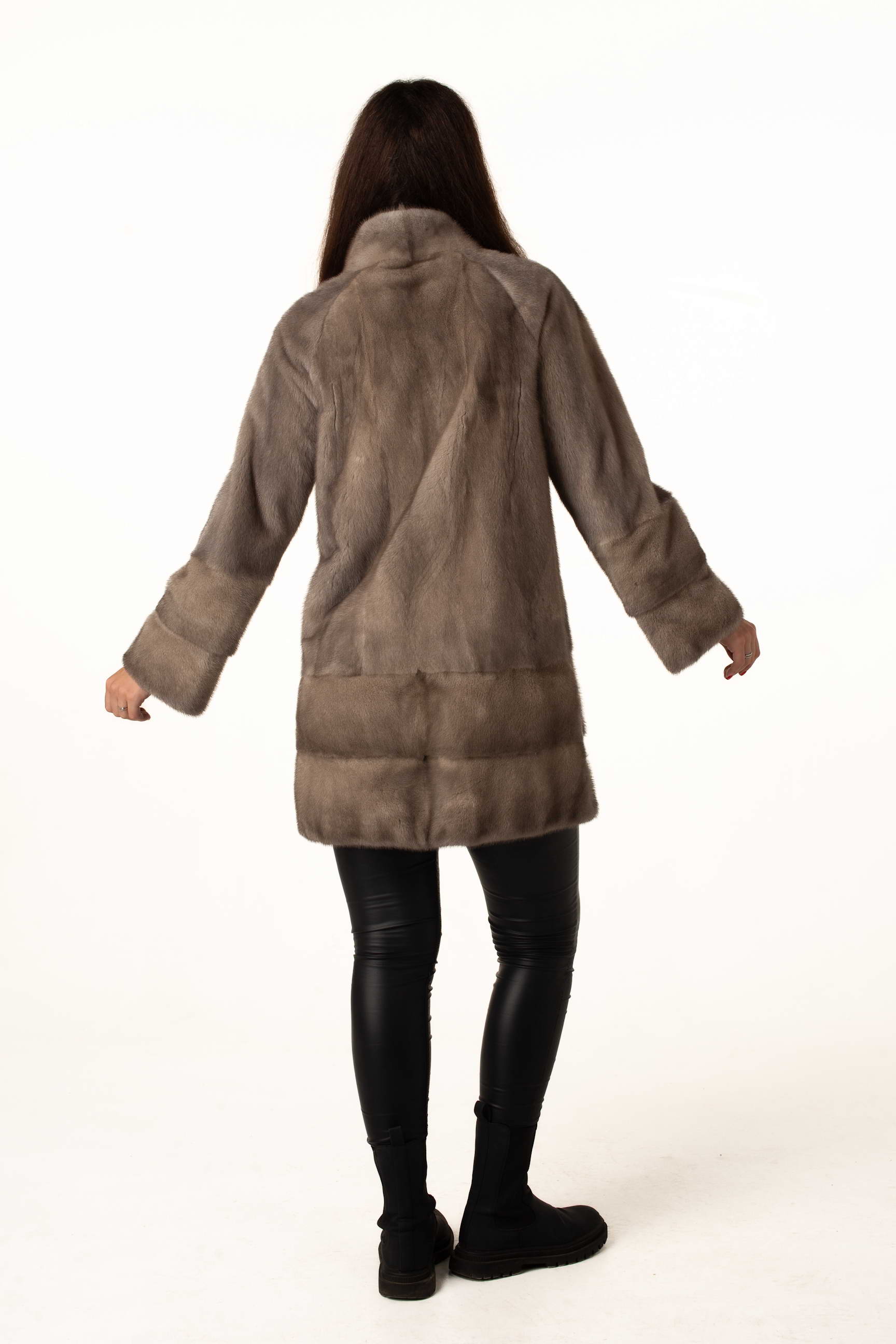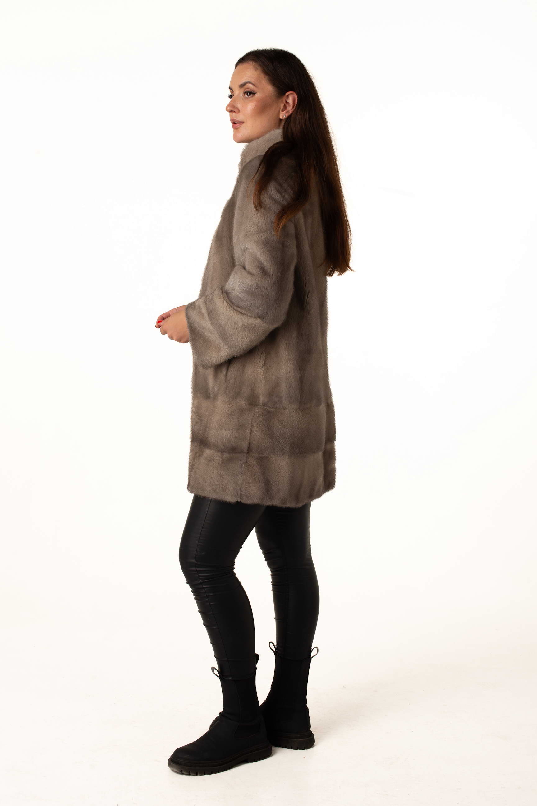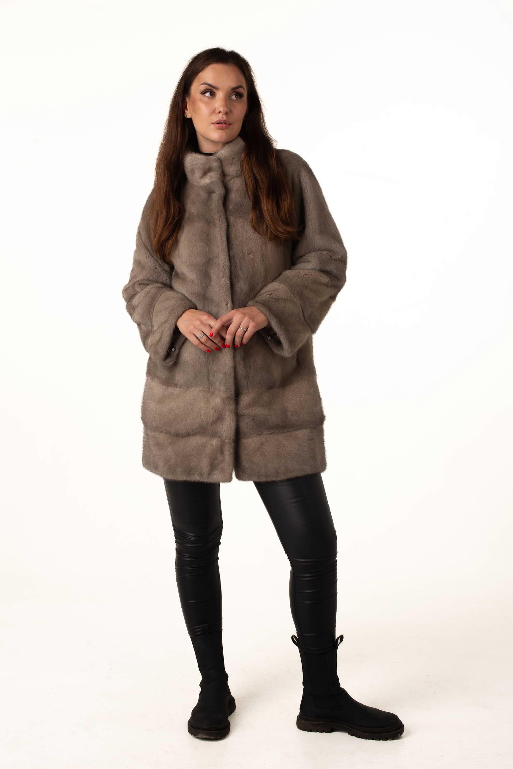 Женская шуба из натурального норкового меха цвета «колотый лед» – элегантная и современная модель для зимнего сезона. Рукав реглан и отстегивающийся рукав до длины 7/8 обеспечивают свободу движений и вариативность ношения, а воротник-стойка защищает от ветра и холода.