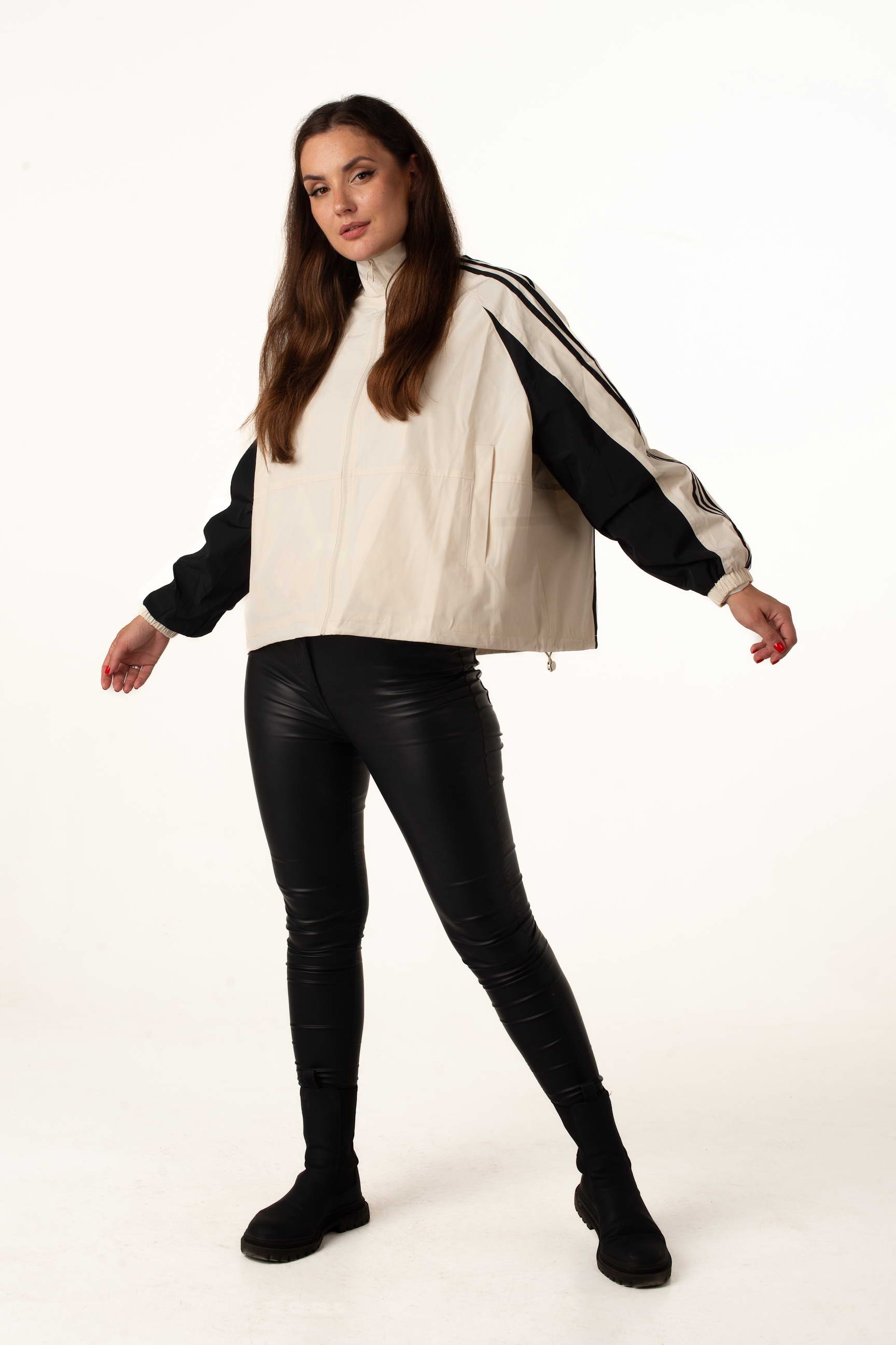 Женская легкая ветровка для весны и осени в классическом бело-черном цвете сочетает практичность и современный стиль. Воротник-стойка защищает от ветра, а кулиска внизу позволяет регулировать посадку, подчеркивая силуэт.