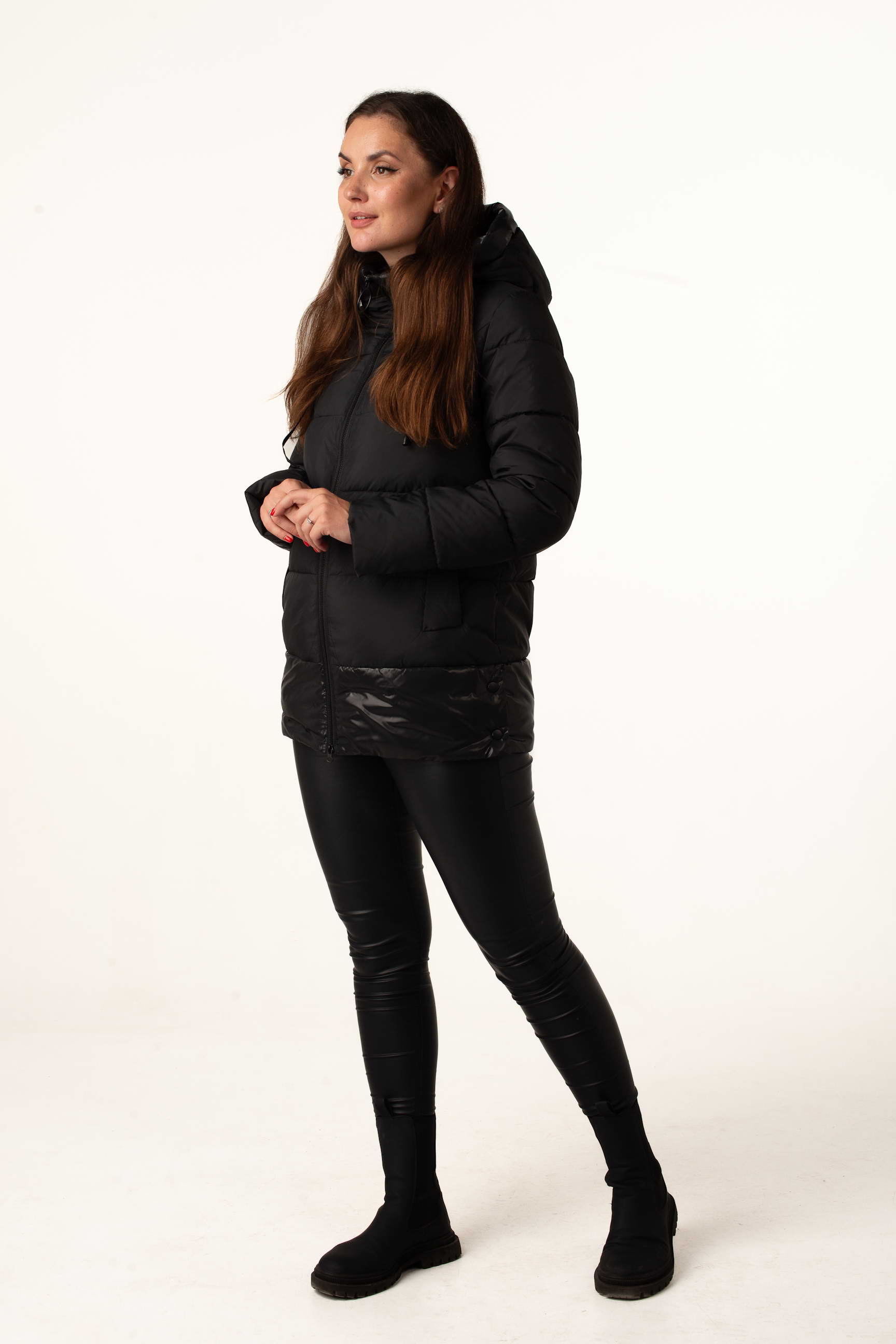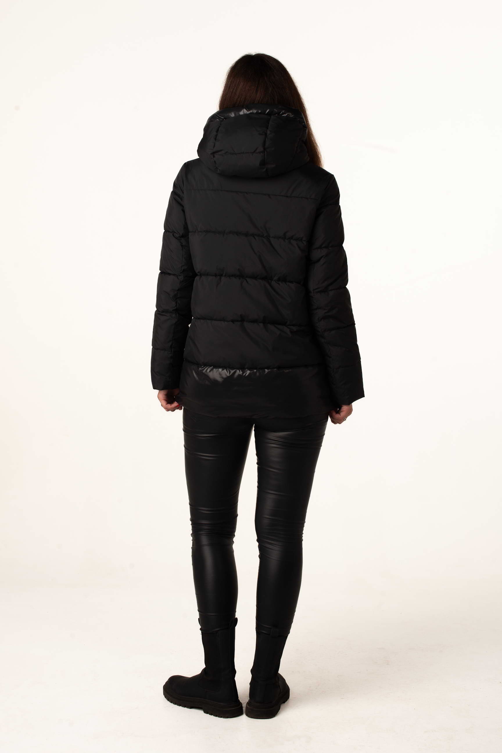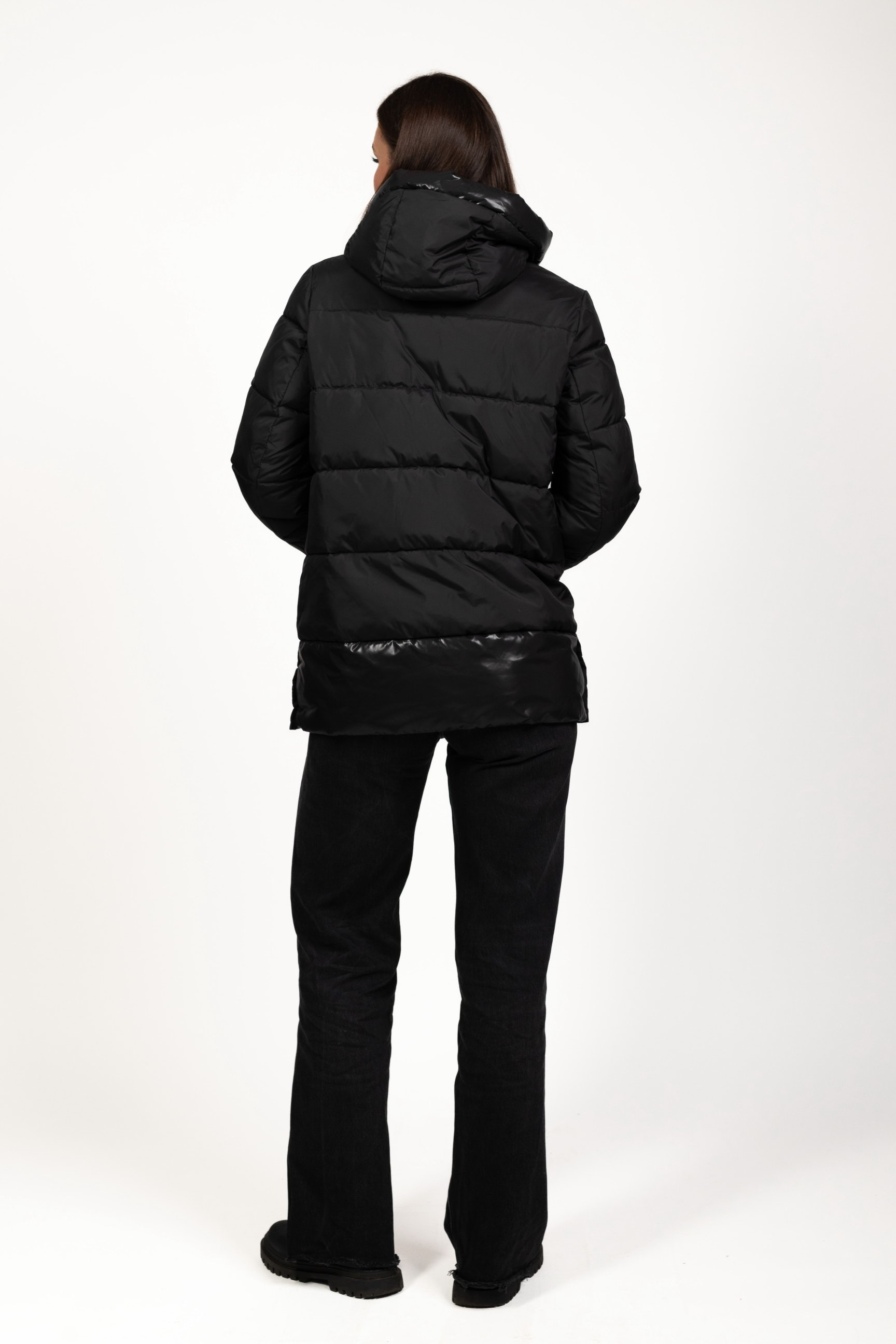 Чёрный женский биопуховик сочетает классический стиль и современные детали. Модель выглядит элегантно и добавляет образу практичности, делая её идеальным выбором для зимних будней.