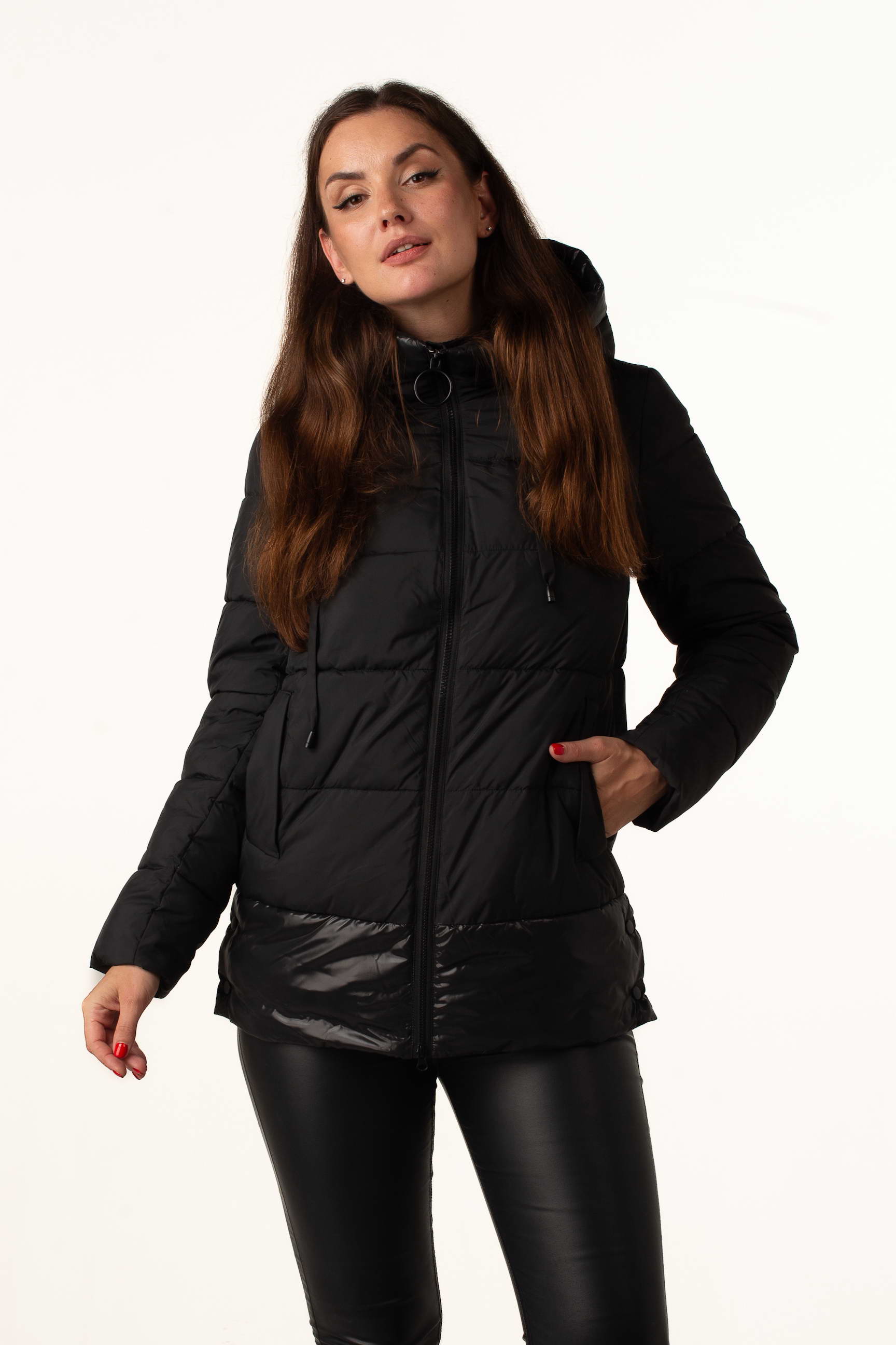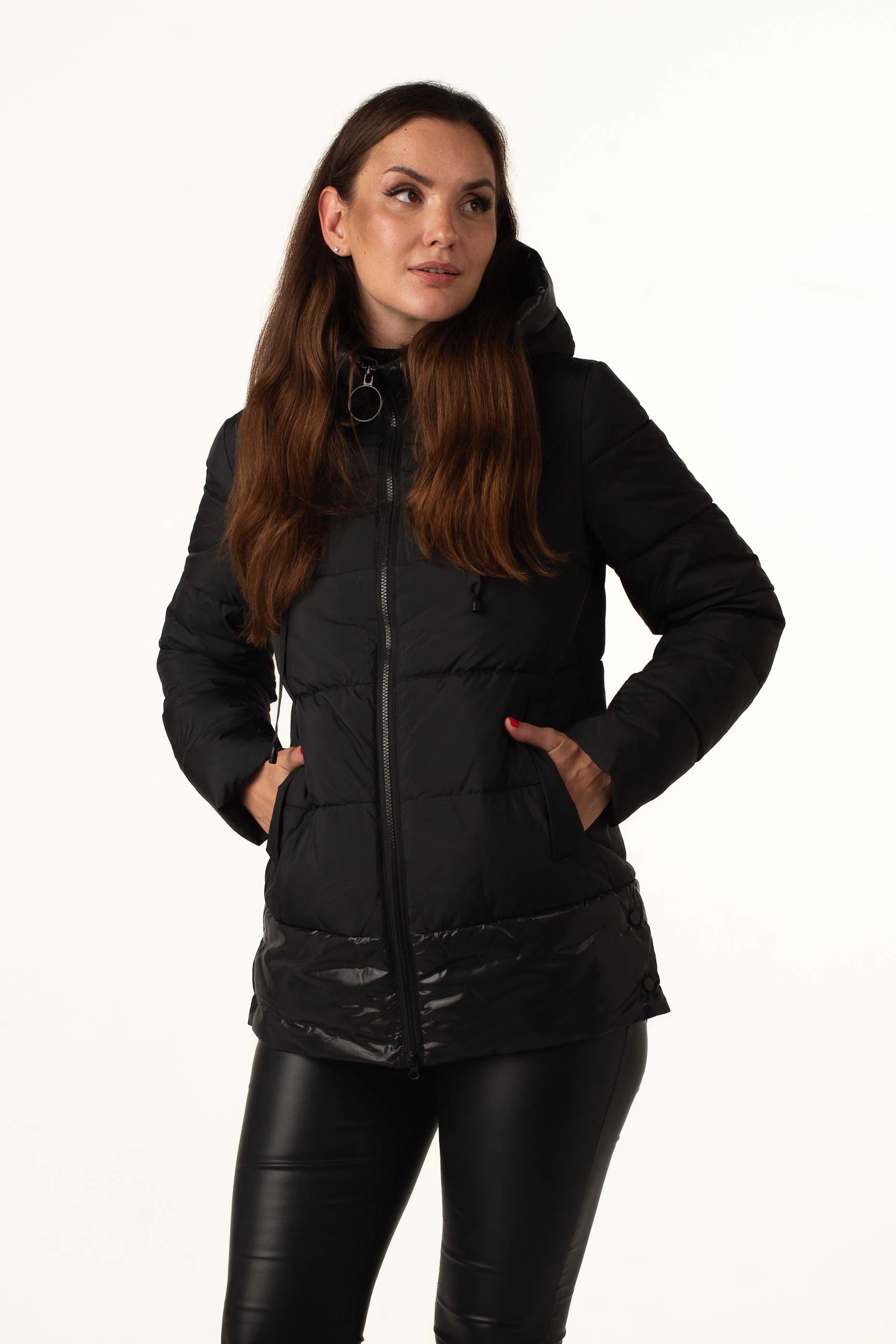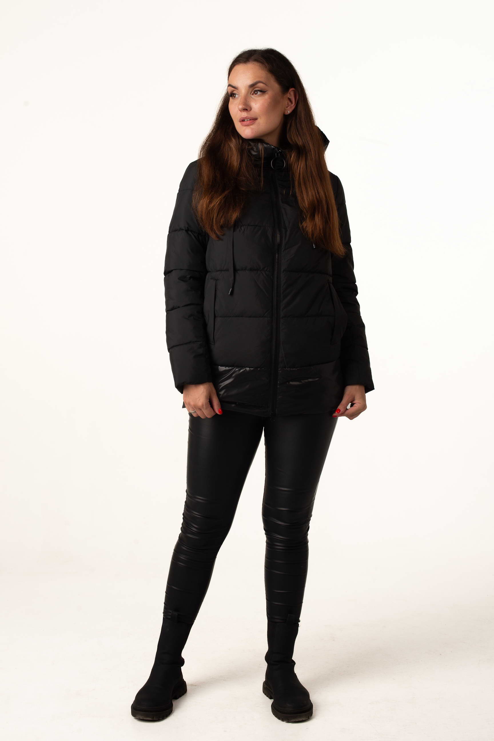 Чёрный женский биопуховик сочетает классический стиль и современные детали. Модель выглядит элегантно и добавляет образу практичности, делая её идеальным выбором для зимних будней.