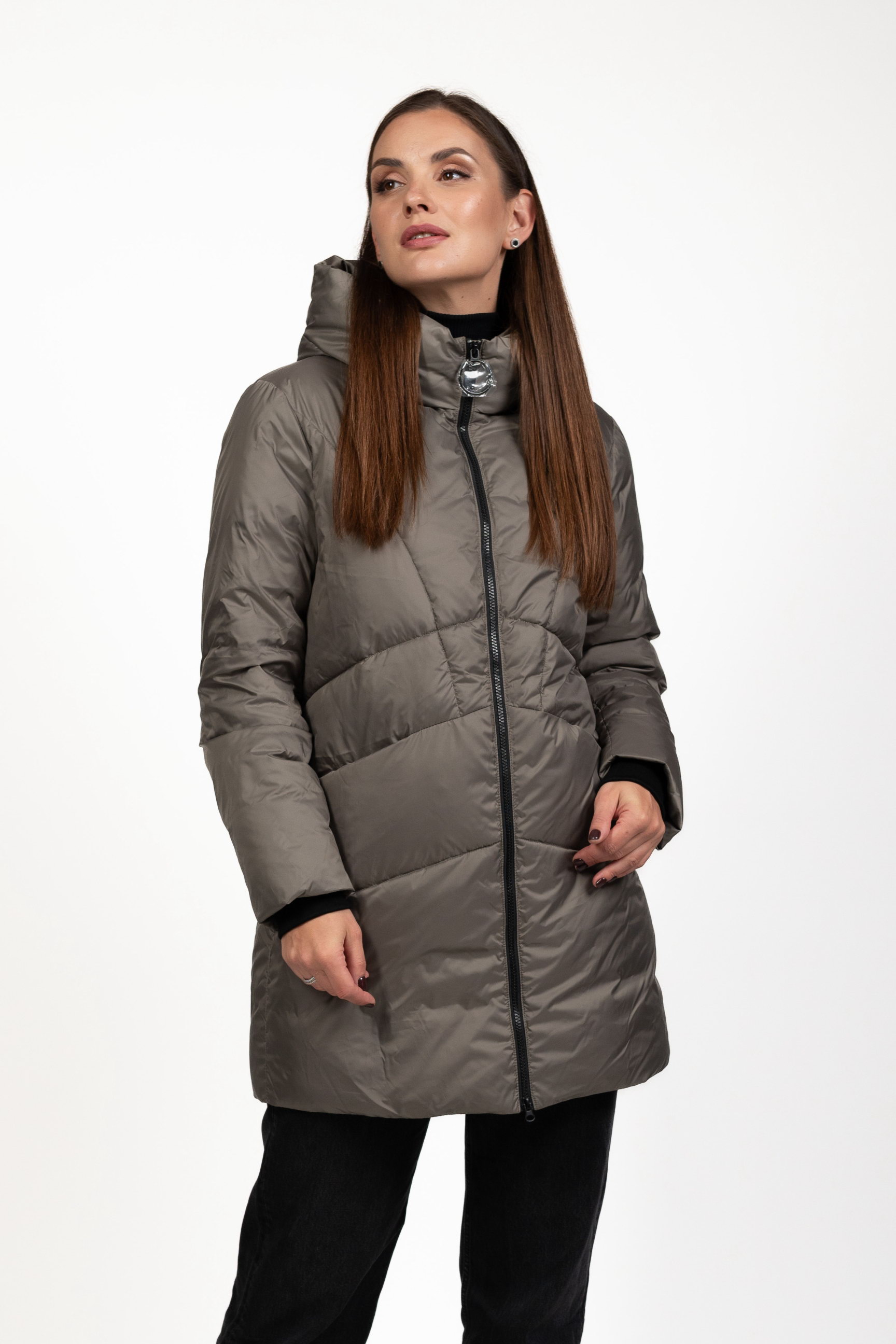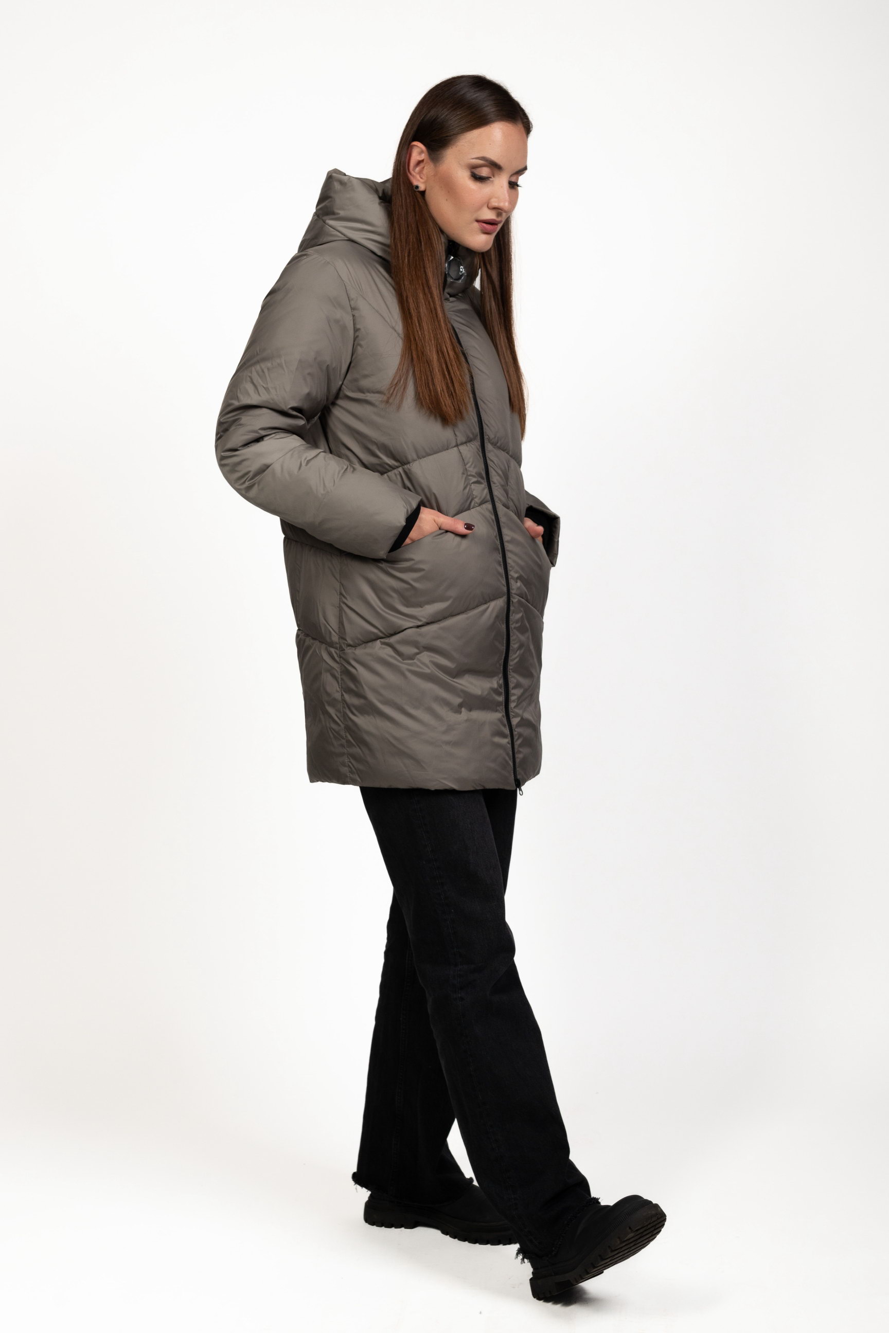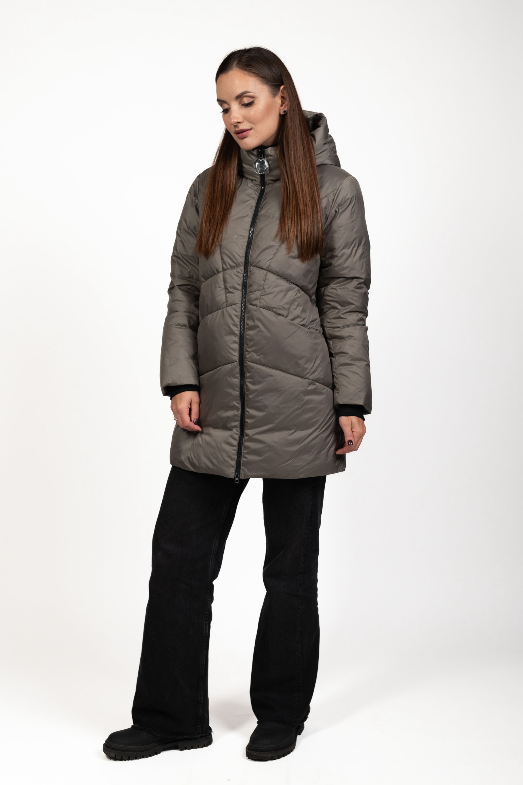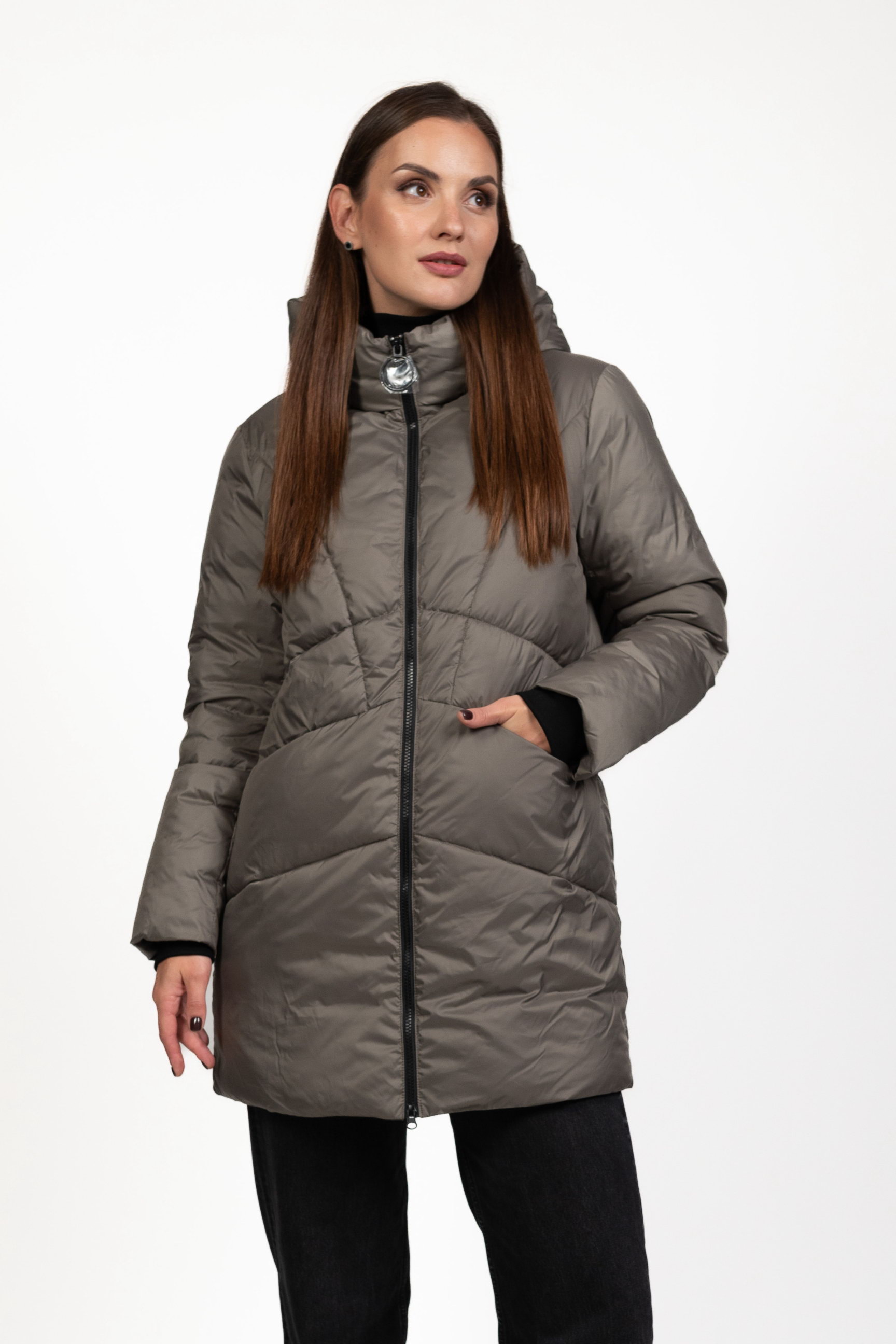 Женский биопуховик серого цвета сочетает стиль и функциональность, обеспечивая тепло и комфорт в холодное время года.