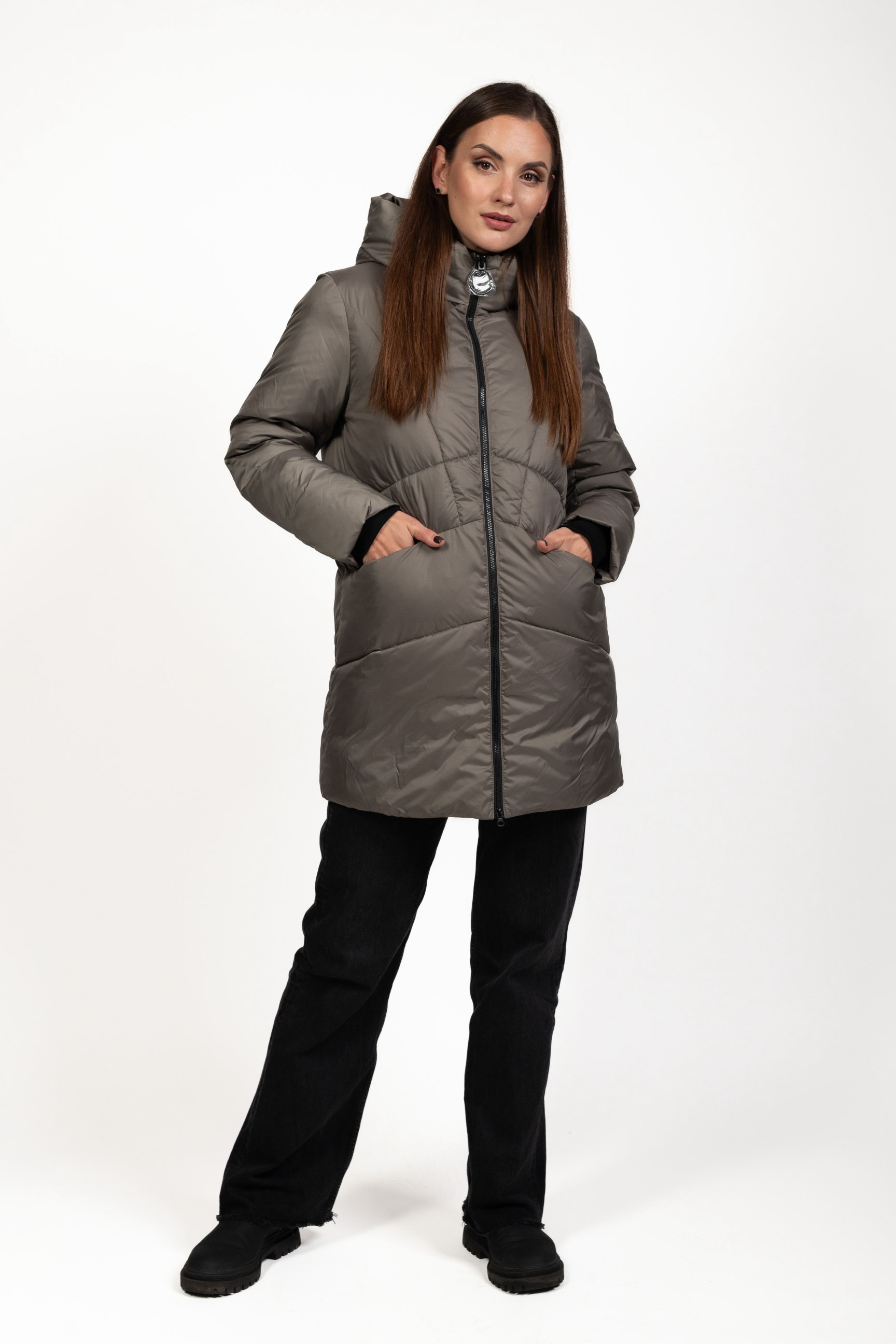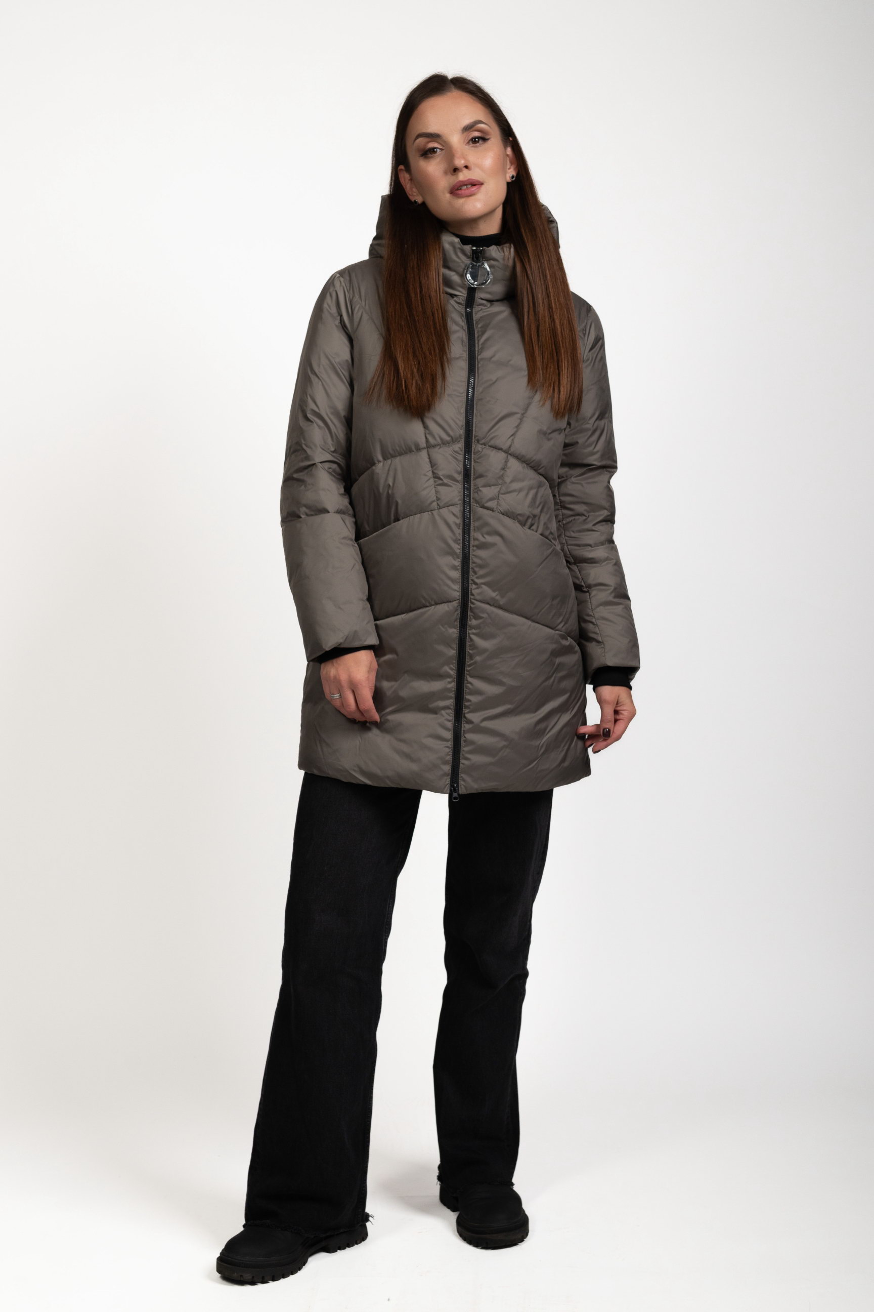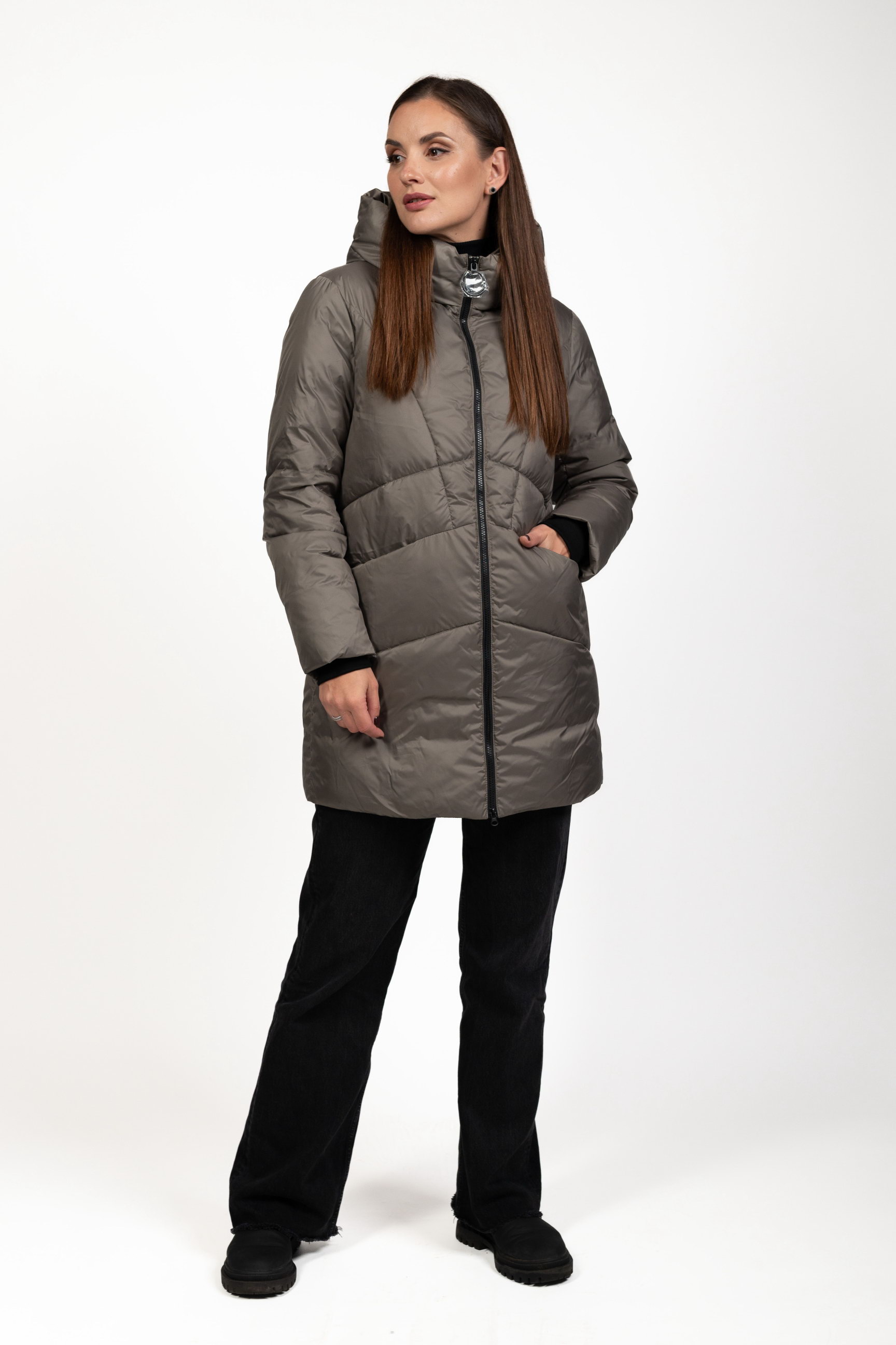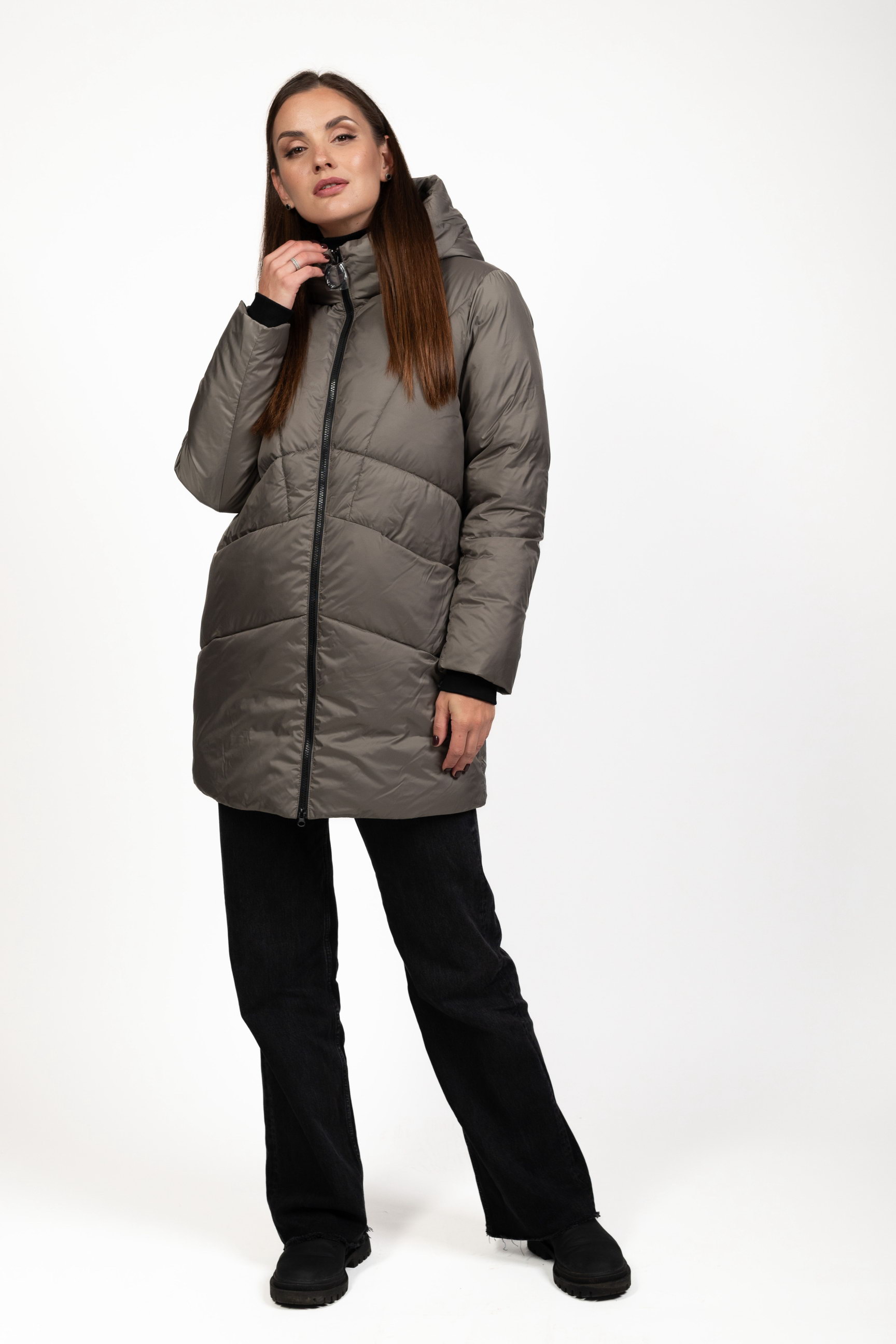 Женский биопуховик серого цвета сочетает стиль и функциональность, обеспечивая тепло и комфорт в холодное время года.