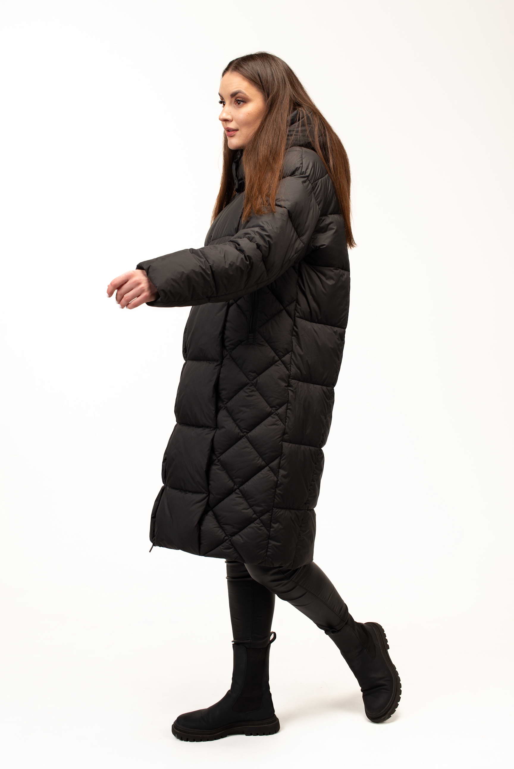 Горизонтальная стежка по всей длине куртки подчеркивает ее классический силуэт и способствует равномерному распределению утеплителя. Боковые вставки с ромбовидной стежкой добавляют оригинальный акцент и визуально разнообразят дизайн, делая модель более современной и стильной.