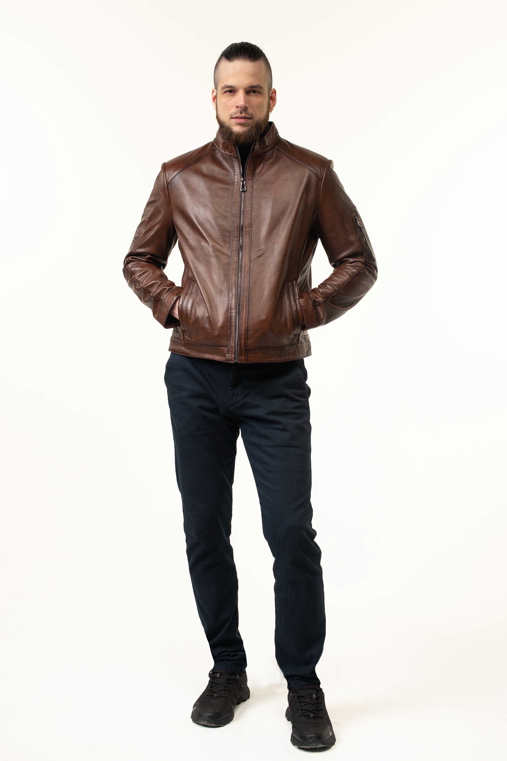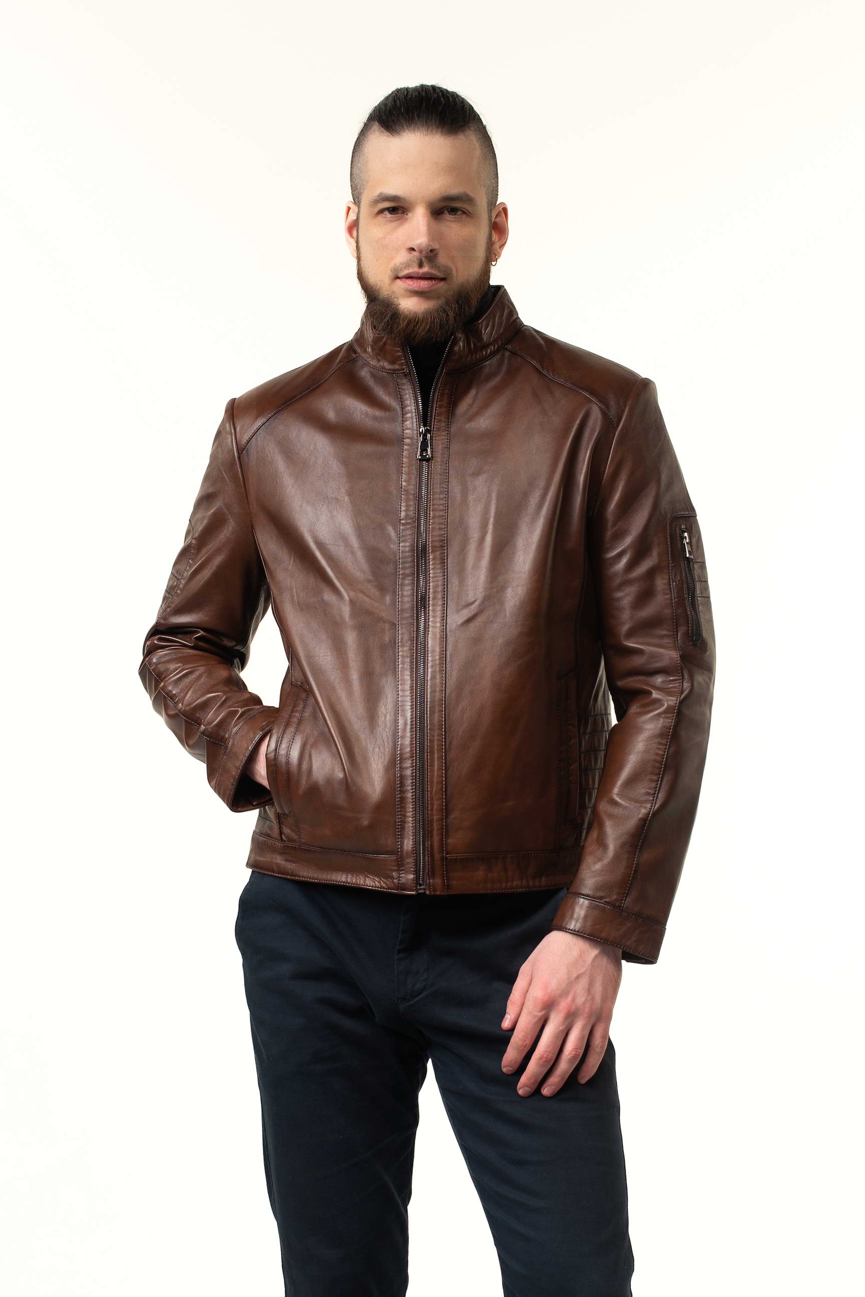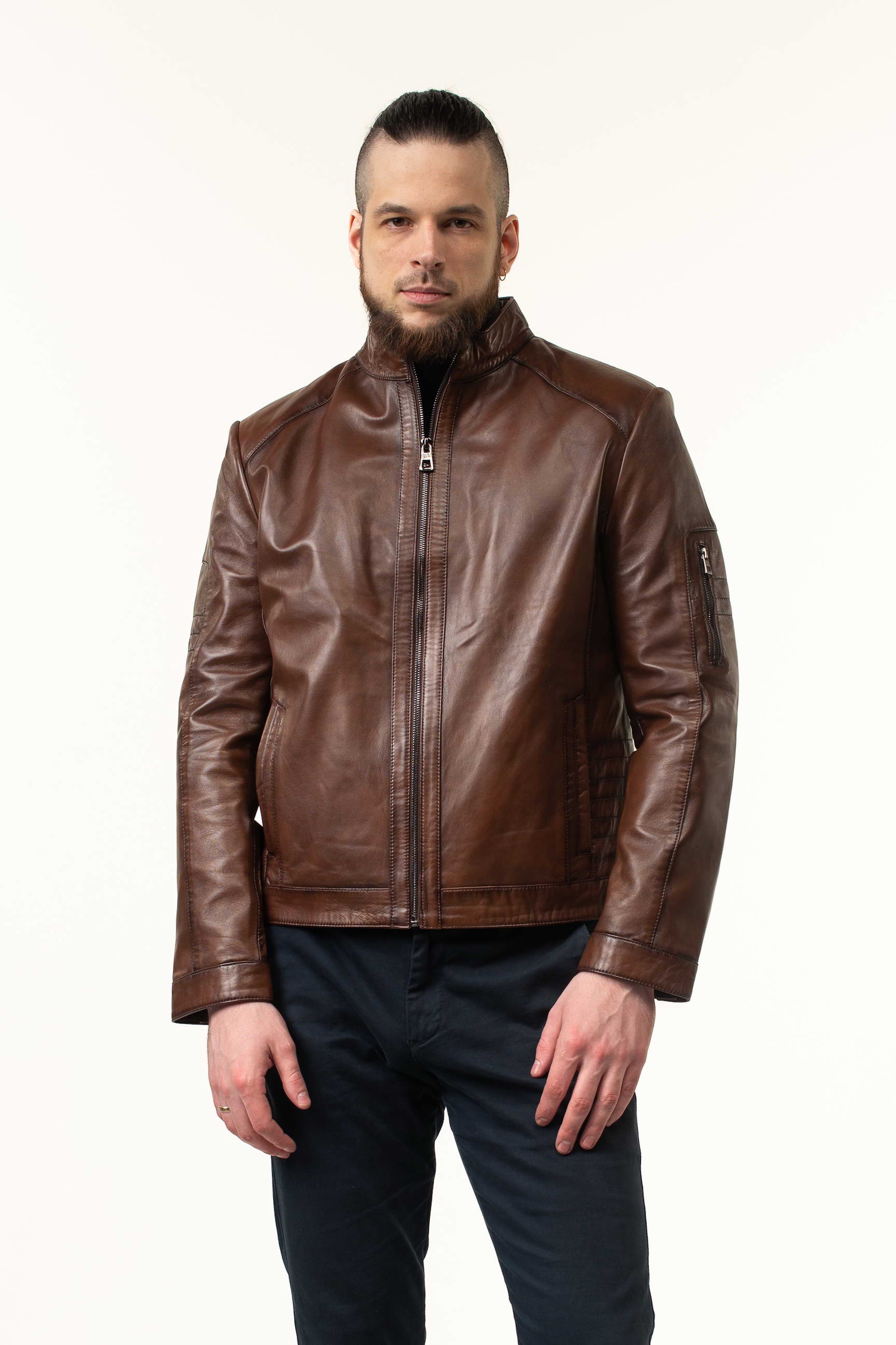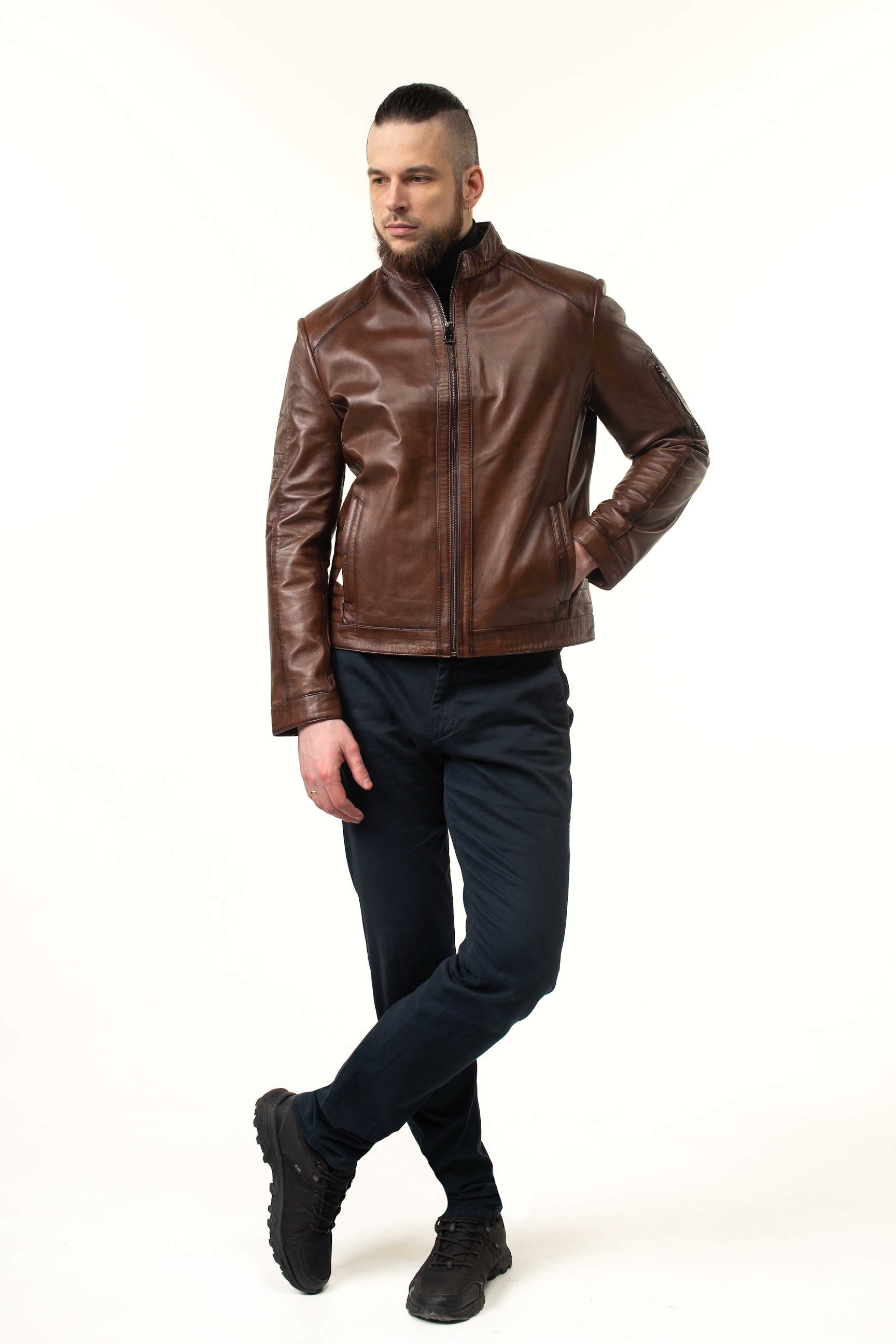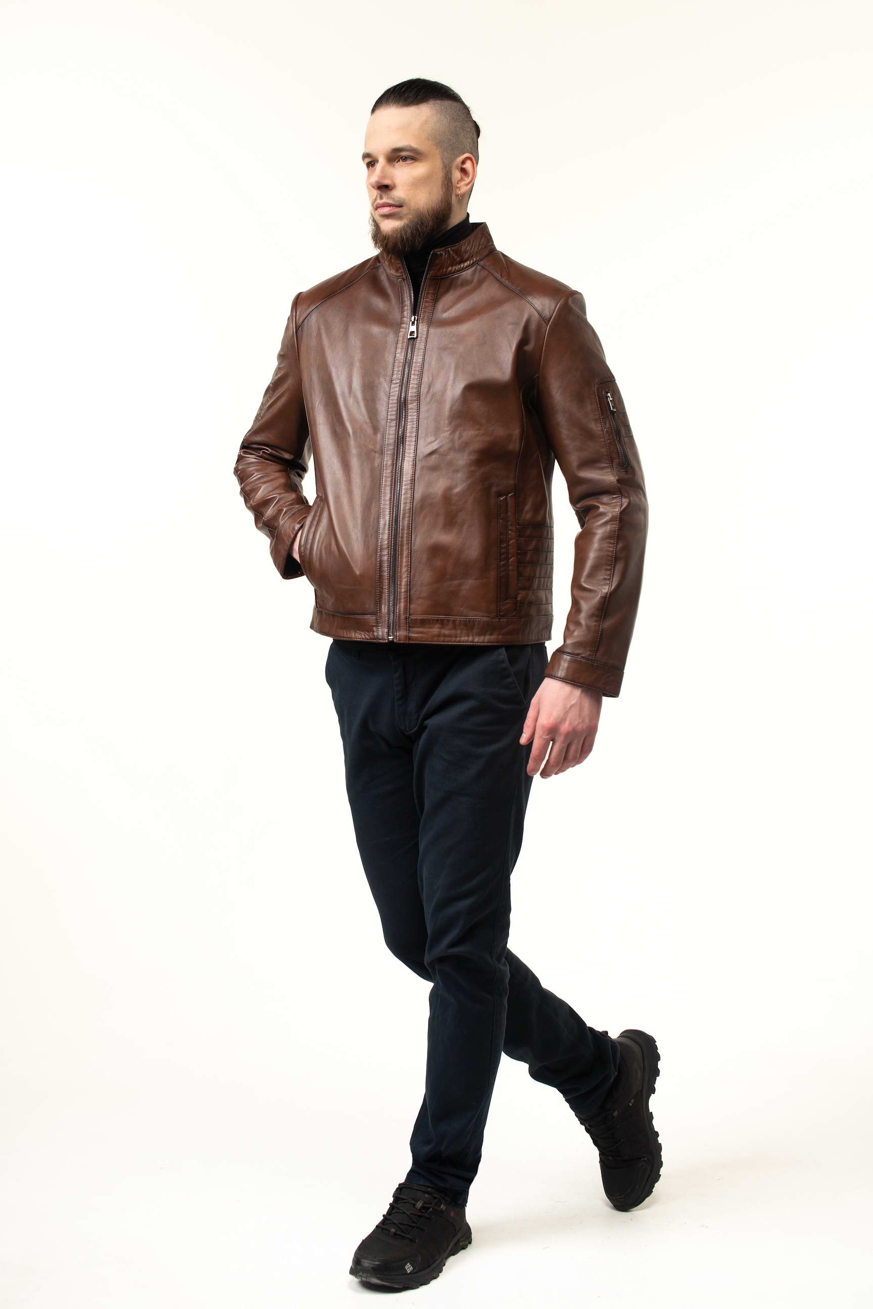 Стильна чоловіча шкіряна куртка для весни та осені — поєднання преміальної якості, сучасного дизайну та практичності. Модель виконана з натуральної телячої шкіри, а теплий коричневий відтінок робить її універсальною для повсякденного та ділового гардеробу.