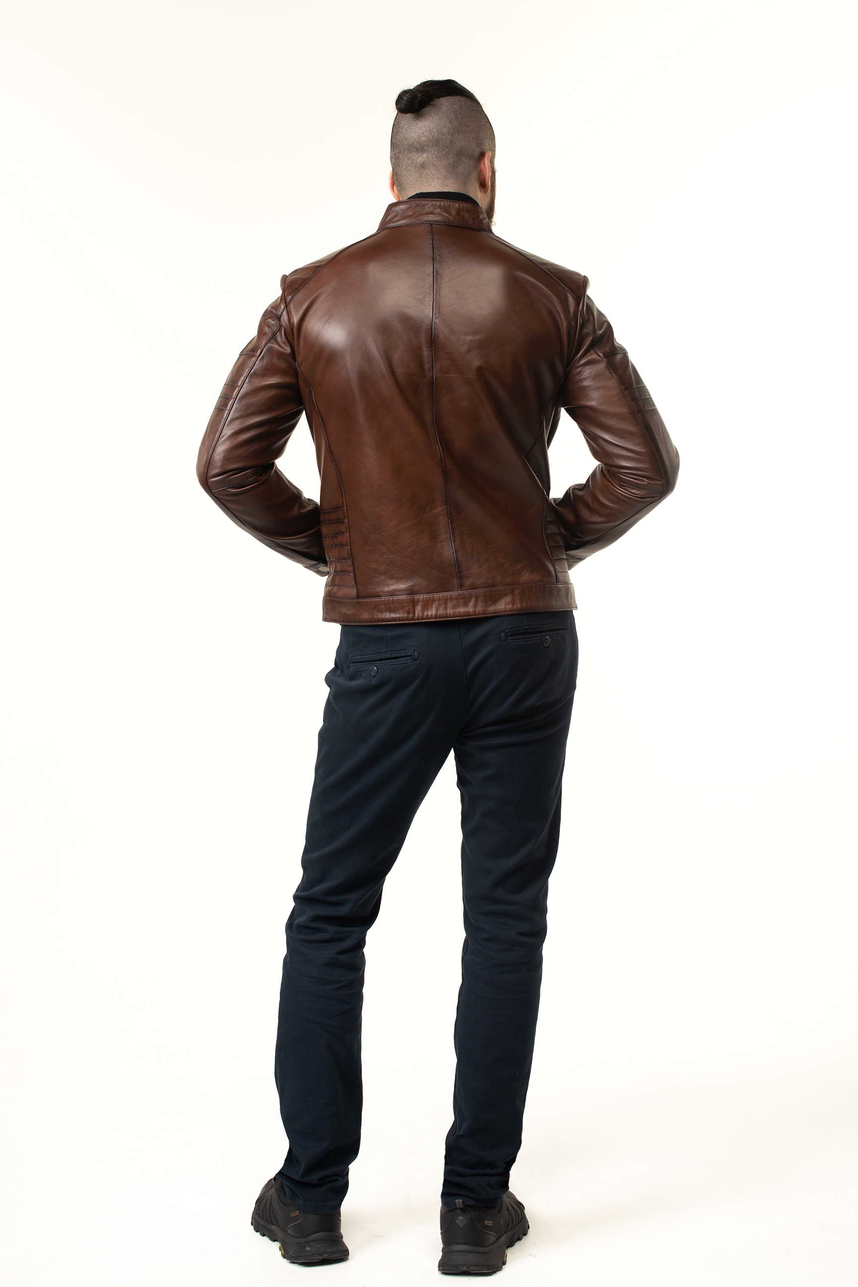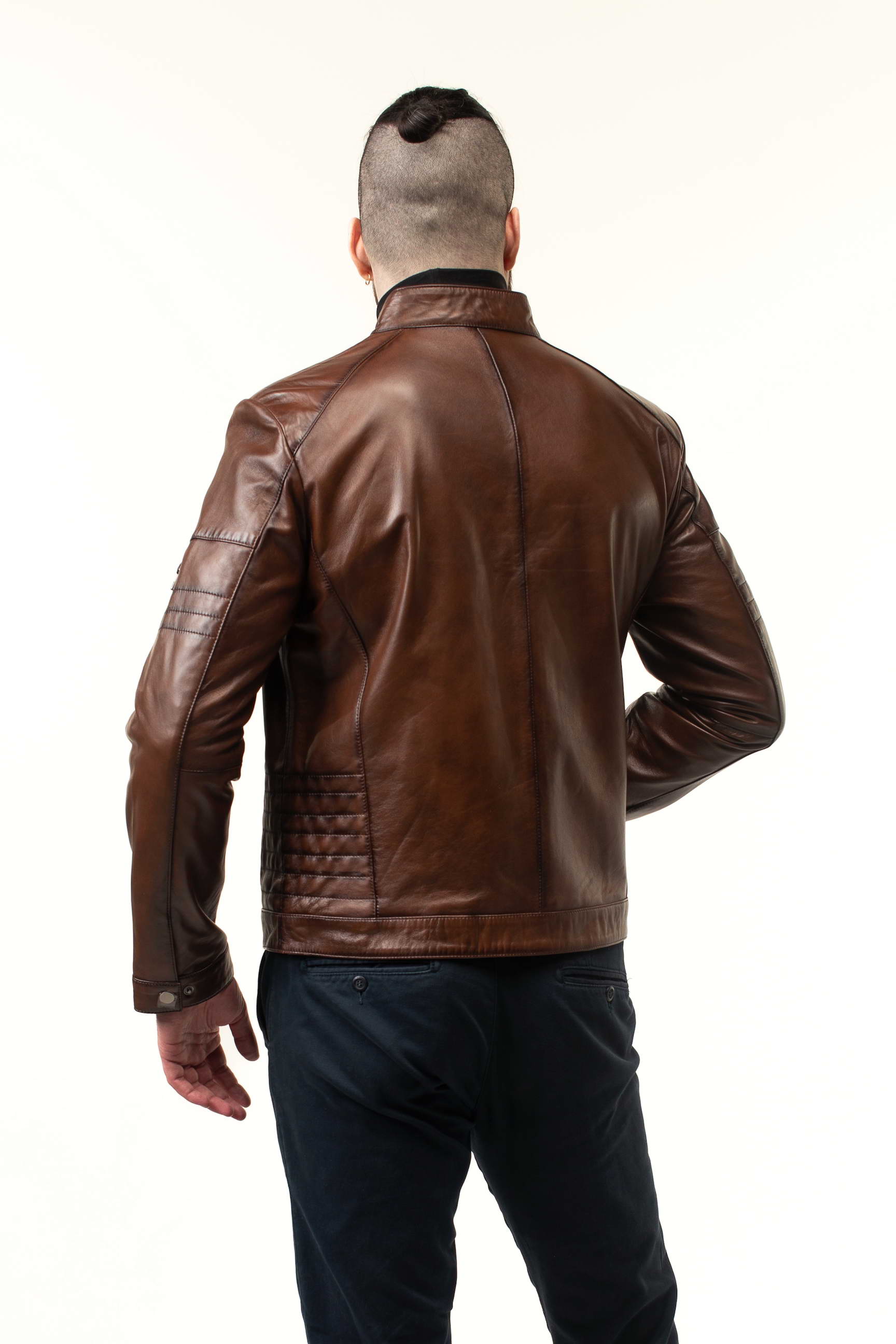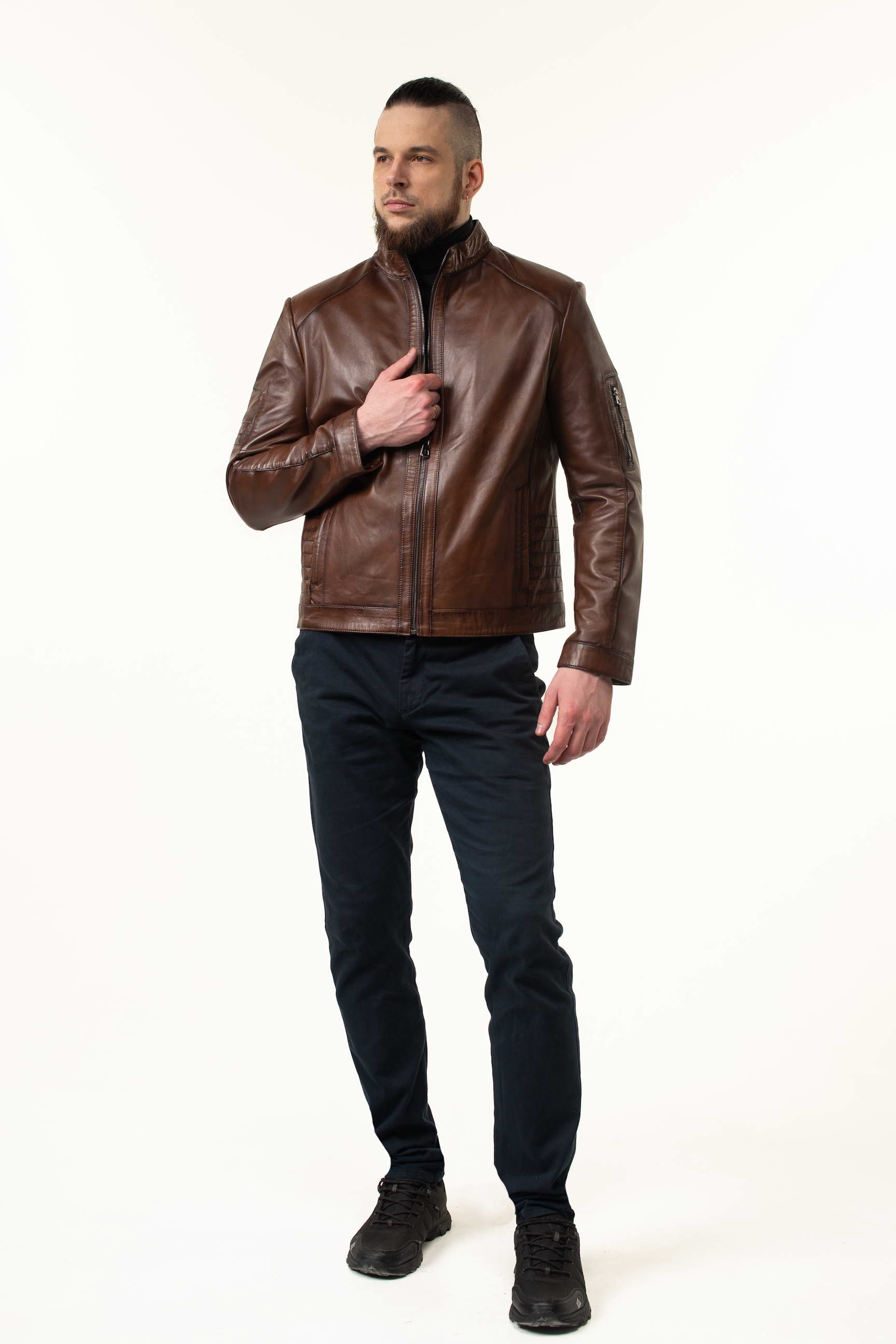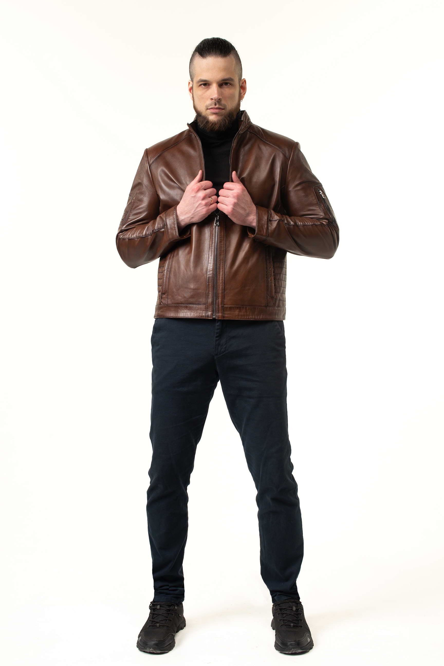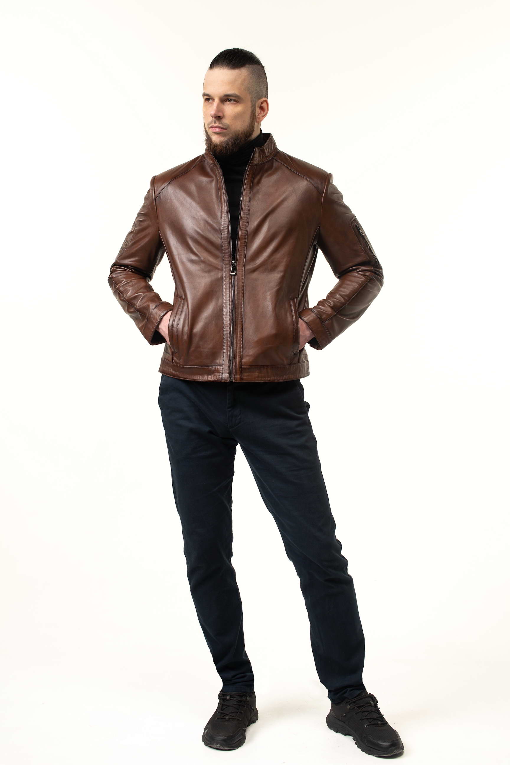 Стильна чоловіча шкіряна куртка для весни та осені — поєднання преміальної якості, сучасного дизайну та практичності. Модель виконана з натуральної телячої шкіри, а теплий коричневий відтінок робить її універсальною для повсякденного та ділового гардеробу.