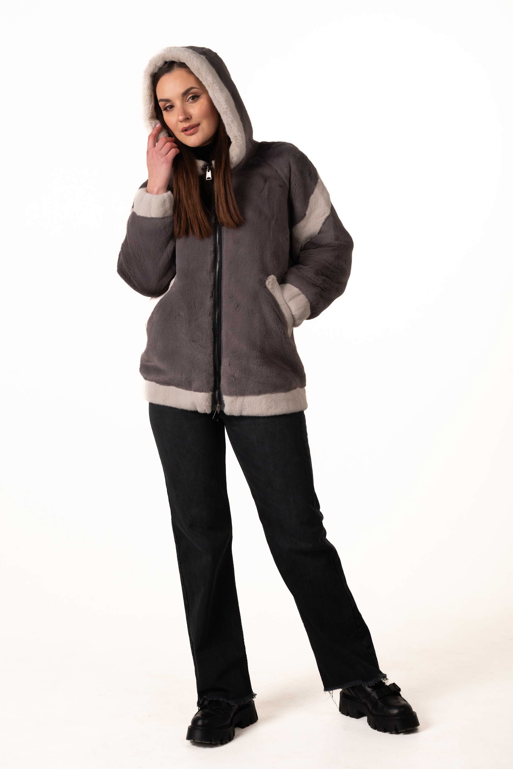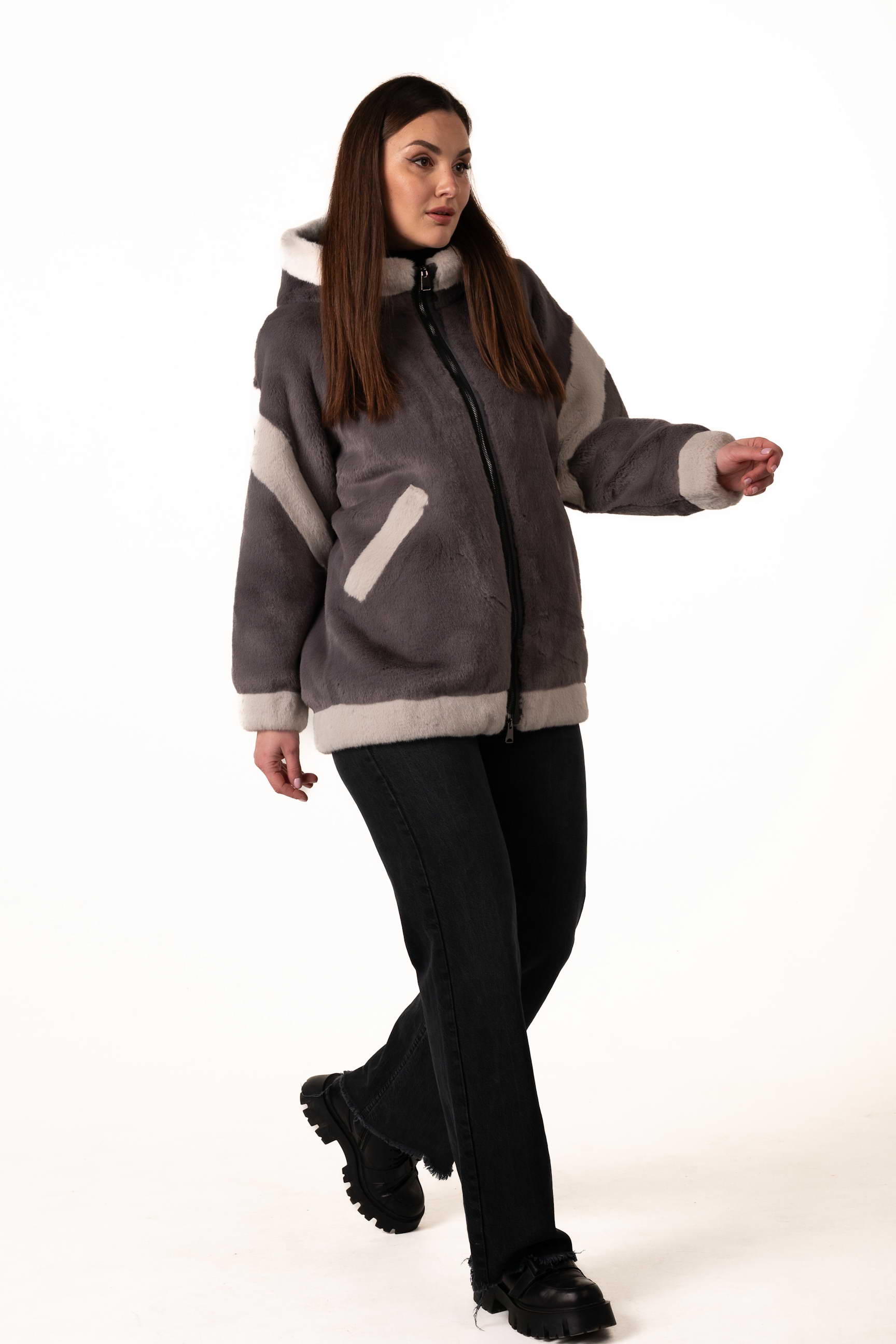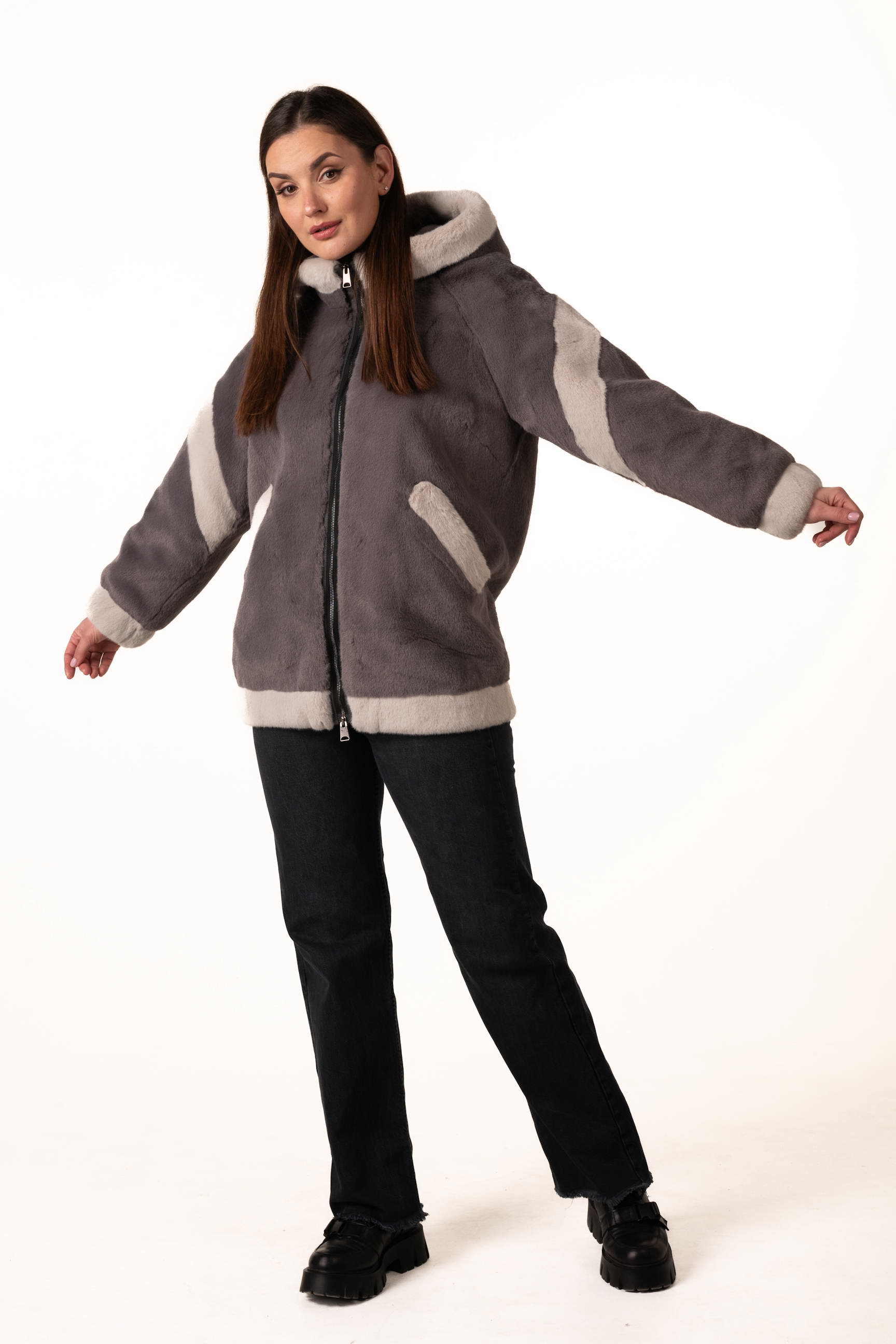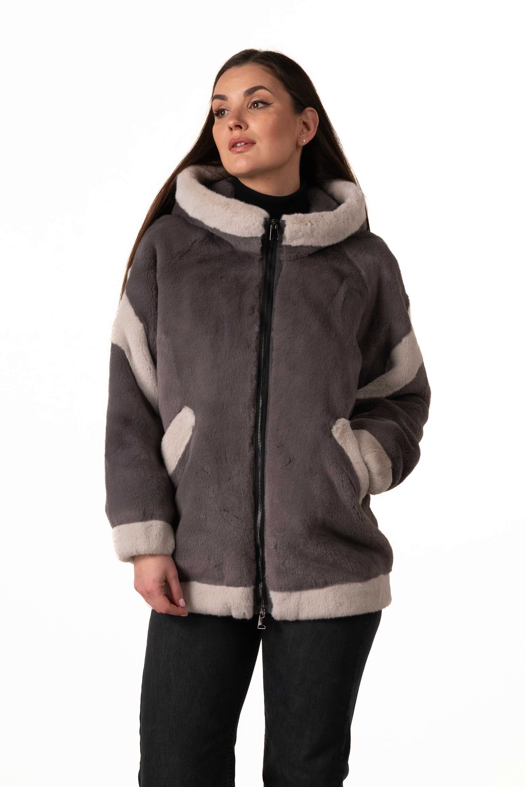 Сучасна жіноча шуба зі штучного хутра поєднує елегантність, комфорт і практичність для зимового гардеробу. Модель виготовлена з якісного екохутра, яке м’яке на дотик, довговічне та добре зберігає тепло, а також не вимагає складного догляду. Сірий колір додає виробу стриманості та універсальності, а декоративні вставки зі світлого екохутра створюють стильний контраст і додають образу легкого шарму та індивідуальності.