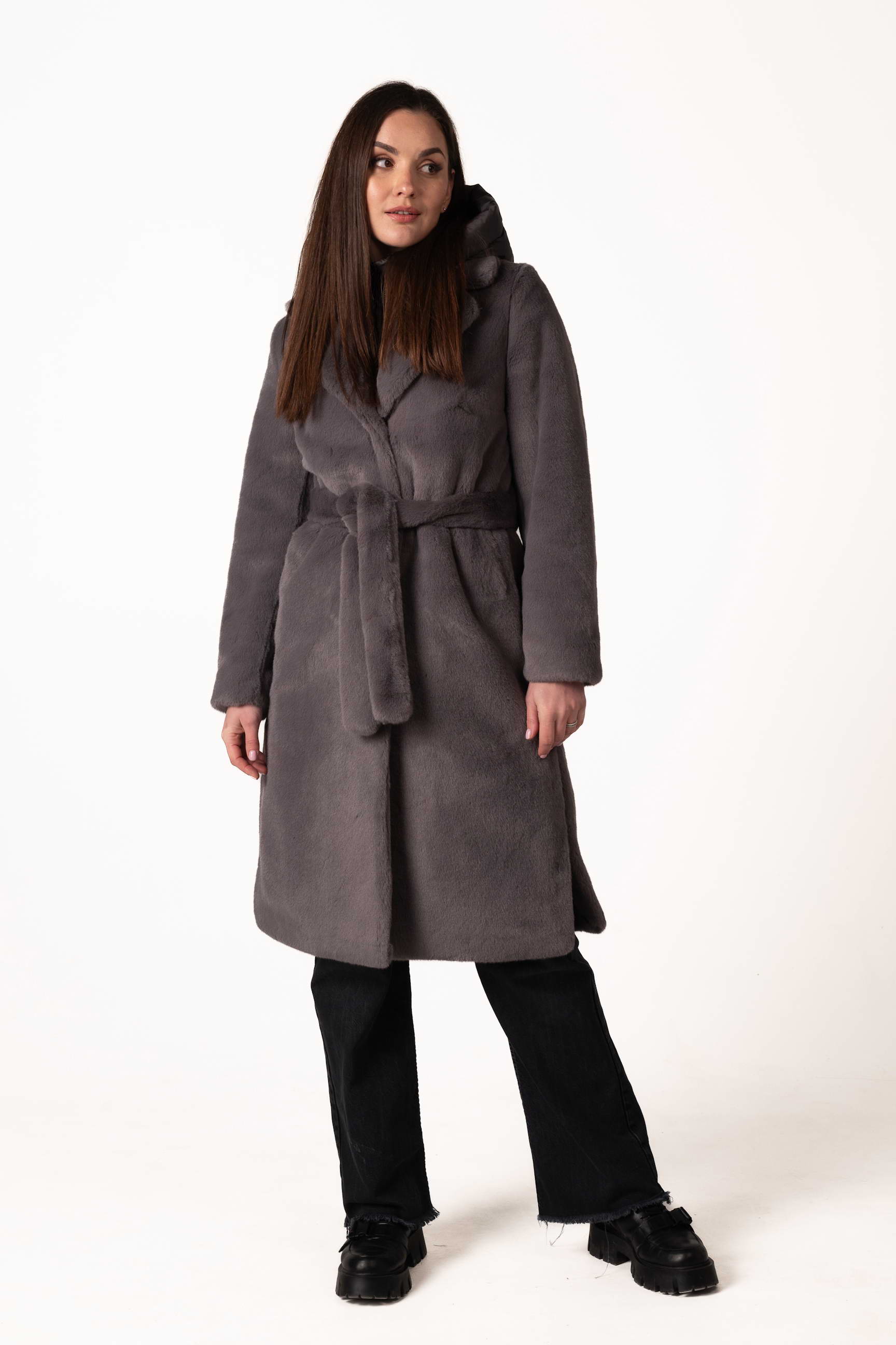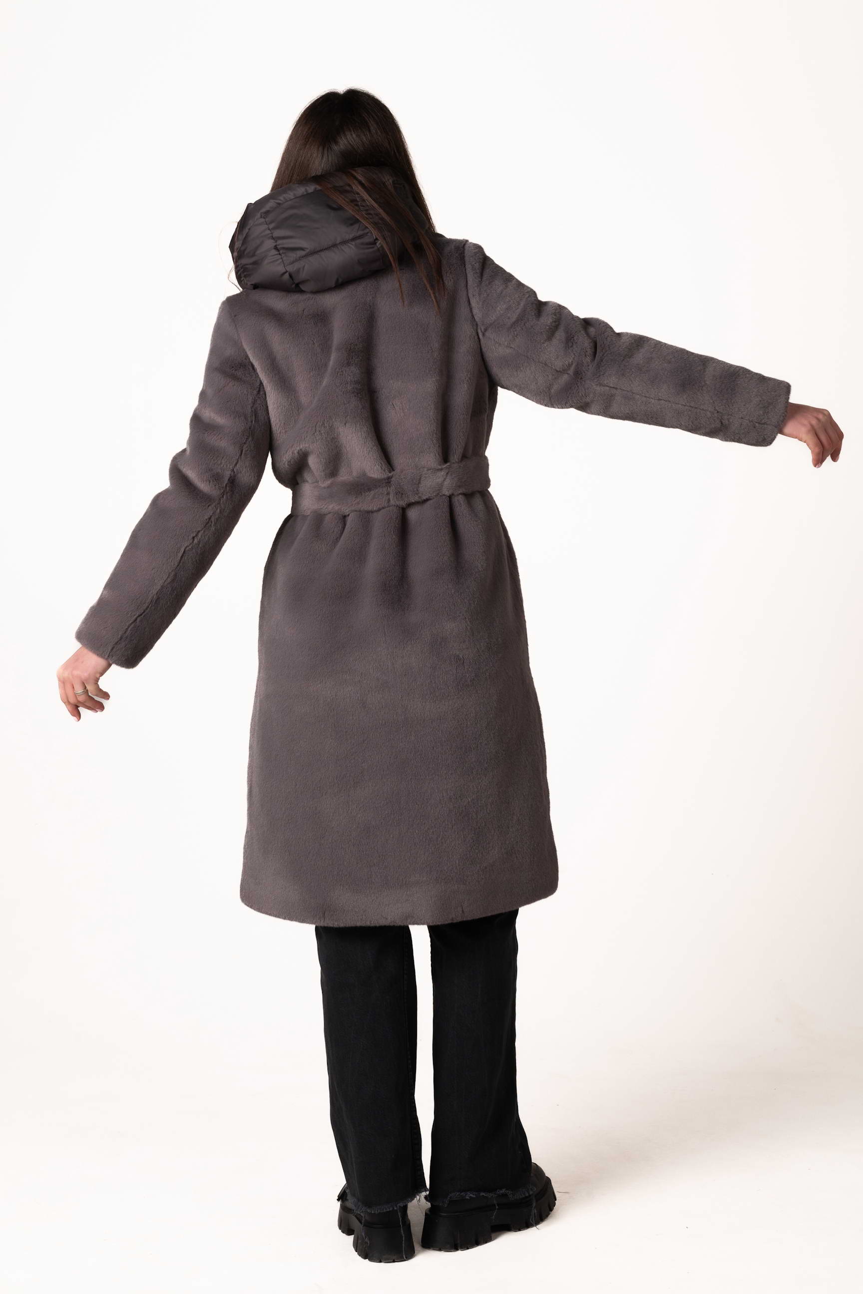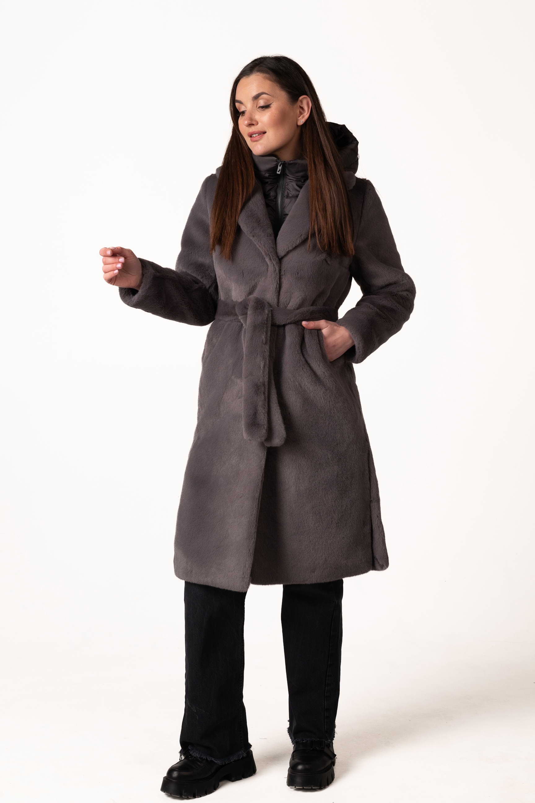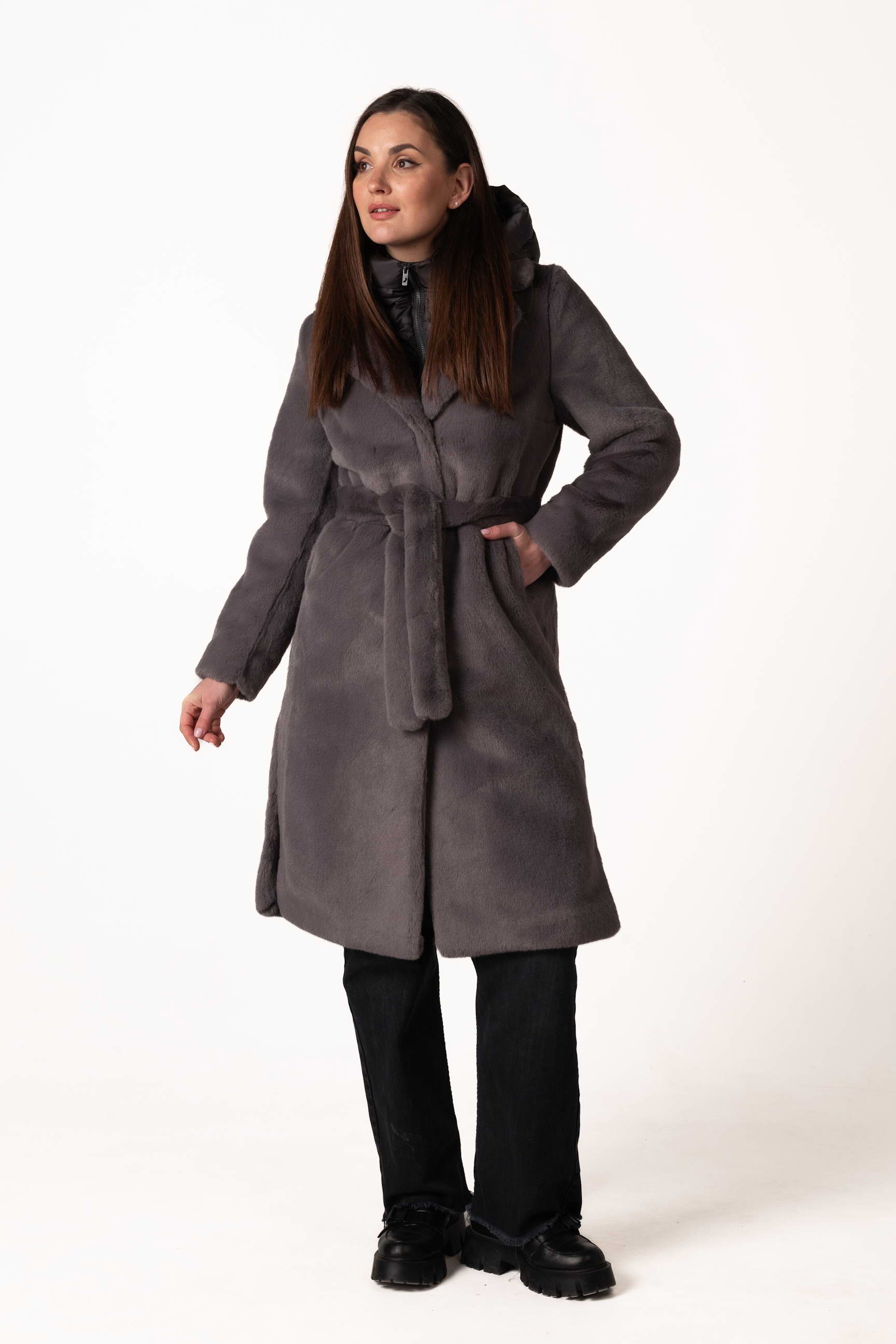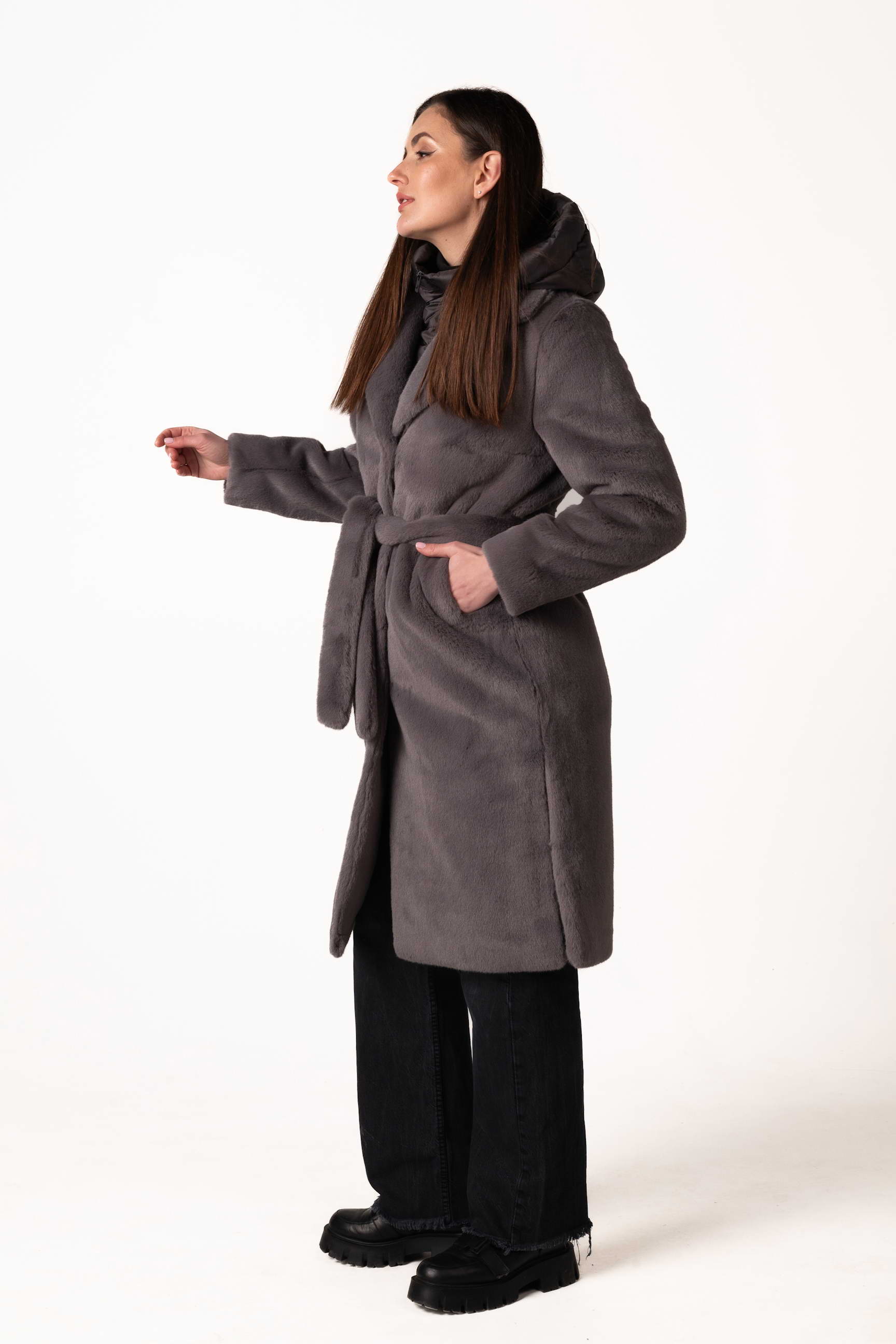 Шуба має прямий крій, який підходить для різних типів фігури, забезпечує свободу рухів і комфорт у щоденному носінні. Відкладний комір з знімним капюшоном із текстилю з утеплювачем надійно захищає від холоду та вітру, додаючи виробу функціональності та стильного вигляду.