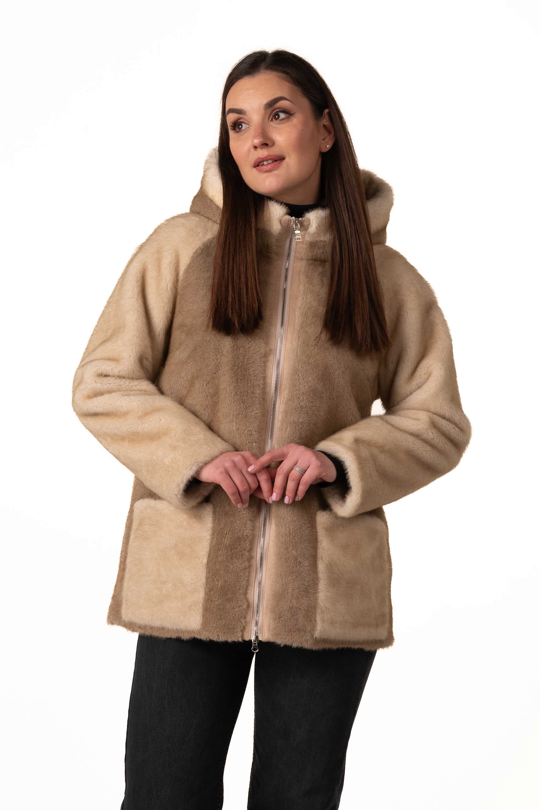 Практична застібка-блискавка дозволяє швидко та зручно застібати шубу, забезпечуючи щільне прилягання.