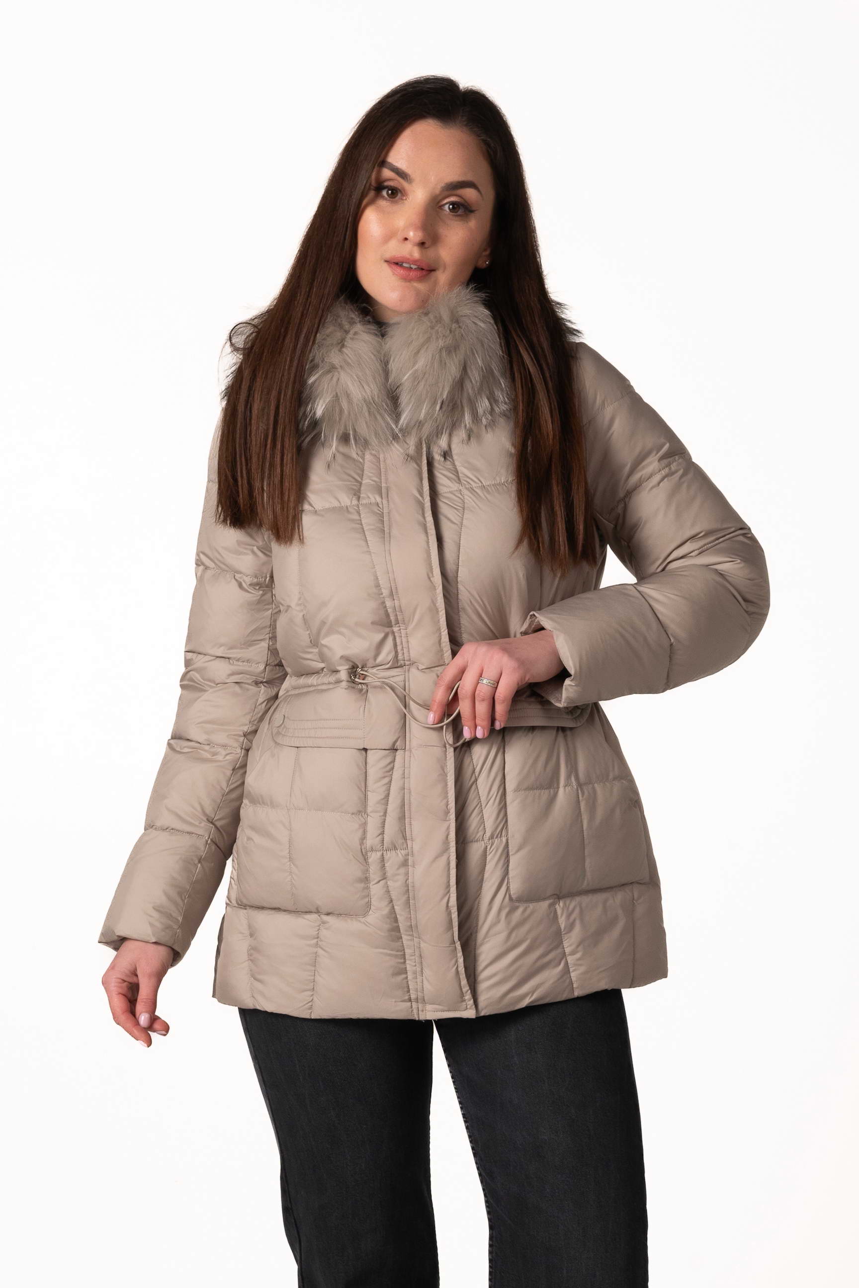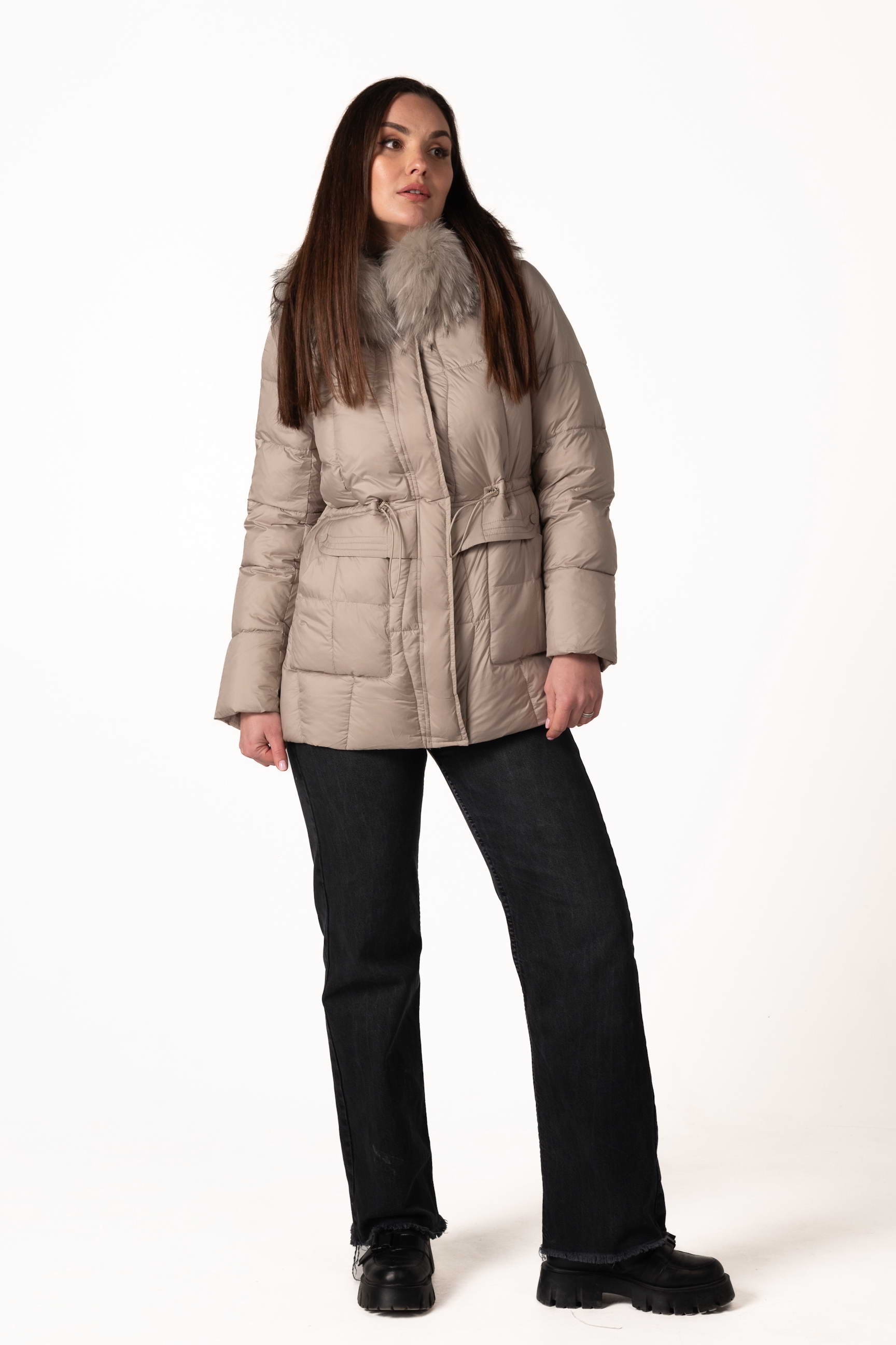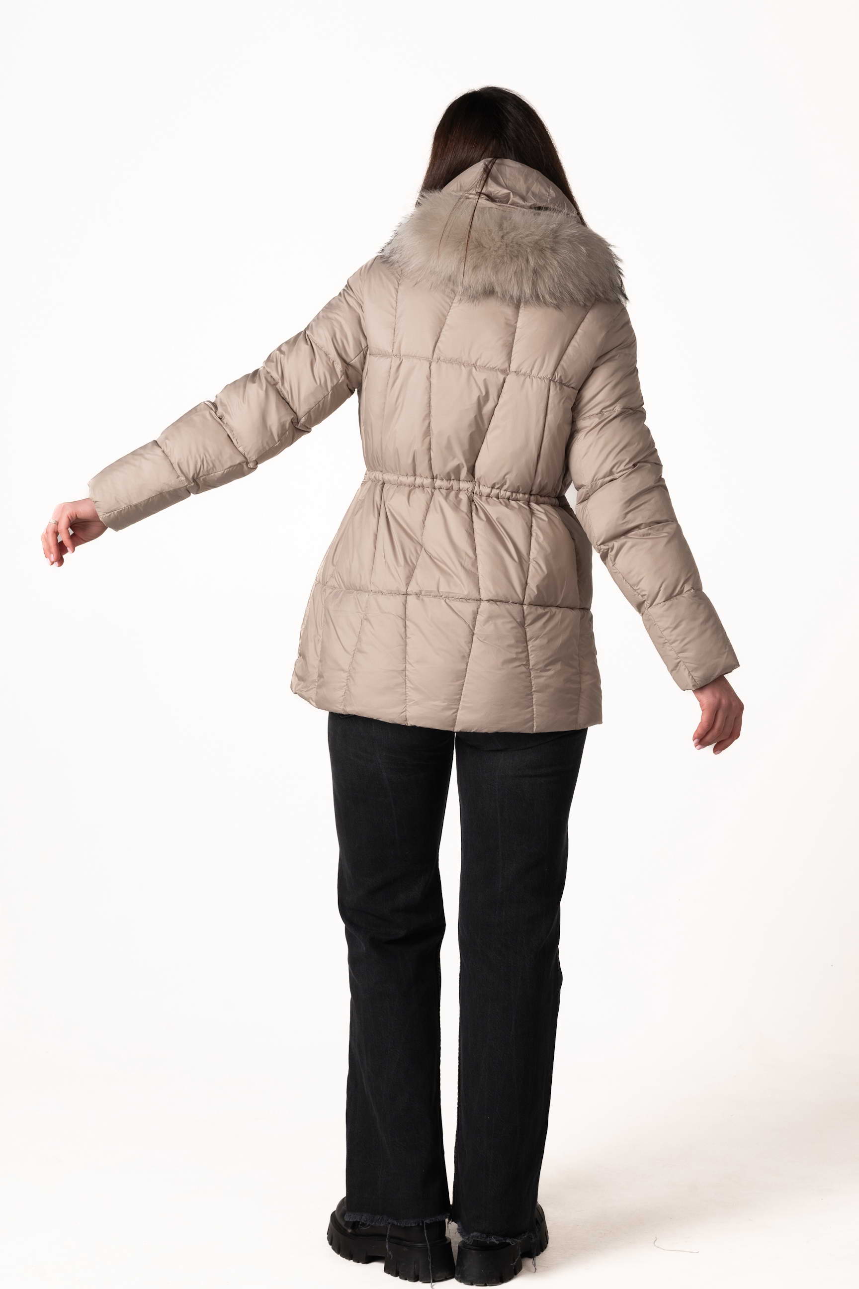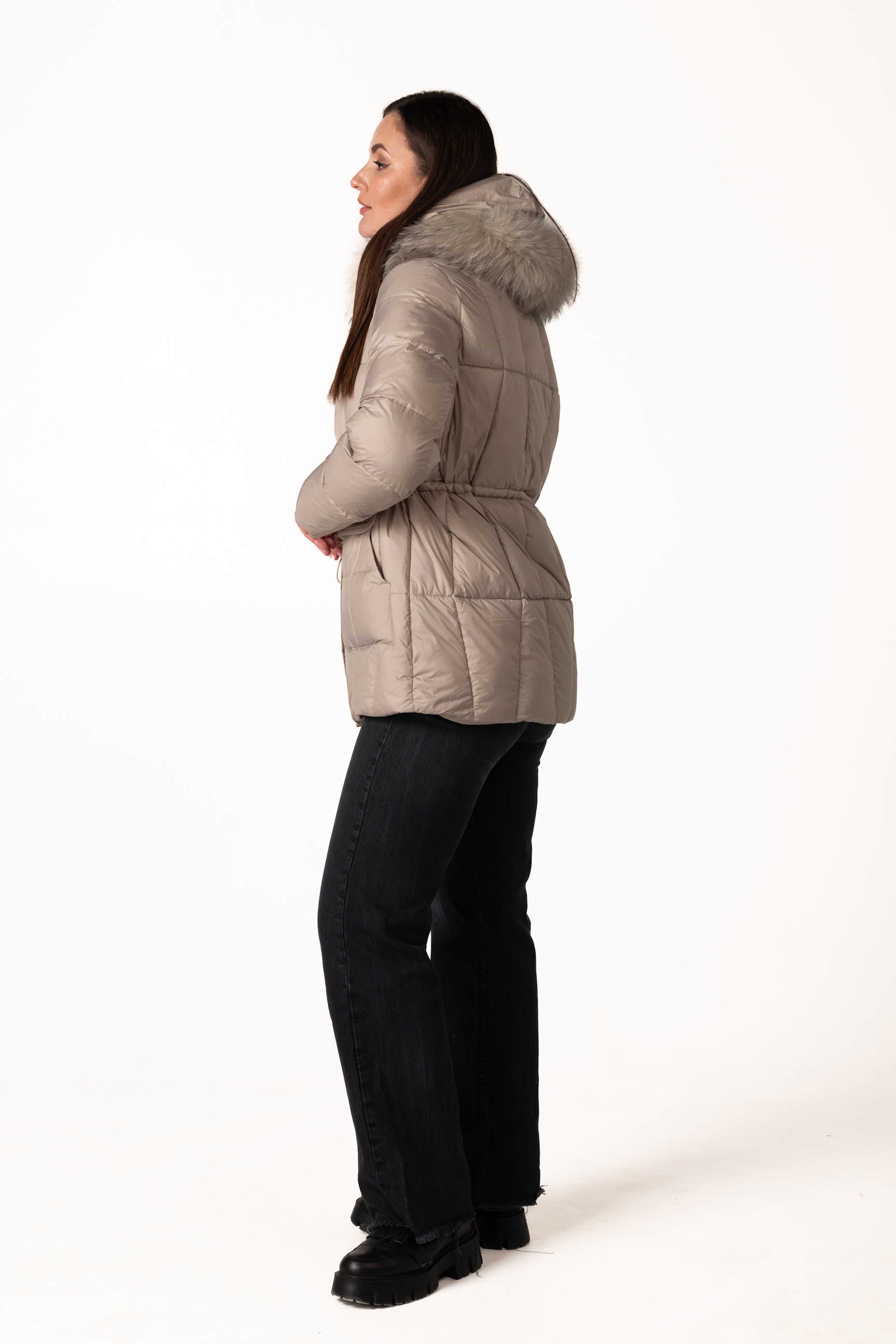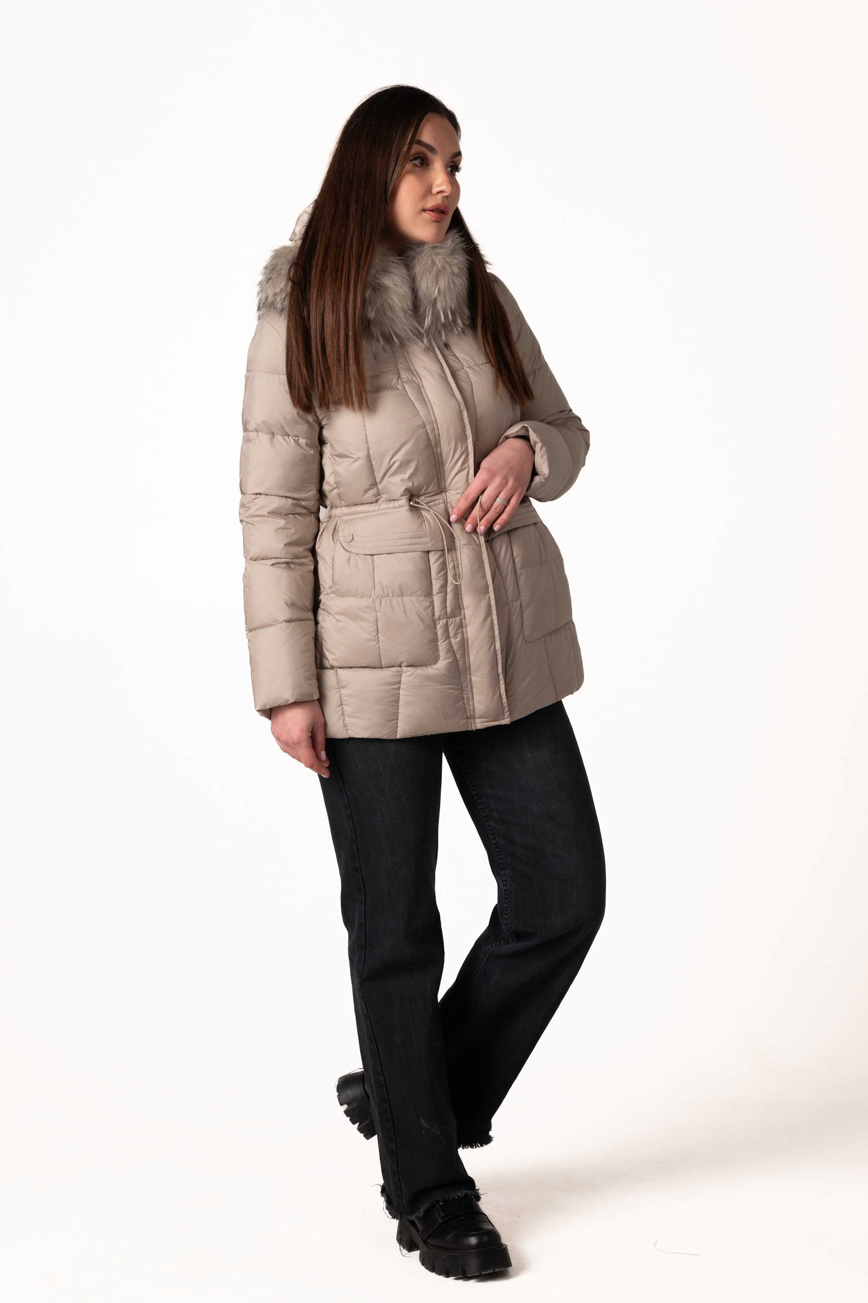 Високий комір-стійка забезпечує захист шиї, а капюшон з хутром єнота надає виробу розкішного вигляду та додаткового тепла. Капюшон можна знімати за потреби.
