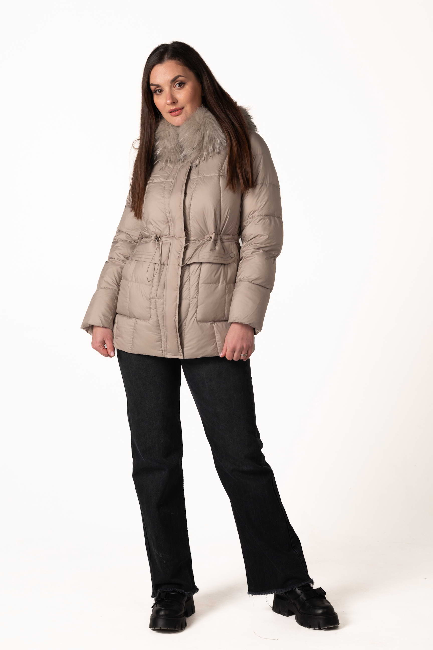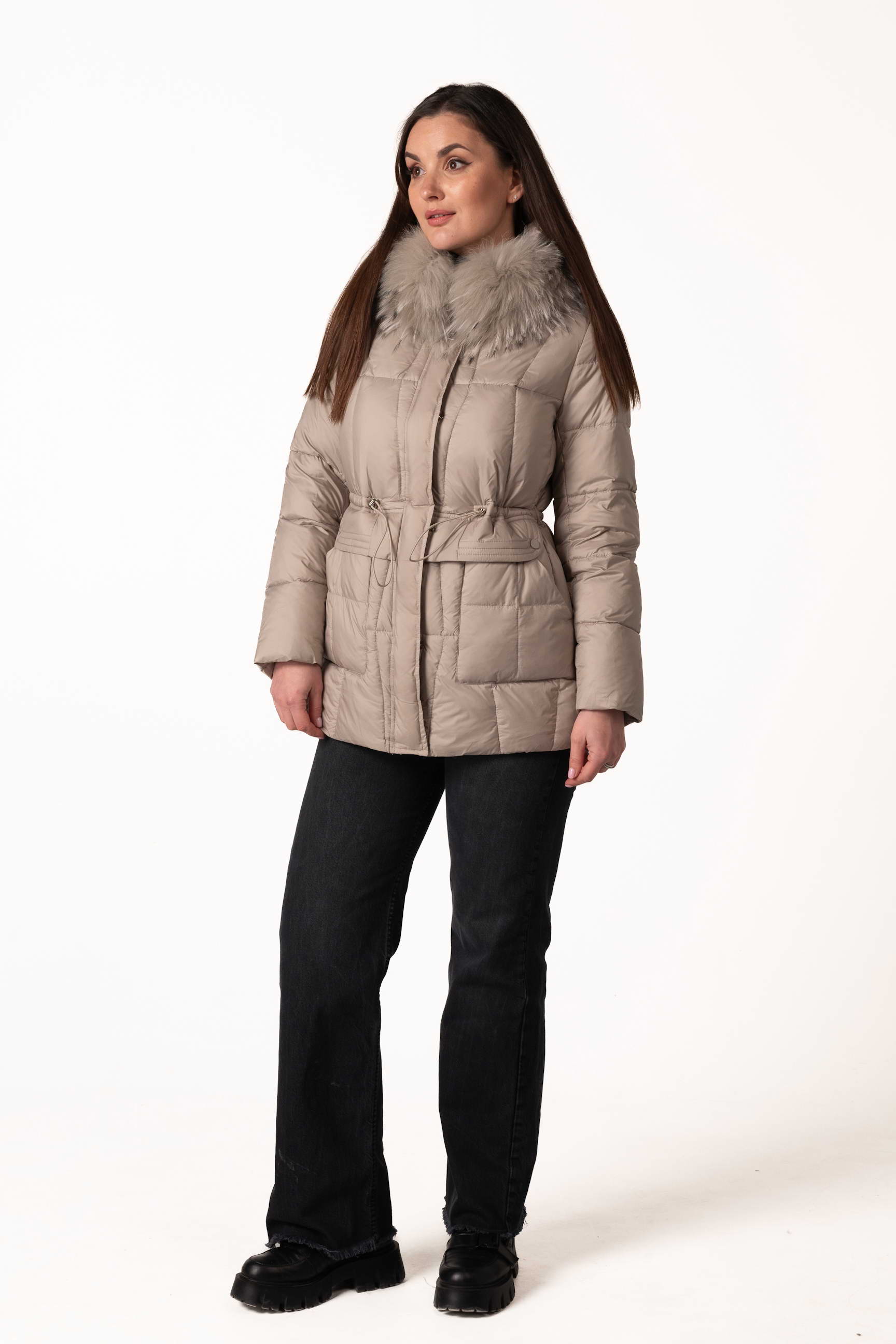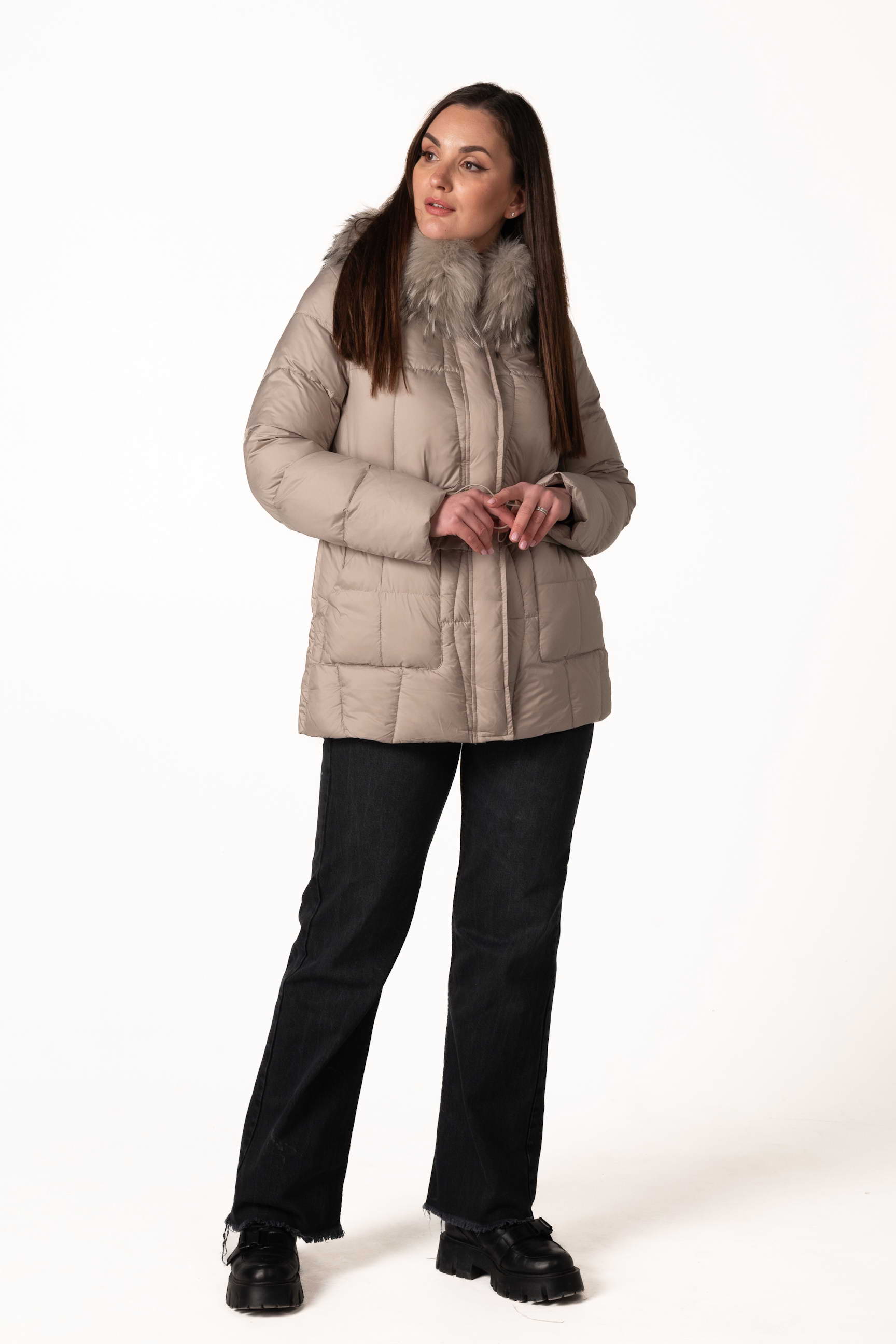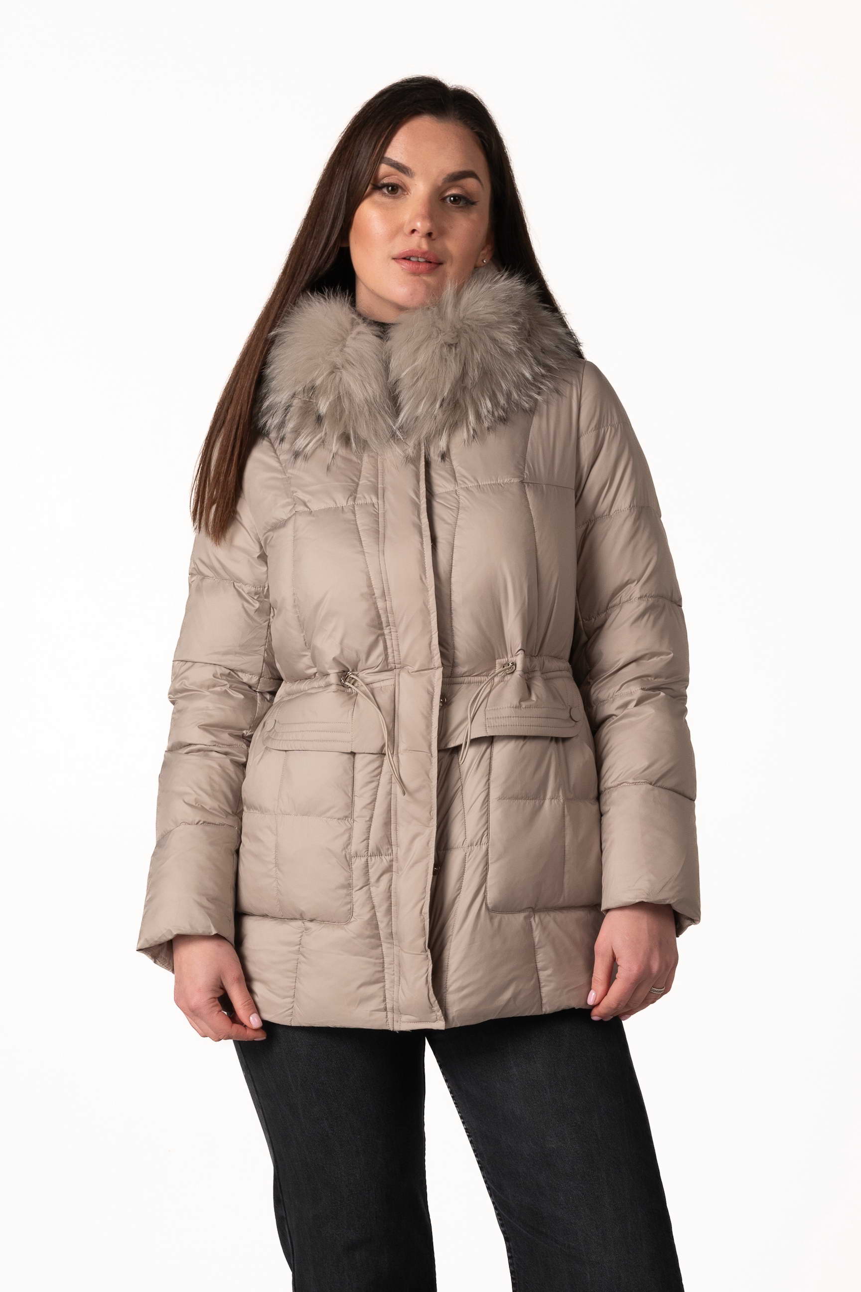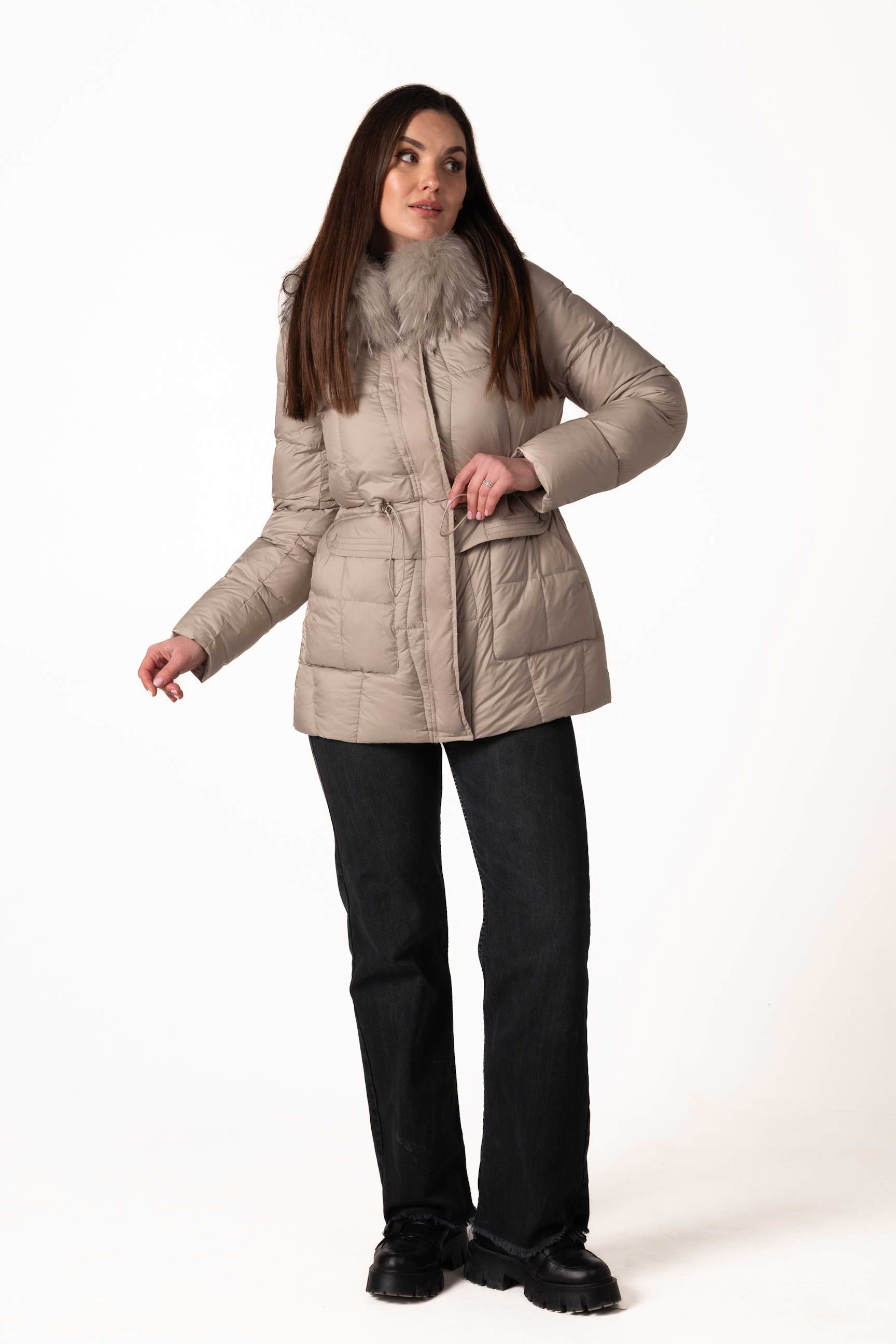 Високий комір-стійка забезпечує захист шиї, а капюшон з хутром єнота надає виробу розкішного вигляду та додаткового тепла. Капюшон можна знімати за потреби.