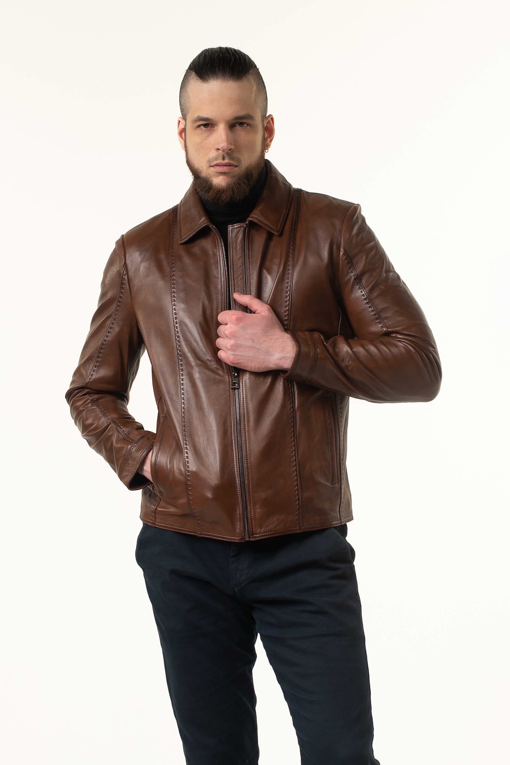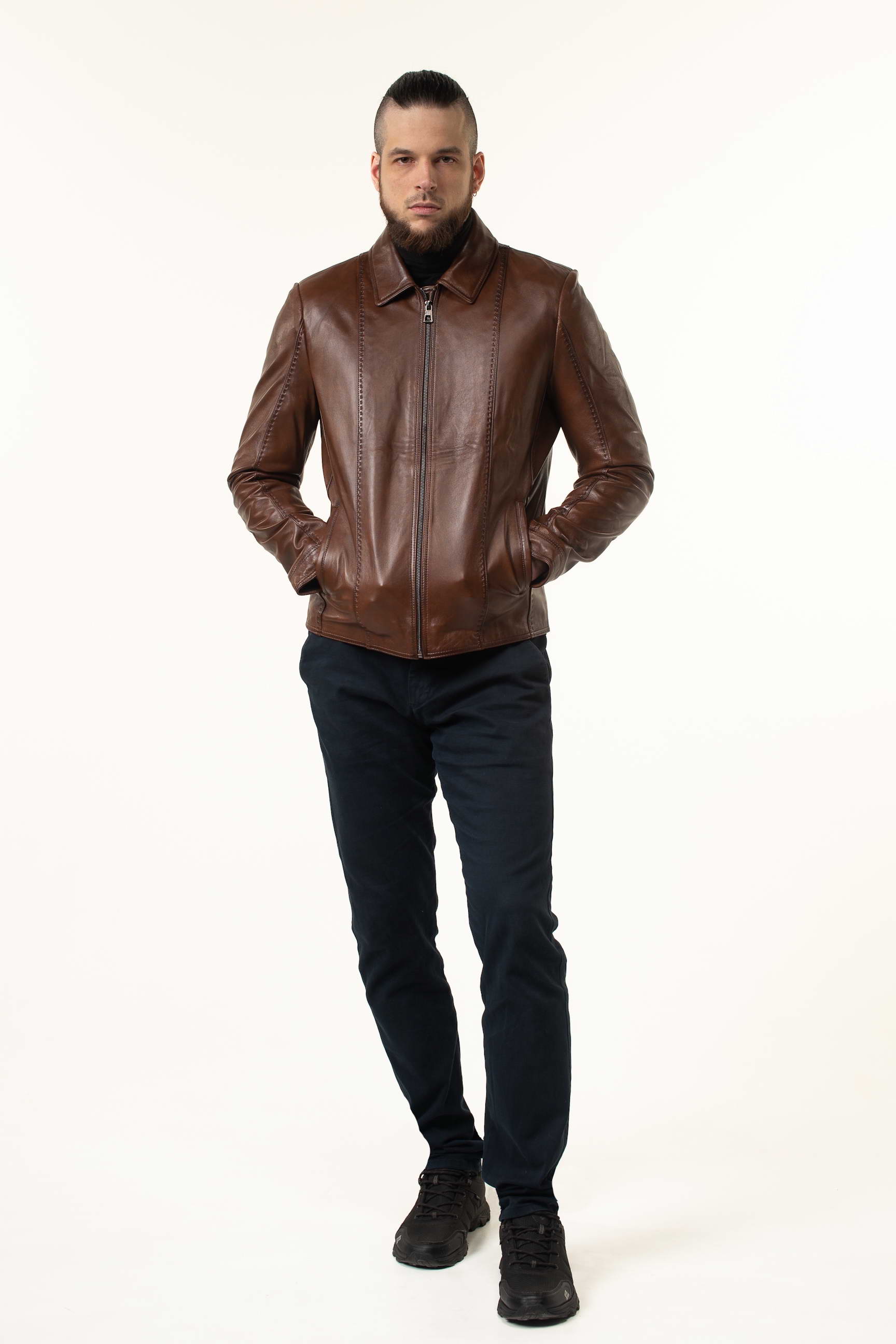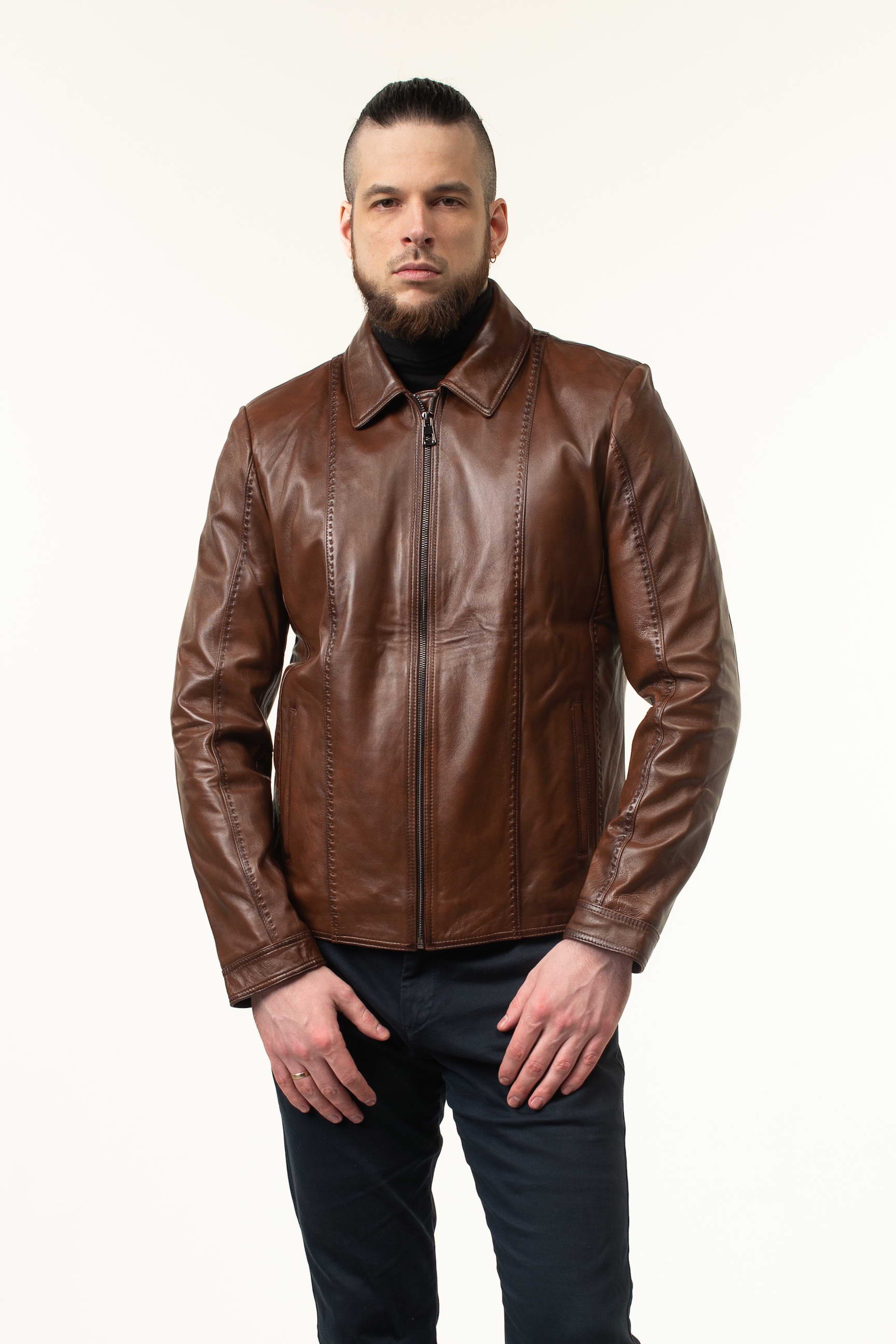 Стильна чоловіча шкіряна куртка для сезону весна/осінь — поєднання преміальної якості матеріалу, комфортного крою та сучасного дизайну. Модель виготовлена з натуральної телячої шкіри світло-коричневого відтінку, м’якої на дотик і довговічної, що з часом набуває характерної текстури та елегантності.